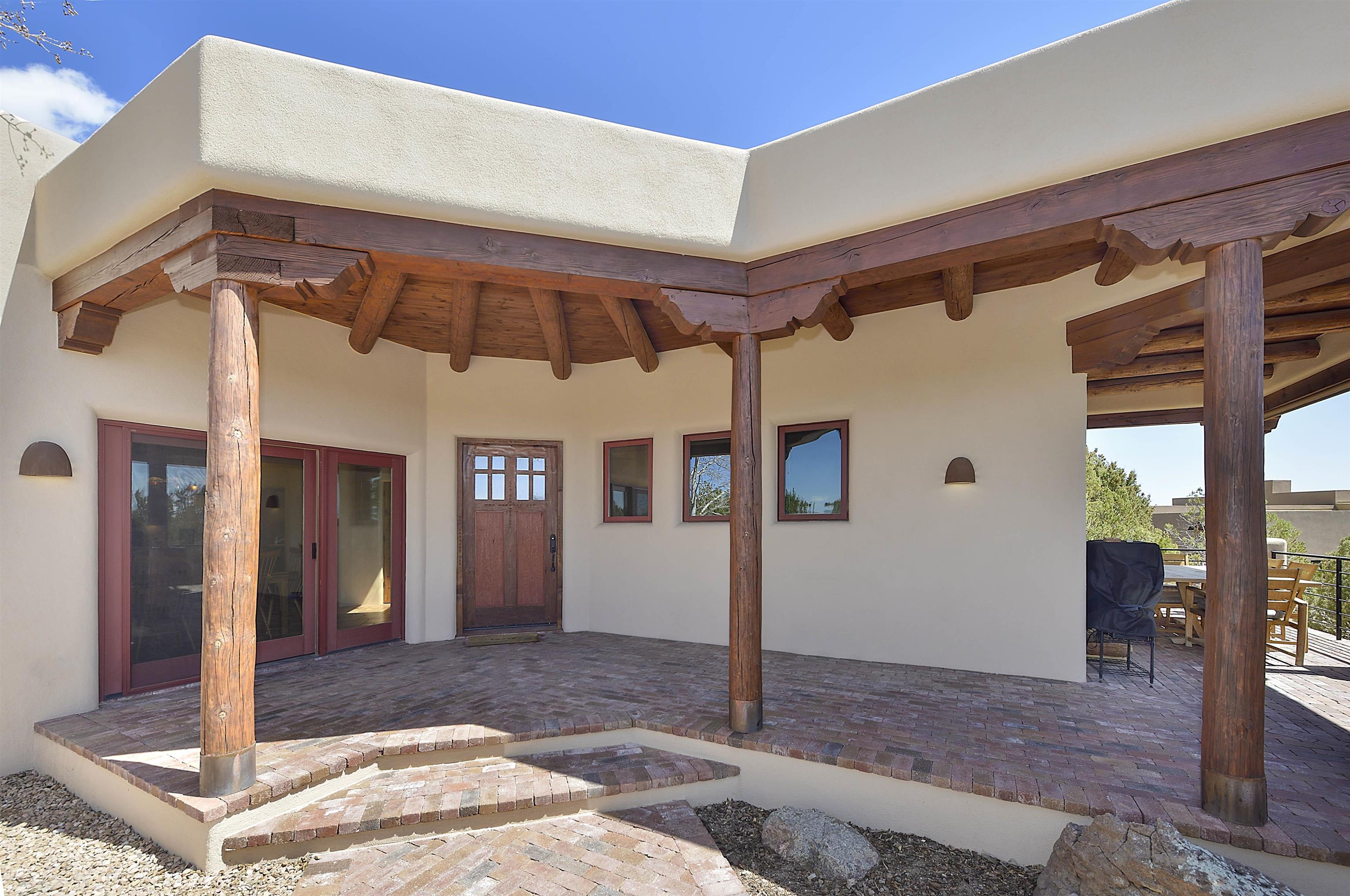 Pueblo style custom home perched above bordering open space offers views of the Sandia, Ortiz, and Sangre de Cristo mountains. Towards the end of a paved cul-de-sac, this adorable home with fresh STO stucco and beautifully stained exterior wood trim features interior diamond plaster walls, custom alder wood cabinets/doors, a chef's kitchen with stainless steel appliances, granite countertops, double sink, a center island with cooktop and a skylight! The cozy living space provides built-in cabinetry and a fireplace. The primary suite offers a kiva, a sitting area, and a generous walk-in closet. Walk through the master for another quick access to the laundry room. Two additional bedrooms provide flex space for an office/studio. The exterior deck yields additional space with plenty of room for expansion. Enjoy a generous sized garage with new boiler and hot water heater in 2021. La Mirada offers easy access to 599. 3 bedroom and 2.5 bath.