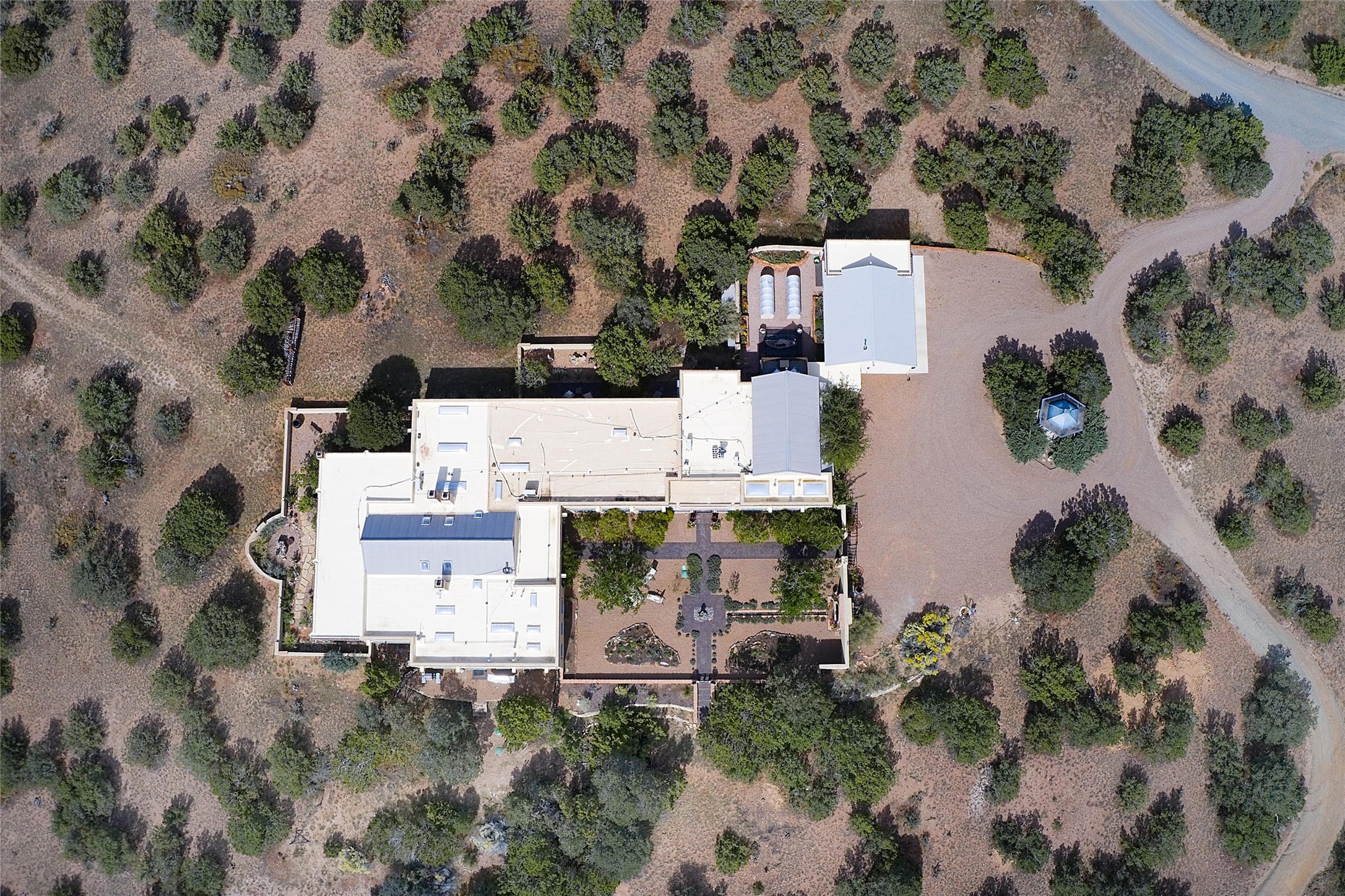 This classic Northern New Mexico style home is a must see. The home has outstanding finishes and quality of construction with all of the touches that make Santa Fe homes so charming. Thick pumice-crete walls, high ceilings, hand troweled plaster, carved beams and Territorial details abound. Situated on a quiet ridge-top just minutes from Eldorado shopping and a short drive to the Santa Fe Plaza, this 9 acre estate offers luxurious country living and city proximity. The property has mature pinon and junipers throughout and beautifully landscaped gardens in various courtyards, many with water fountains and features. The chef's kitchen will delight any cook with professional appliances and is great for casual entertaining around the custom made island next to a counter height fireplace. The light-filled dining, living and family rooms open through multiple french doors to a deep wrap around portal with an outdoor fireplace and fountain. You will be able to enjoy sunsets and sunrises along with panoramic views of Sangre de Cristo, Jemez, and Sandia mountains. The luxurious and spacious main suite with a large bathroom, steam shower, walk in closet, and private north-east facing garden/courtyard with water feature will be a great retreat. All guest bedrooms are spacious with ensuite baths, and extend off a lovely window lined hallway gallery overlooking the main courtyard. A two-story media room/casita at the end of the hallway with a balcony can serve as a perfect care-taker's quarters, guest accommodations or studio. The heated, 3-car garage/greenhouse with glass roll-up doors could also serve as a wonderful studio or workshop.
