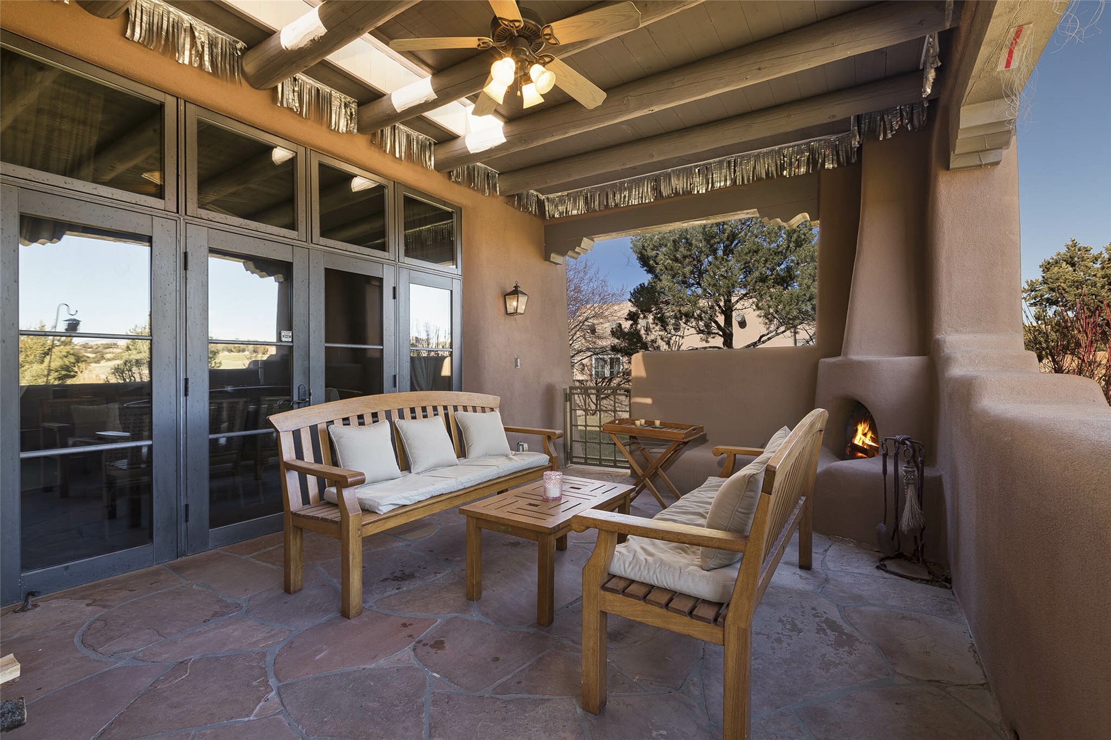 Live the ultimate Las Campanas lifestyle! Located directly across from the 1st tee of the Sunrise Golf Course and The Las Campanas Hacienda Clubhouse, this beautiful single level residence offers 2,187 square feet, featuring Sangre de Cristo Mountain and golf course views, two spacious and well-appointed owner's suites, each with spa-like baths, modern hardwood flooring, kiva fireplaces, walk-in closets, and separate entrances. Entertaining is a joy with the welcoming great room which opens to the kitchen, outdoor BBQ, and outdoor seating and dining. Additionally, this home offers an office niche, surround courtyards, four fireplaces, a two-car garage with built-in storage cabinets, and a newly installed 220 outlet. Ideal as a secondary residence, or an intimate primary residence, this Las Campanas home offers rare adobe construction, a spacious and private lushly landscaped front entrance courtyard, one of the best sited patios in all of Las Campanas with a Kiva fireplace, an updated roof and boiler, forced air heating with air conditioning plus in-floor radiant heating, rich natural finishes, soft arches, elevated great room ceilings, and a thoughtful floor plan with desirable separation of space. The owner's Equity Social Membership may be available for purchase and an ideal compliment to the quality of life experienced with this residence - walking distance to the clubhouse, golf course, driving range, spa, pool and tennis courts.