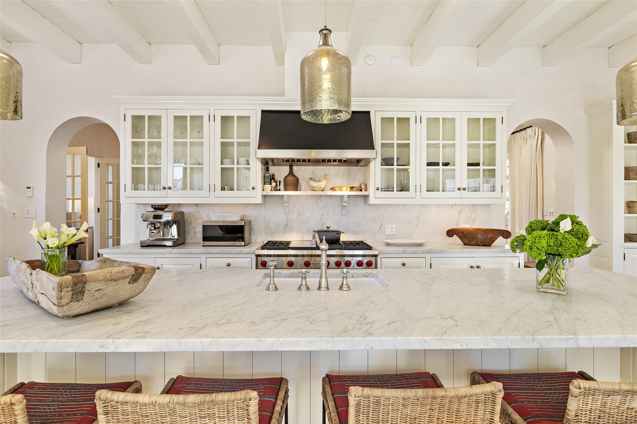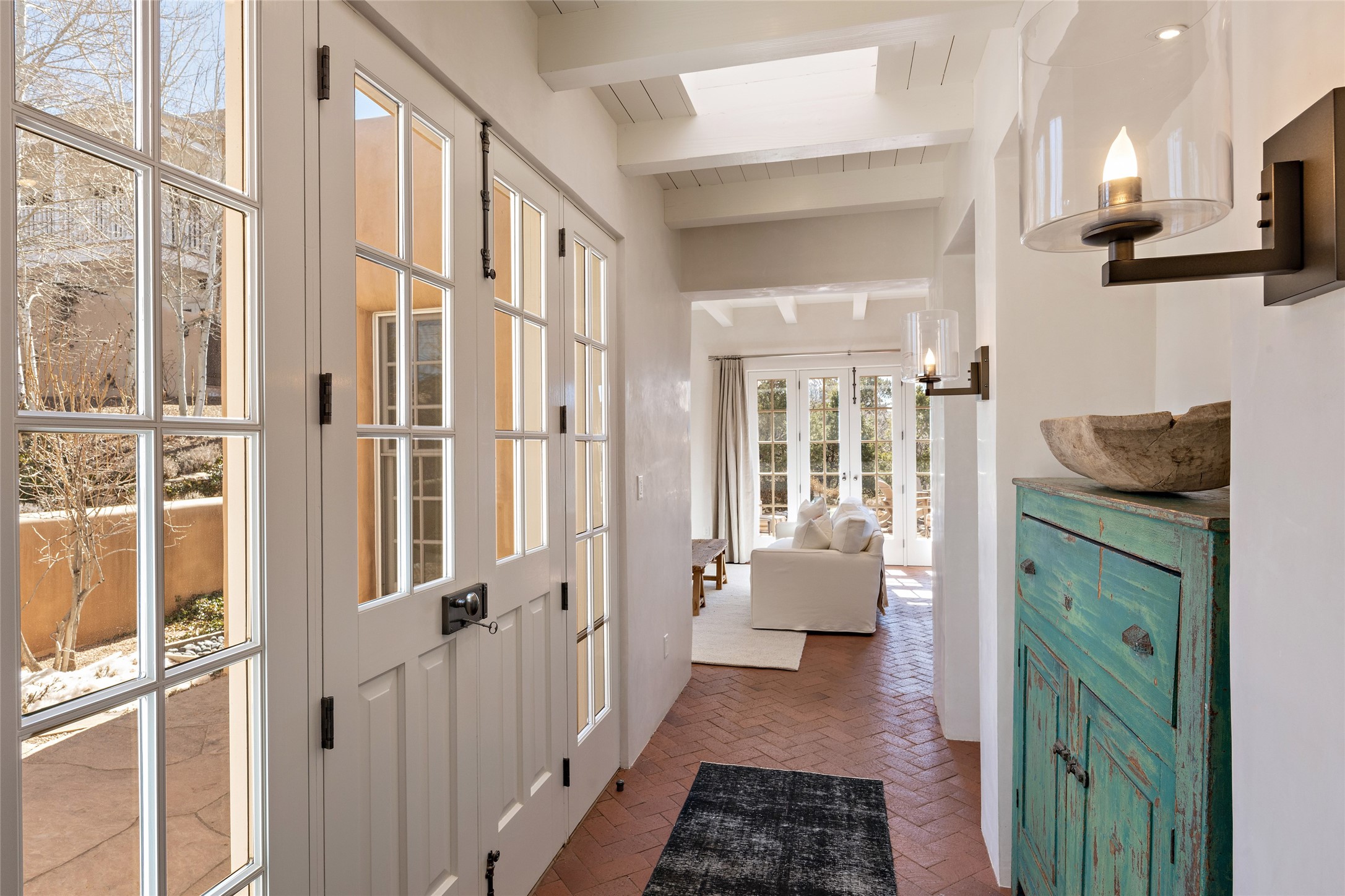 This elegant, hilltop estate, located on the Historic Eastside, offers glorious views of the Jemez and Sangre de Cristo mountains. The pueblo style home and guest house are appointed with territorial-style influences of clean lines, high ceilings, and classic features. The private, gated retreat provides a sophisticated, park-like environment to enjoy the understated beauty of quality luxury finishes throughout. The main residence offers an inviting living room with large cast stone fireplace and adjoining sitting room; and a well-appointed chef's kitchen with access to outside entertaining spaces, including a wood-burning kiva fireplace and grill. The romantic primary suite has a beautiful fireplace, two sets of French doors to a balcony to take in the beautiful surroundings, and a spa-inspired bath. Generously proportioned rooms feature diamond plaster walls and varying widths of handsome reclaimed oak plank floors. The guest house will delight with finishes consistent with the main residence: a cozy living area with fireplace, open to the beautiful chef's kitchen; its own primary and guest bedrooms; and lovely outdoor spaces to take in big views of the Jemez mountains and sunsets. The completely enclosed compound has mature gardens, gorgeous hardscape, Aspen groves, and numerous outside spaces to enjoy. This is an exceptional property in a premier location that includes a 3-car garage.