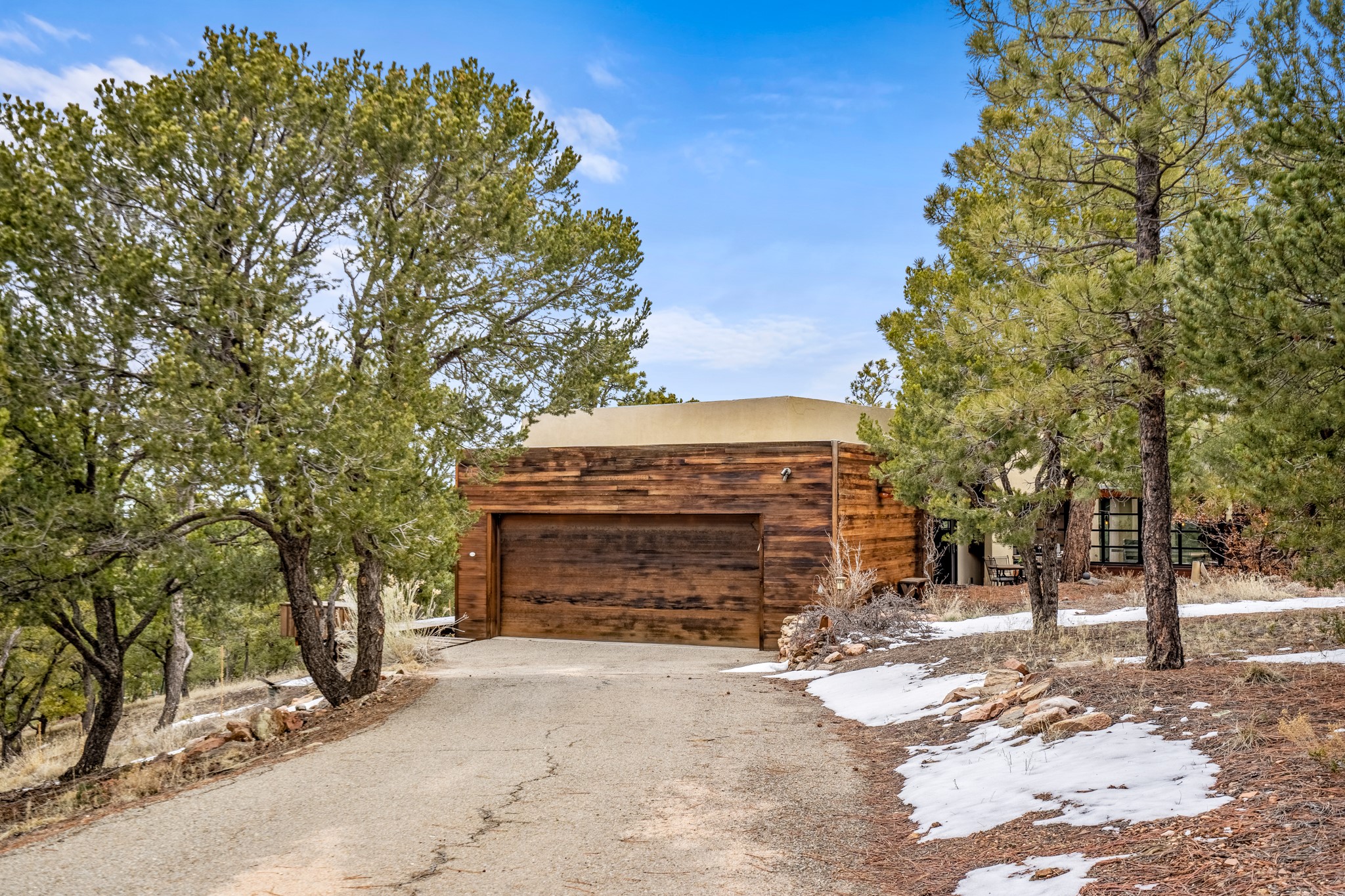 Sophisticated contemporary two story gem on Double Arrow Road in Santa Fe. Situated on 5.14 acres with views to Wilderness Gate and the Jemez Mountains, this 3 bedroom 2 bath, 2750+/- square foot home with two offices, greenhouse, two car heated +/-550sf garage and workshop (not included in main square footage) is located one house up from Hidden Valley Road. Designed by the architecture firm of Rinehart Herbst of San Diego and built in 1996. Floor to ceiling windows bring light and warmth to this extraordinary structure. Parallam beamed ceilings inside, brick flooring, radiant heat, interior gas fireplace, exterior wood burning fireplace. Accessiblility to the outdoors, the many hand crafted built-ins and the intimate nature of each space gives a unique aesthetic and timeless functionality to this lovely home. The exterior wood accents on the garage and studio are Redwood. Two Cisterns and a community well. Paved driveway. Double Arrow Road is gated and is paved.