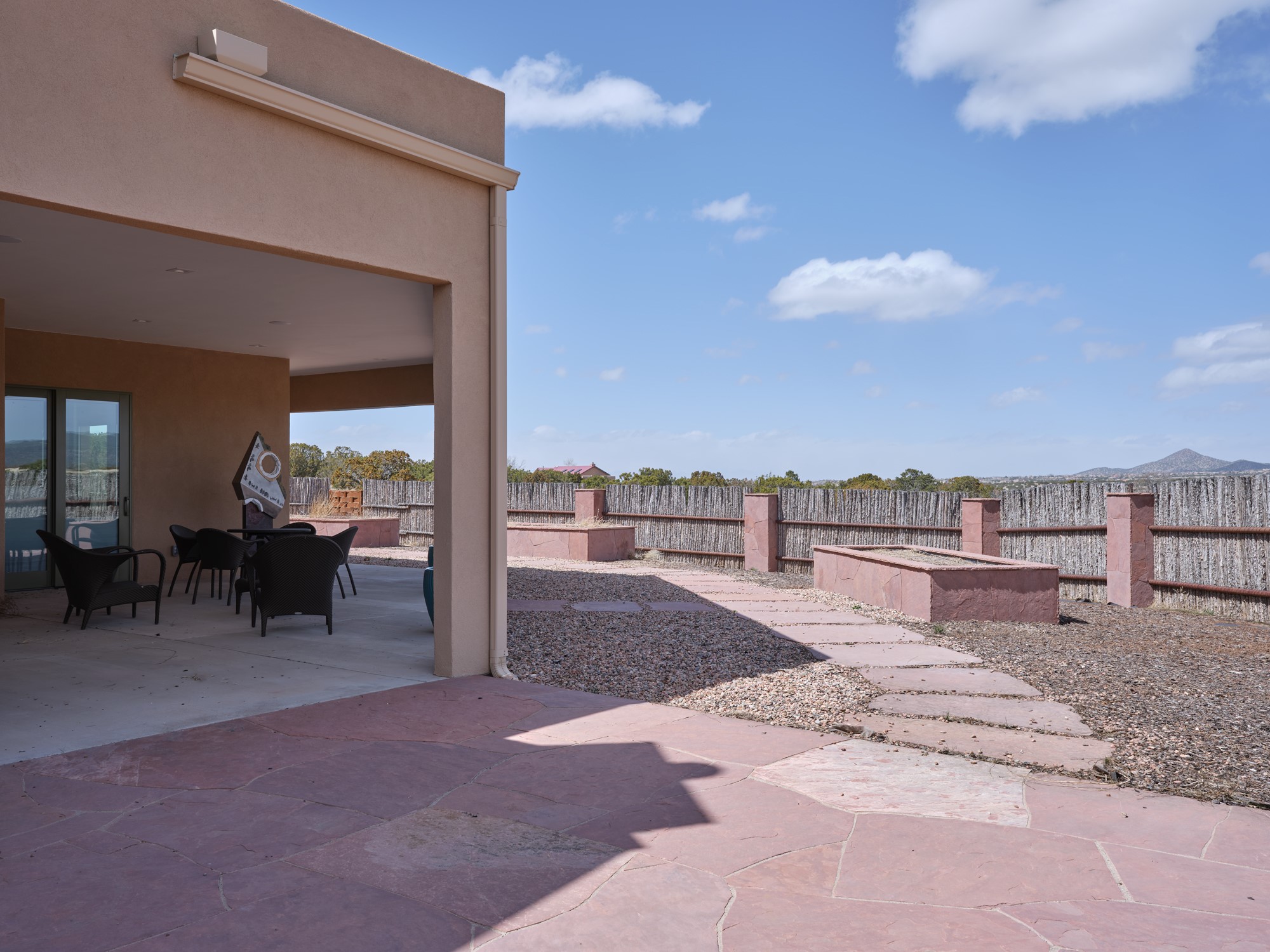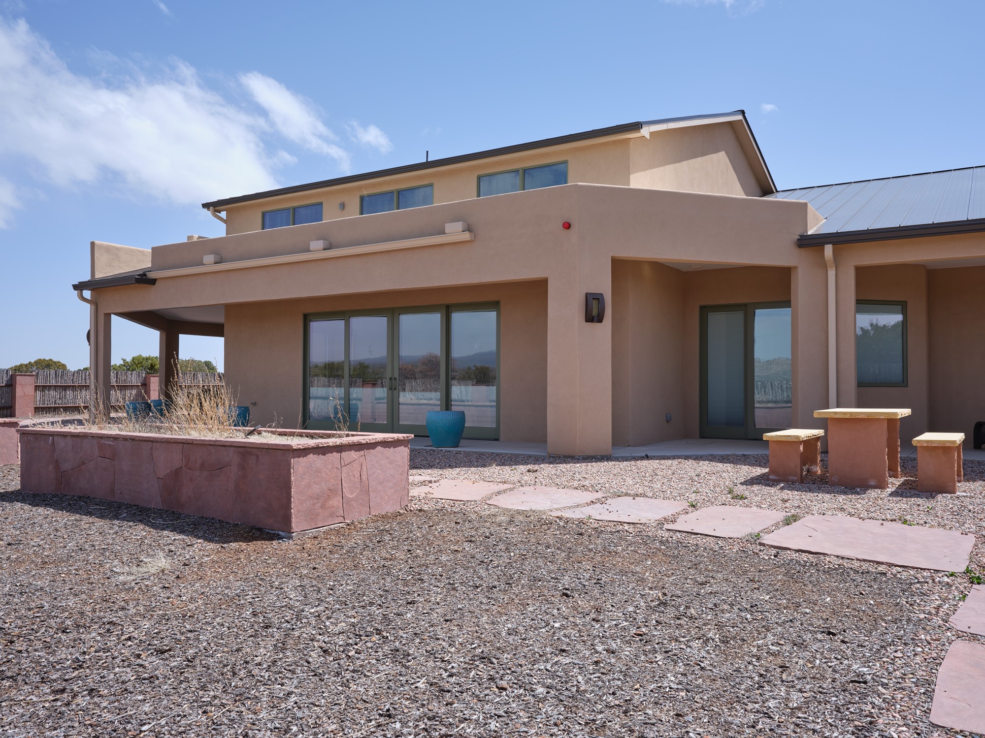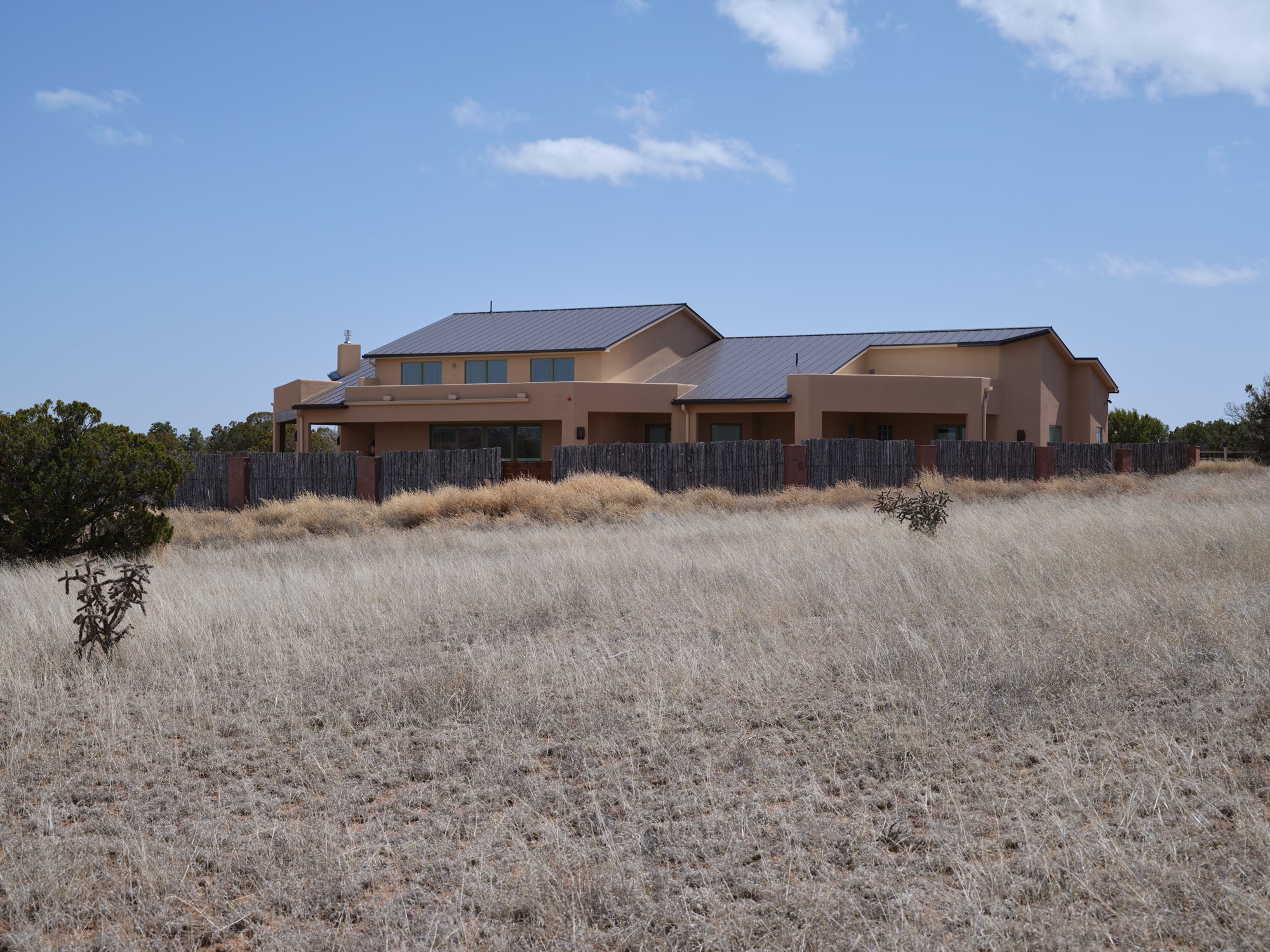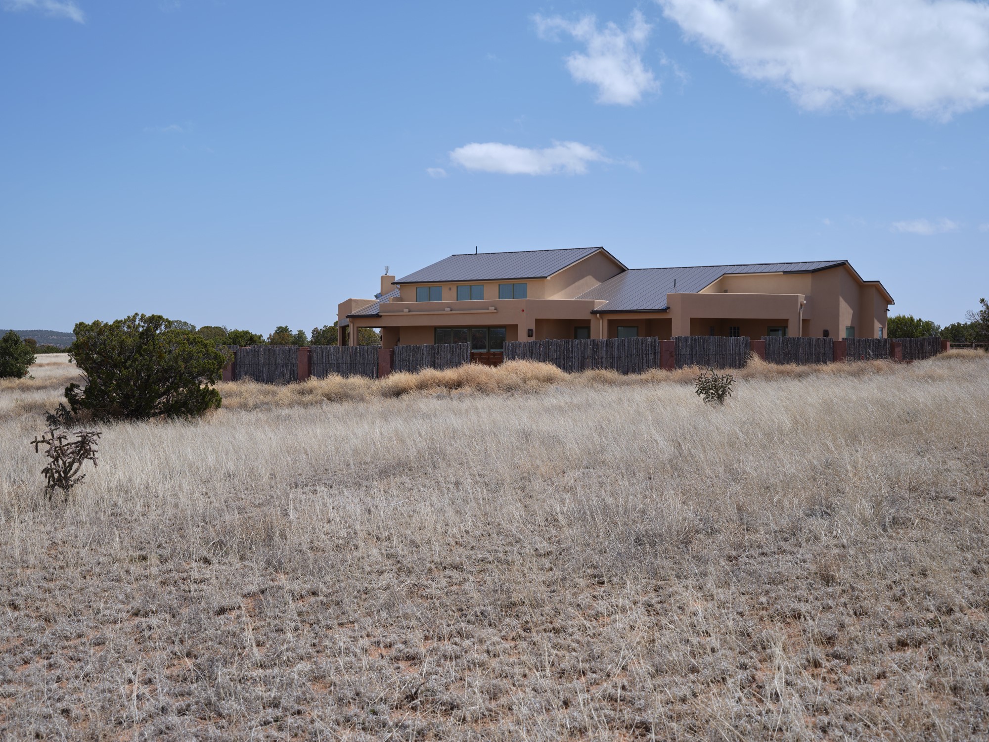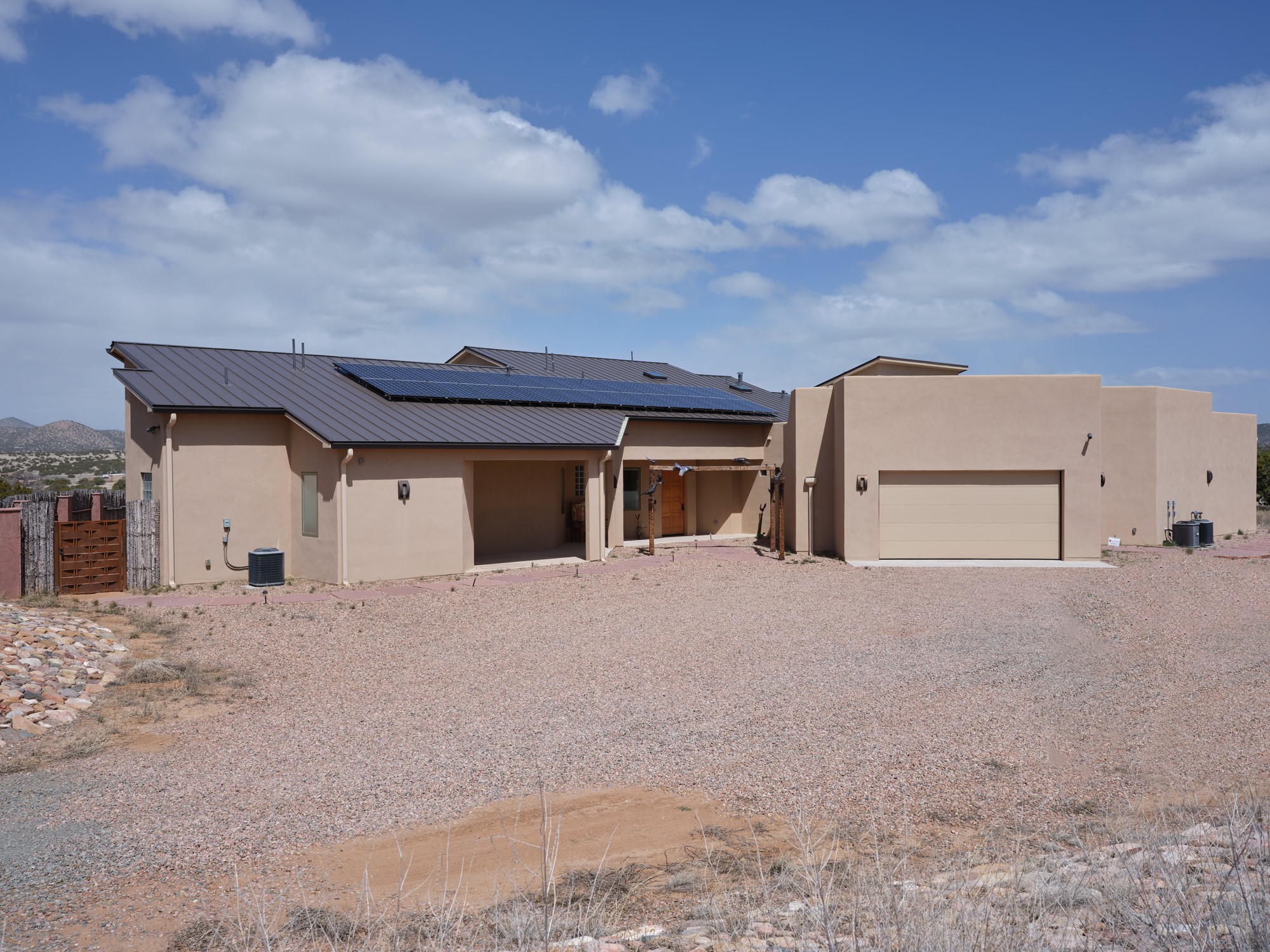 Price reduced substantially! 26 Cattle Drive is a contemporary, 4-bed/4-bath home situated on 12.5 acres on a high ridge overlooking Lamy and the Galisteo basin with expansive, unobstructed views of the Sangre de Cristo, Jemez, and Ortiz mountains. In a pastoral setting adjoining a 100-acre private easement and the 4,000 acre Eldorado Wilderness, 26 Cattle Dr. is just 20 minutes from the Plaza and 5 minutes to the Eldorado Super Market, shopping, and nearby restaurants. Living room, master bedroom and three of the four bedrooms have direct access to the enclosed north-side patio. All bedrooms are ensuite (three full and one 3/4). A fully outfitted chef's kitchen including warming drawer beneath stove top and dramatic, lofty ceilings in the living/dining/kitchen and master bedroom grace the home. Counter-tops throughout are matching granite. Utilities include natural gas, a shared well and septic. Security, lighting, and entertainment systems are master-controlled. The 2-car attached garage includes a large separate, locked large storage area. The roof-mounted solar panels provide almost 100% of the electrical requirements. Rainwater is captured by a cistern for outdoor watering. An "art-wall" and entryway display case accommodate artwork. The expansive outdoor deck, accessible through an inside stairway provides yet another way to enjoy the spectacular views. Completed in 2018, 26 Cattle Drive is an eminently livable, one-of-a-kind property.