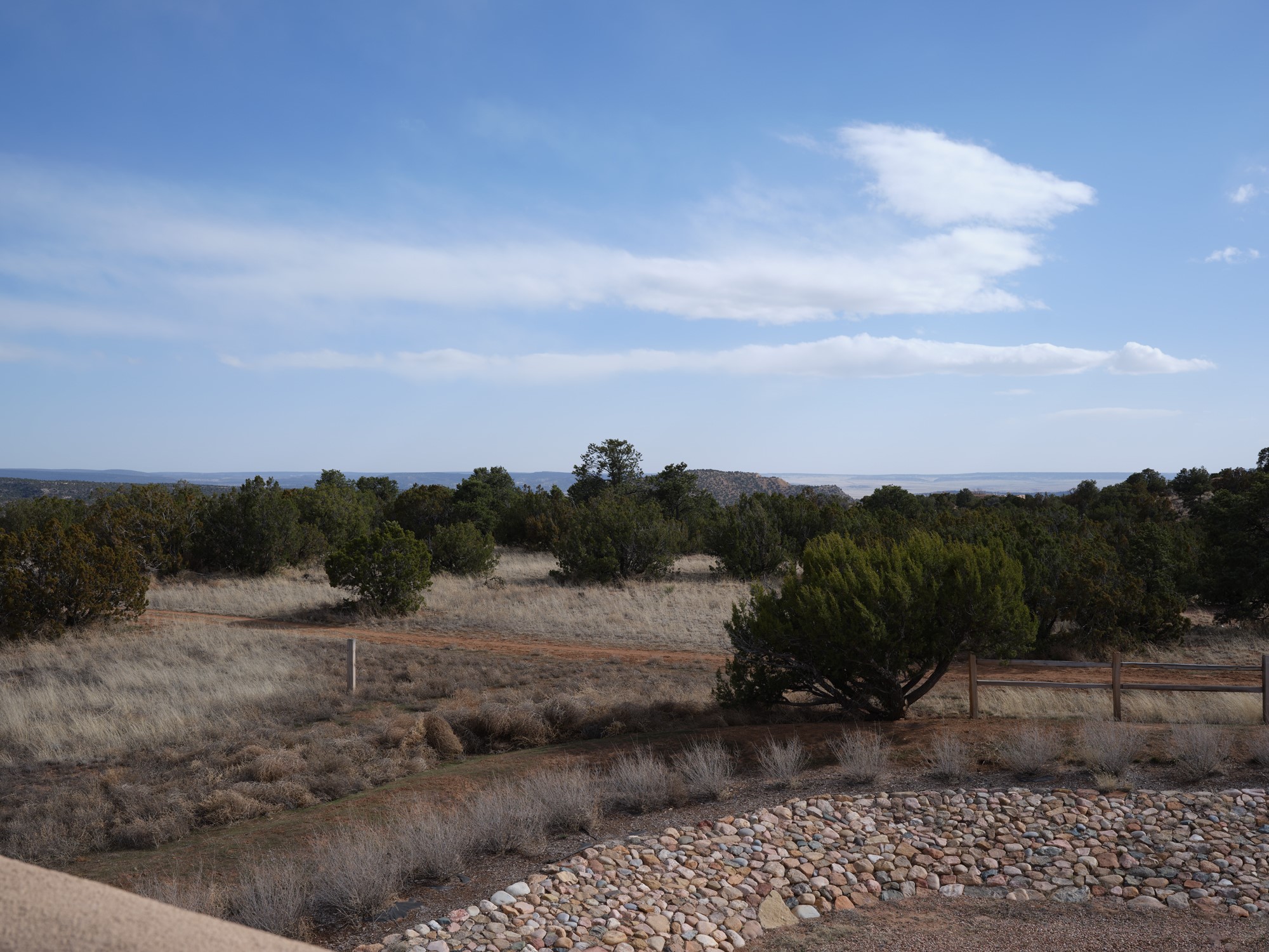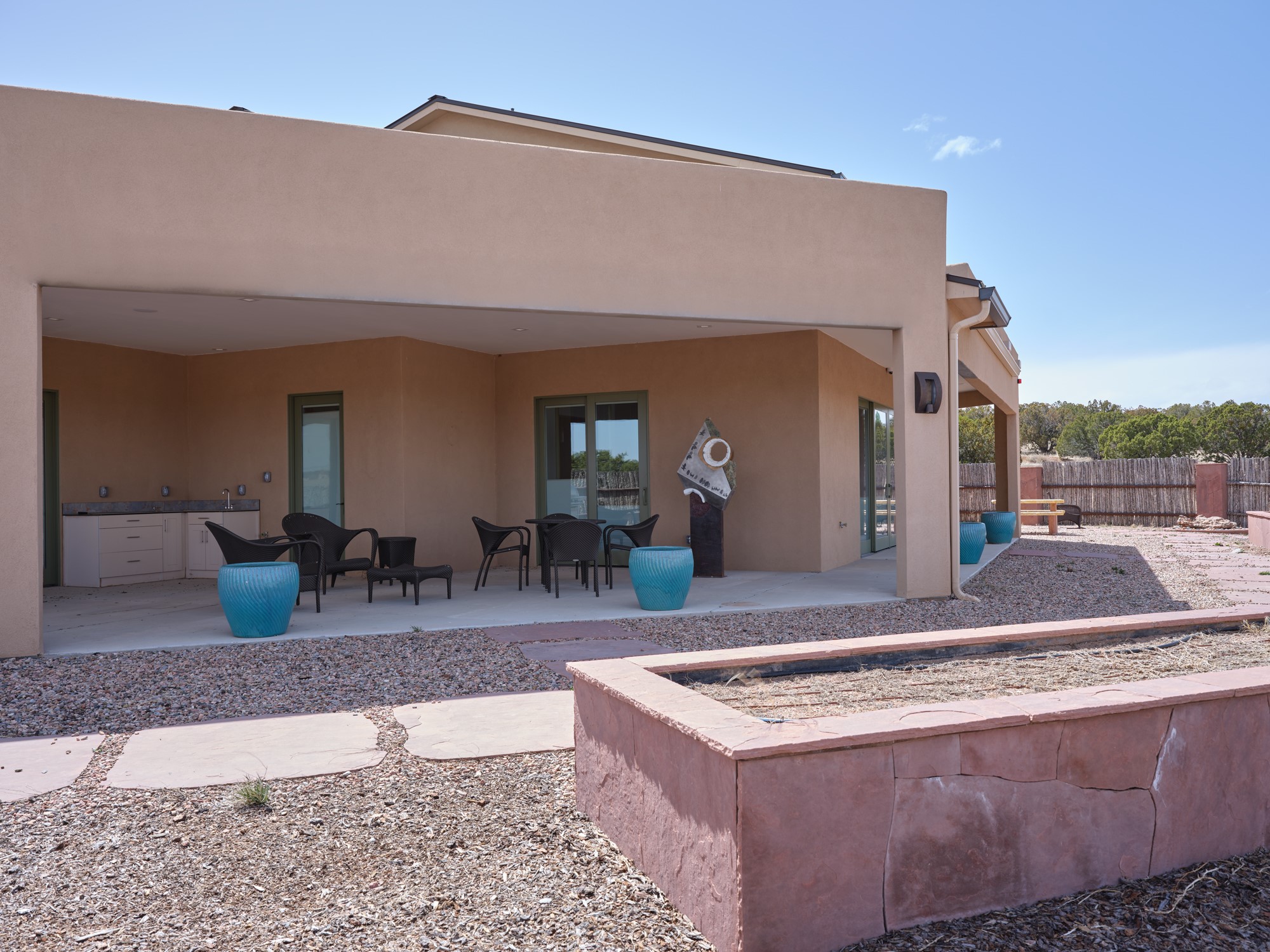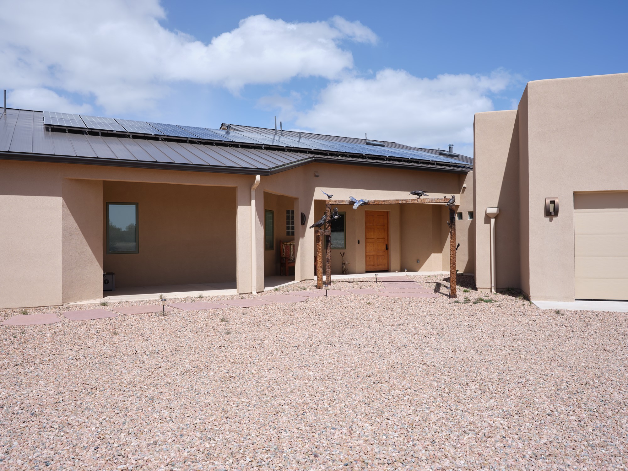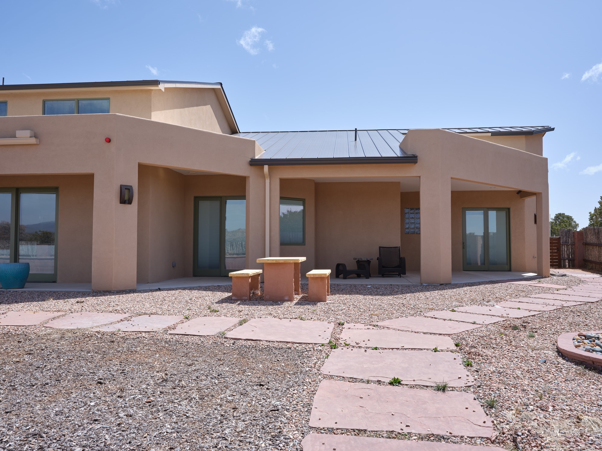 Price reduced substantially! 26 Cattle Drive is a contemporary, 4-bed/4-bath home situated on 12.5 acres on a high ridge overlooking Lamy and the Galisteo basin with expansive, unobstructed views of the Sangre de Cristo, Jemez, and Ortiz mountains. In a pastoral setting adjoining a 100-acre private easement and the 4,000 acre Eldorado Wilderness, 26 Cattle Dr. is just 20 minutes from the Plaza and 5 minutes to the Eldorado Super Market, shopping, and nearby restaurants. Living room, master bedroom and three of the four bedrooms have direct access to the enclosed north-side patio. All bedrooms are ensuite (three full and one 3/4). A fully outfitted chef's kitchen including warming drawer beneath stove top and dramatic, lofty ceilings in the living/dining/kitchen and master bedroom grace the home. Counter-tops throughout are matching granite. Utilities include natural gas, a shared well and septic. Security, lighting, and entertainment systems are master-controlled. The 2-car attached garage includes a large separate, locked large storage area. The roof-mounted solar panels provide almost 100% of the electrical requirements. Rainwater is captured by a cistern for outdoor watering. An "art-wall" and entryway display case accommodate artwork. The expansive outdoor deck, accessible through an inside stairway provides yet another way to enjoy the spectacular views. Completed in 2018, 26 Cattle Drive is an eminently livable, one-of-a-kind property.