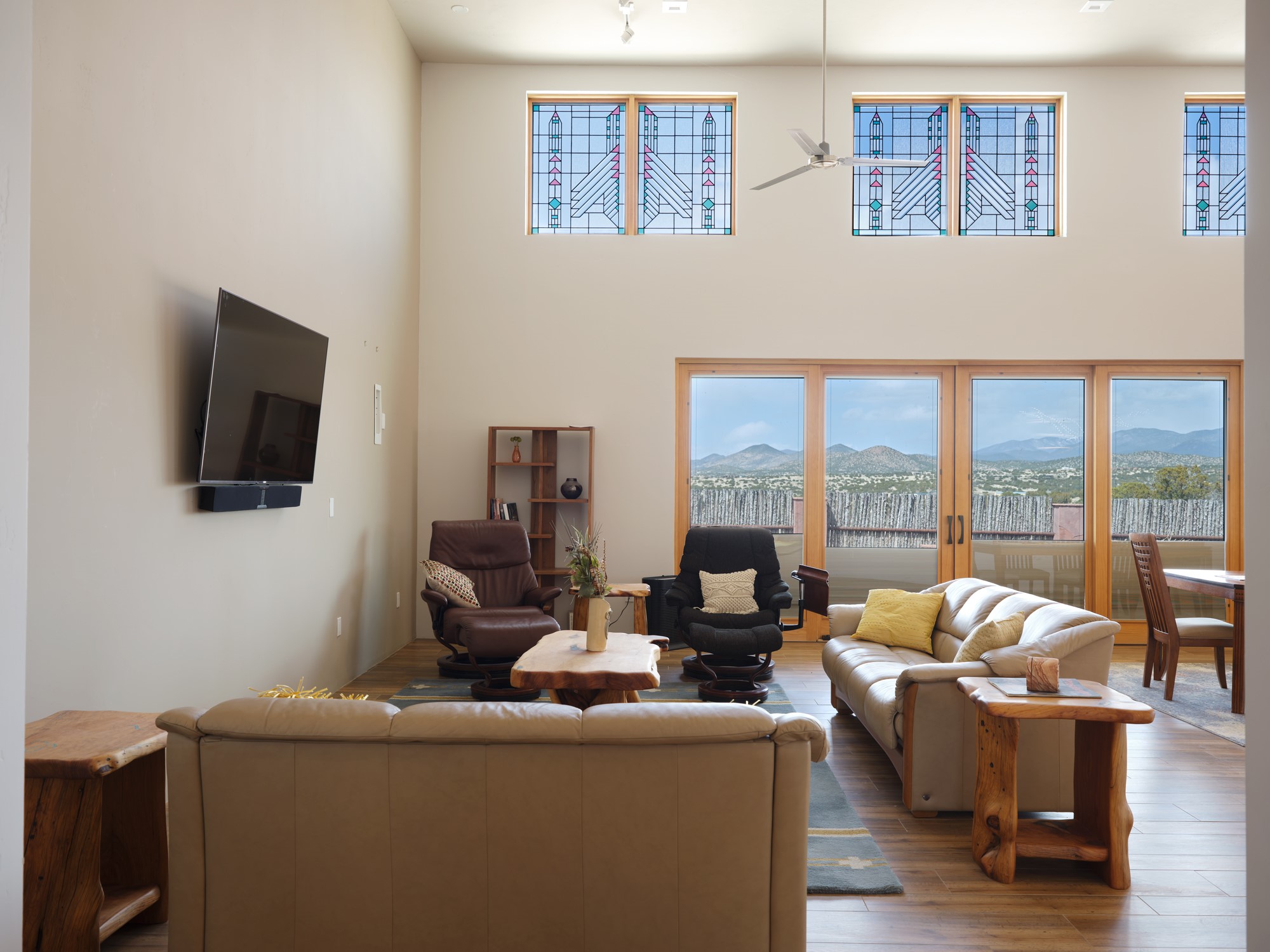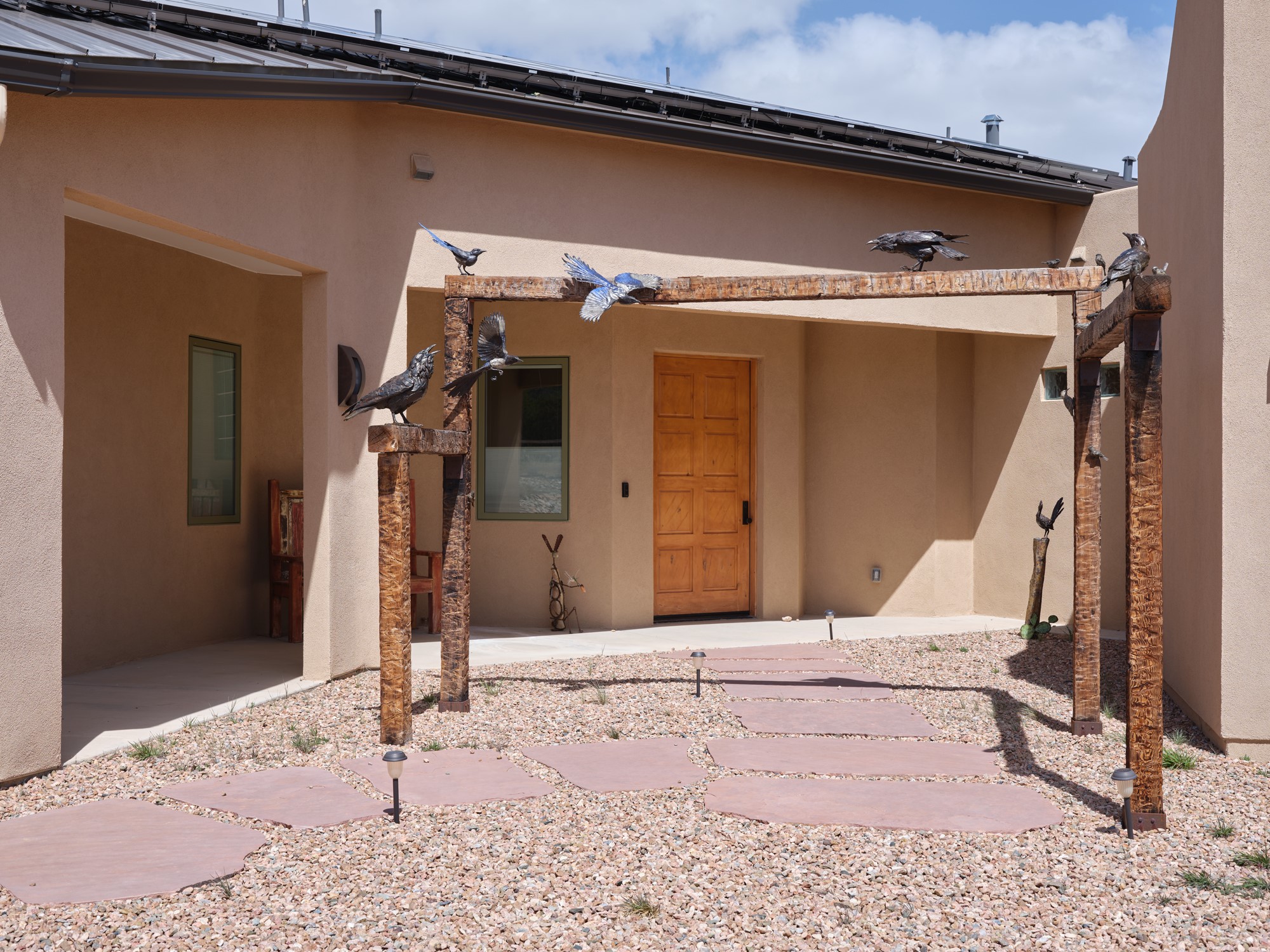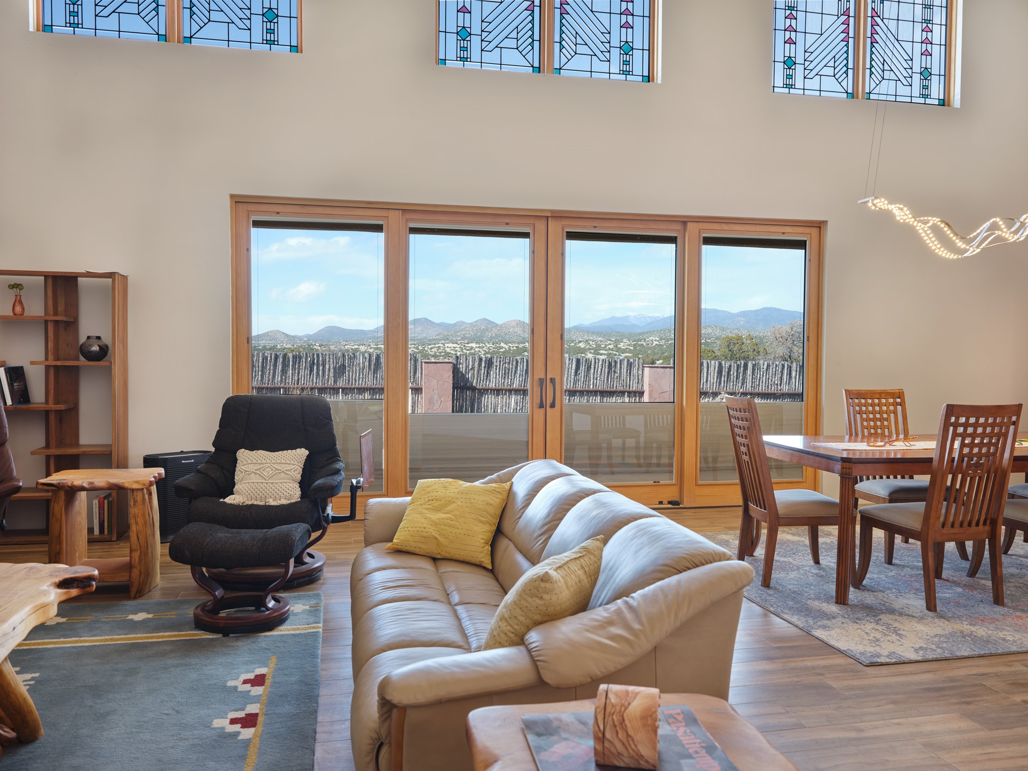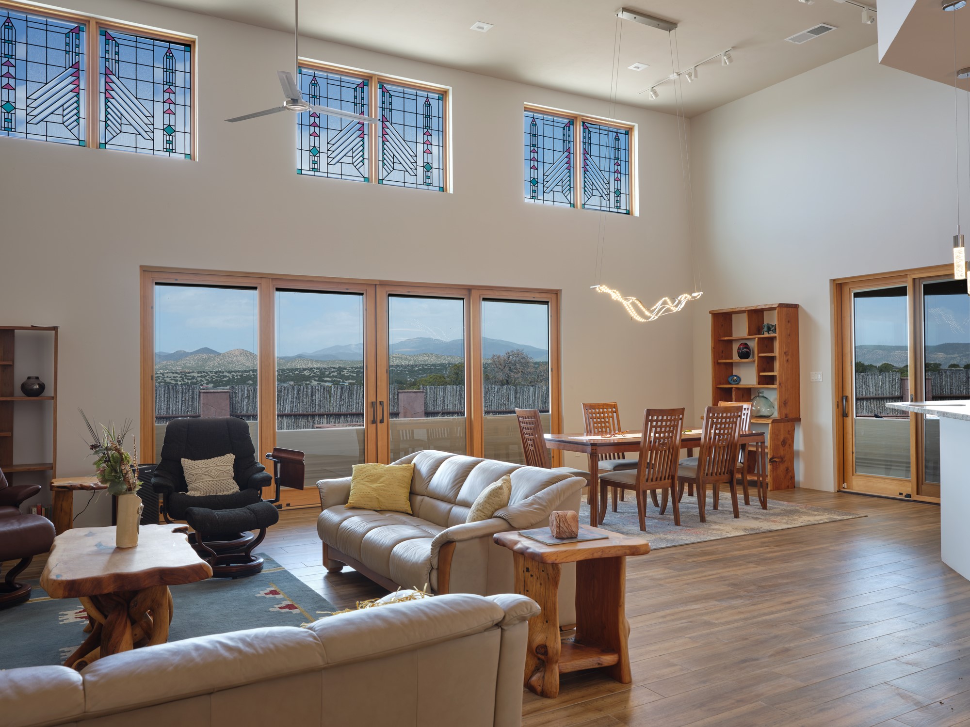Price reduced substantially! 26 Cattle Drive is a contemporary, 4-bed/4-bath home situated on 12.5 acres on a high ridge overlooking Lamy and the Galisteo basin with expansive, unobstructed views of the Sangre de Cristo, Jemez, and Ortiz mountains. In a pastoral setting adjoining a 100-acre private easement and the 4,000 acre Eldorado Wilderness, 26 Cattle Dr. is just 20 minutes from the Plaza and 5 minutes to the Eldorado Super Market, shopping, and nearby restaurants. Living room, master bedroom and three of the four bedrooms have direct access to the enclosed north-side patio. All bedrooms are ensuite (three full and one 3/4). A fully outfitted chef's kitchen including warming drawer beneath stove top and dramatic, lofty ceilings in the living/dining/kitchen and master bedroom grace the home. Counter-tops throughout are matching granite. Utilities include natural gas, a shared well and septic. Security, lighting, and entertainment systems are master-controlled. The 2-car attached garage includes a large separate, locked large storage area. The roof-mounted solar panels provide almost 100% of the electrical requirements. Rainwater is captured by a cistern for outdoor watering. An "art-wall" and entryway display case accommodate artwork. The expansive outdoor deck, accessible through an inside stairway provides yet another way to enjoy the spectacular views. Completed in 2018, 26 Cattle Drive is an eminently livable, one-of-a-kind property.