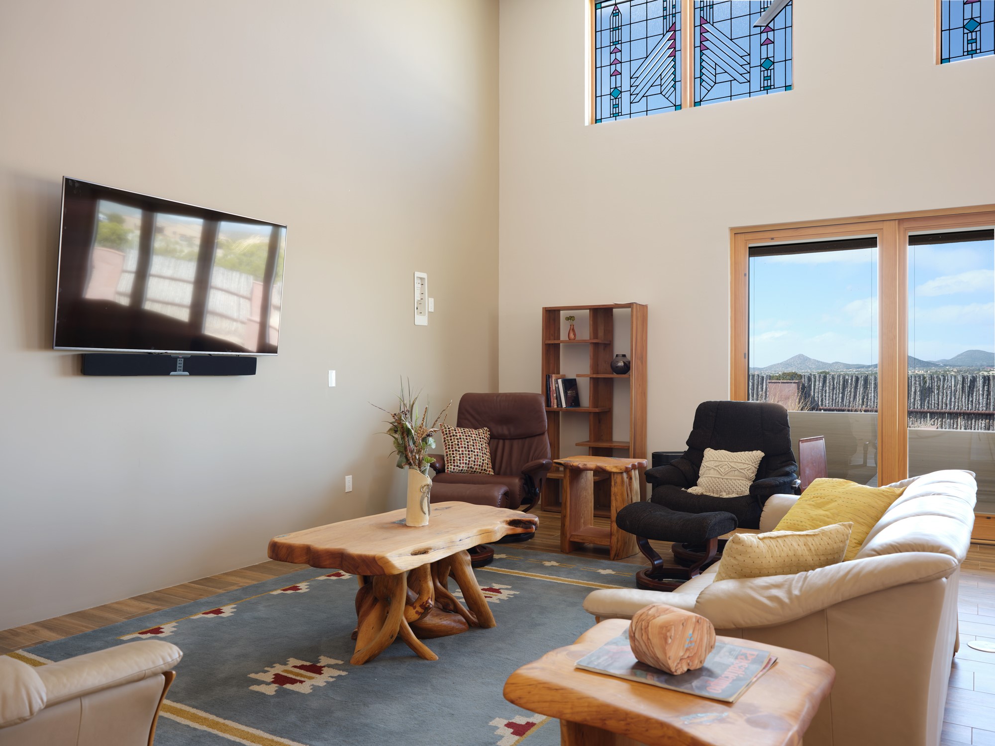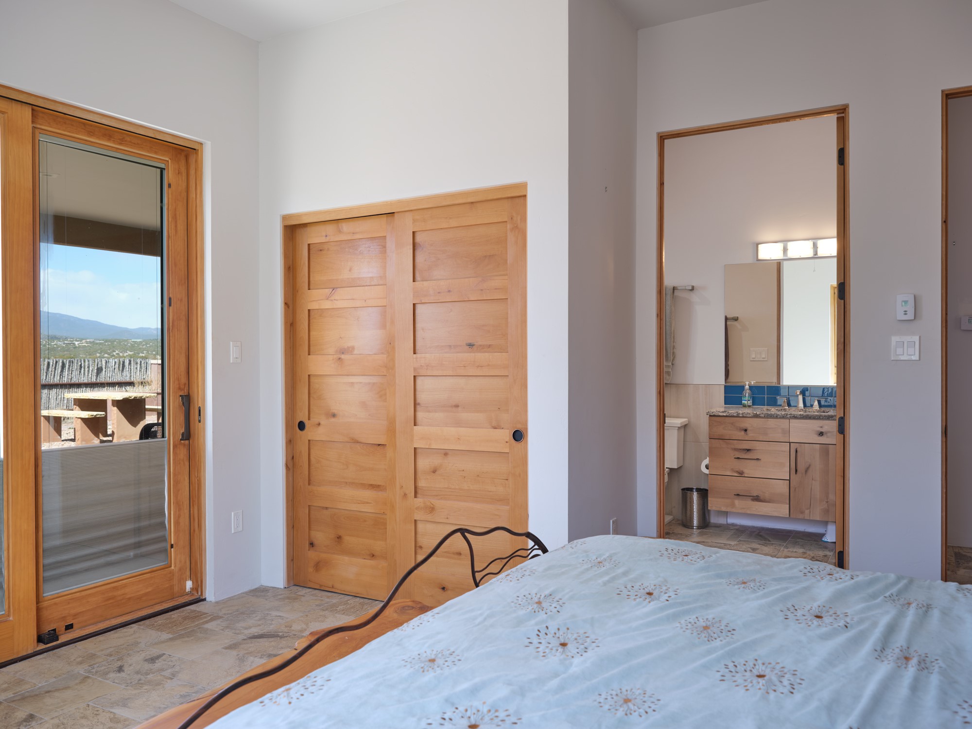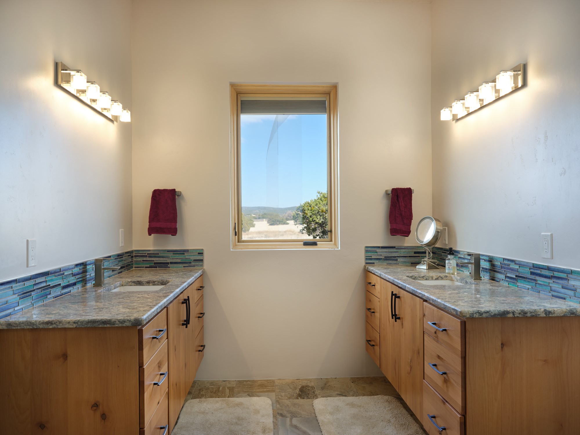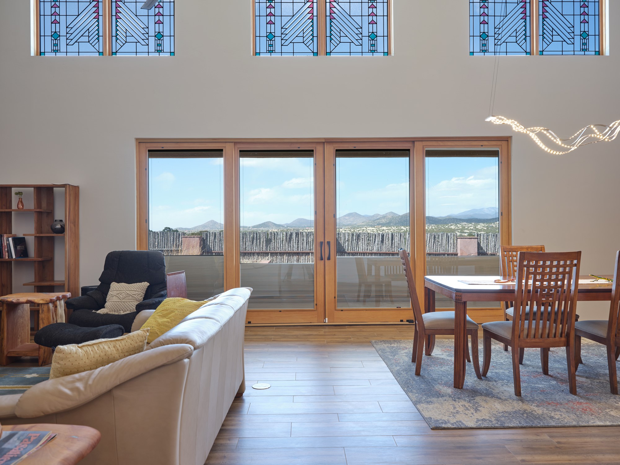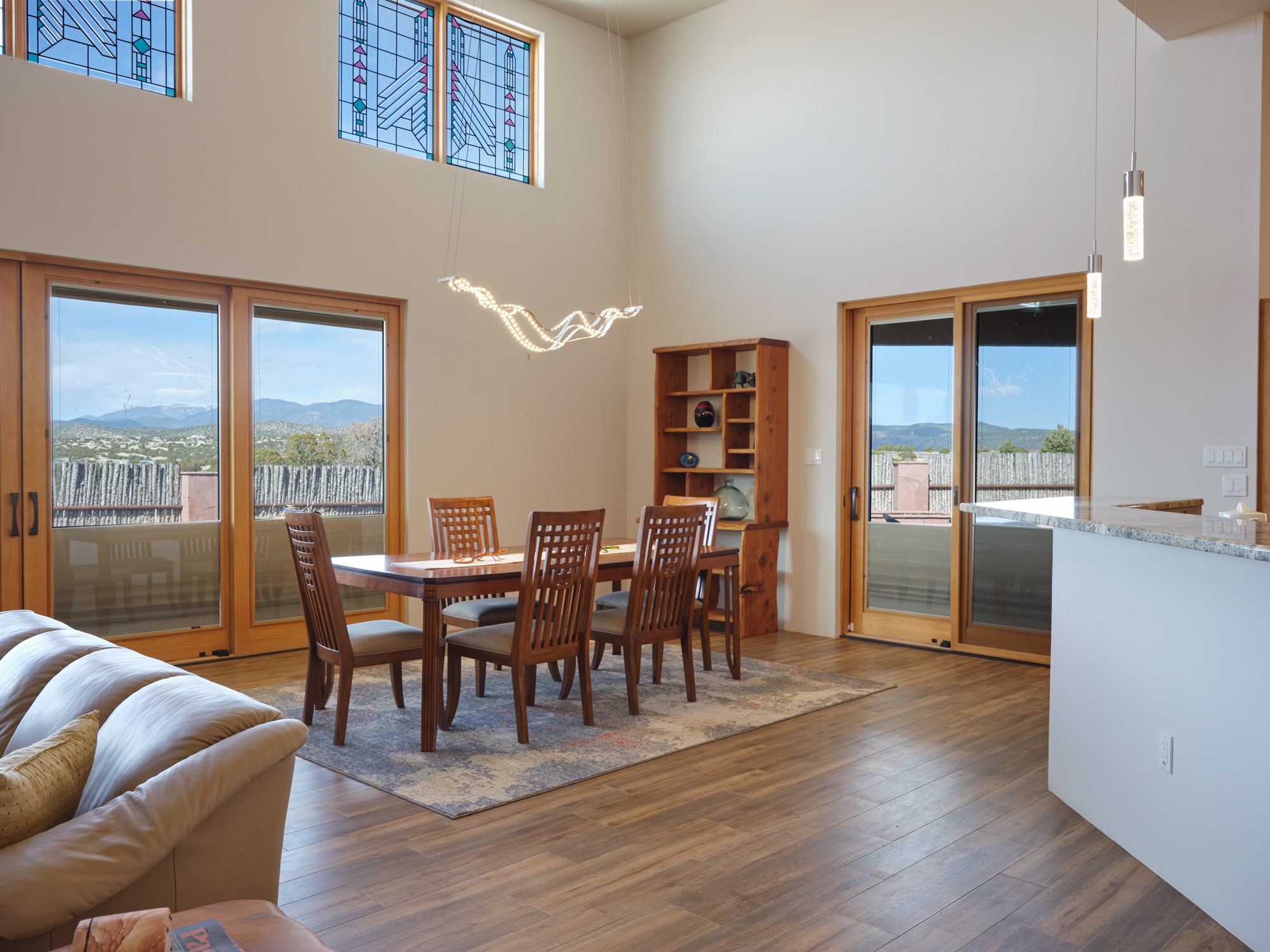 Price reduced substantially! 26 Cattle Drive is a contemporary, 4-bed/4-bath home situated on 12.5 acres on a high ridge overlooking Lamy and the Galisteo basin with expansive, unobstructed views of the Sangre de Cristo, Jemez, and Ortiz mountains. In a pastoral setting adjoining a 100-acre private easement and the 4,000 acre Eldorado Wilderness, 26 Cattle Dr. is just 20 minutes from the Plaza and 5 minutes to the Eldorado Super Market, shopping, and nearby restaurants. Living room, master bedroom and three of the four bedrooms have direct access to the enclosed north-side patio. All bedrooms are ensuite (three full and one 3/4). A fully outfitted chef's kitchen including warming drawer beneath stove top and dramatic, lofty ceilings in the living/dining/kitchen and master bedroom grace the home. Counter-tops throughout are matching granite. Utilities include natural gas, a shared well and septic. Security, lighting, and entertainment systems are master-controlled. The 2-car attached garage includes a large separate, locked large storage area. The roof-mounted solar panels provide almost 100% of the electrical requirements. Rainwater is captured by a cistern for outdoor watering. An "art-wall" and entryway display case accommodate artwork. The expansive outdoor deck, accessible through an inside stairway provides yet another way to enjoy the spectacular views. Completed in 2018, 26 Cattle Drive is an eminently livable, one-of-a-kind property.
