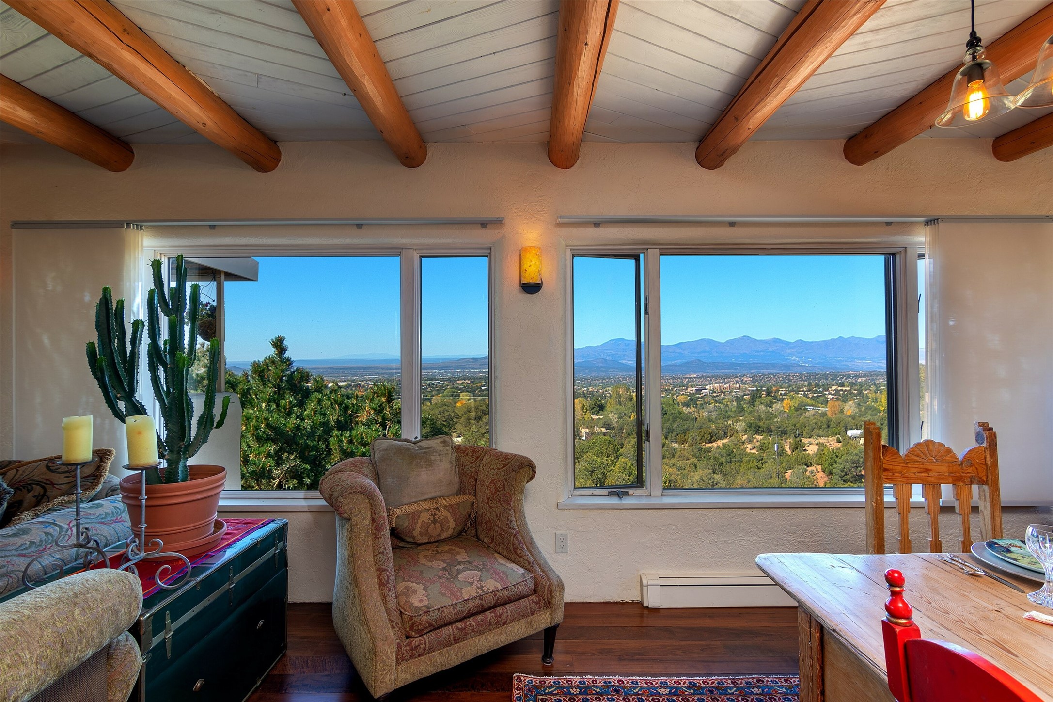 Spacious Spanish style 3 bedroom 3.5 bath home on 1.5 +/- acres in a beautiful gated community with spectacular views. Enter the home to a custom fabricated, steel and walnut tread, open rise staircase which leads up to the expansive living/dining/kitchen area. This entertaining space provides breathtaking, 360 panoramic mountain and city views. Brazilian exotic wood floors and hand-picked, Italian granite counters throughout the entire home. Gourmet kitchen is appointed with a 36" Viking gas range, professional GE Monogram refrigerator/freezer and a center island. The luxurious owner's suite boasts an ensuite bath that includes a free-standing soaking tub, a large walk-in shower, plus dual vanities/sinks. The owner's siting area includes a kiva fireplace ideal for cold, snowy nights. The additional bedrooms all have mountain views. New washer/dryer in 2022. The ample-sized studio offers flex space for your creative or business needs as it has a private entrance and driveway. There are 2 fenced areas making this property pet friendly. Convenient location within minutes to Canyon Road, Museum Hill, theaters, shopping, medical and restaurants.