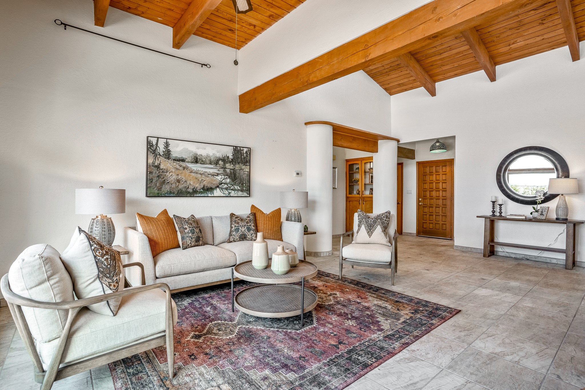 The perfect home in the perfect Midtown location. Great Sandia and Ortiz mountain views from the large picture window in the living room and patio. This 1900 sq. ft. home has 3 bedrooms, 3 bathrooms and an attached office/studio. Great entry courtyard and large back patio with views. Multiple fruit trees and garden boxes with irrigation system on this .45 acre lot. Enjoy your coffee on the pergola swing and the sunrises and sunsets are always spectacular.