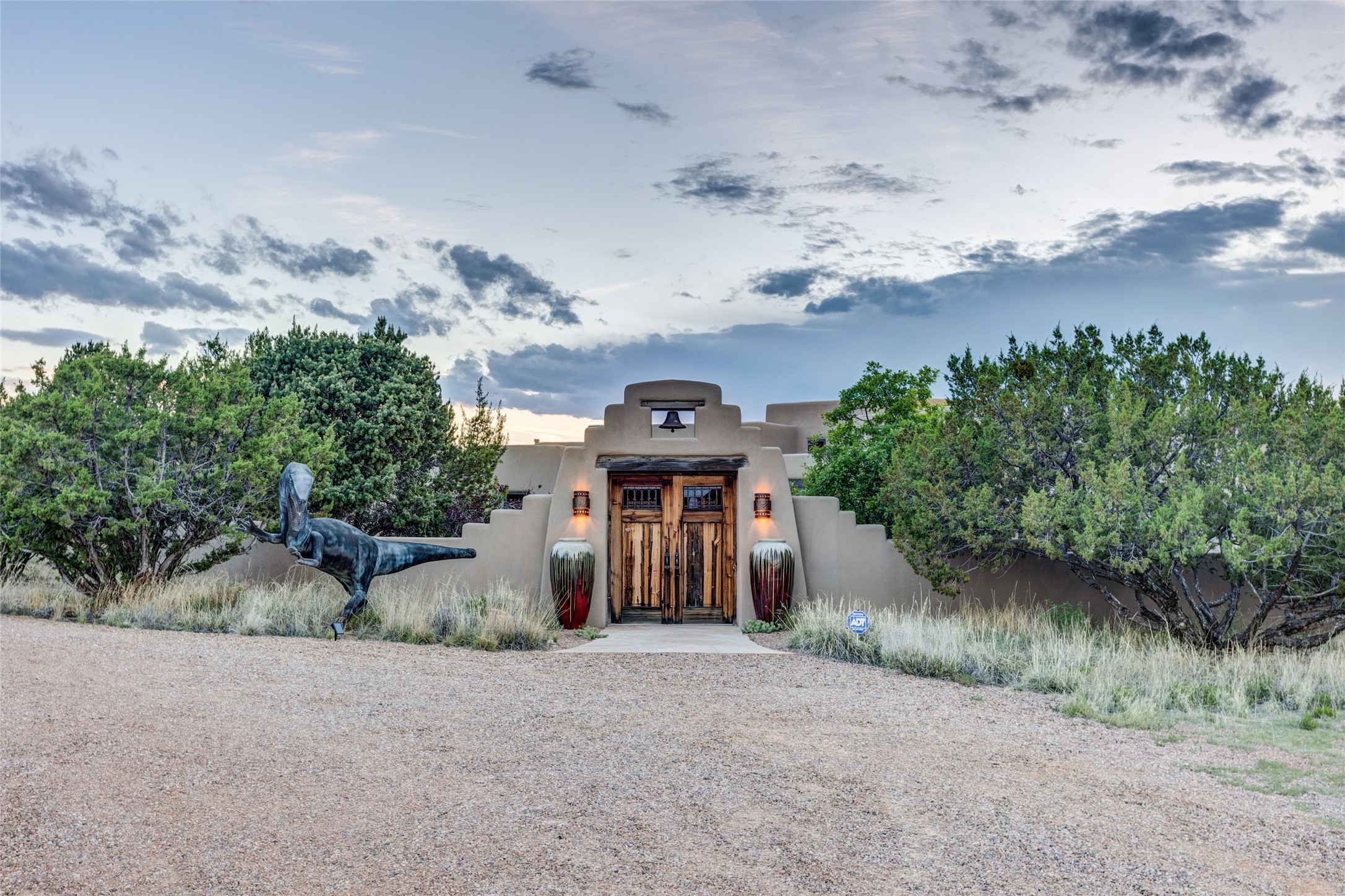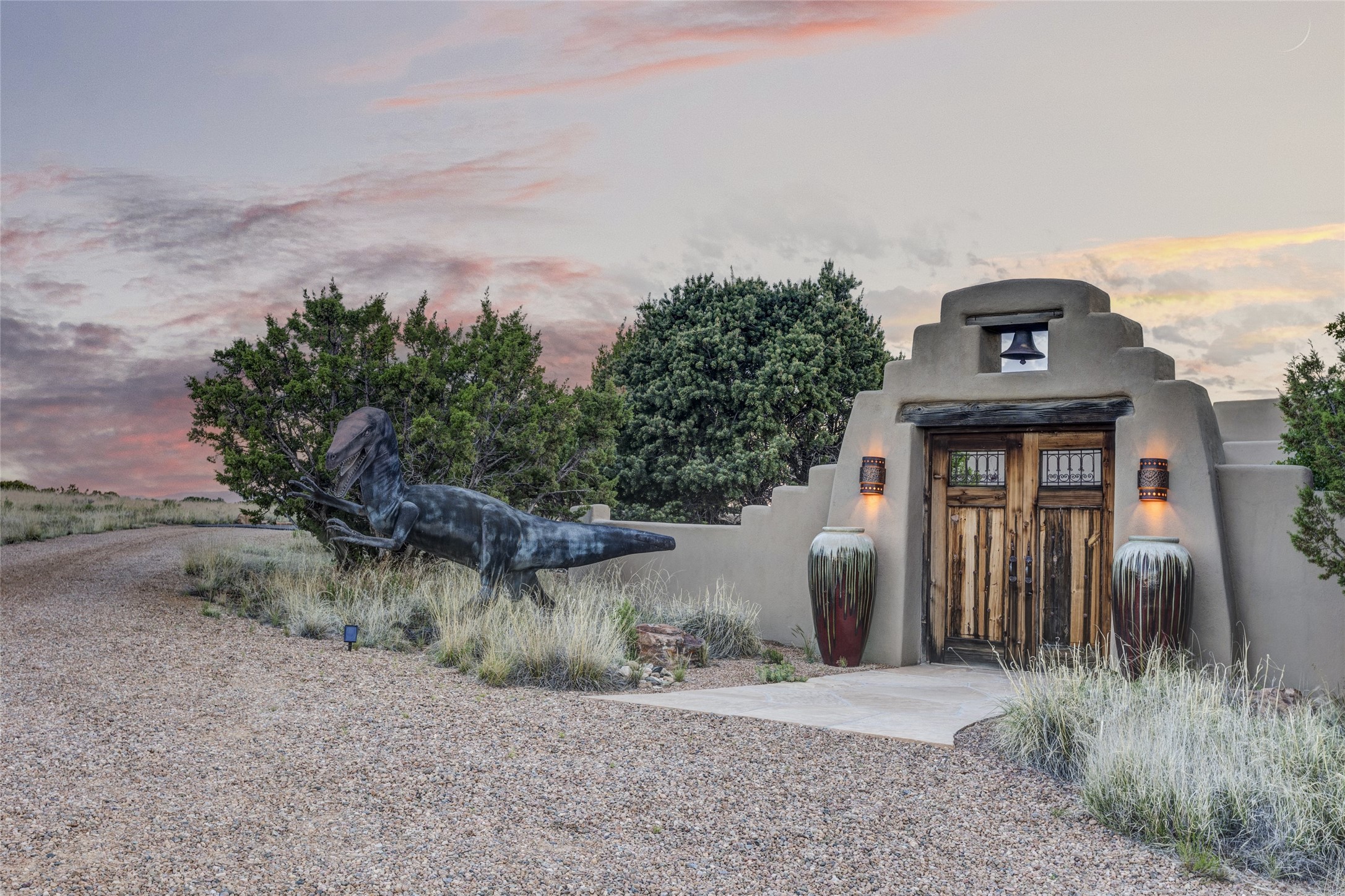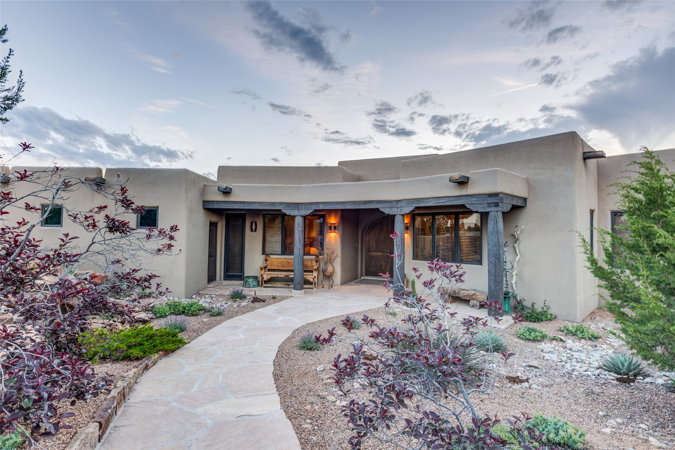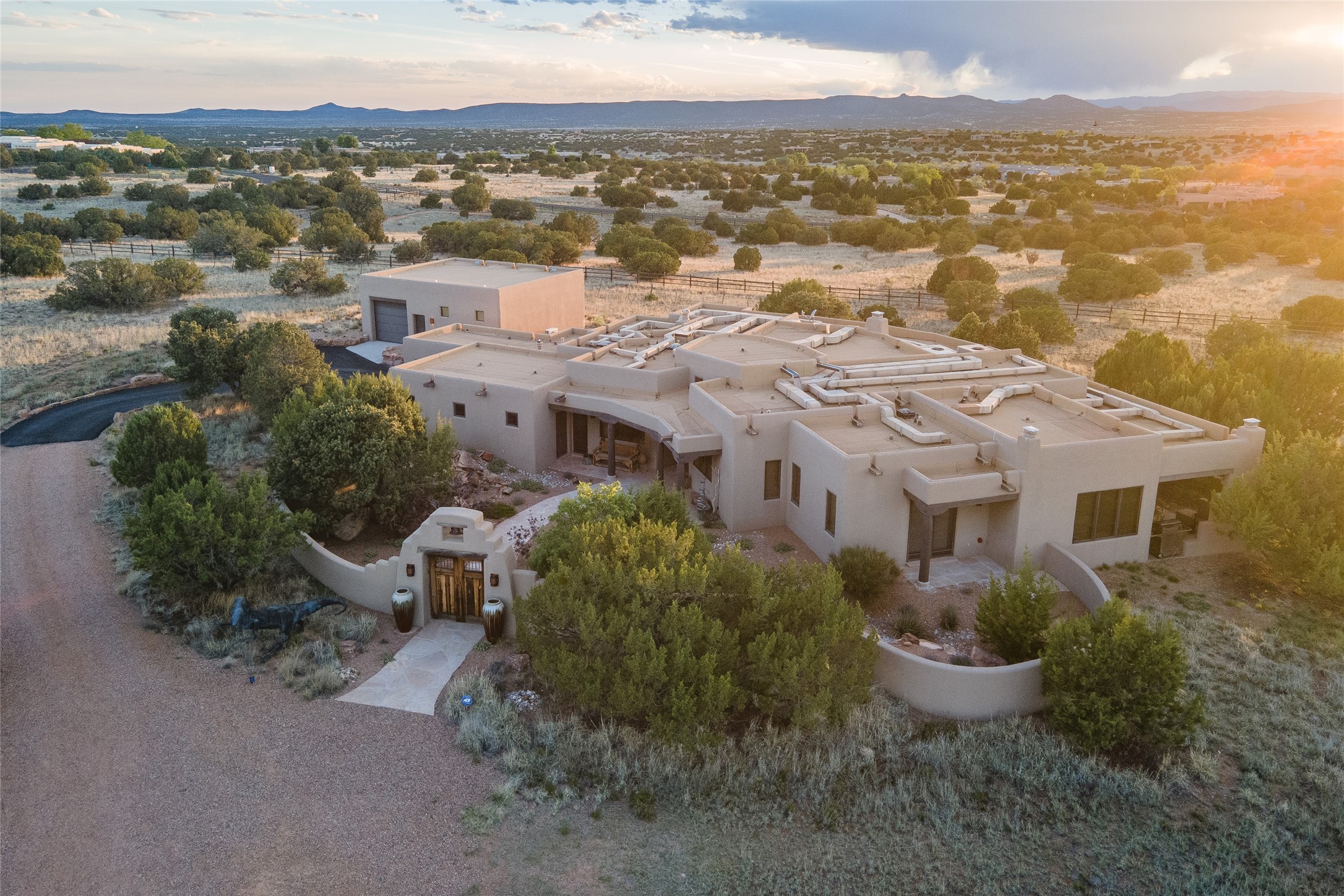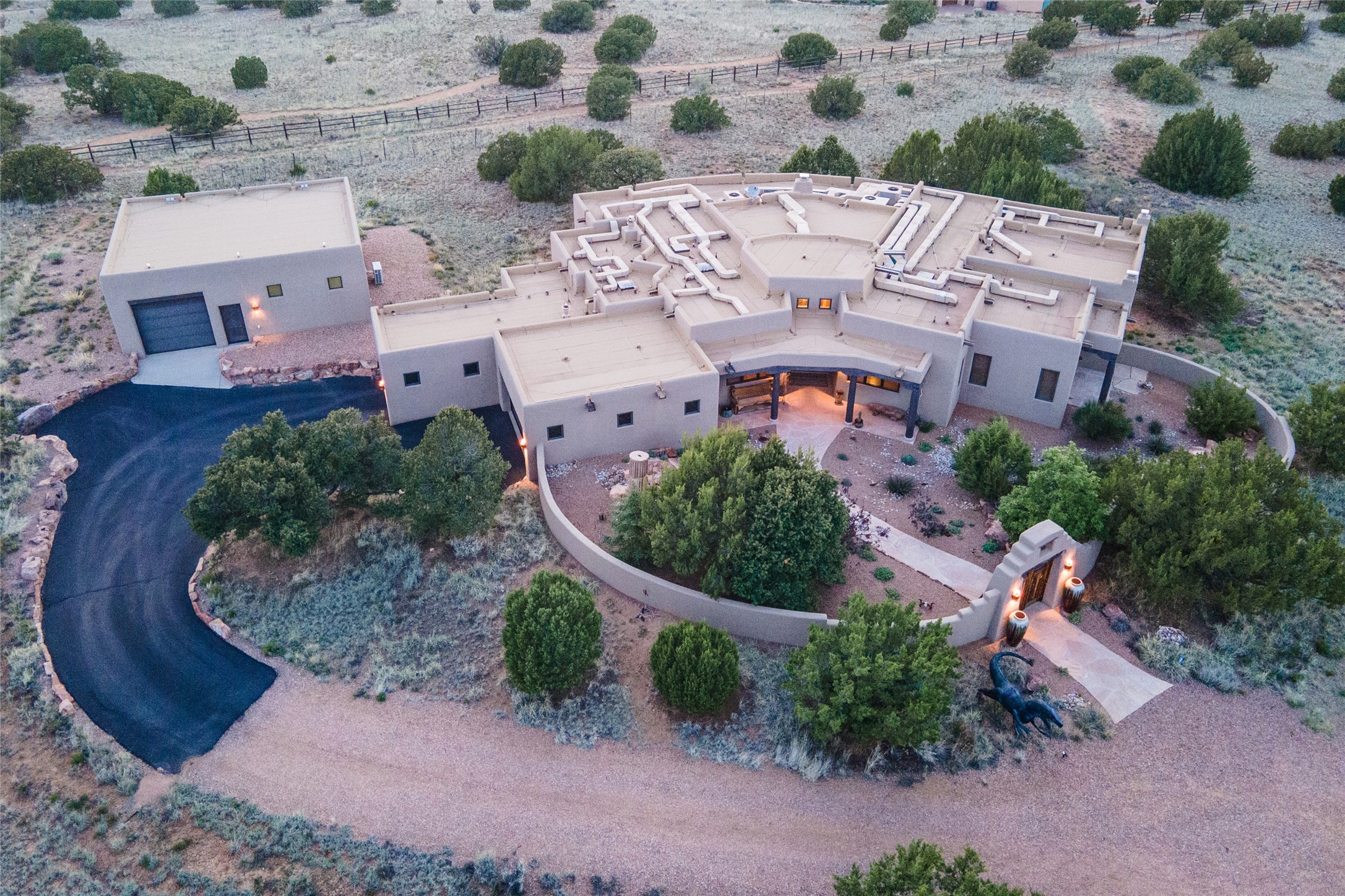 Located in Los Suenos, on a large 3-acre lot at the end of a private cul-de-sac, this single-level, 4-bedroom, 4-bath home is authentic Santa Fe Style, situated to offer 360-degree views of the surrounding mountain ranges so you may enjoy both a stunning sunrise and sunset. This well-designed home is pristinely maintained and offers elegance, privacy, separation of space, formal and informal living, and an abundance of outdoor entertaining options. Enter through the gorgeous bell tower arch and authentic Mexican wooden gates into an elegant, low-maintenance southwestern rock garden. Arched 8-foot tall front doors of knotty alder open into an elevated 13 foot foyer with split-cedar ceilings, aged vigas, hand-troweled buckskin plaster, tumbled travertine floors, and four fireplaces throughout. The kitchen is timelessly designed with opulent Brazilian granite and custom maple cabinetry with a copper farm sink, wine cooler, and a large walk-in pantry, providing plenty of storage for the perfect Chef's kitchen. The spa-like primary suite is handsomely appointed with a kiva-styled, double-sided fireplace, soaking, jetted tub, considerable shower, double sinks, a large walk-in closet, and a small sitting or office area. You can open up the multipurpose northern wing for large gatherings or close it with pocket doors for guest quarters or media space. It is well equipped with a wet-bar, mini refrigerator, full bathroom, kiva fireplace, and direct access to the dining portal. All four bedrooms present outdoor access, full en-suite baths, and California closets. A 3-car garage offers extensive storage, and the owner added a 1,050 sq. ft. studio in 2016. The studio provides heating and cooling, tall ceilings, and a 9-foot garage door. Perfect for any artist or hobbyist, or can be converted into a guest home/studio. Impressive in every detail; see for yourself.
