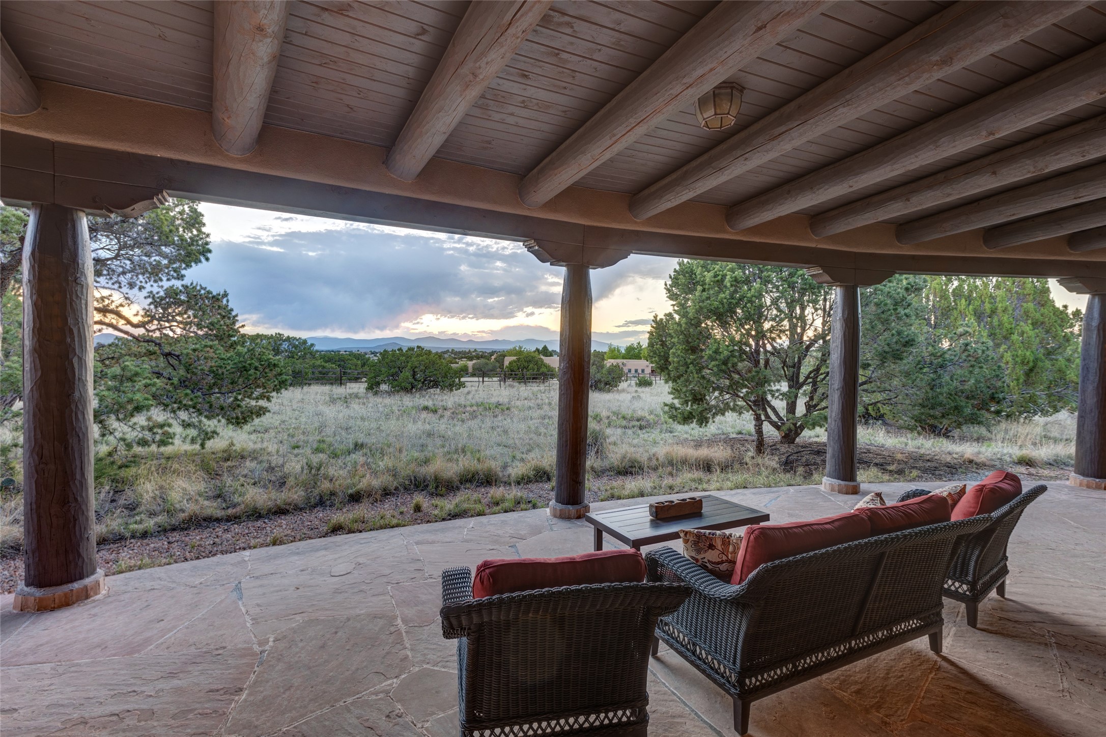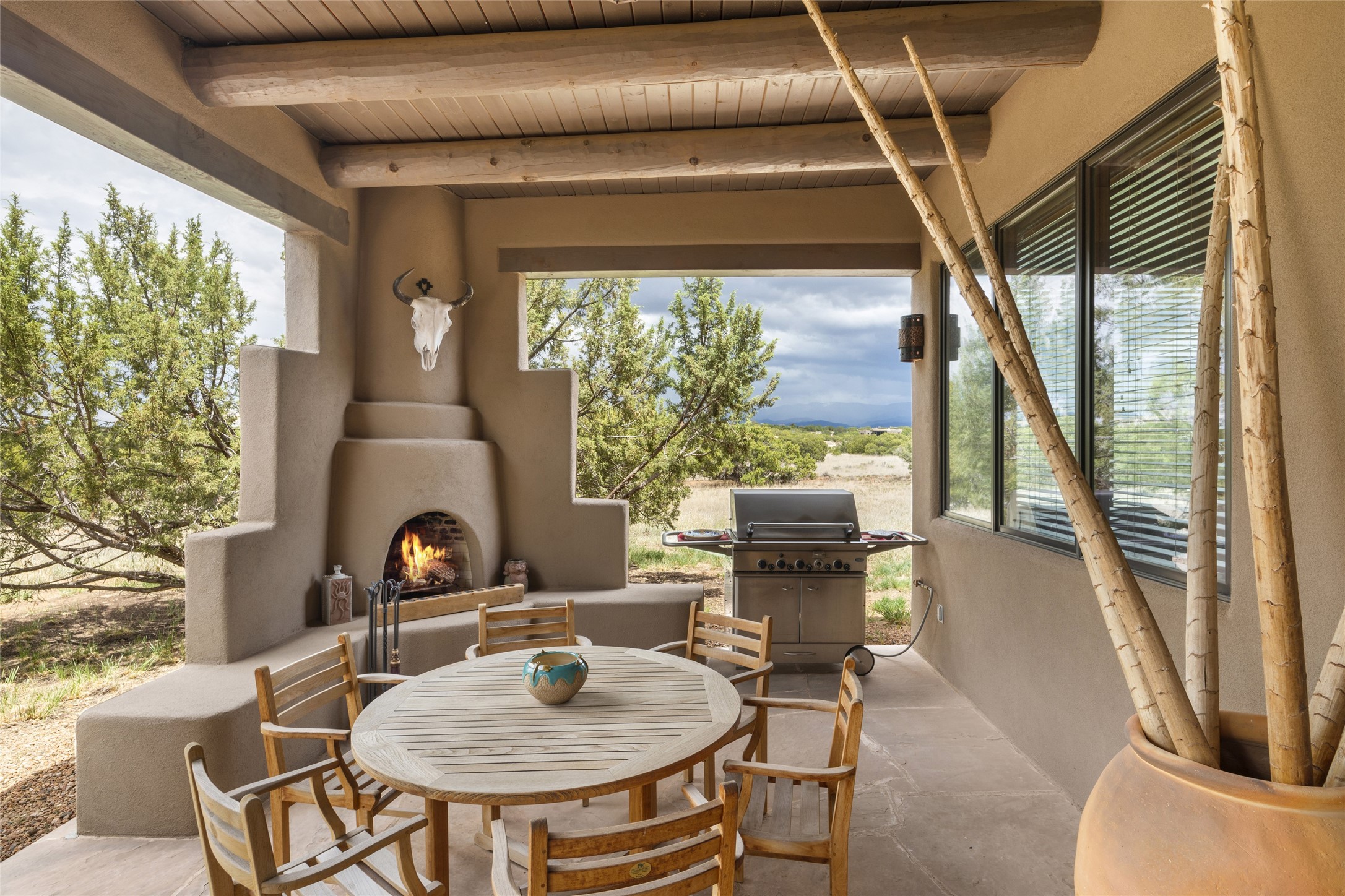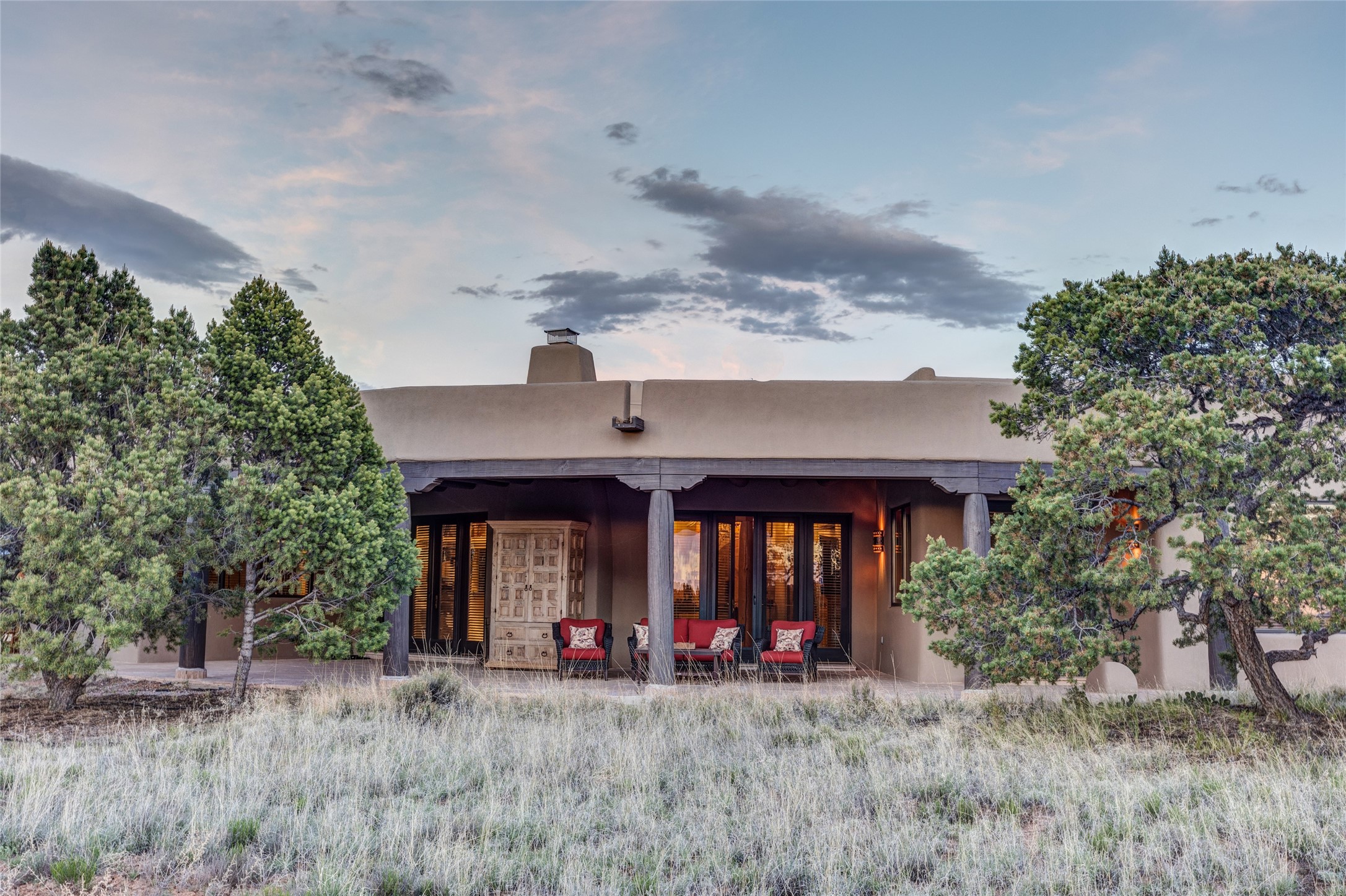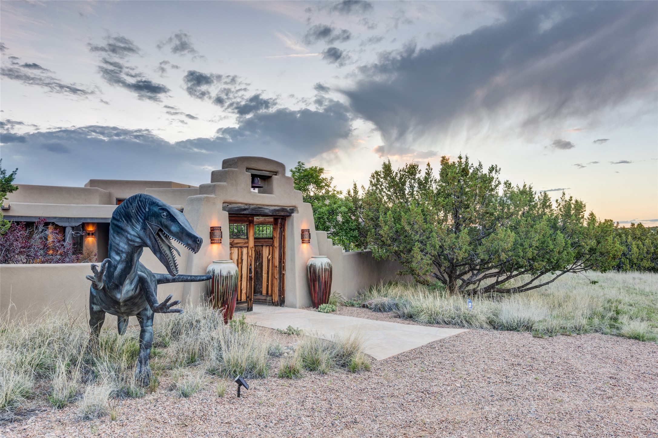 Located in Los Suenos, on a large 3-acre lot at the end of a private cul-de-sac, this single-level, 4-bedroom, 4-bath home is authentic Santa Fe Style, situated to offer 360-degree views of the surrounding mountain ranges so you may enjoy both a stunning sunrise and sunset. This well-designed home is pristinely maintained and offers elegance, privacy, separation of space, formal and informal living, and an abundance of outdoor entertaining options. Enter through the gorgeous bell tower arch and authentic Mexican wooden gates into an elegant, low-maintenance southwestern rock garden. Arched 8-foot tall front doors of knotty alder open into an elevated 13 foot foyer with split-cedar ceilings, aged vigas, hand-troweled buckskin plaster, tumbled travertine floors, and four fireplaces throughout. The kitchen is timelessly designed with opulent Brazilian granite and custom maple cabinetry with a copper farm sink, wine cooler, and a large walk-in pantry, providing plenty of storage for the perfect Chef's kitchen. The spa-like primary suite is handsomely appointed with a kiva-styled, double-sided fireplace, soaking, jetted tub, considerable shower, double sinks, a large walk-in closet, and a small sitting or office area. You can open up the multipurpose northern wing for large gatherings or close it with pocket doors for guest quarters or media space. It is well equipped with a wet-bar, mini refrigerator, full bathroom, kiva fireplace, and direct access to the dining portal. All four bedrooms present outdoor access, full en-suite baths, and California closets. A 3-car garage offers extensive storage, and the owner added a 1,050 sq. ft. studio in 2016. The studio provides heating and cooling, tall ceilings, and a 9-foot garage door. Perfect for any artist or hobbyist, or can be converted into a guest home/studio. Impressive in every detail; see for yourself.
