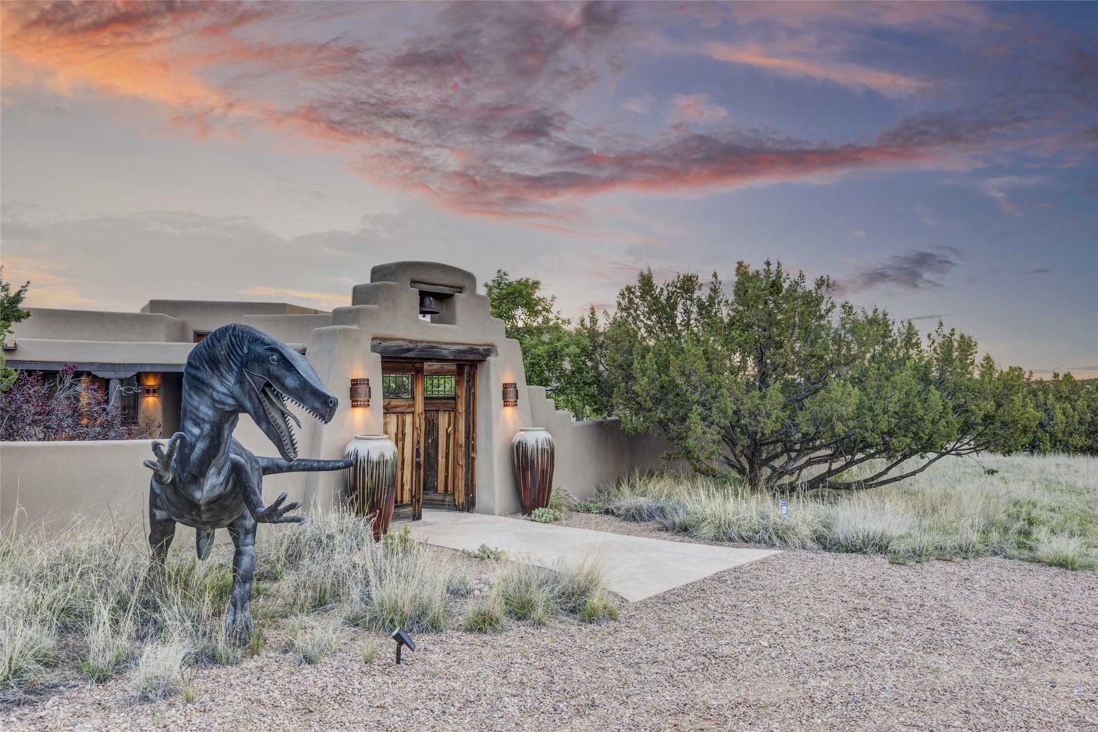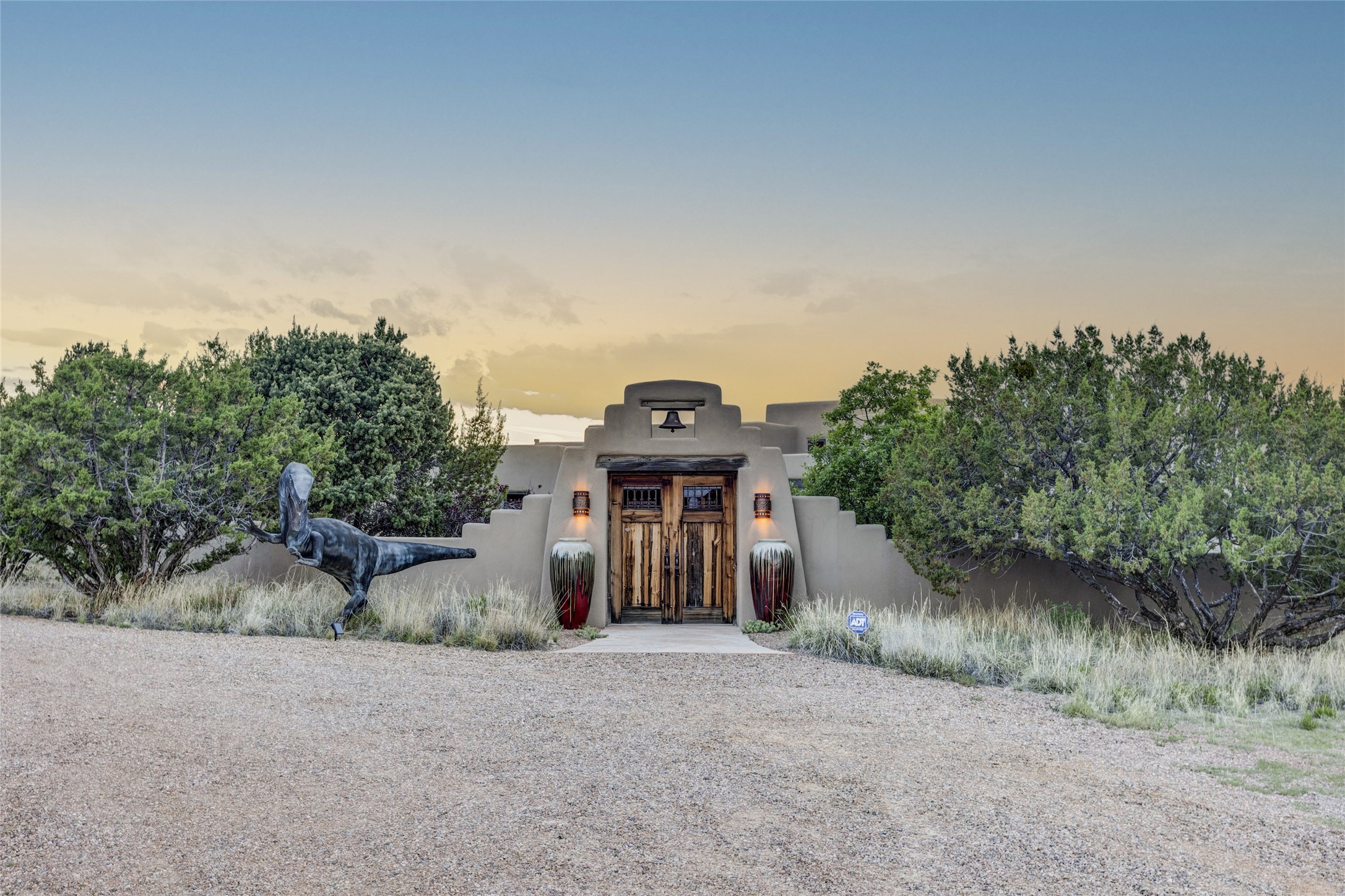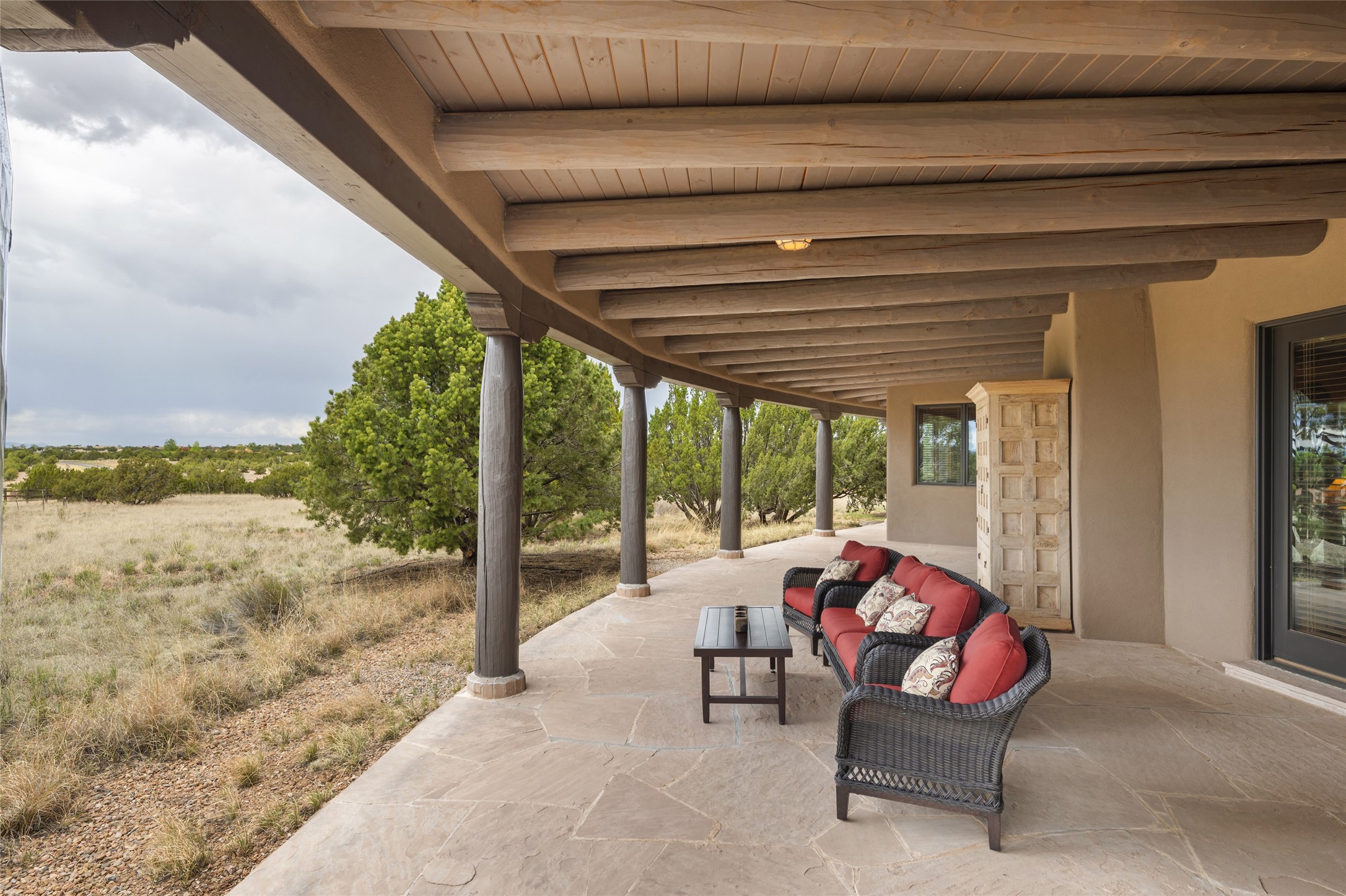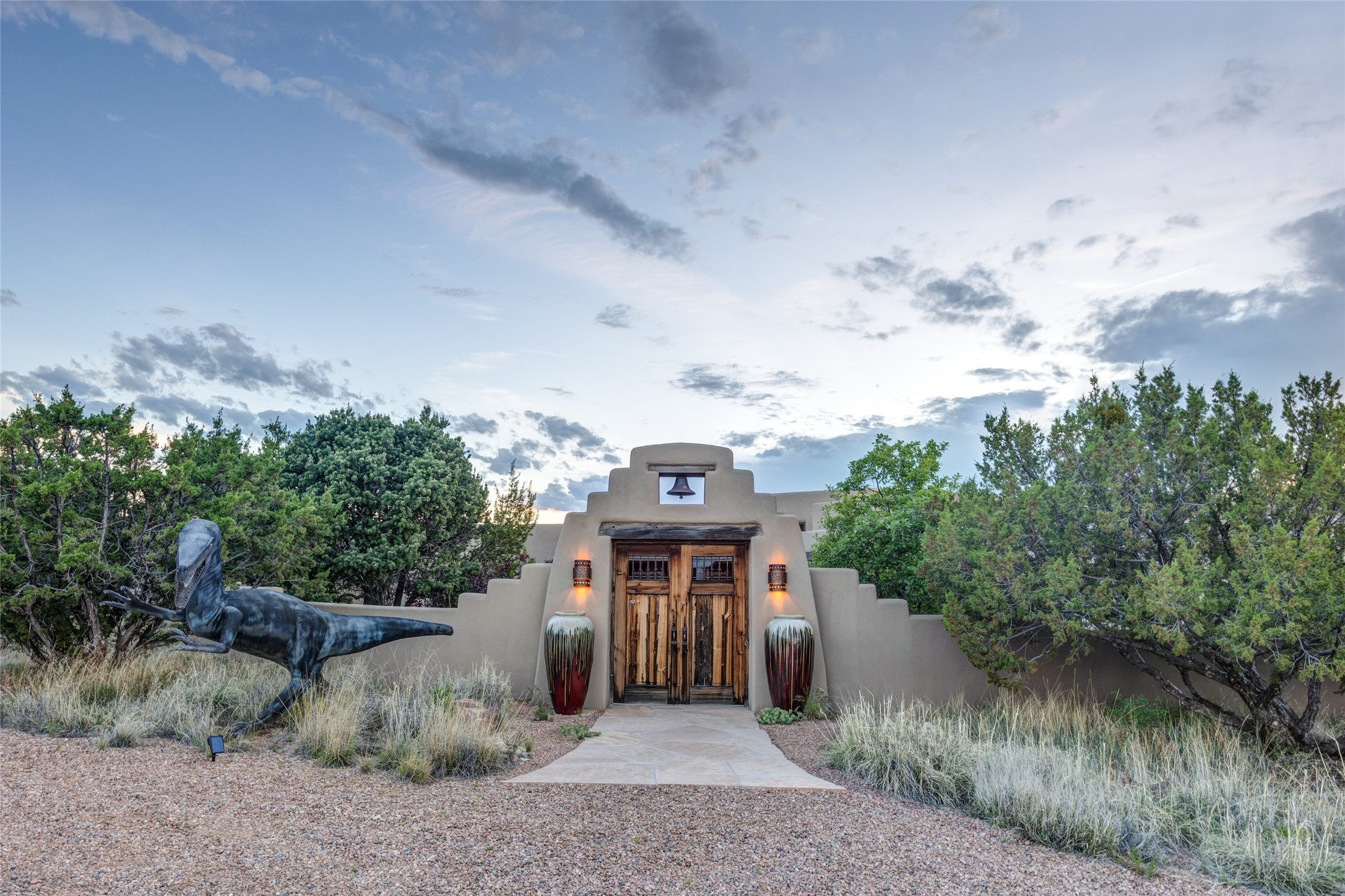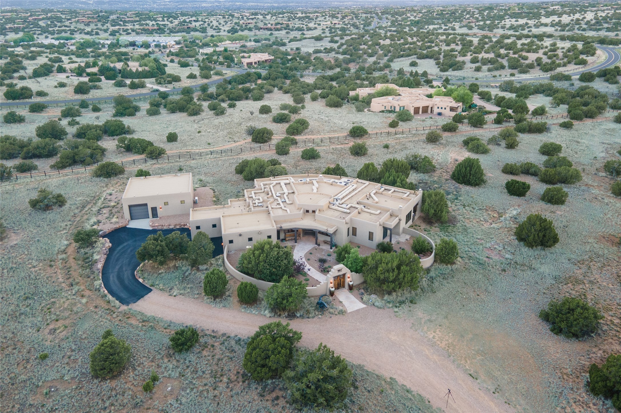 Located in Los Suenos, on a large 3-acre lot at the end of a private cul-de-sac, this single-level, 4-bedroom, 4-bath home is authentic Santa Fe Style, situated to offer 360-degree views of the surrounding mountain ranges so you may enjoy both a stunning sunrise and sunset. This well-designed home is pristinely maintained and offers elegance, privacy, separation of space, formal and informal living, and an abundance of outdoor entertaining options. Enter through the gorgeous bell tower arch and authentic Mexican wooden gates into an elegant, low-maintenance southwestern rock garden. Arched 8-foot tall front doors of knotty alder open into an elevated 13 foot foyer with split-cedar ceilings, aged vigas, hand-troweled buckskin plaster, tumbled travertine floors, and four fireplaces throughout. The kitchen is timelessly designed with opulent Brazilian granite and custom maple cabinetry with a copper farm sink, wine cooler, and a large walk-in pantry, providing plenty of storage for the perfect Chef's kitchen. The spa-like primary suite is handsomely appointed with a kiva-styled, double-sided fireplace, soaking, jetted tub, considerable shower, double sinks, a large walk-in closet, and a small sitting or office area. You can open up the multipurpose northern wing for large gatherings or close it with pocket doors for guest quarters or media space. It is well equipped with a wet-bar, mini refrigerator, full bathroom, kiva fireplace, and direct access to the dining portal. All four bedrooms present outdoor access, full en-suite baths, and California closets. A 3-car garage offers extensive storage, and the owner added a 1,050 sq. ft. studio in 2016. The studio provides heating and cooling, tall ceilings, and a 9-foot garage door. Perfect for any artist or hobbyist, or can be converted into a guest home/studio. Impressive in every detail; see for yourself.