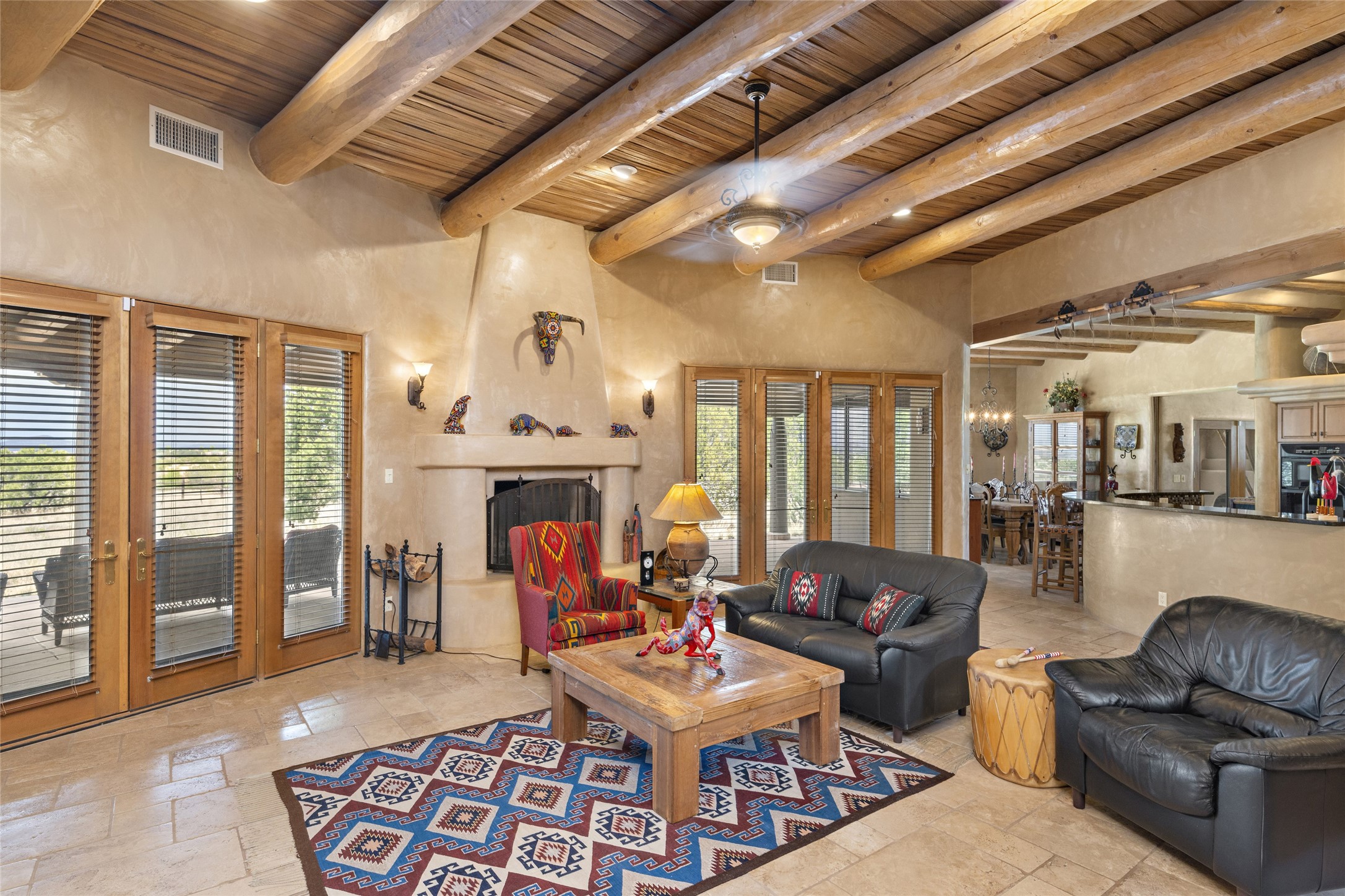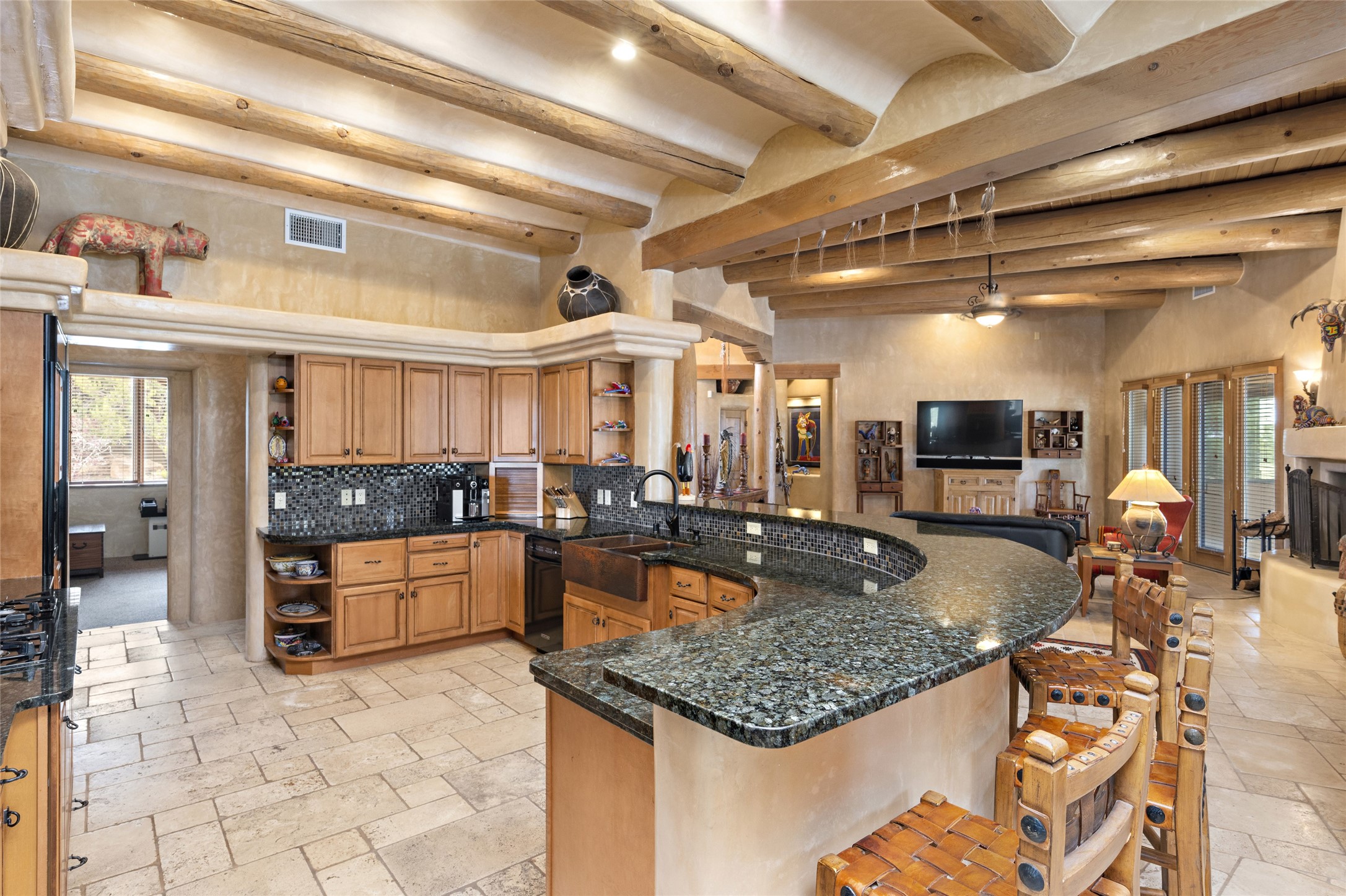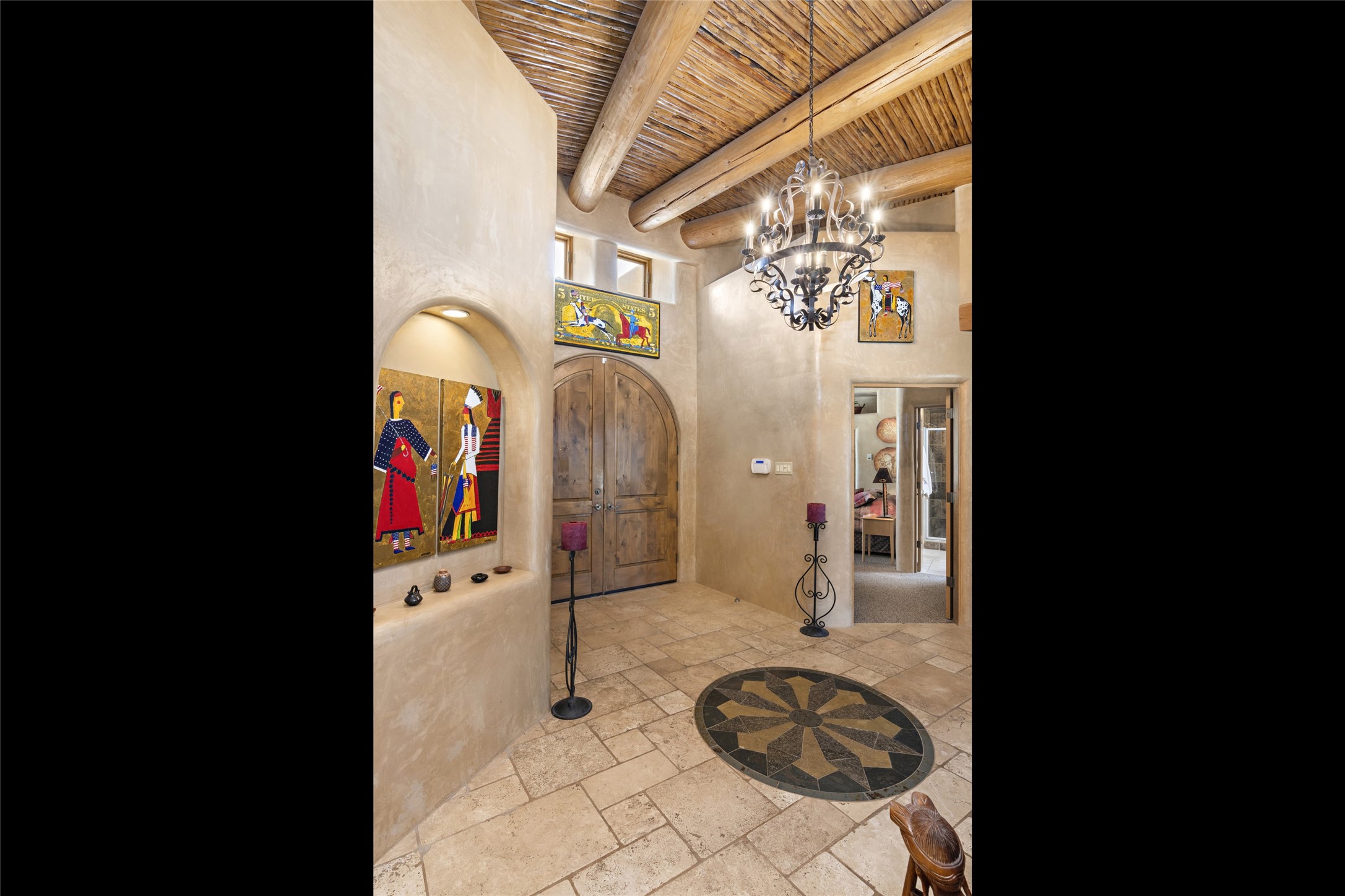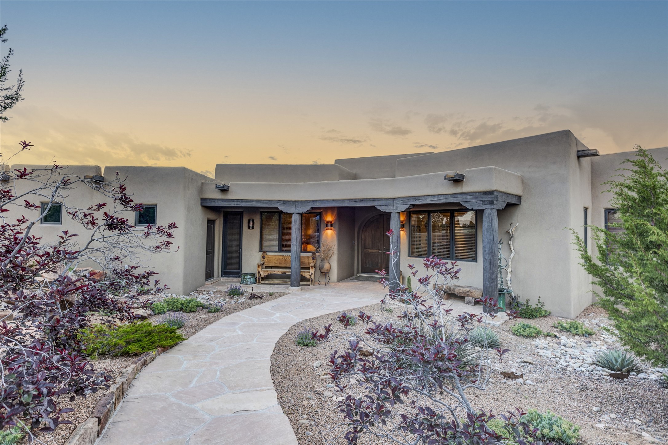 Located in Los Suenos, on a large 3-acre lot at the end of a private cul-de-sac, this single-level, 4-bedroom, 4-bath home is authentic Santa Fe Style, situated to offer 360-degree views of the surrounding mountain ranges so you may enjoy both a stunning sunrise and sunset. This well-designed home is pristinely maintained and offers elegance, privacy, separation of space, formal and informal living, and an abundance of outdoor entertaining options. Enter through the gorgeous bell tower arch and authentic Mexican wooden gates into an elegant, low-maintenance southwestern rock garden. Arched 8-foot tall front doors of knotty alder open into an elevated 13 foot foyer with split-cedar ceilings, aged vigas, hand-troweled buckskin plaster, tumbled travertine floors, and four fireplaces throughout. The kitchen is timelessly designed with opulent Brazilian granite and custom maple cabinetry with a copper farm sink, wine cooler, and a large walk-in pantry, providing plenty of storage for the perfect Chef's kitchen. The spa-like primary suite is handsomely appointed with a kiva-styled, double-sided fireplace, soaking, jetted tub, considerable shower, double sinks, a large walk-in closet, and a small sitting or office area. You can open up the multipurpose northern wing for large gatherings or close it with pocket doors for guest quarters or media space. It is well equipped with a wet-bar, mini refrigerator, full bathroom, kiva fireplace, and direct access to the dining portal. All four bedrooms present outdoor access, full en-suite baths, and California closets. A 3-car garage offers extensive storage, and the owner added a 1,050 sq. ft. studio in 2016. The studio provides heating and cooling, tall ceilings, and a 9-foot garage door. Perfect for any artist or hobbyist, or can be converted into a guest home/studio. Impressive in every detail; see for yourself.