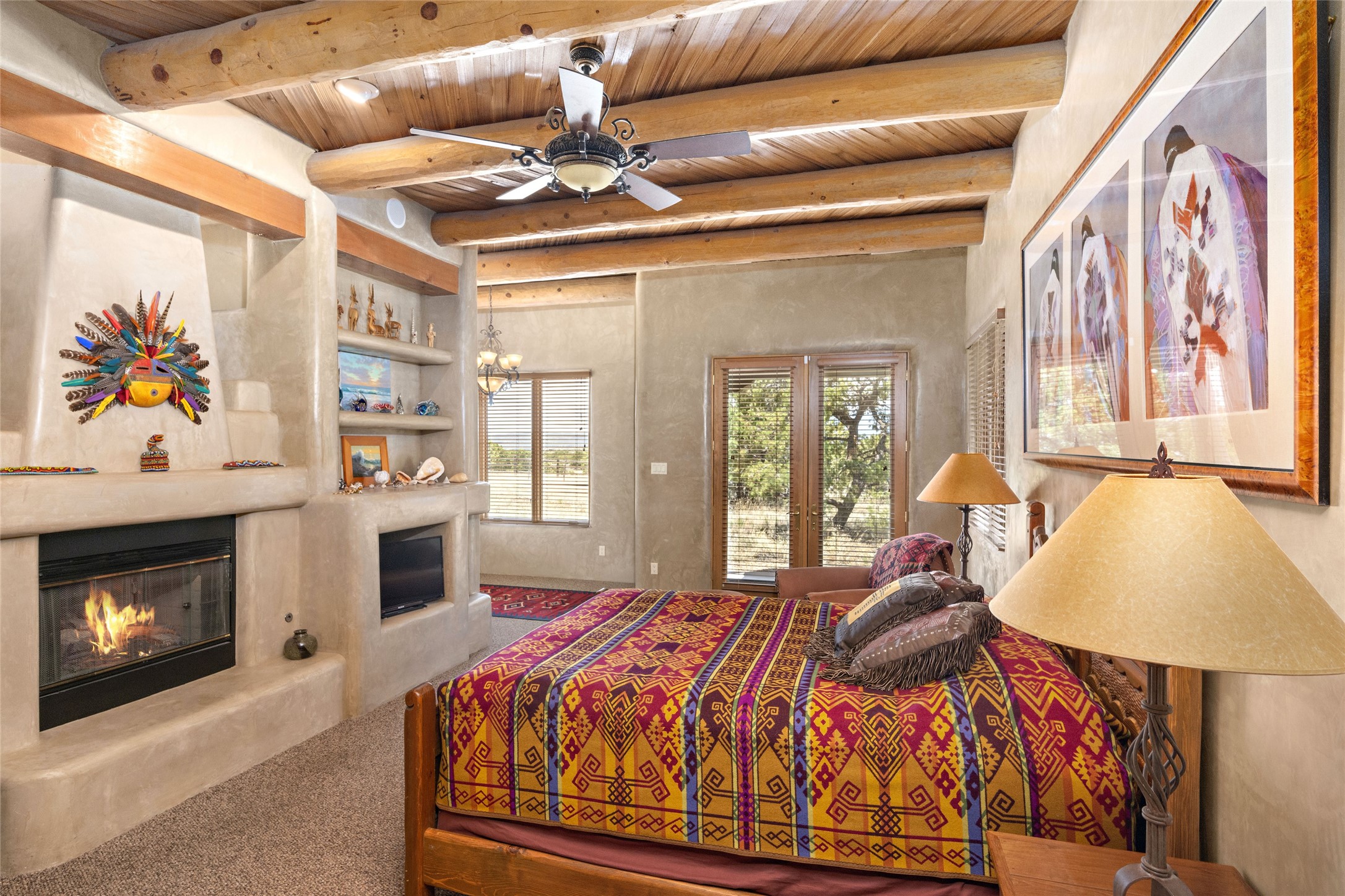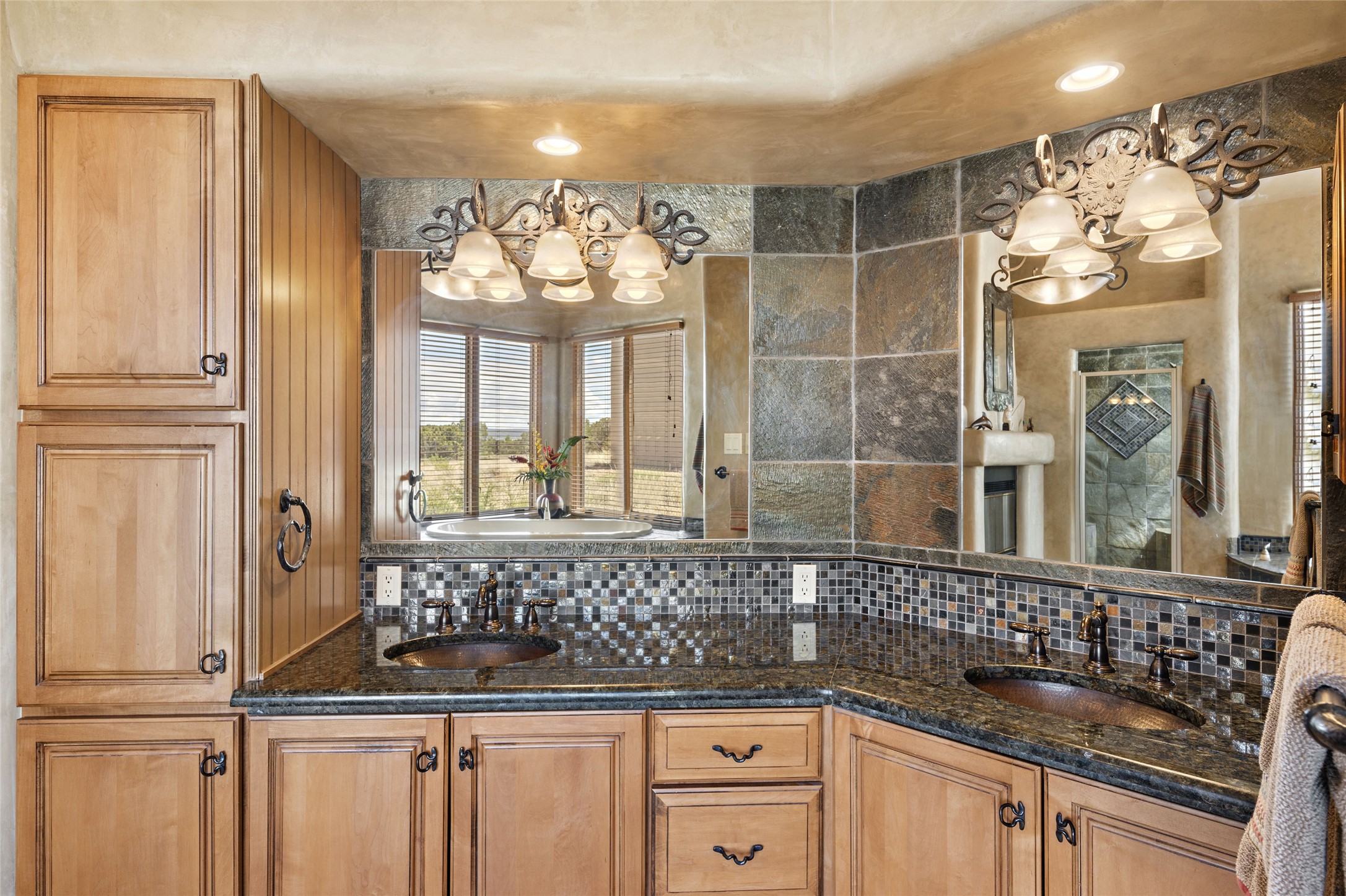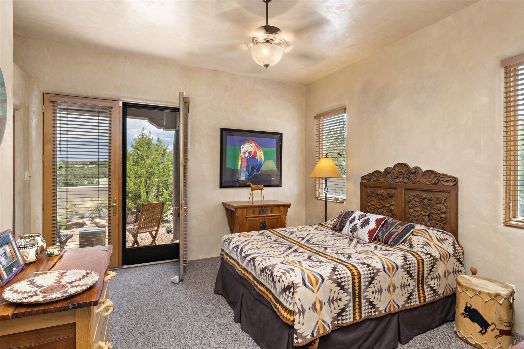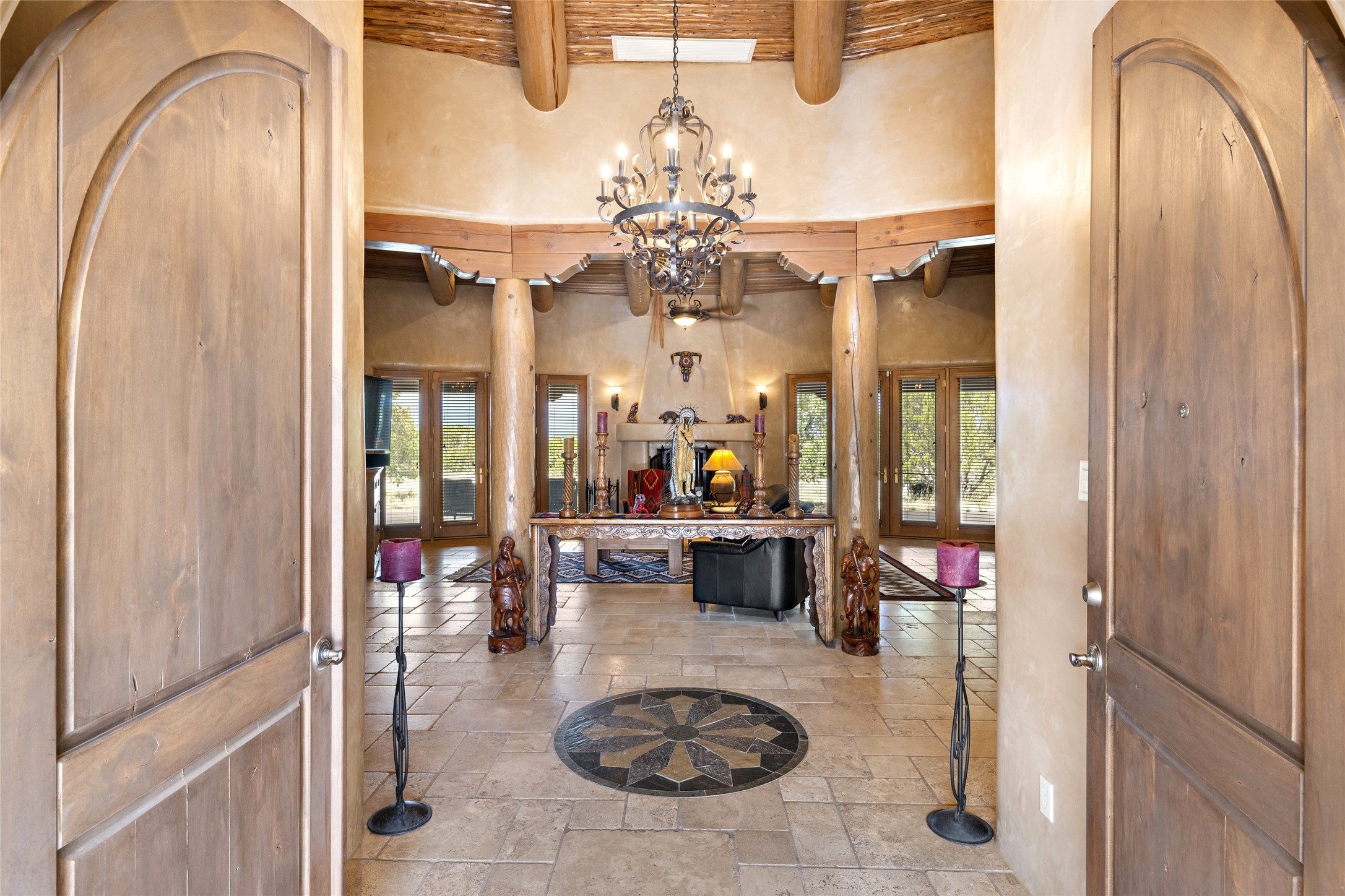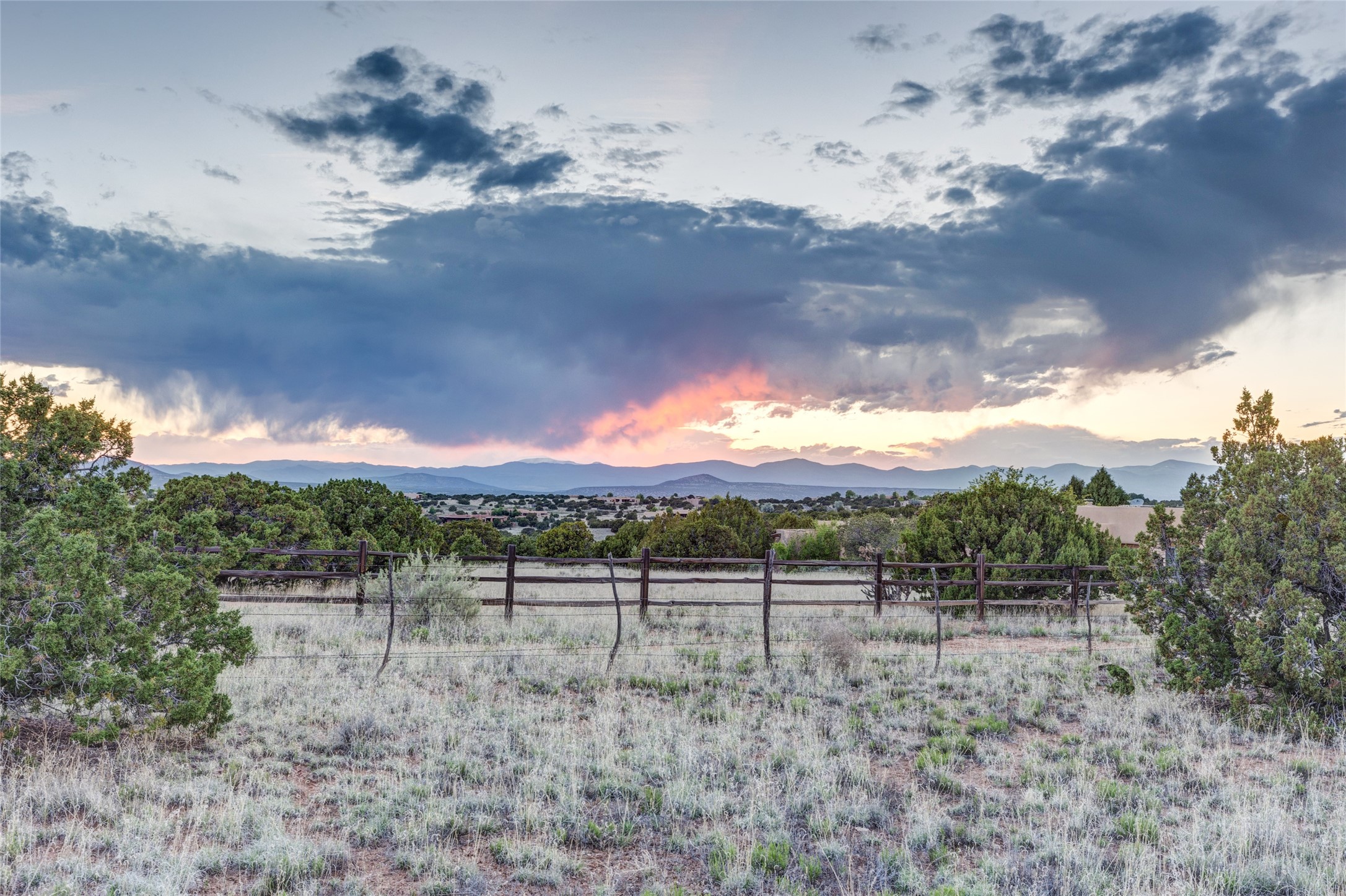 Located in Los Suenos, on a large 3-acre lot at the end of a private cul-de-sac, this single-level, 4-bedroom, 4-bath home is authentic Santa Fe Style, situated to offer 360-degree views of the surrounding mountain ranges so you may enjoy both a stunning sunrise and sunset. This well-designed home is pristinely maintained and offers elegance, privacy, separation of space, formal and informal living, and an abundance of outdoor entertaining options. Enter through the gorgeous bell tower arch and authentic Mexican wooden gates into an elegant, low-maintenance southwestern rock garden. Arched 8-foot tall front doors of knotty alder open into an elevated 13 foot foyer with split-cedar ceilings, aged vigas, hand-troweled buckskin plaster, tumbled travertine floors, and four fireplaces throughout. The kitchen is timelessly designed with opulent Brazilian granite and custom maple cabinetry with a copper farm sink, wine cooler, and a large walk-in pantry, providing plenty of storage for the perfect Chef's kitchen. The spa-like primary suite is handsomely appointed with a kiva-styled, double-sided fireplace, soaking, jetted tub, considerable shower, double sinks, a large walk-in closet, and a small sitting or office area. You can open up the multipurpose northern wing for large gatherings or close it with pocket doors for guest quarters or media space. It is well equipped with a wet-bar, mini refrigerator, full bathroom, kiva fireplace, and direct access to the dining portal. All four bedrooms present outdoor access, full en-suite baths, and California closets. A 3-car garage offers extensive storage, and the owner added a 1,050 sq. ft. studio in 2016. The studio provides heating and cooling, tall ceilings, and a 9-foot garage door. Perfect for any artist or hobbyist, or can be converted into a guest home/studio. Impressive in every detail; see for yourself.