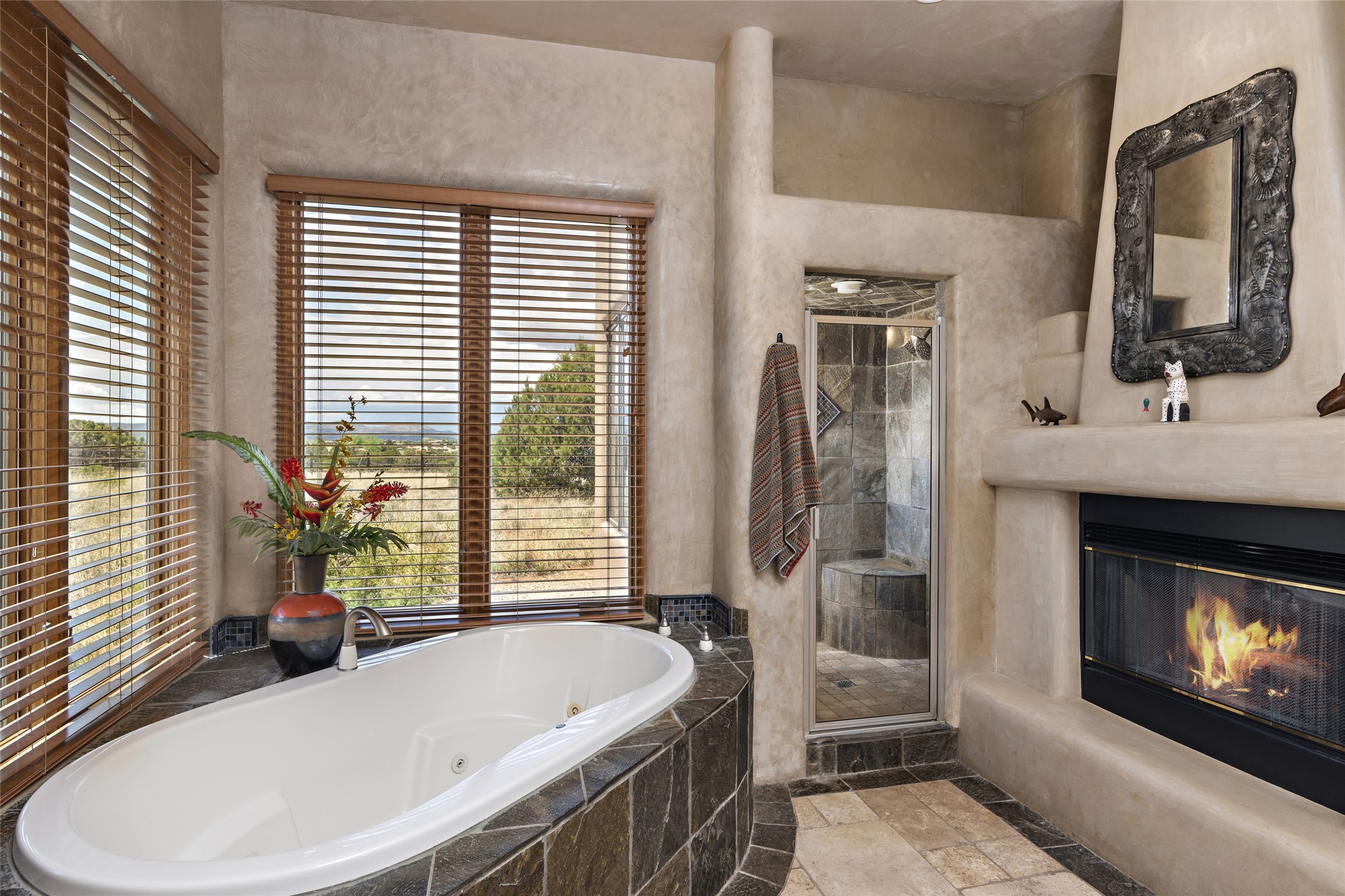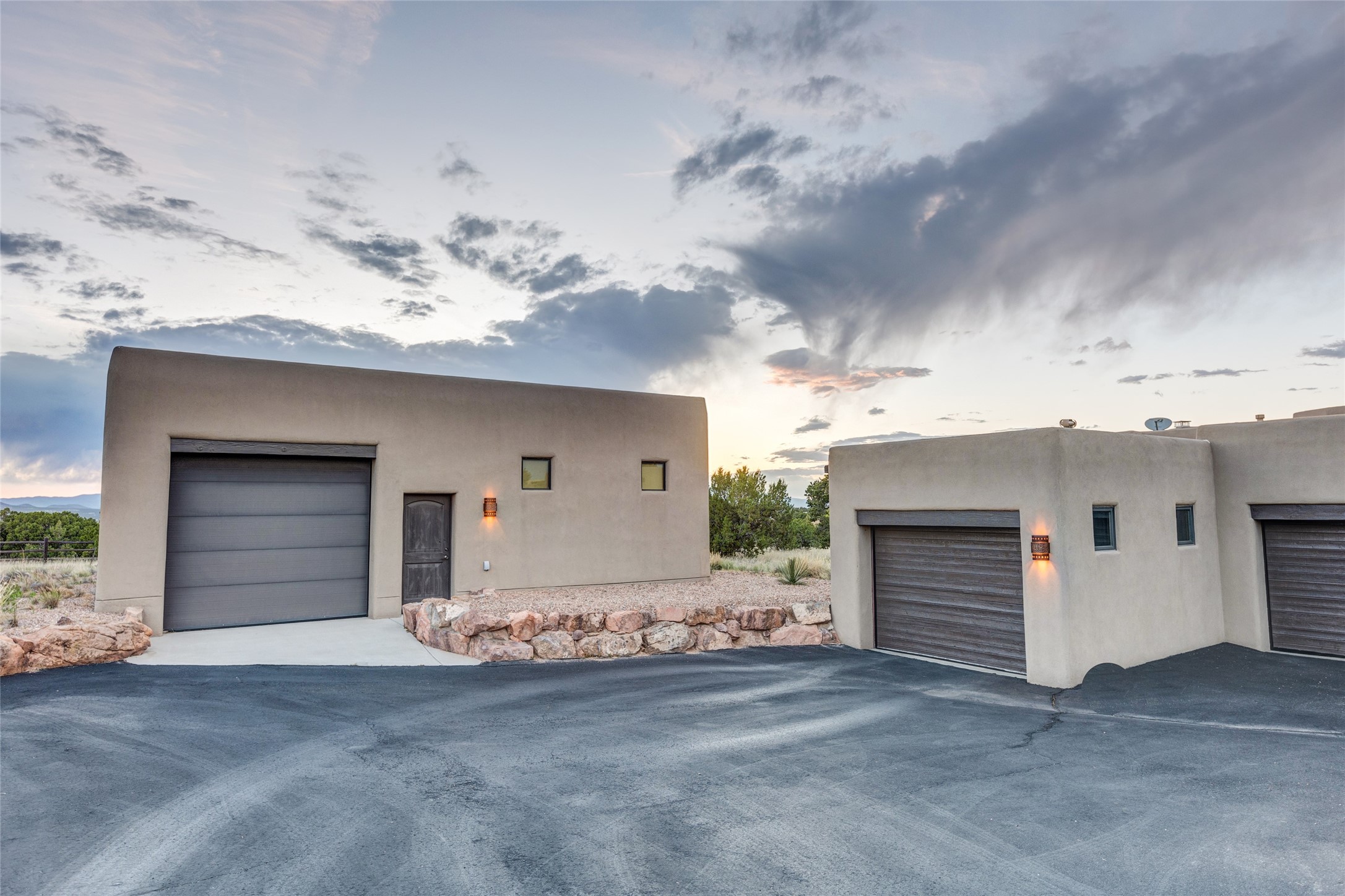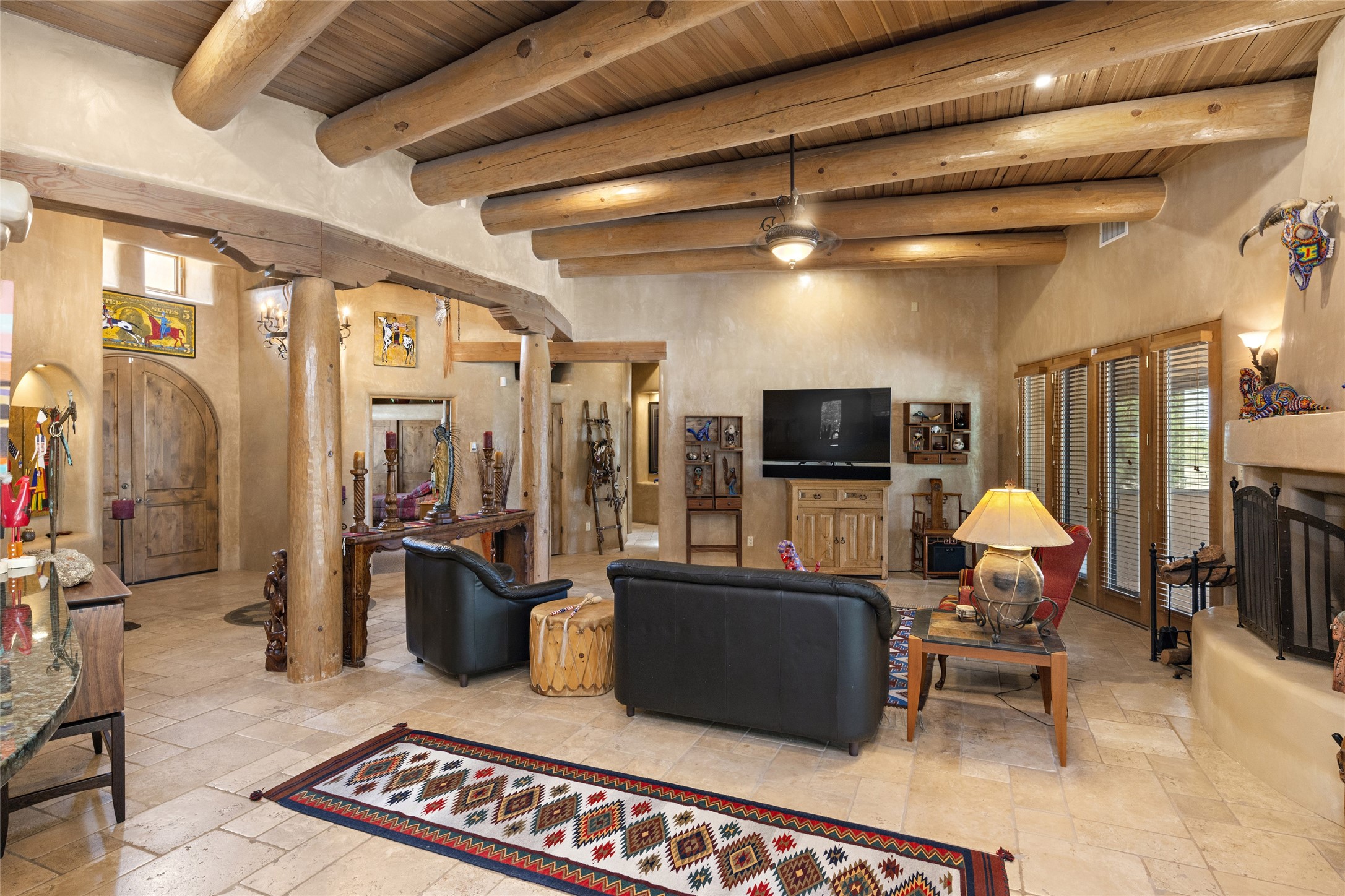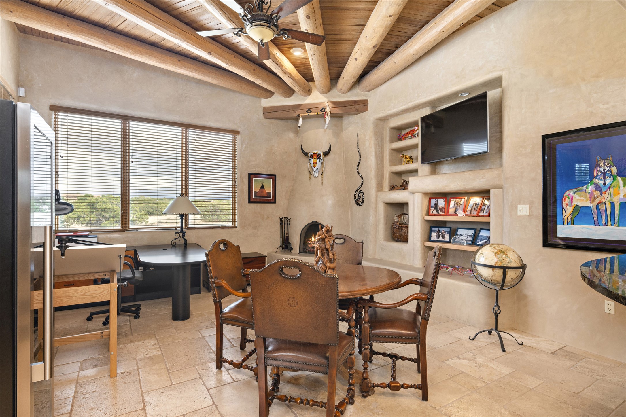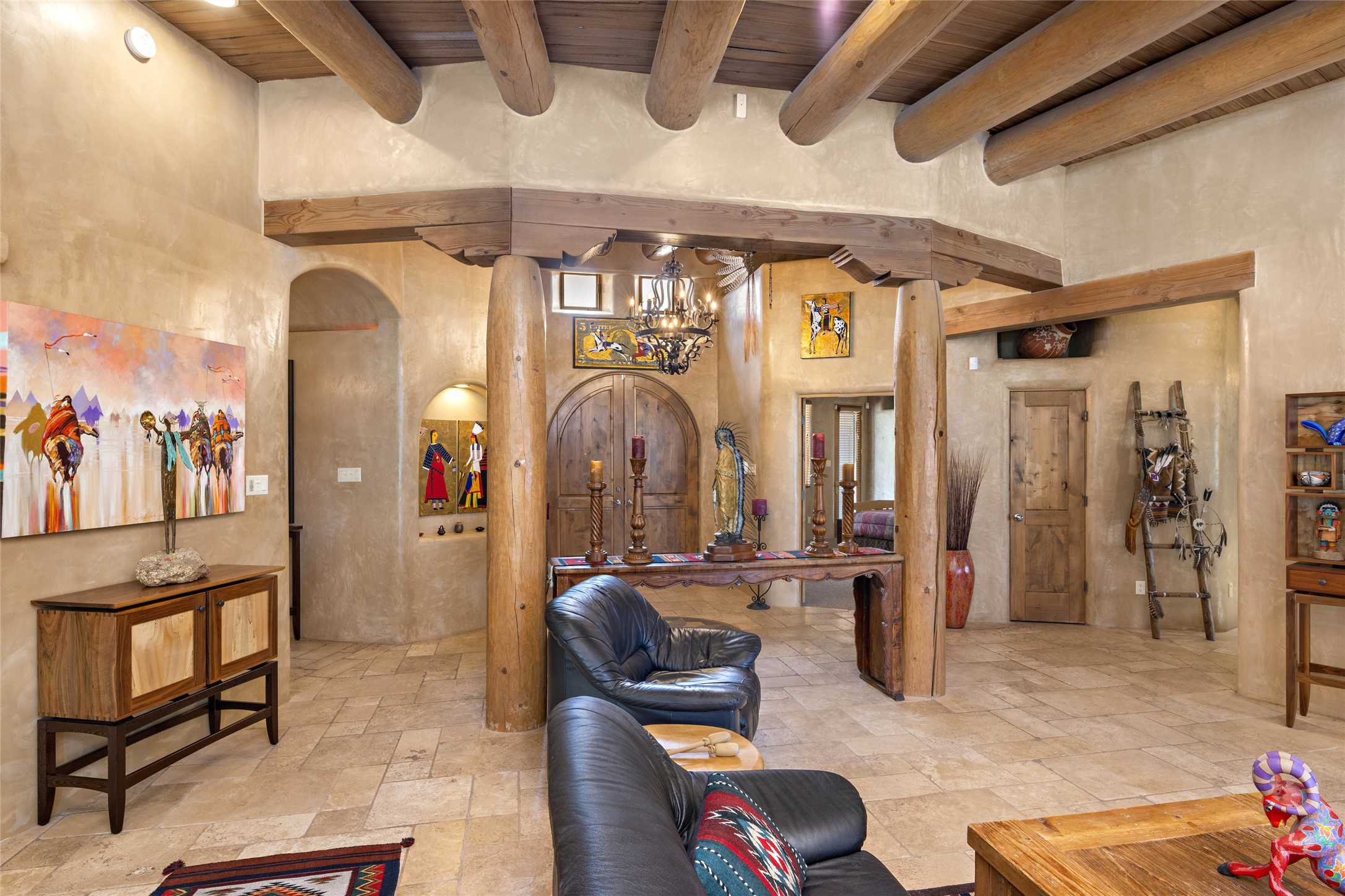 Located in Los Suenos, on a large 3-acre lot at the end of a private cul-de-sac, this single-level, 4-bedroom, 4-bath home is authentic Santa Fe Style, situated to offer 360-degree views of the surrounding mountain ranges so you may enjoy both a stunning sunrise and sunset. This well-designed home is pristinely maintained and offers elegance, privacy, separation of space, formal and informal living, and an abundance of outdoor entertaining options. Enter through the gorgeous bell tower arch and authentic Mexican wooden gates into an elegant, low-maintenance southwestern rock garden. Arched 8-foot tall front doors of knotty alder open into an elevated 13 foot foyer with split-cedar ceilings, aged vigas, hand-troweled buckskin plaster, tumbled travertine floors, and four fireplaces throughout. The kitchen is timelessly designed with opulent Brazilian granite and custom maple cabinetry with a copper farm sink, wine cooler, and a large walk-in pantry, providing plenty of storage for the perfect Chef's kitchen. The spa-like primary suite is handsomely appointed with a kiva-styled, double-sided fireplace, soaking, jetted tub, considerable shower, double sinks, a large walk-in closet, and a small sitting or office area. You can open up the multipurpose northern wing for large gatherings or close it with pocket doors for guest quarters or media space. It is well equipped with a wet-bar, mini refrigerator, full bathroom, kiva fireplace, and direct access to the dining portal. All four bedrooms present outdoor access, full en-suite baths, and California closets. A 3-car garage offers extensive storage, and the owner added a 1,050 sq. ft. studio in 2016. The studio provides heating and cooling, tall ceilings, and a 9-foot garage door. Perfect for any artist or hobbyist, or can be converted into a guest home/studio. Impressive in every detail; see for yourself.