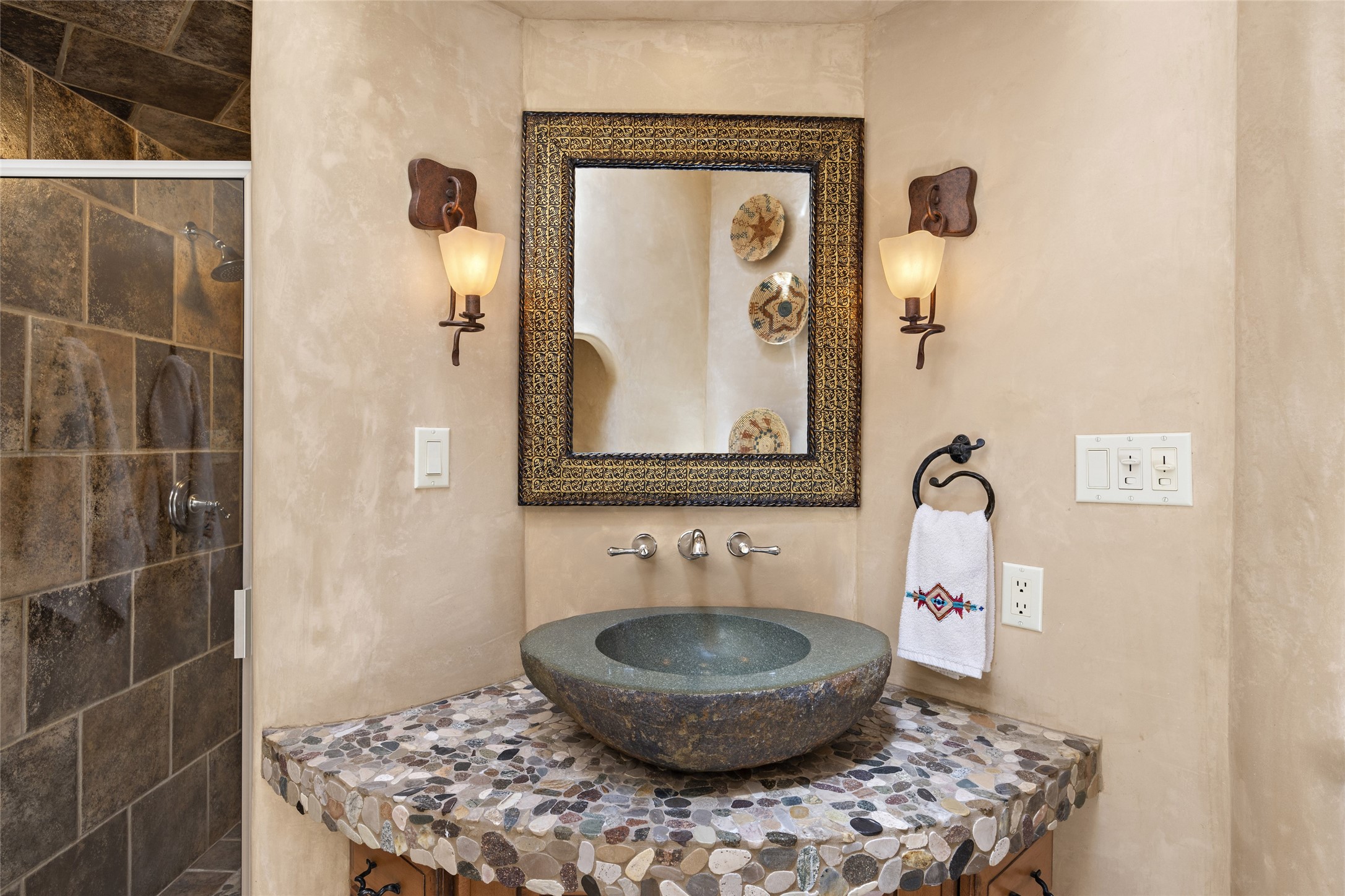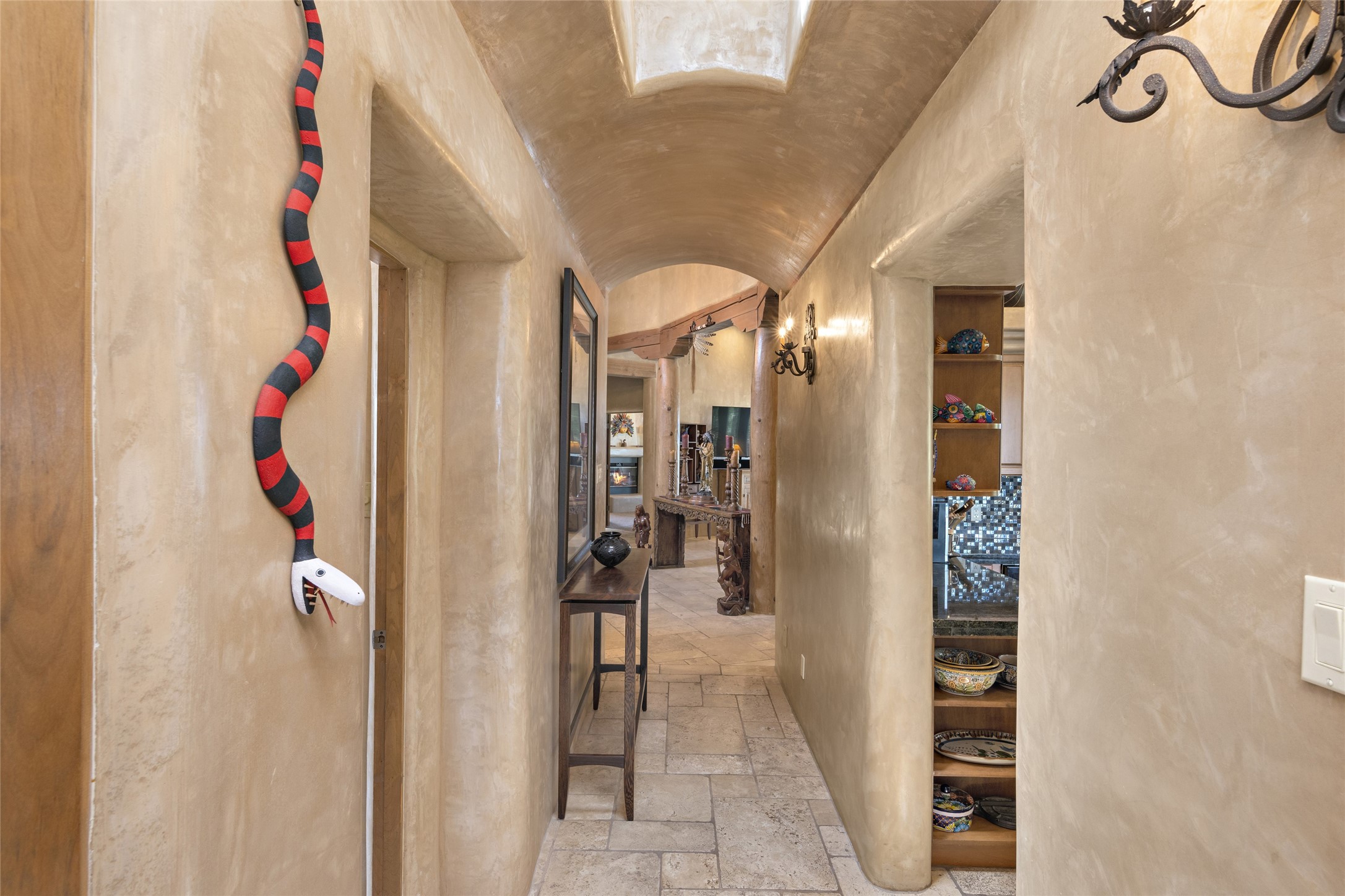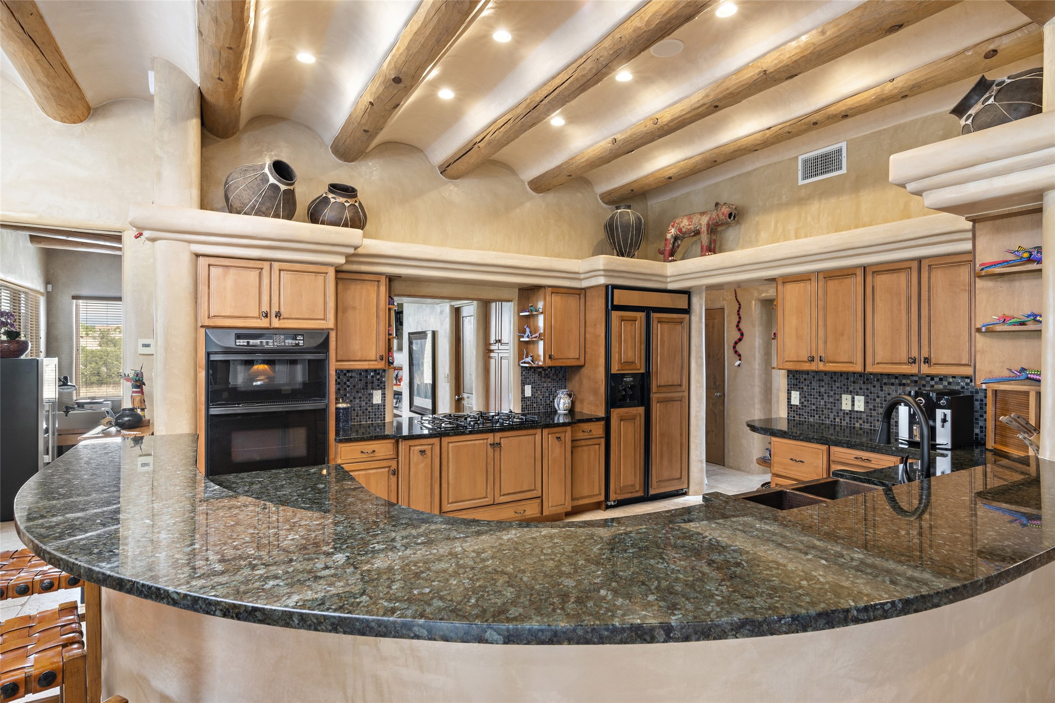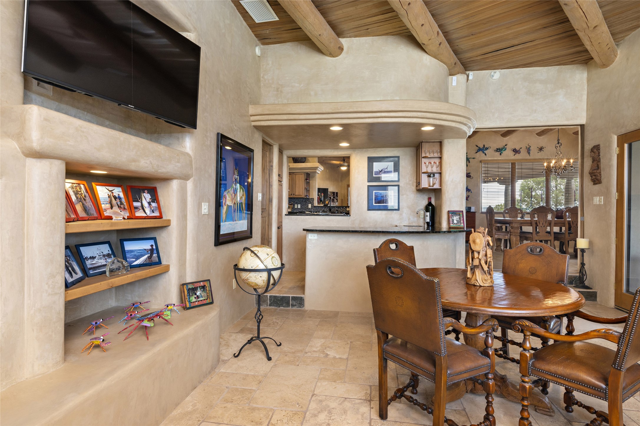 Located in Los Suenos, on a large 3-acre lot at the end of a private cul-de-sac, this single-level, 4-bedroom, 4-bath home is authentic Santa Fe Style, situated to offer 360-degree views of the surrounding mountain ranges so you may enjoy both a stunning sunrise and sunset. This well-designed home is pristinely maintained and offers elegance, privacy, separation of space, formal and informal living, and an abundance of outdoor entertaining options. Enter through the gorgeous bell tower arch and authentic Mexican wooden gates into an elegant, low-maintenance southwestern rock garden. Arched 8-foot tall front doors of knotty alder open into an elevated 13 foot foyer with split-cedar ceilings, aged vigas, hand-troweled buckskin plaster, tumbled travertine floors, and four fireplaces throughout. The kitchen is timelessly designed with opulent Brazilian granite and custom maple cabinetry with a copper farm sink, wine cooler, and a large walk-in pantry, providing plenty of storage for the perfect Chef's kitchen. The spa-like primary suite is handsomely appointed with a kiva-styled, double-sided fireplace, soaking, jetted tub, considerable shower, double sinks, a large walk-in closet, and a small sitting or office area. You can open up the multipurpose northern wing for large gatherings or close it with pocket doors for guest quarters or media space. It is well equipped with a wet-bar, mini refrigerator, full bathroom, kiva fireplace, and direct access to the dining portal. All four bedrooms present outdoor access, full en-suite baths, and California closets. A 3-car garage offers extensive storage, and the owner added a 1,050 sq. ft. studio in 2016. The studio provides heating and cooling, tall ceilings, and a 9-foot garage door. Perfect for any artist or hobbyist, or can be converted into a guest home/studio. Impressive in every detail; see for yourself.