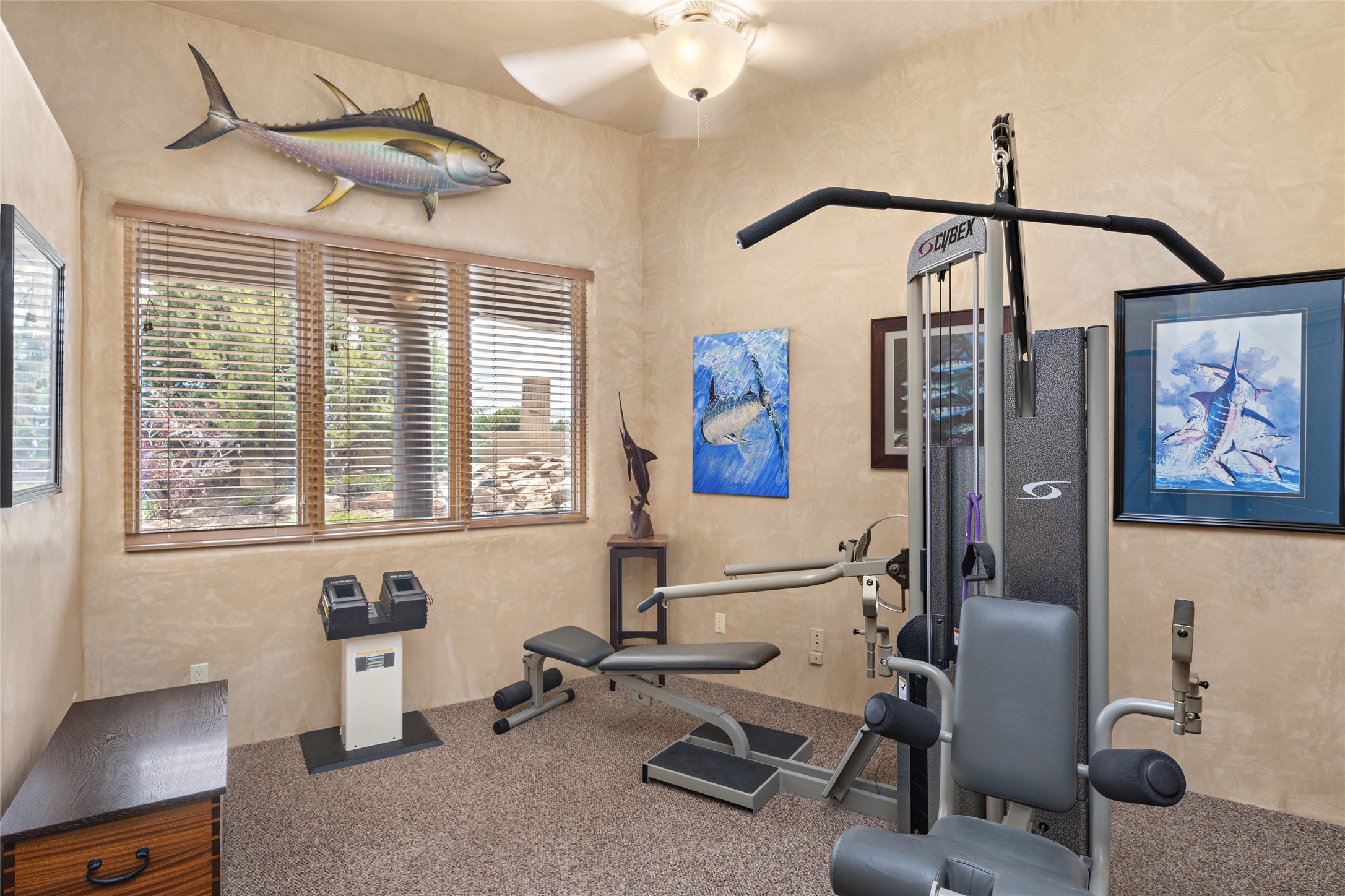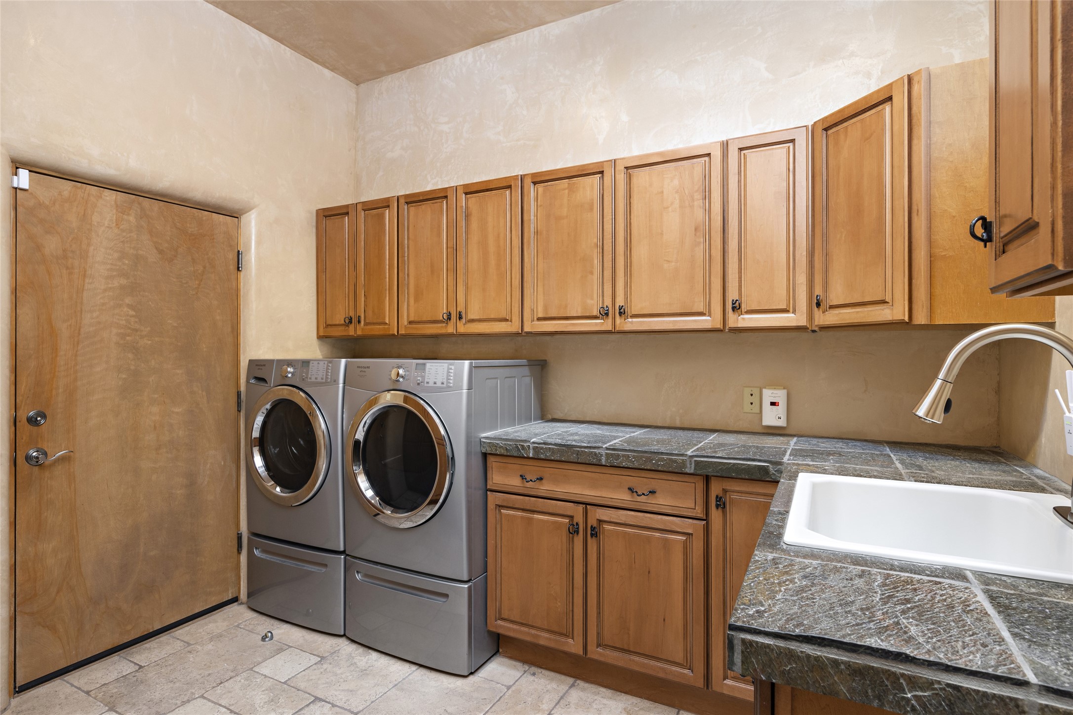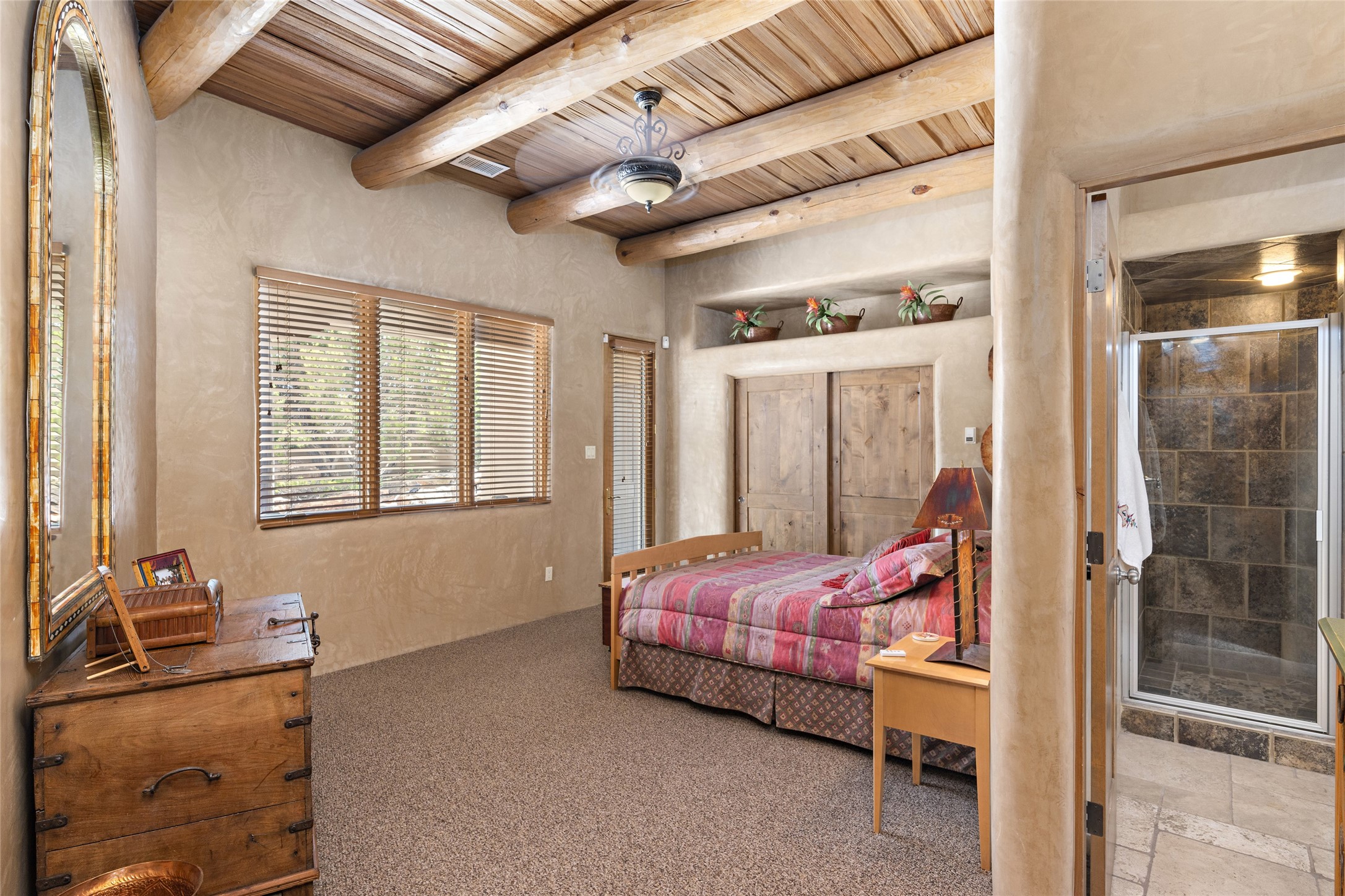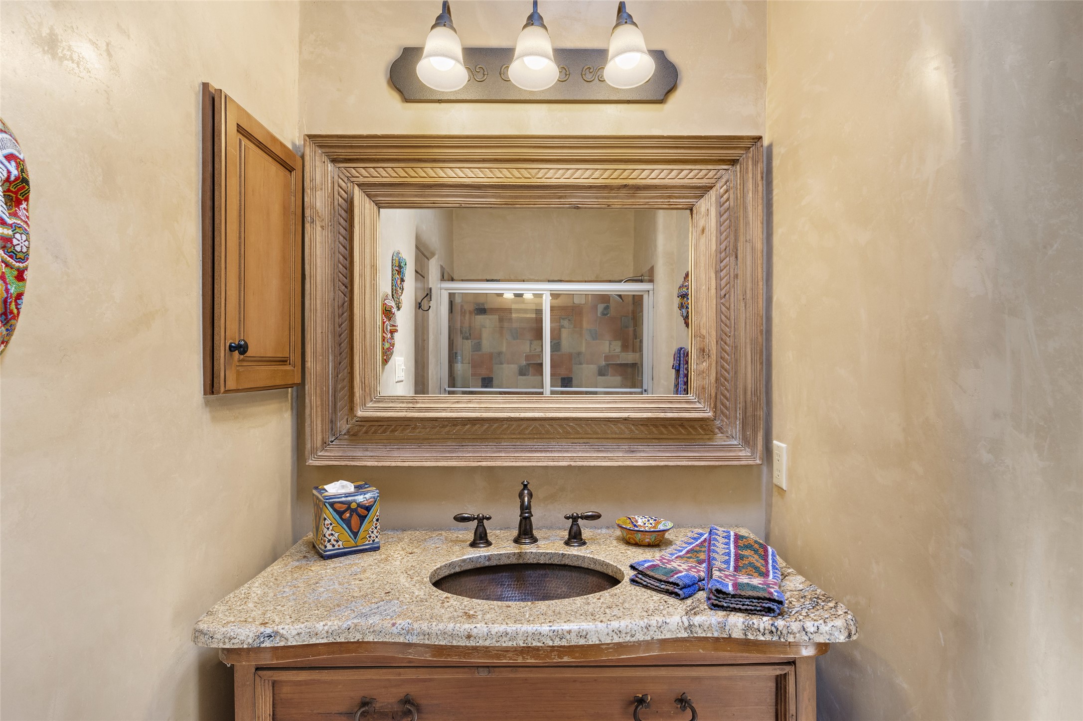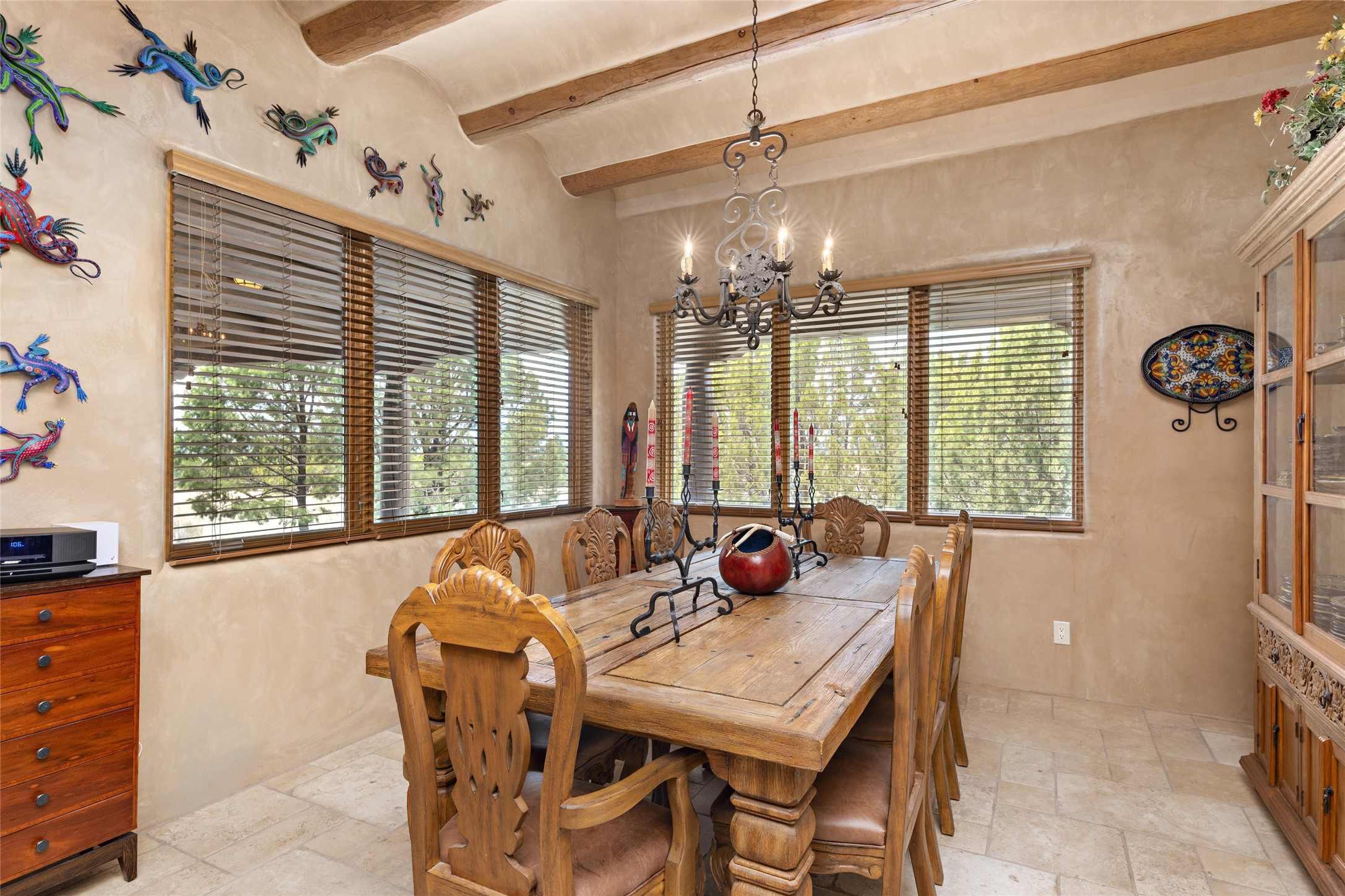 Located in Los Suenos, on a large 3-acre lot at the end of a private cul-de-sac, this single-level, 4-bedroom, 4-bath home is authentic Santa Fe Style, situated to offer 360-degree views of the surrounding mountain ranges so you may enjoy both a stunning sunrise and sunset. This well-designed home is pristinely maintained and offers elegance, privacy, separation of space, formal and informal living, and an abundance of outdoor entertaining options. Enter through the gorgeous bell tower arch and authentic Mexican wooden gates into an elegant, low-maintenance southwestern rock garden. Arched 8-foot tall front doors of knotty alder open into an elevated 13 foot foyer with split-cedar ceilings, aged vigas, hand-troweled buckskin plaster, tumbled travertine floors, and four fireplaces throughout. The kitchen is timelessly designed with opulent Brazilian granite and custom maple cabinetry with a copper farm sink, wine cooler, and a large walk-in pantry, providing plenty of storage for the perfect Chef's kitchen. The spa-like primary suite is handsomely appointed with a kiva-styled, double-sided fireplace, soaking, jetted tub, considerable shower, double sinks, a large walk-in closet, and a small sitting or office area. You can open up the multipurpose northern wing for large gatherings or close it with pocket doors for guest quarters or media space. It is well equipped with a wet-bar, mini refrigerator, full bathroom, kiva fireplace, and direct access to the dining portal. All four bedrooms present outdoor access, full en-suite baths, and California closets. A 3-car garage offers extensive storage, and the owner added a 1,050 sq. ft. studio in 2016. The studio provides heating and cooling, tall ceilings, and a 9-foot garage door. Perfect for any artist or hobbyist, or can be converted into a guest home/studio. Impressive in every detail; see for yourself.