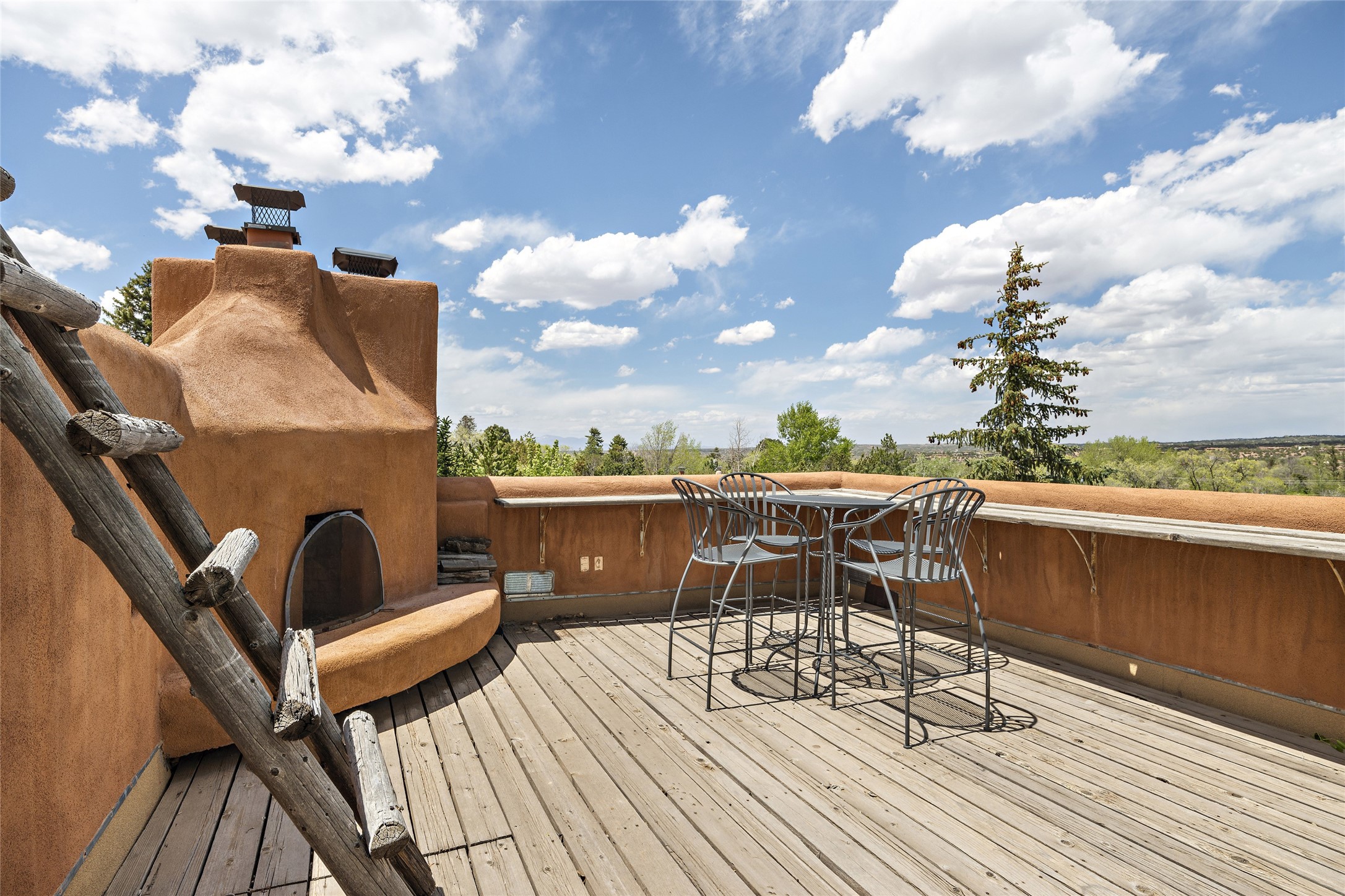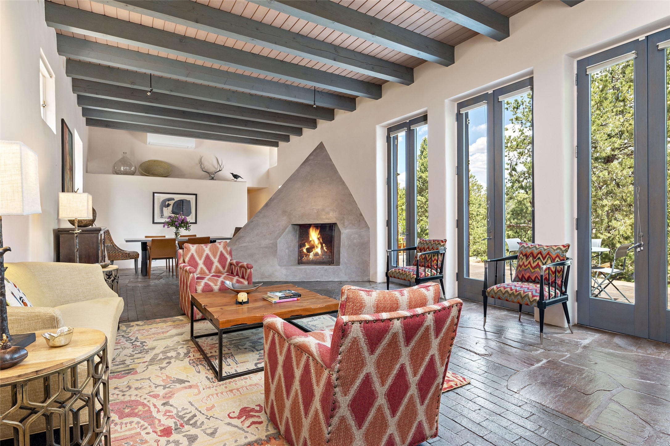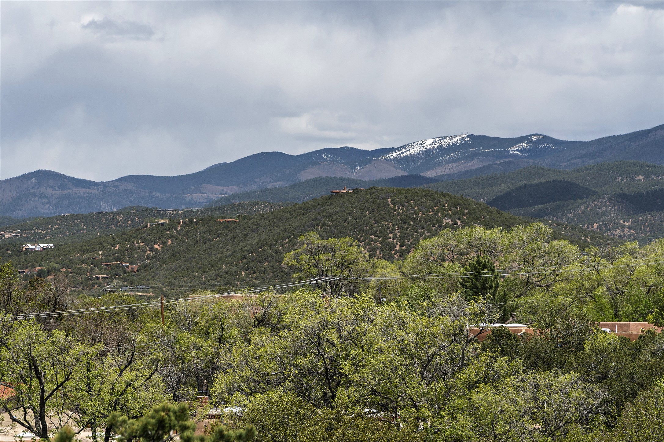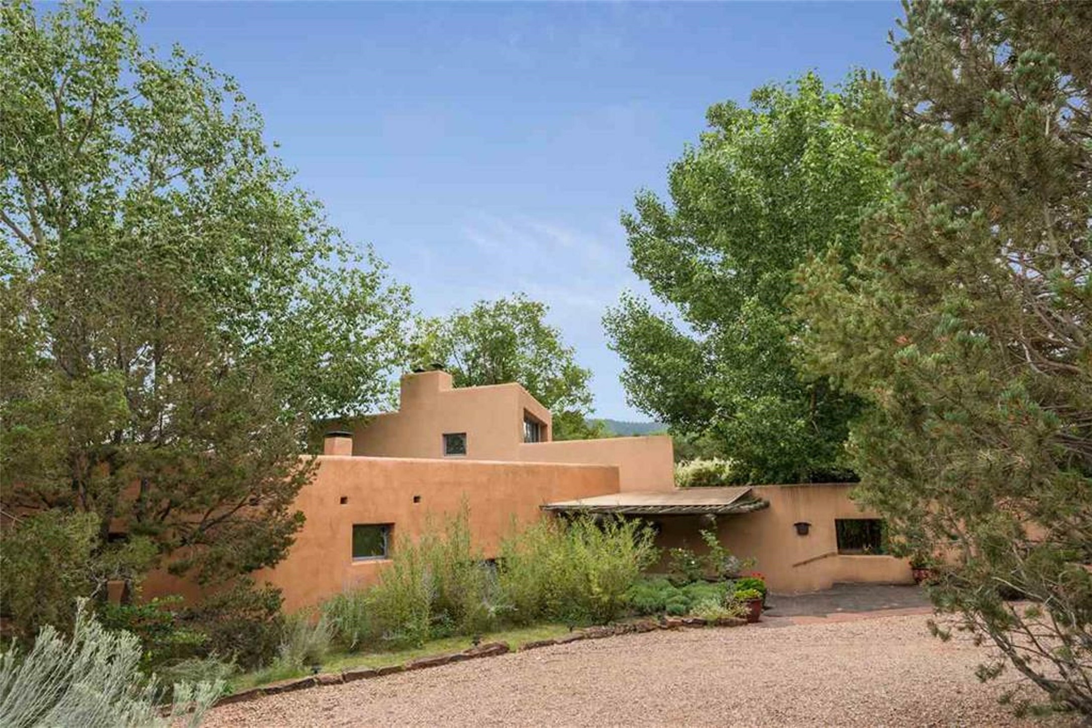This distinctive adobe home on a prestigious Eastside camino was designed by Texas-based Lake Flato Architects, a firm known for creations rooted in their place and constructed by the finest local craftspeople using regional materials. The intelligent design and unique 3,136-square-foot floor plan came to fruition in 1990, resulting in an award-winning residence filled with light and touches of authentic Southwestern character. It offers three restful bedrooms--two with fireplaces--three baths--including a spa-like space with a soaking tub and shower in the owner's suite--a delightful living room with a striking sculptural fireplace and glass doors leading to inviting outdoor spaces, an adjoining formal dining area, a comfortable den with a variety of built-ins and a banco, a charming kitchen and atrium-like breakfast area, and a one-car garage--an enviable amenity in this historic locale. The wooded 0.69-acre site is a peaceful, private setting with flagstone patios, mature trees, a pond, and views of Santa Fe's mountains through the enveloping pions and junipers. A rooftop deck with a warming kiva fireplace enjoys a full sweeping panorama of treetops, neighboring rooflines, sunsets, and the majestic Sangre de Cristos.