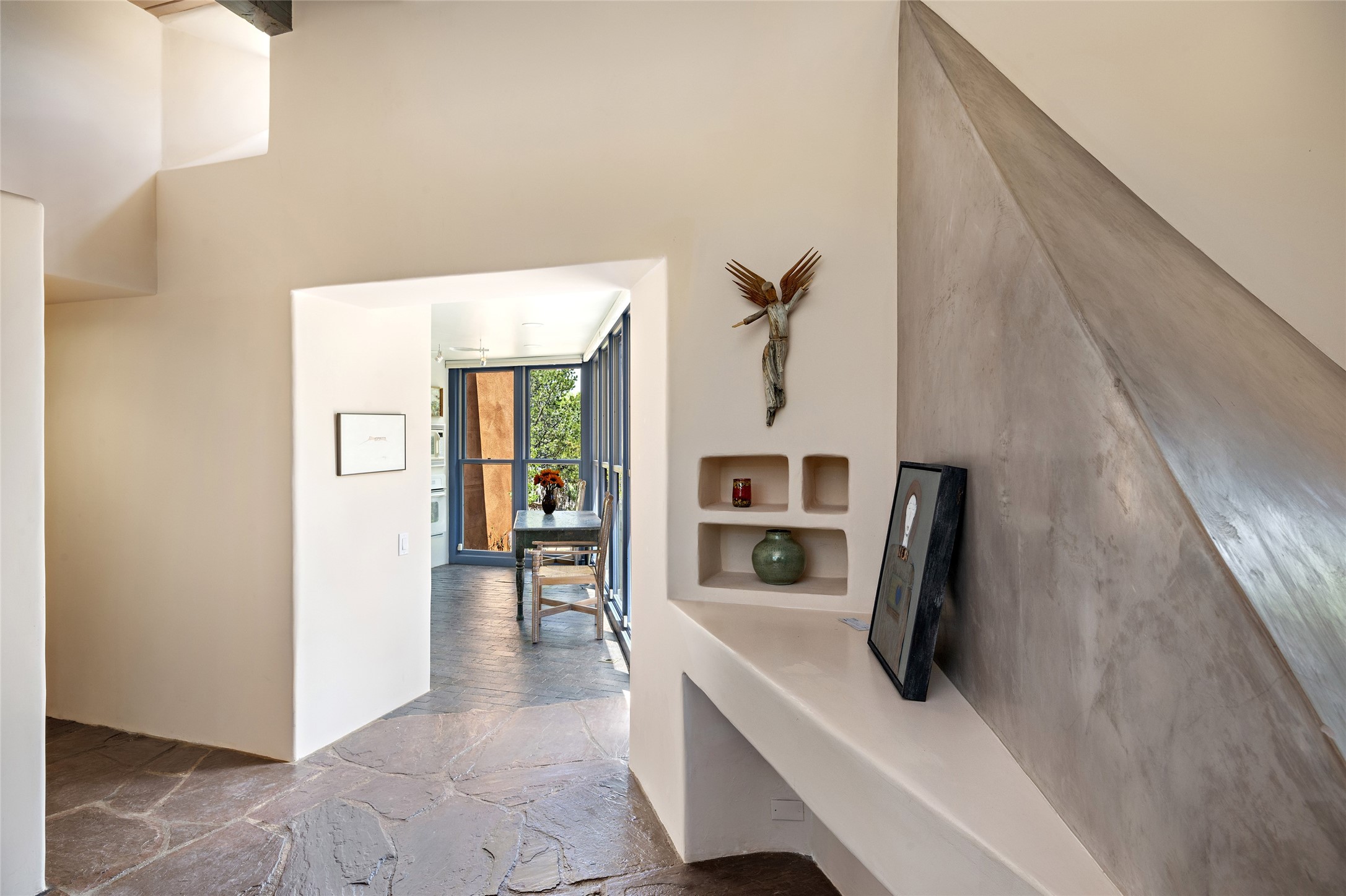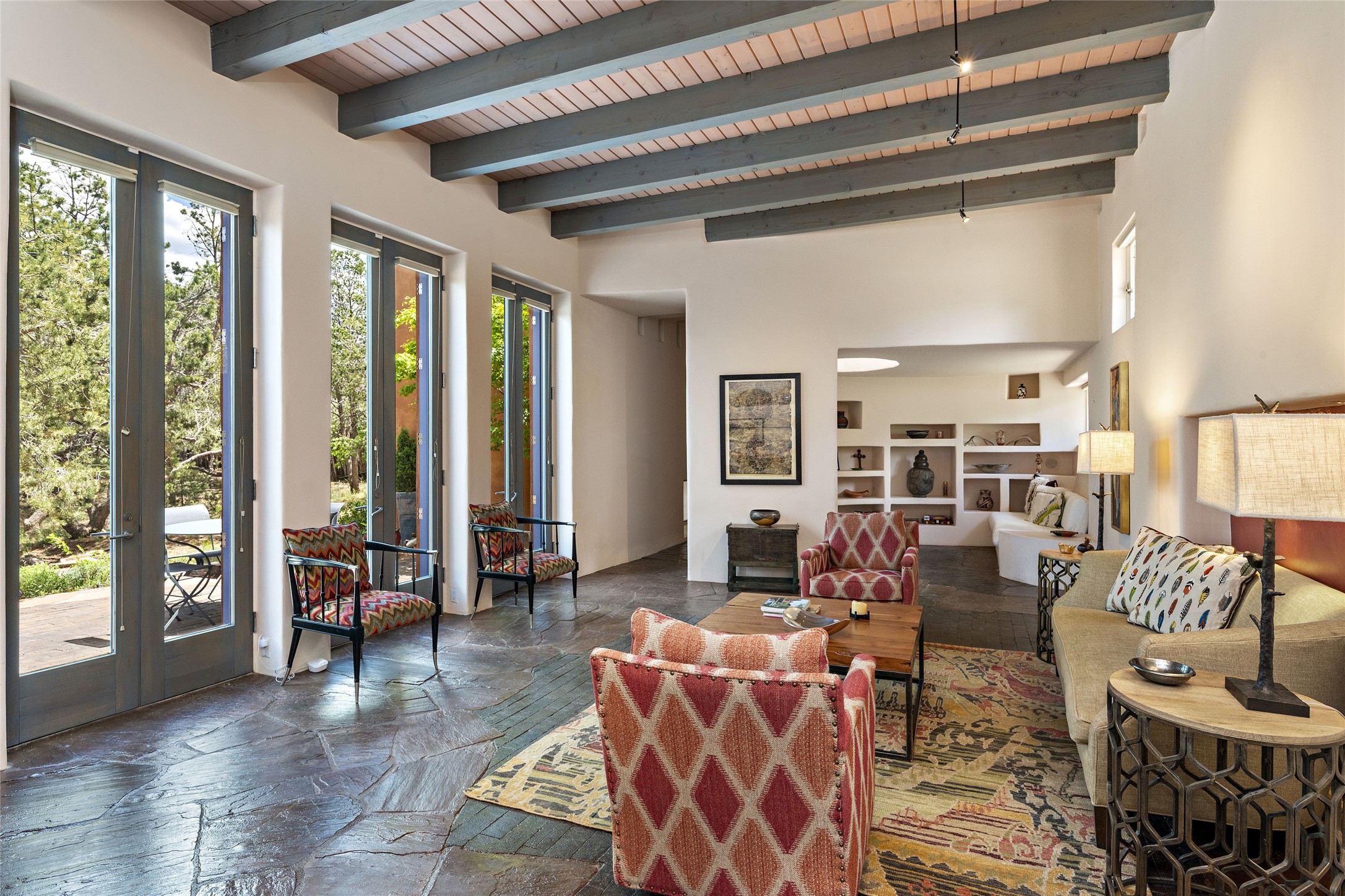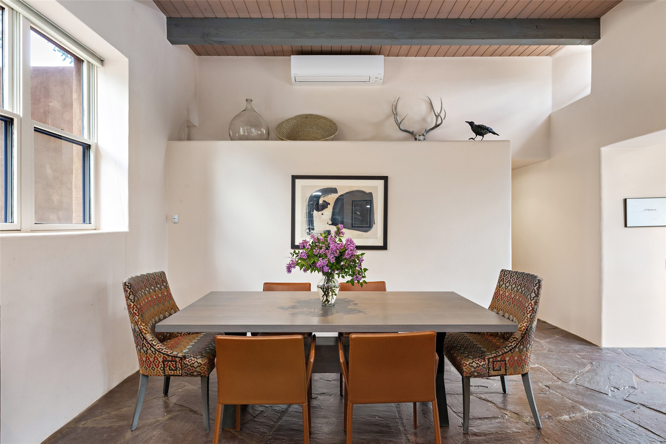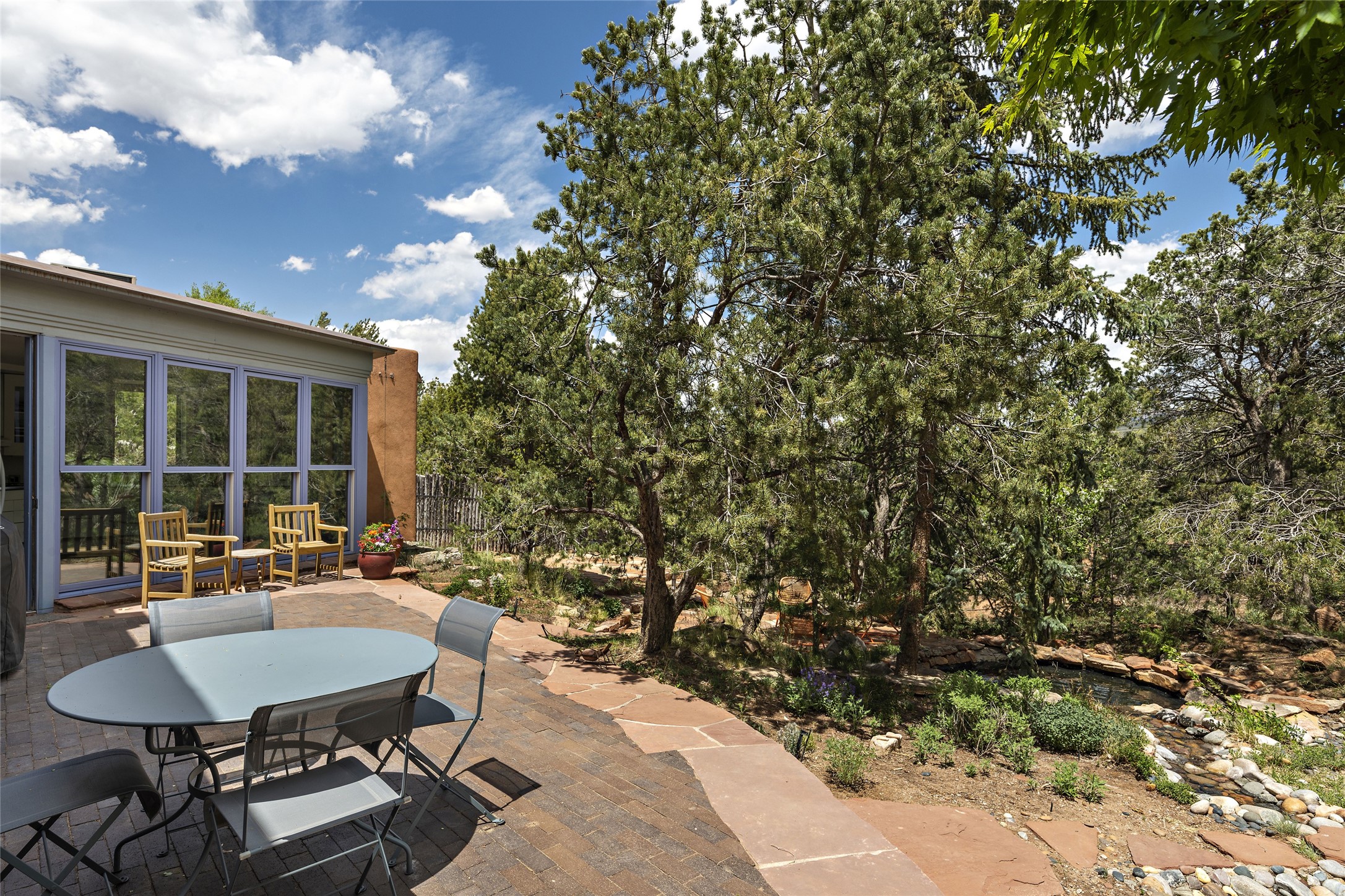 This distinctive adobe home on a prestigious Eastside camino was designed by Texas-based Lake Flato Architects, a firm known for creations rooted in their place and constructed by the finest local craftspeople using regional materials. The intelligent design and unique 3,136-square-foot floor plan came to fruition in 1990, resulting in an award-winning residence filled with light and touches of authentic Southwestern character. It offers three restful bedrooms--two with fireplaces--three baths--including a spa-like space with a soaking tub and shower in the owner's suite--a delightful living room with a striking sculptural fireplace and glass doors leading to inviting outdoor spaces, an adjoining formal dining area, a comfortable den with a variety of built-ins and a banco, a charming kitchen and atrium-like breakfast area, and a one-car garage--an enviable amenity in this historic locale. The wooded 0.69-acre site is a peaceful, private setting with flagstone patios, mature trees, a pond, and views of Santa Fe's mountains through the enveloping pions and junipers. A rooftop deck with a warming kiva fireplace enjoys a full sweeping panorama of treetops, neighboring rooflines, sunsets, and the majestic Sangre de Cristos.