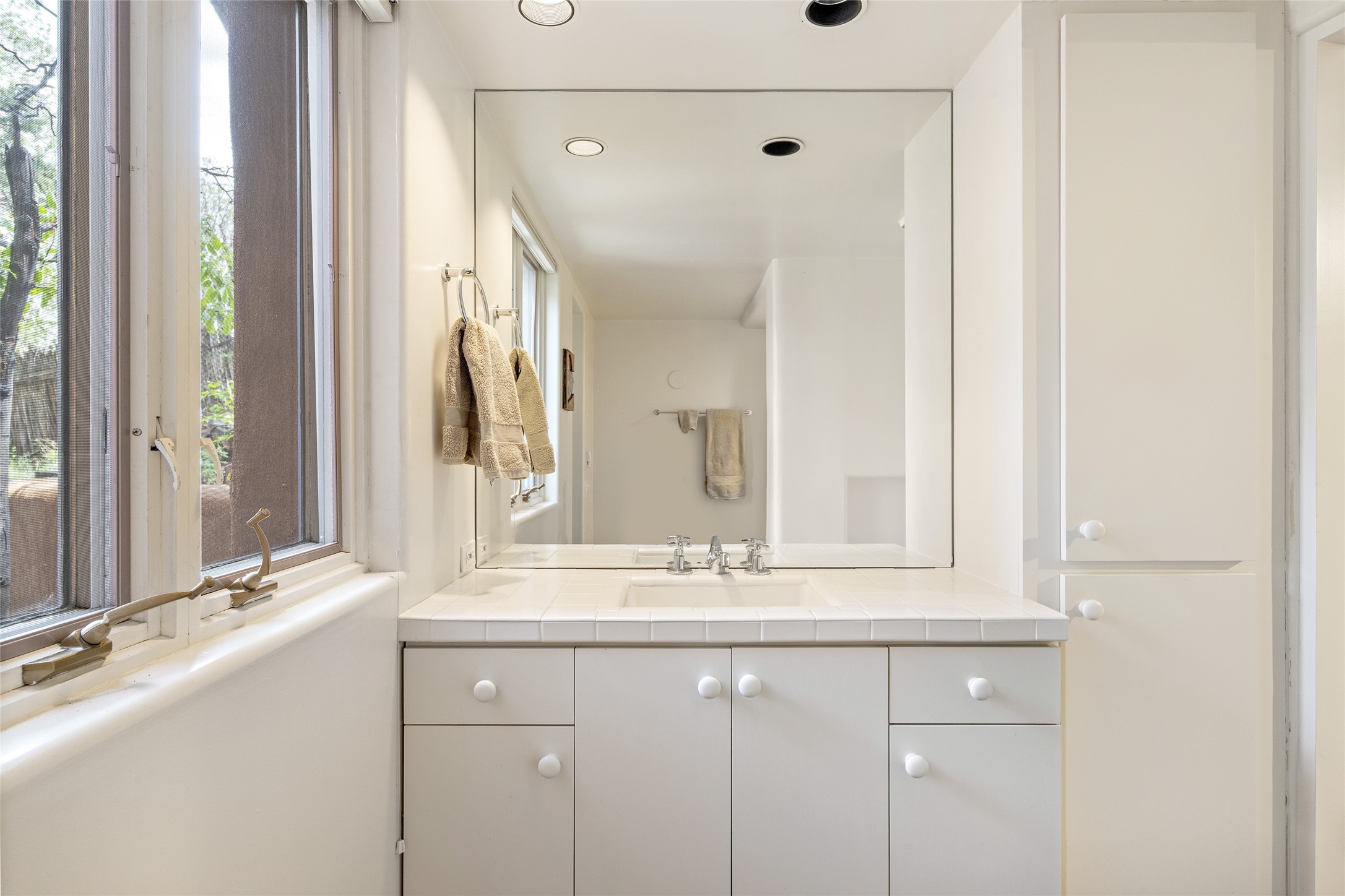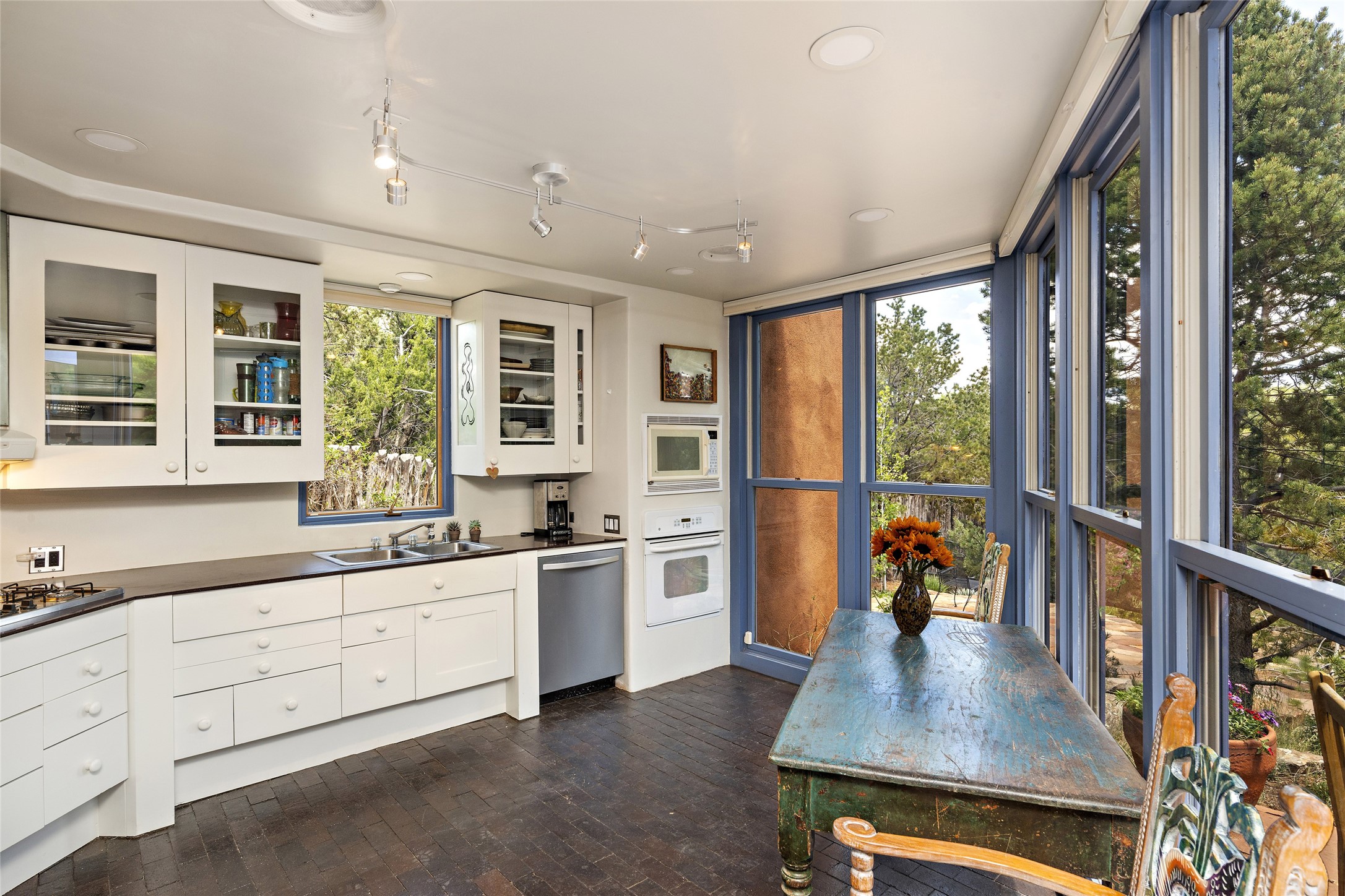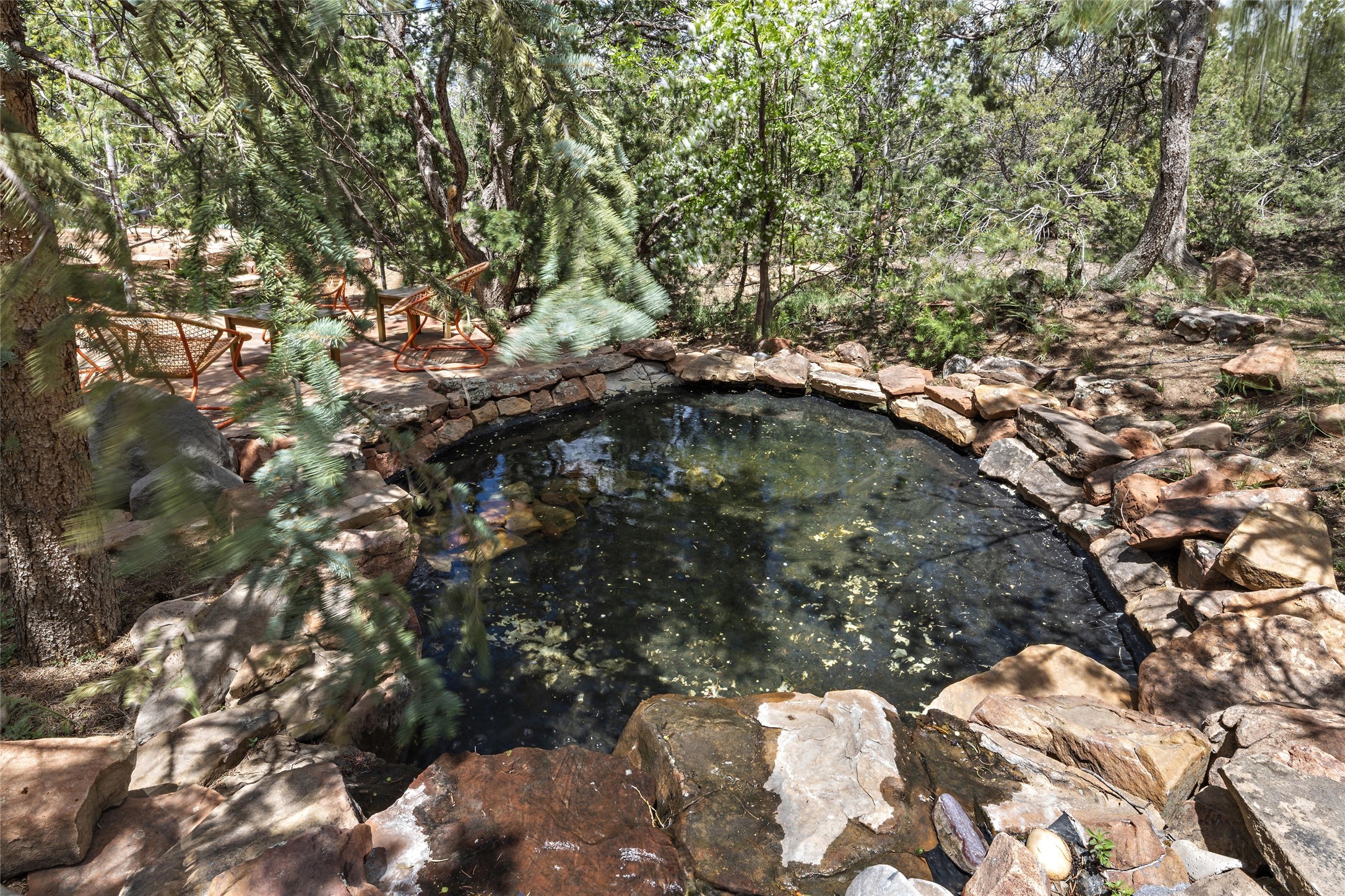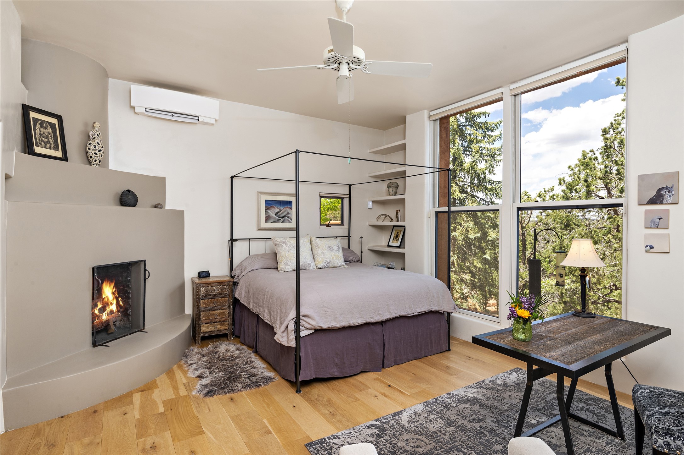This distinctive adobe home on a prestigious Eastside camino was designed by Texas-based Lake Flato Architects, a firm known for creations rooted in their place and constructed by the finest local craftspeople using regional materials. The intelligent design and unique 3,136-square-foot floor plan came to fruition in 1990, resulting in an award-winning residence filled with light and touches of authentic Southwestern character. It offers three restful bedrooms--two with fireplaces--three baths--including a spa-like space with a soaking tub and shower in the owner's suite--a delightful living room with a striking sculptural fireplace and glass doors leading to inviting outdoor spaces, an adjoining formal dining area, a comfortable den with a variety of built-ins and a banco, a charming kitchen and atrium-like breakfast area, and a one-car garage--an enviable amenity in this historic locale. The wooded 0.69-acre site is a peaceful, private setting with flagstone patios, mature trees, a pond, and views of Santa Fe's mountains through the enveloping pions and junipers. A rooftop deck with a warming kiva fireplace enjoys a full sweeping panorama of treetops, neighboring rooflines, sunsets, and the majestic Sangre de Cristos.