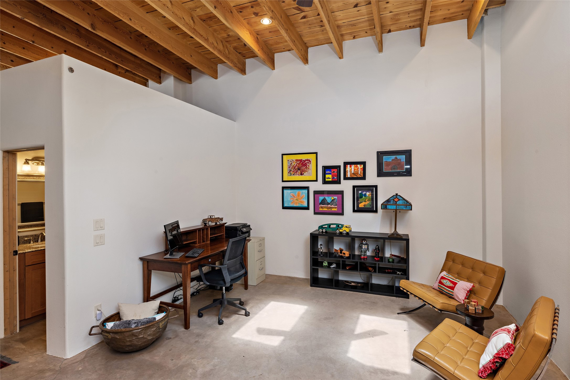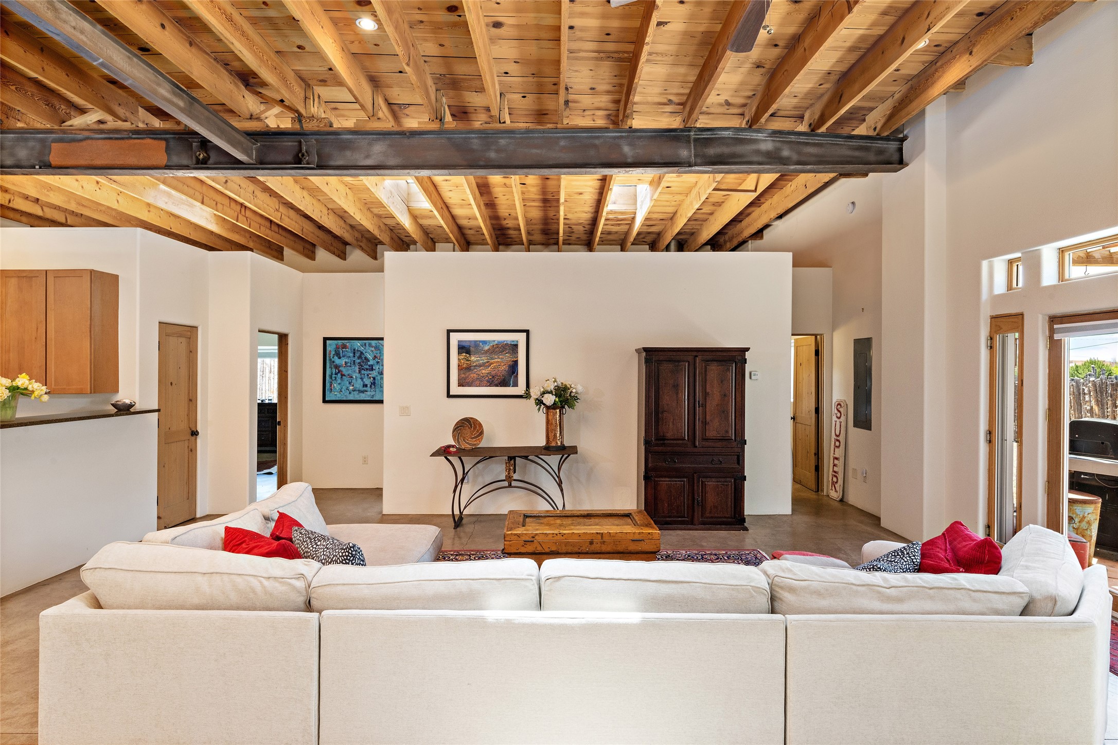 A hidden treasure on one third of an acre, in a private, in-town location. Tucked away at the end of Calle Princesa Juana, but not part of the Bellamah neighborhood, this unique property, highly suitable as a live/work combination, has plentiful light, flexible spaces and lofty ceilings. The open-plan living, dining and kitchen areas are spacious and there are two bedrooms and two bathrooms. The original structure was built in 1950 with beautiful metal trusses, wooden beams, decking and skylights. The interior was thoughtfully remodeled into its current configuration, which can easily be converted into two units. The house has in-floor radiant heat, and excellent insulation. There is a walled courtyard, outdoor portal and plenty of room for level vegetable gardens and fruit trees - on a shared well - seldom found within the City of Santa Fe. The property is accessed through a security gate, and there is the possibility to add additional structures (subject to City approval).