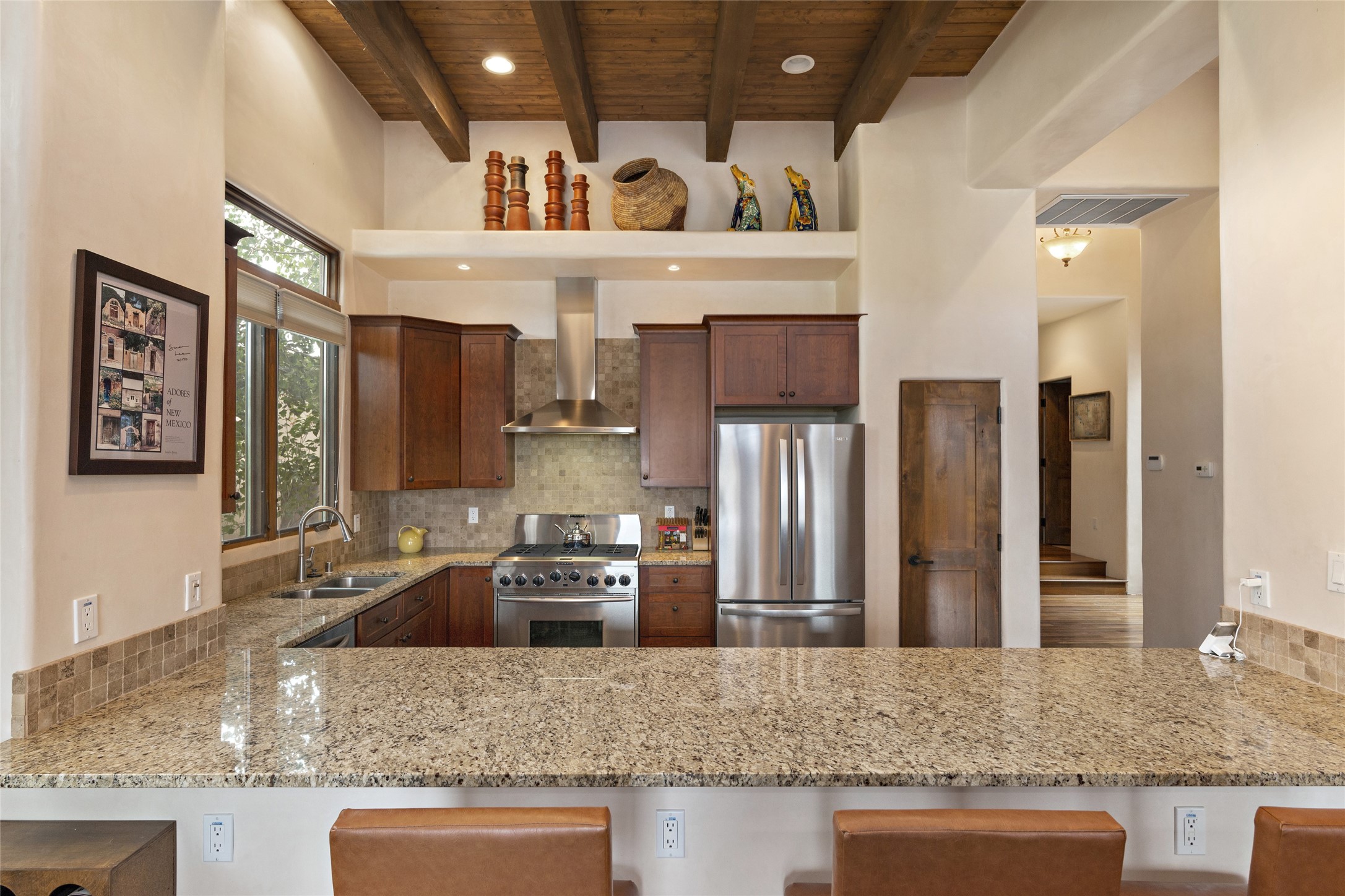Fabulous Golf Course, Jemez & Sangre de Cristo Mountain Views await you from this 3-Bed / 3-Bath home w/ a Private Detached Casita on an elevated corner lot in the Los Santeros area of Gated Las Campanas. Private entry gates lead to a courtyard w/ Sangre Mountain views, outdoor wood-burning fireplace & lots of space for entertaining friends & family. The Main house has 2 Beds & 2 Baths and the Detached Casita is a 1 Bed / 1 Bath private retreat for guests. The Great Room is an Open Concept layout w/ Golf Course & Jemez views, gas log fireplace in the Living Room and Kitchen with : KitchenAid 36" Professional Gas Range/self-cleaning Oven, Microwave & Dishwasher, and a new (2023) Whirlpool French Door Refrigerator plus a large bar for casual meals. The Back Portal enjoys the same great views and has a built-in gas BBQ, wood-burning fireplace and space for entertaining & dining. The Master Bedroom also has Golf & Jemez views w/ en-suite bath including 2 separate sinks, walk-in closet, compartmented water closet plus separate tub & shower. The Second Bedroom is sequestered from the Master Bedroom & has an attached bath. The Laundry Room has a new (2021) GE stacked Washer/Dryer to create more space. The 2-Car attached garage has 2 walls of cabinets for very generous storage. Great Views, a Detached Casita & a Private Elevated lot on a corner location make this the best property in the area.
