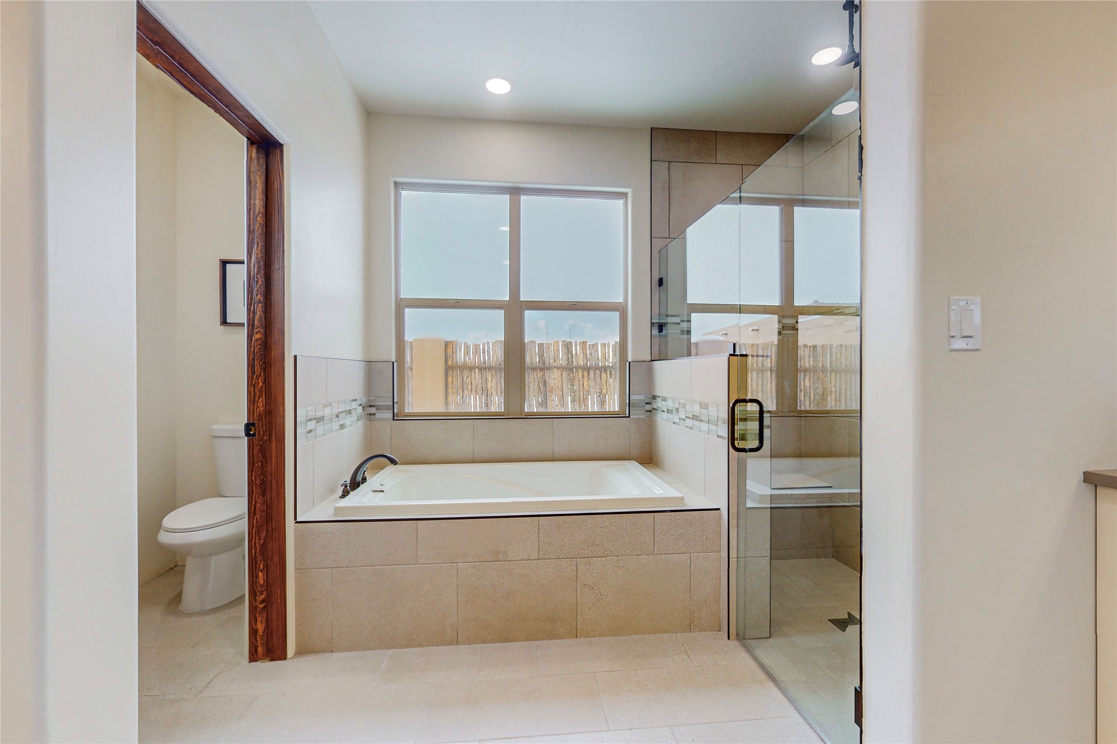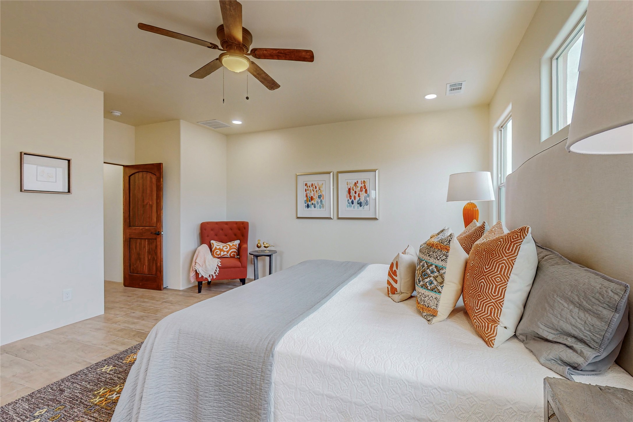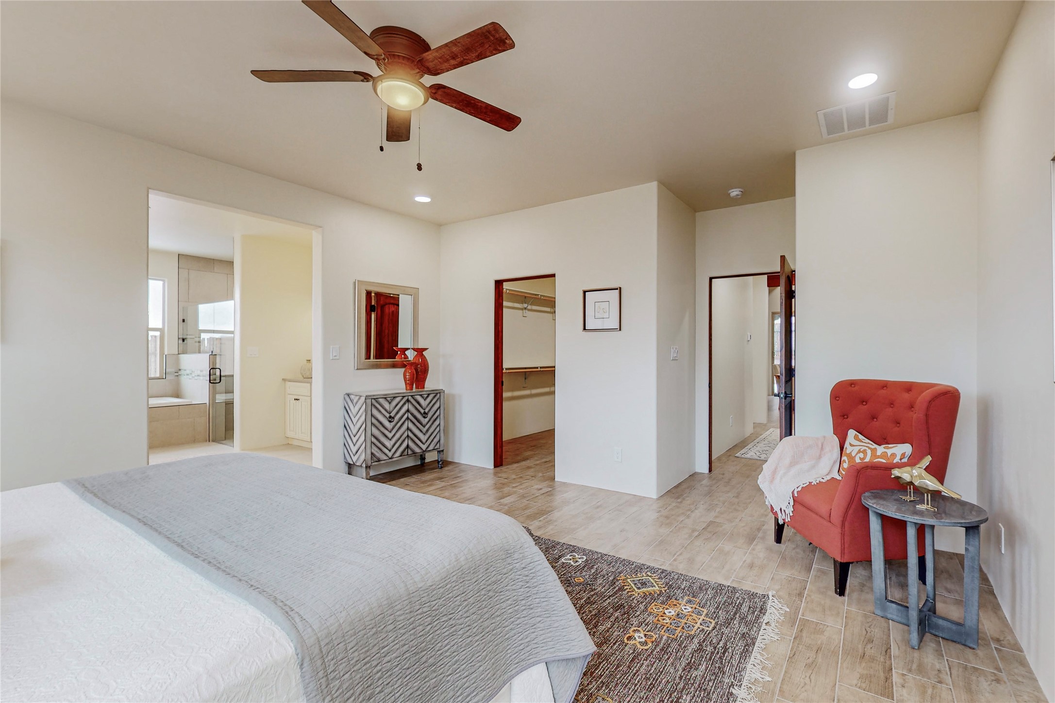This powerful Santiago Plan is a 2239 sqft 3 bedroom, 4 bath home with three fireplaces, three bedrooms, each with ensuite baths, and a 3 car garage. Located at 31 Pinon Doblado in the La Pradera Subdivision, this home backs up to and is accessible to open space. Access to this home is through an 8 ft tall door that opens into a foyer with a 13-foot boveda ceiling. Immediately to the left is a powder room and an adjacent closet. To the right is a study/bedroom with a gas-fired kiva fireplace and a 3/34 bath. The living room has a 12-foot ceiling, dark, brown-stained wood beams with T&G trim and a fireplace. The open kitchen has walnut-colored cabinets. The kitchen and the guest bedroom open out to a covered portal with a gas fireplace and brick pavers. The floor tile is porcelain plank in a light brown wood-like tone. The owner's suite has an enormous walk-in closet (about 100 sqft) and the owner's bath has a skylight, a large walk-in shower with euro style shower fixtures, and an overhead rain shower head. the exterior is a pitched roof Spanish design with clay-concrete tile roofs and covered portals with heavy wood beams and brick pavers. The driveway is a color-stamped concrete design. The insulated three-car garage has two storage closets and an epoxy-coated floor.