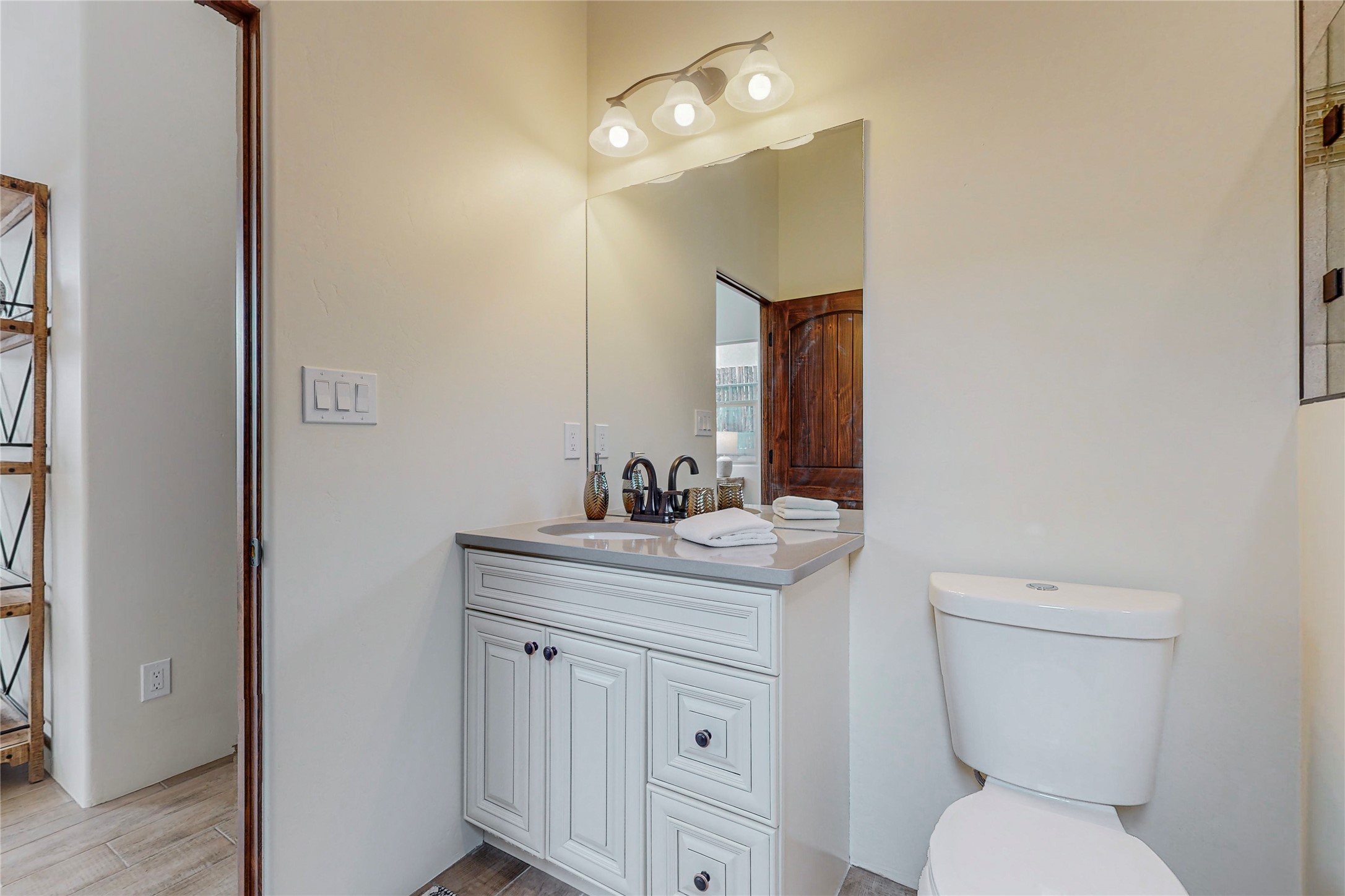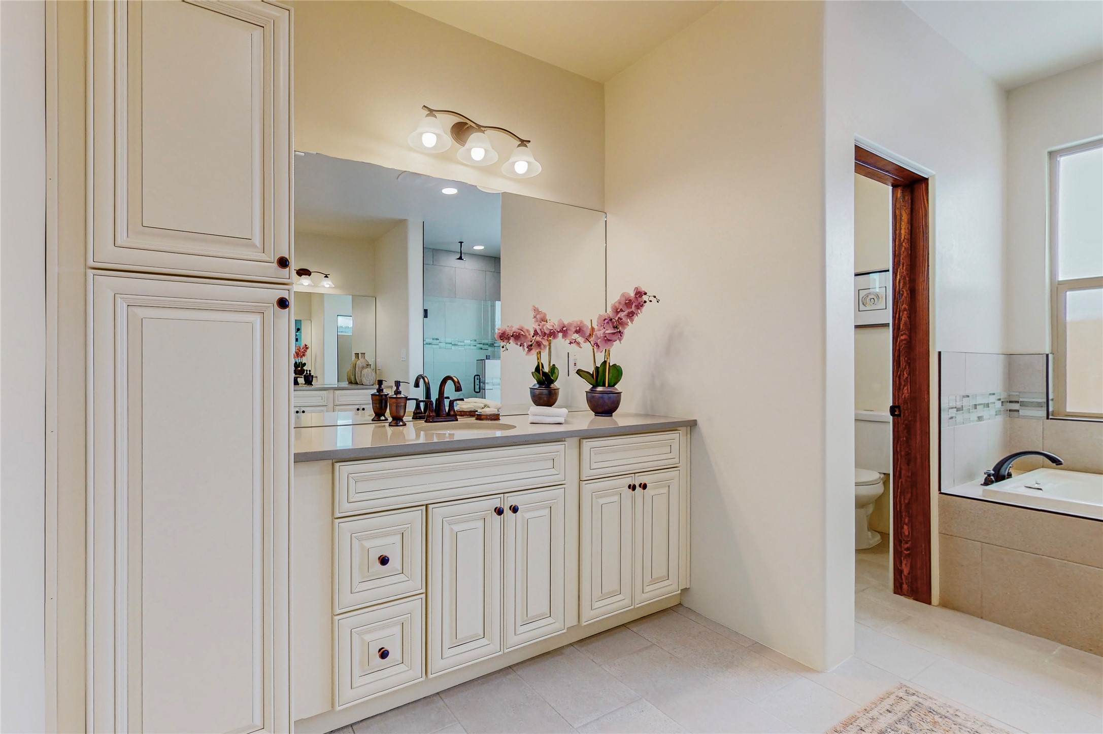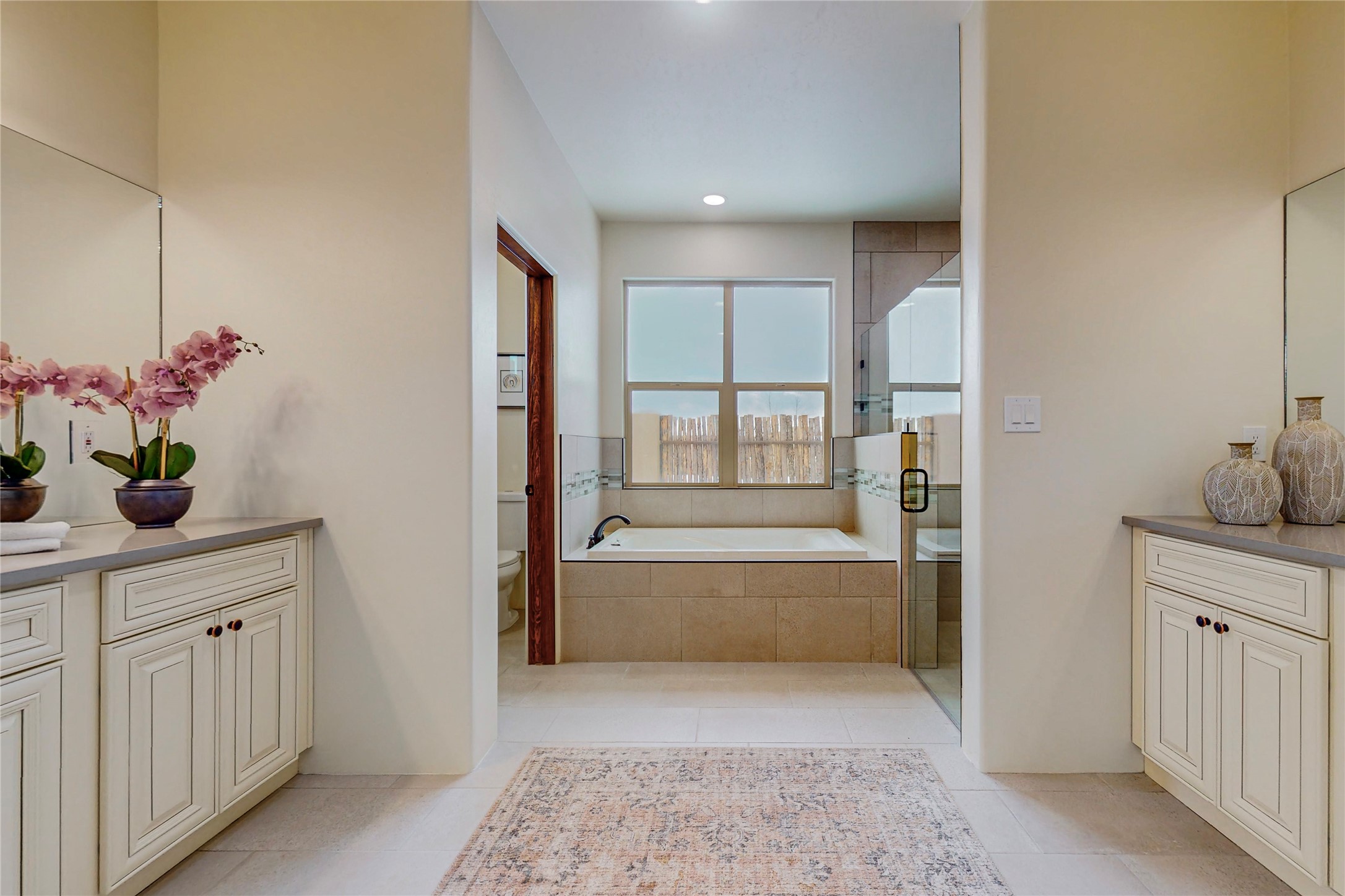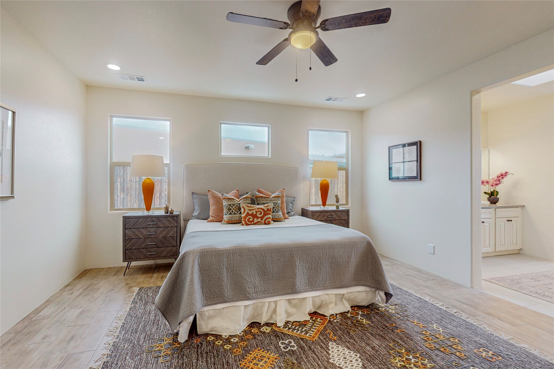 This powerful Santiago Plan is a 2239 sqft 3 bedroom, 4 bath home with three fireplaces, three bedrooms, each with ensuite baths, and a 3 car garage. Located at 31 Pinon Doblado in the La Pradera Subdivision, this home backs up to and is accessible to open space. Access to this home is through an 8 ft tall door that opens into a foyer with a 13-foot boveda ceiling. Immediately to the left is a powder room and an adjacent closet. To the right is a study/bedroom with a gas-fired kiva fireplace and a 3/34 bath. The living room has a 12-foot ceiling, dark, brown-stained wood beams with T&G trim and a fireplace. The open kitchen has walnut-colored cabinets. The kitchen and the guest bedroom open out to a covered portal with a gas fireplace and brick pavers. The floor tile is porcelain plank in a light brown wood-like tone. The owner's suite has an enormous walk-in closet (about 100 sqft) and the owner's bath has a skylight, a large walk-in shower with euro style shower fixtures, and an overhead rain shower head. the exterior is a pitched roof Spanish design with clay-concrete tile roofs and covered portals with heavy wood beams and brick pavers. The driveway is a color-stamped concrete design. The insulated three-car garage has two storage closets and an epoxy-coated floor.
