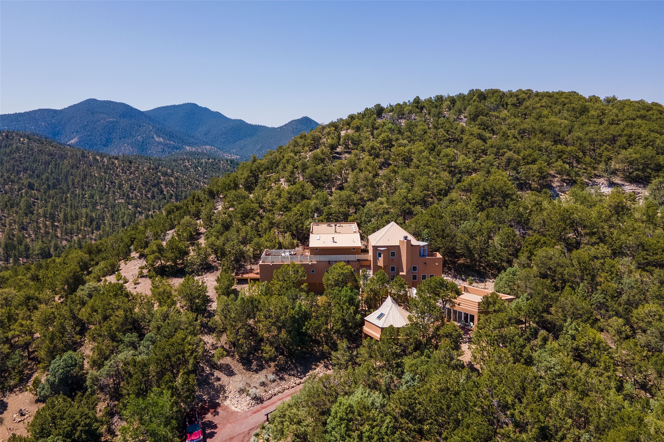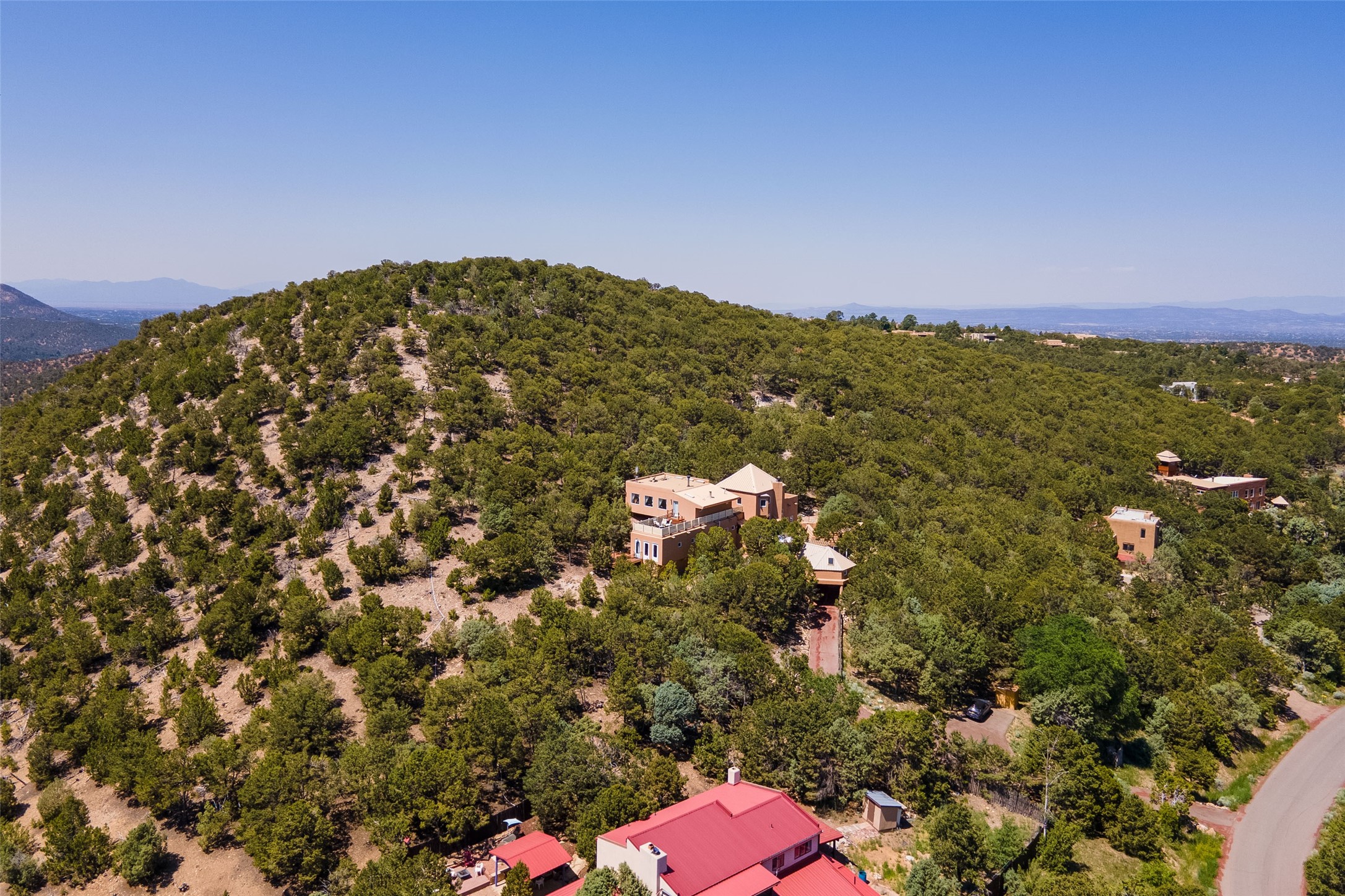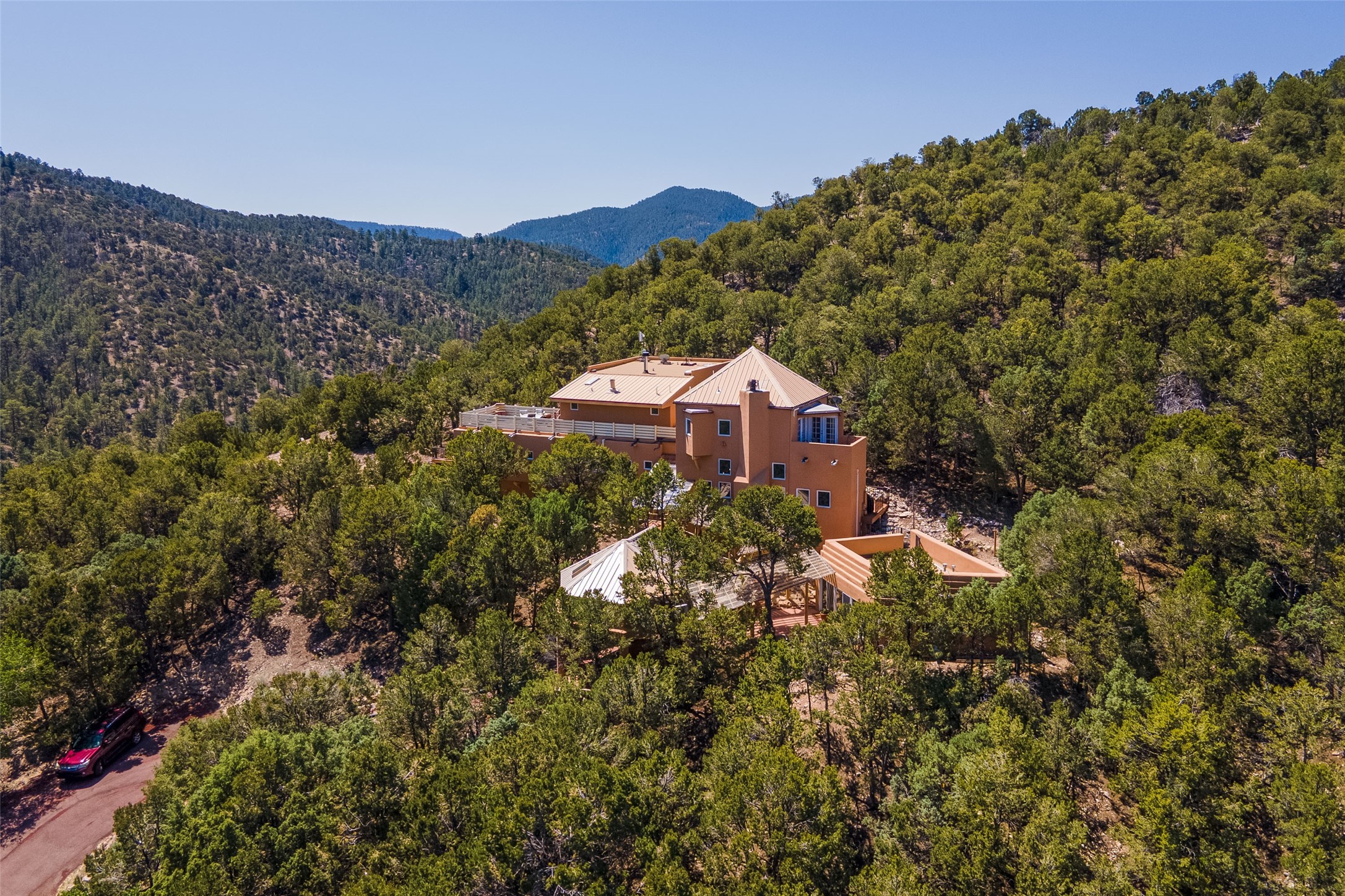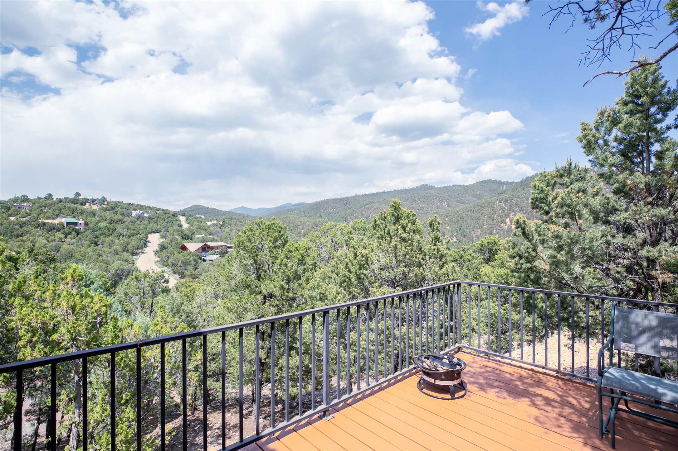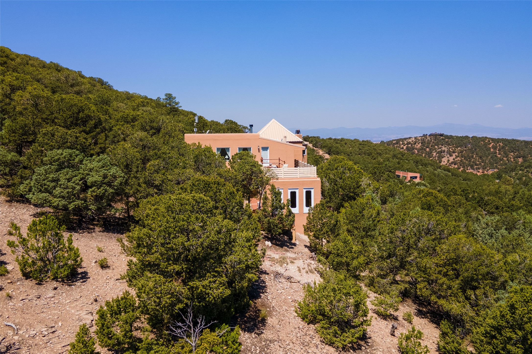 Welcome to 2092 Paseo Primero in the breathtaking Hyde Park area just outside Santa Fe. This luxurious mountain getaway offers a serene retreat while being conveniently located only 3.5 miles from the bustling SF Plaza and within walking distance to the renowned Ten Thousand Waves spa. Step inside the main house and instantly feel the embrace of a high-end mountain retreat. The property exudes an incredible sense of remoteness, allowing you to escape from the hustle and bustle of city life while indulging in a touch of luxury. Prepare to be captivated by the awe-inspiring views of the Jemez and Los Alamos mountains, as well as the majestic Ski Santa Fe, from not one, but four expansive decks. Whether you're sipping a glass of wine, admiring the sunrise, or stargazing under a blanket of stars, these decks offer a perfect setting to elevate your mountain getaway experience. Inside, this property showcases multiple living areas, providing ample space for relaxation, entertainment, and privacy. The main house can be divided into two separate units, offering the flexibility to accommodate extended family, guests, or even generate rental income. Each unit features its own distinct character and style, creating an inviting and versatile living arrangement. You'll appreciate the wood beam ceilings that add a touch of rustic elegance to the space. Cozy up by the fireplace, as the flames dance and create a warm ambiance that perfectly complements the natural beauty surrounding the property. For those seeking outdoor adventure, the hiking trails accessible right from the side and back yard beckon you to explore the picturesque landscape. As you pass through the electric front gate and meander down the driveway, you'll feel a sense of exclusivity and tranquility that only a private mountain retreat can provide.