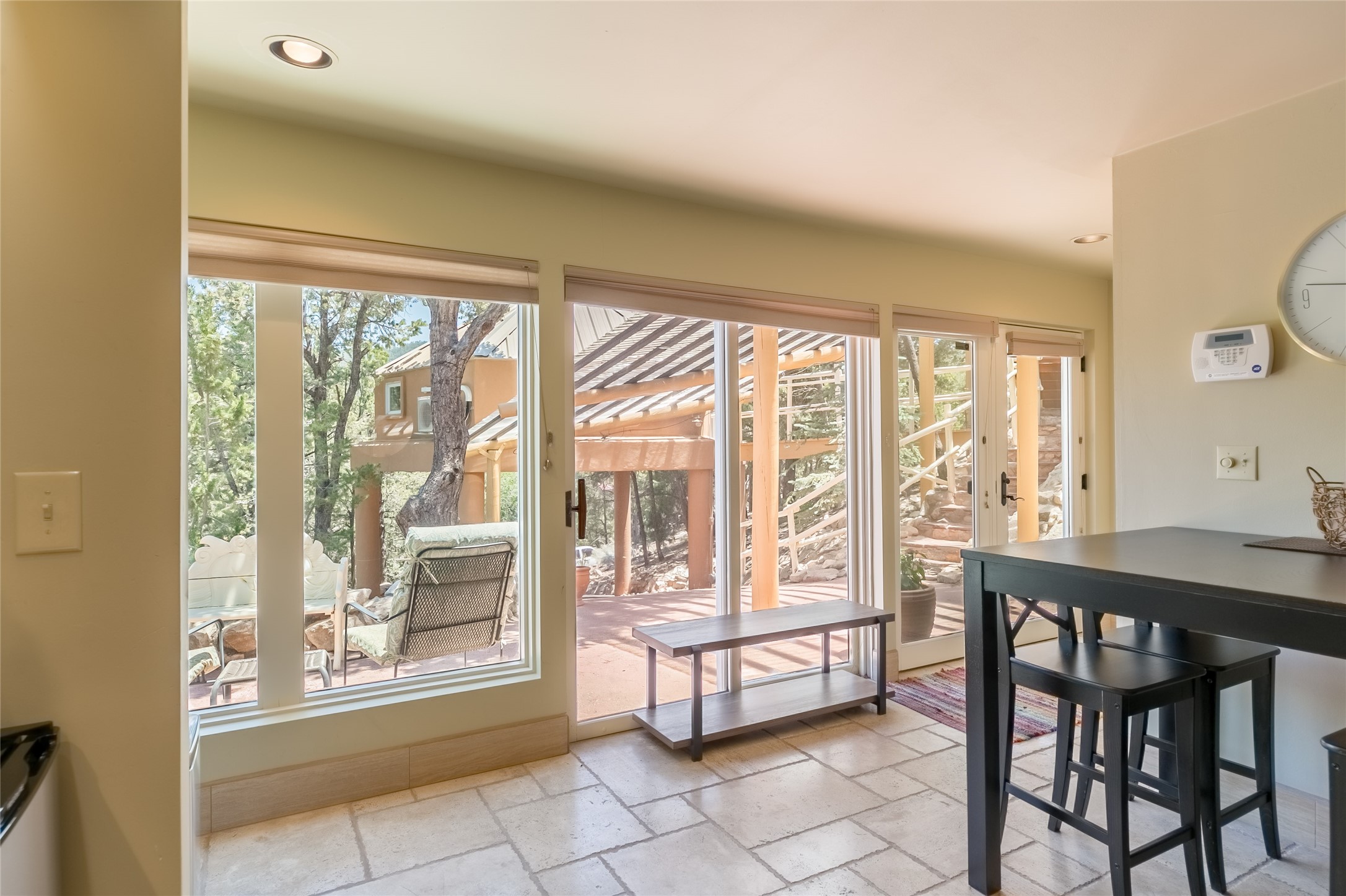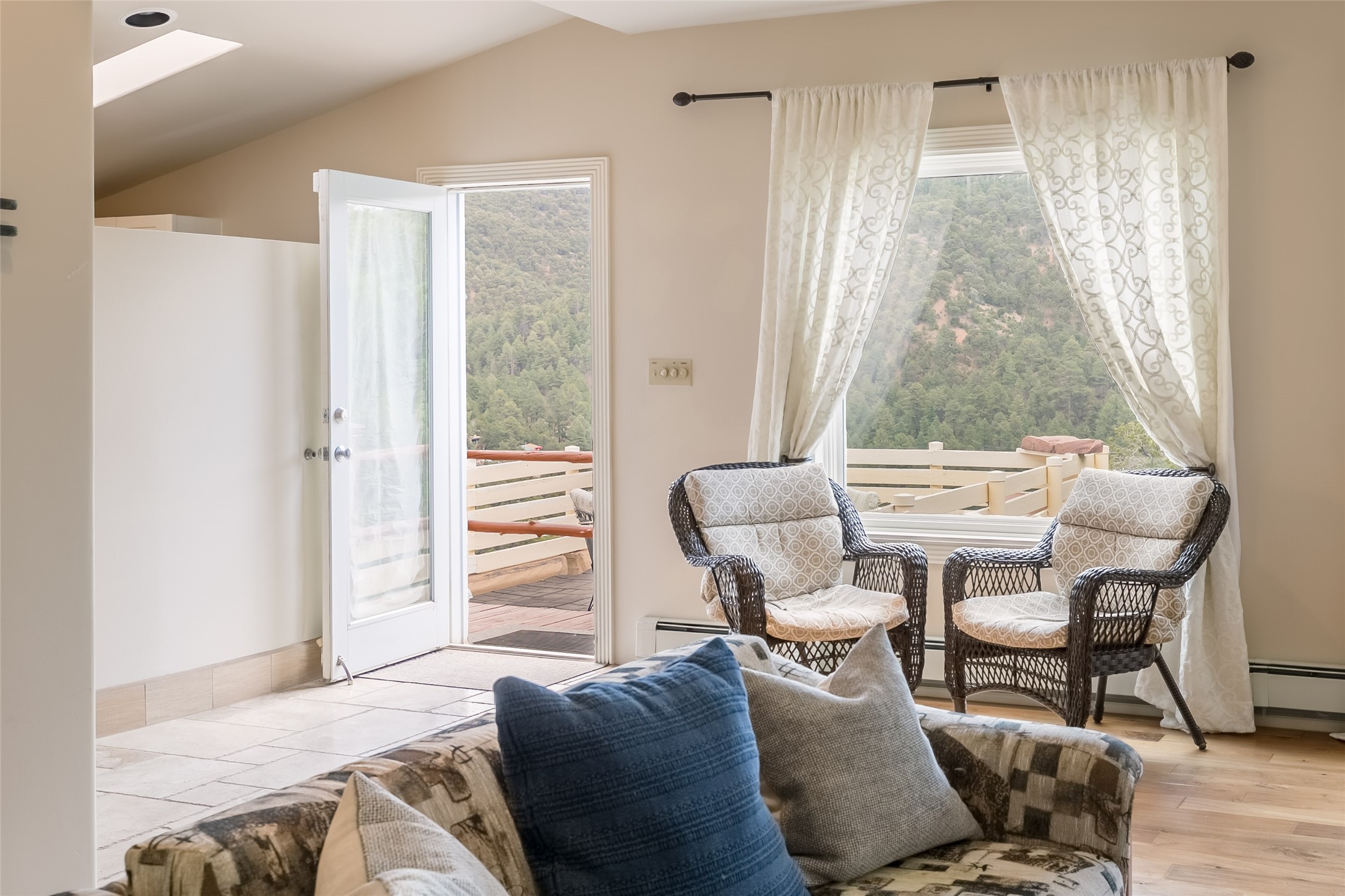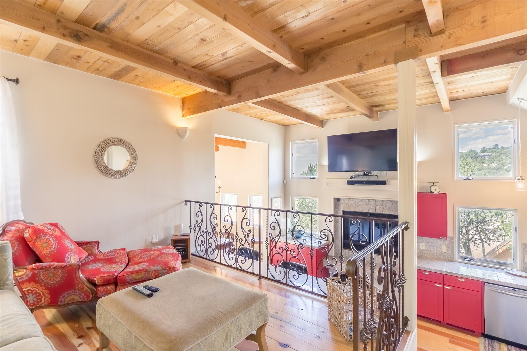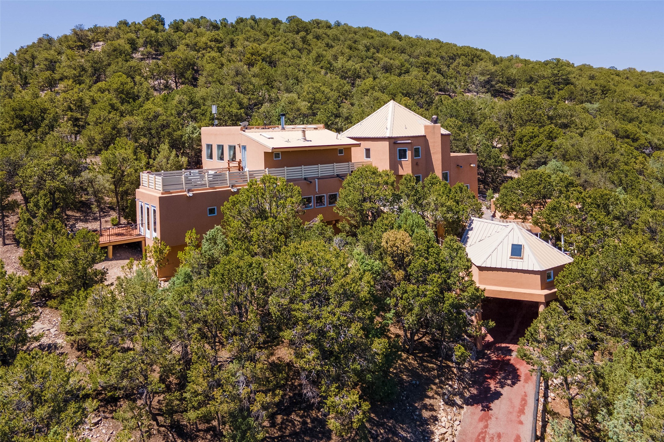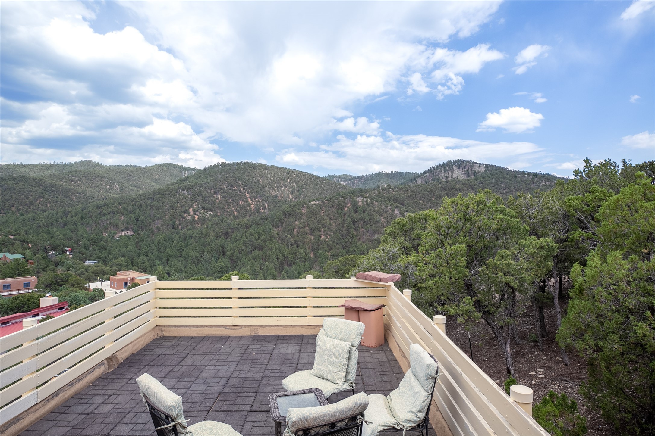 Welcome to 2092 Paseo Primero in the breathtaking Hyde Park area just outside Santa Fe. This luxurious mountain getaway offers a serene retreat while being conveniently located only 3.5 miles from the bustling SF Plaza and within walking distance to the renowned Ten Thousand Waves spa. Step inside the main house and instantly feel the embrace of a high-end mountain retreat. The property exudes an incredible sense of remoteness, allowing you to escape from the hustle and bustle of city life while indulging in a touch of luxury. Prepare to be captivated by the awe-inspiring views of the Jemez and Los Alamos mountains, as well as the majestic Ski Santa Fe, from not one, but four expansive decks. Whether you're sipping a glass of wine, admiring the sunrise, or stargazing under a blanket of stars, these decks offer a perfect setting to elevate your mountain getaway experience. Inside, this property showcases multiple living areas, providing ample space for relaxation, entertainment, and privacy. The main house can be divided into two separate units, offering the flexibility to accommodate extended family, guests, or even generate rental income. Each unit features its own distinct character and style, creating an inviting and versatile living arrangement. You'll appreciate the wood beam ceilings that add a touch of rustic elegance to the space. Cozy up by the fireplace, as the flames dance and create a warm ambiance that perfectly complements the natural beauty surrounding the property. For those seeking outdoor adventure, the hiking trails accessible right from the side and back yard beckon you to explore the picturesque landscape. As you pass through the electric front gate and meander down the driveway, you'll feel a sense of exclusivity and tranquility that only a private mountain retreat can provide.