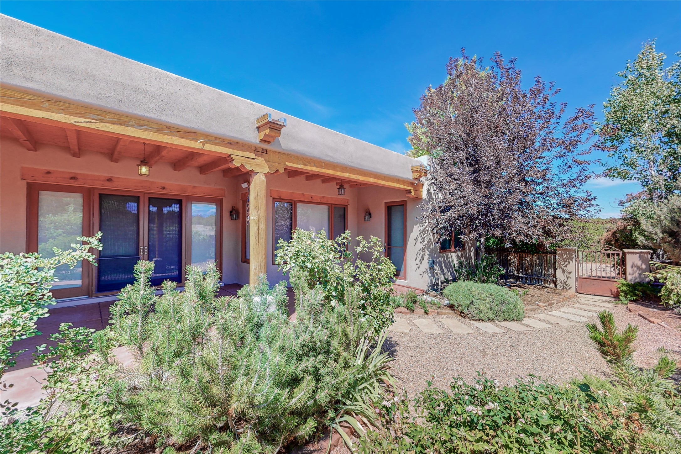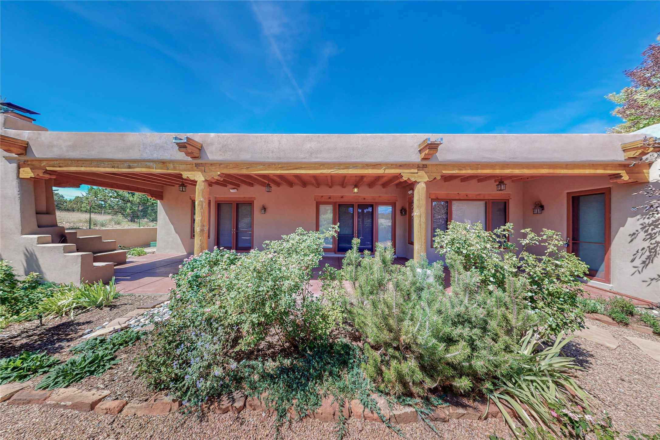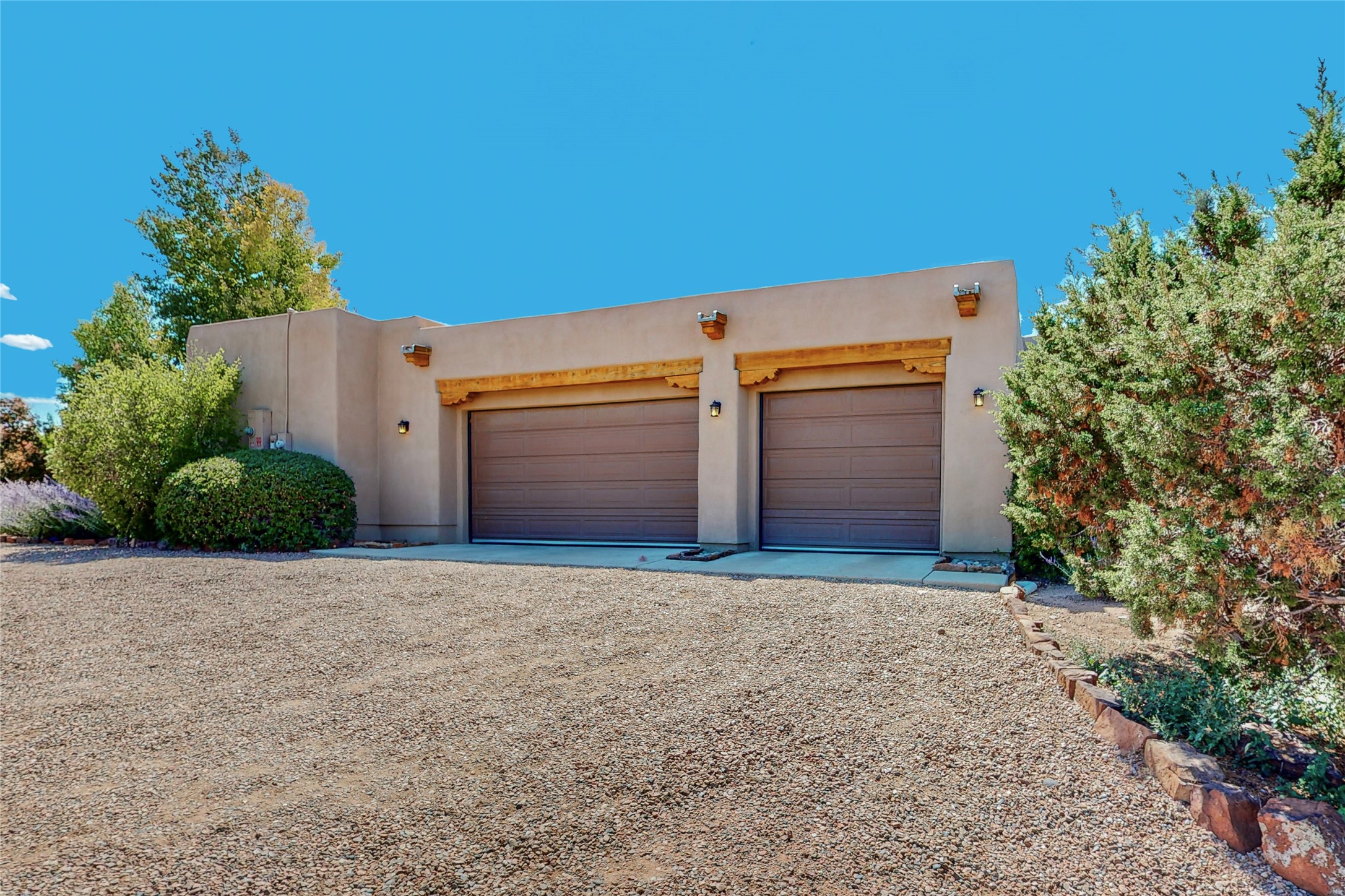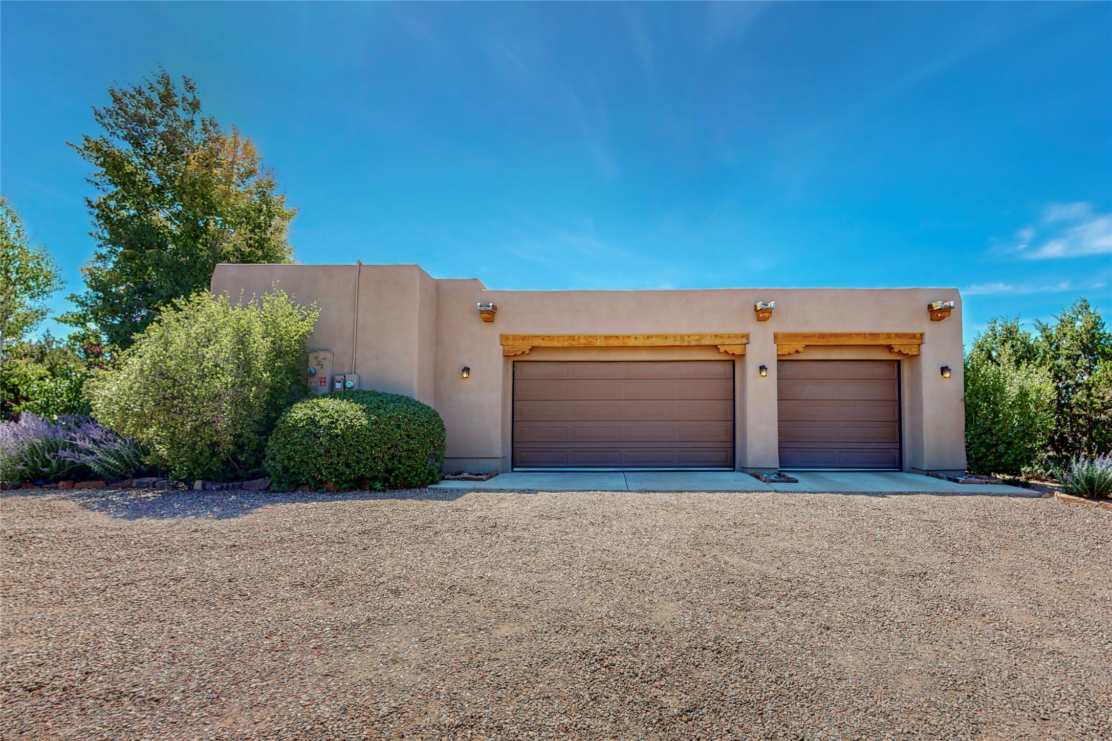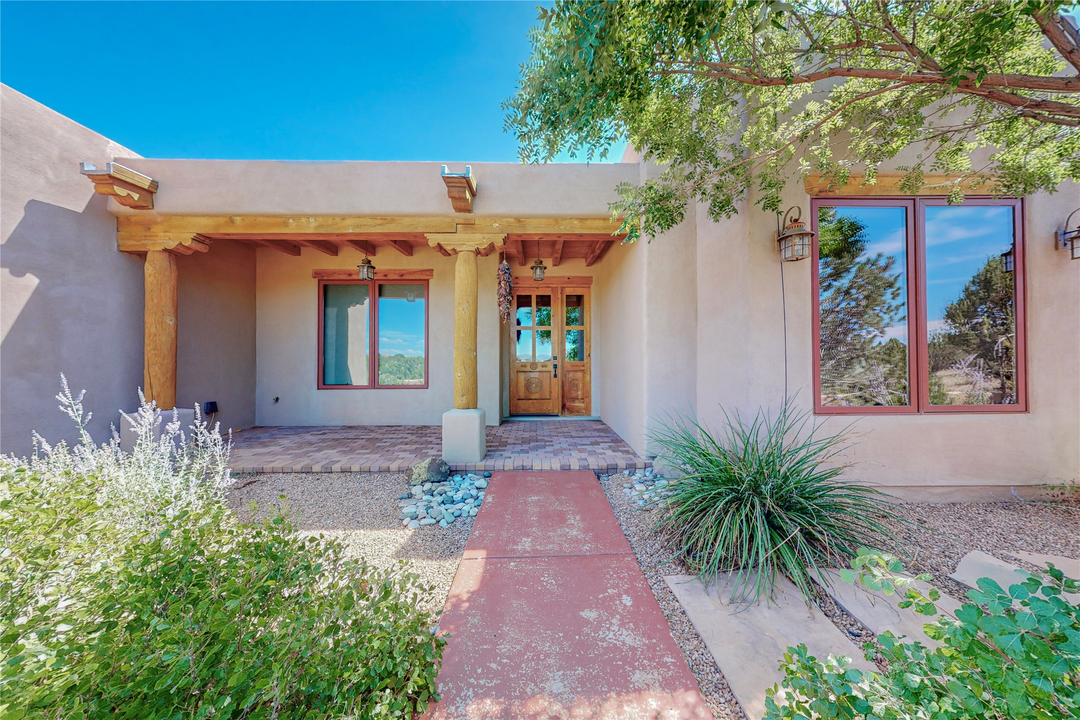 Welcome to this solar property with a desirable floor plan on 2.5 acres, just 16 minutes to The Plaza. This one-owner home offers 3/4 bedrooms. The 4th bedroom is ideal for a den or home office. An ideal home for entertaining. The kitchen opens easily to the living and dining areas. The primary suite has a kiva fireplace and ensuite bath with circular shower and soaking tub. Beautiful pine flooring in all the bedrooms. In-floor radiant heat throughout, including the 3-car garage. Enjoy the mature landscaping on the large portal, complete with a kiva fireplace. This home is pre-inspected and ready for new owners!