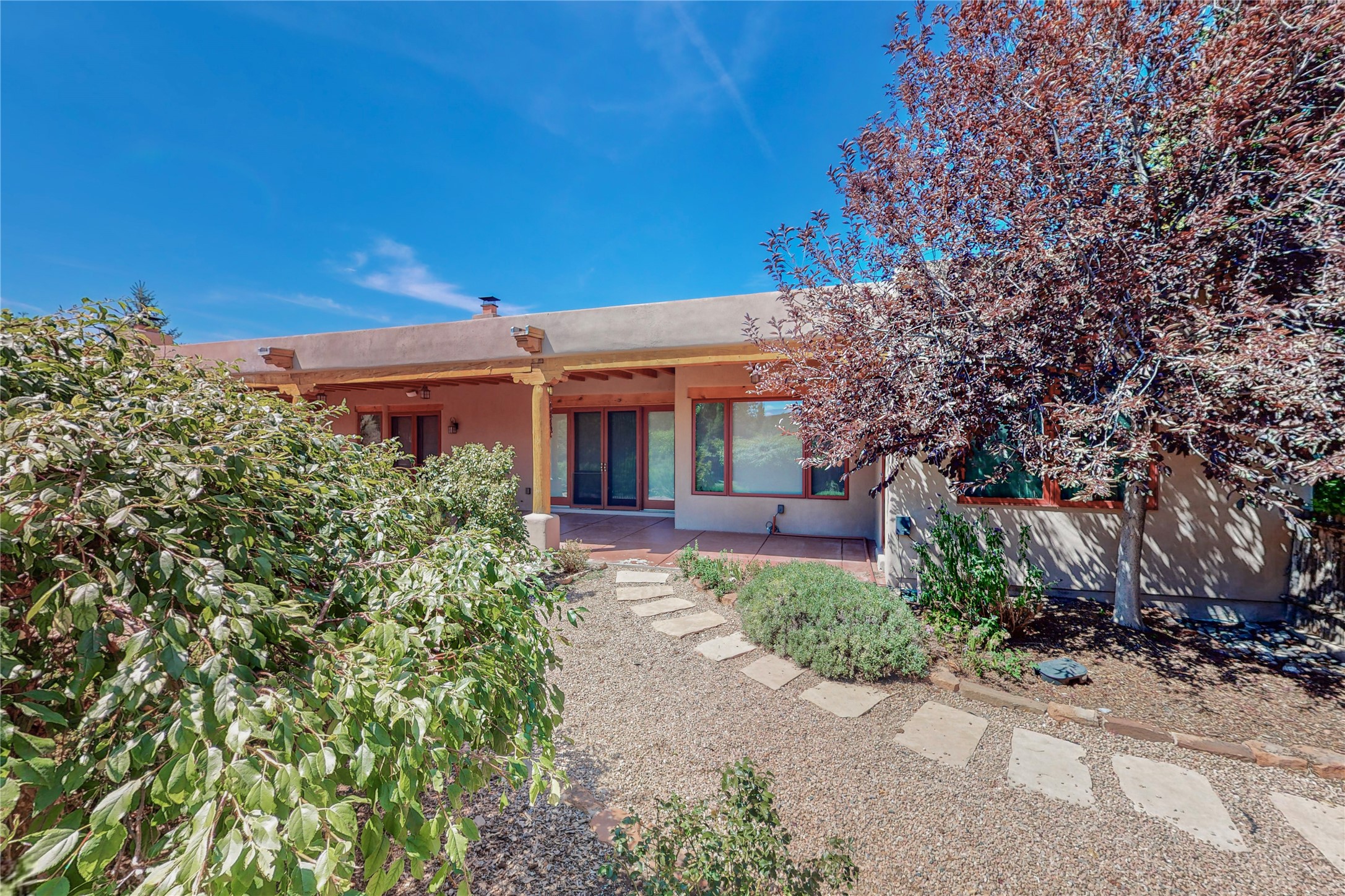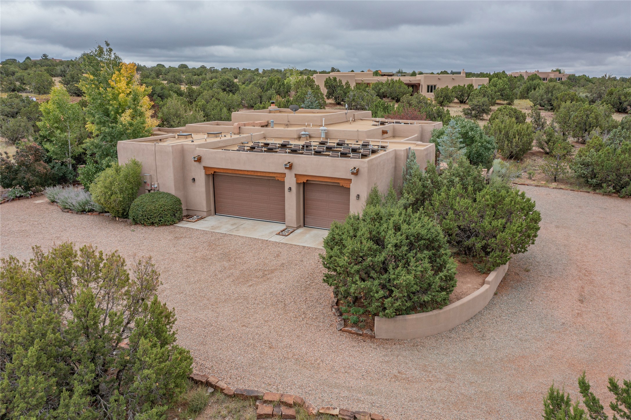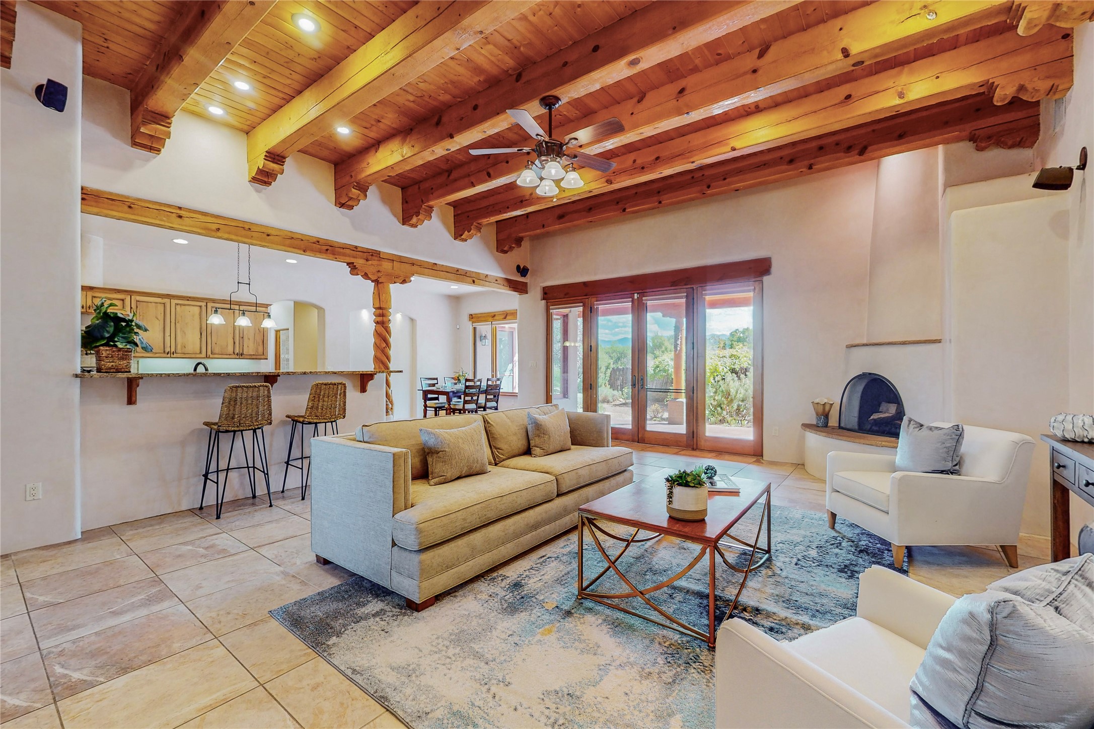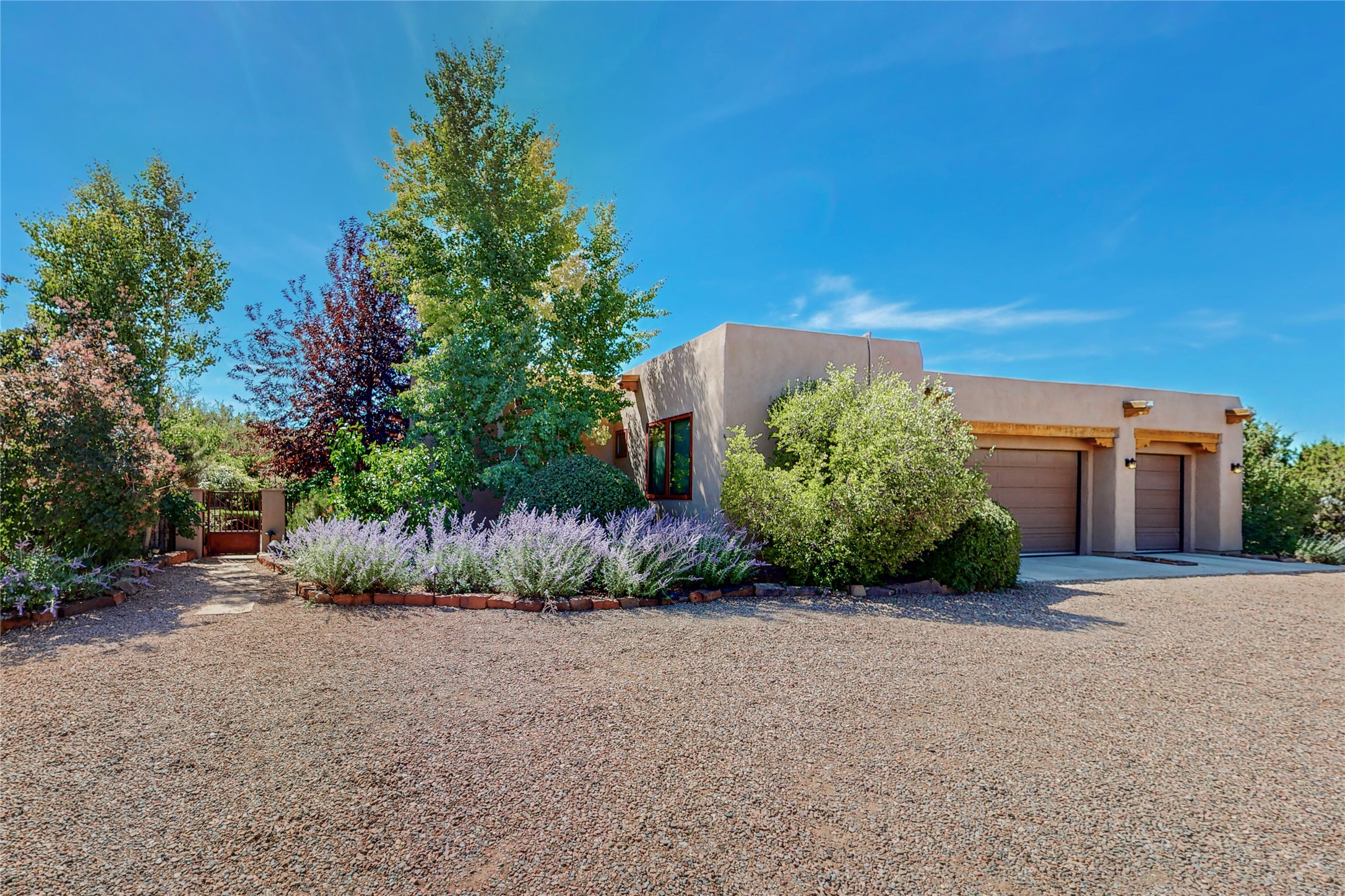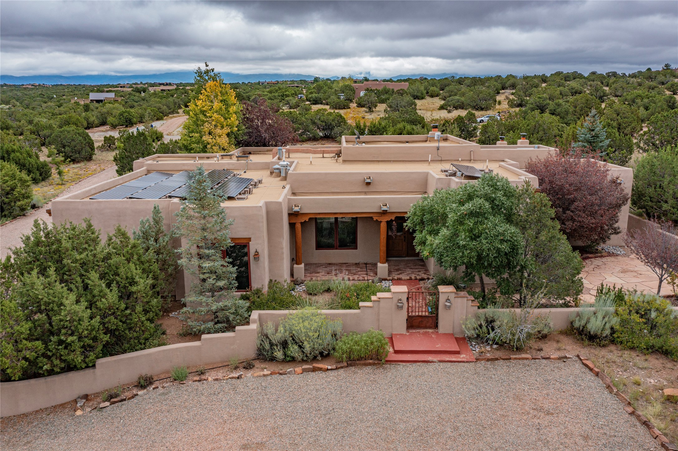 Welcome to this solar property with a desirable floor plan on 2.5 acres, just 16 minutes to The Plaza. This one-owner home offers 3/4 bedrooms. The 4th bedroom is ideal for a den or home office. An ideal home for entertaining. The kitchen opens easily to the living and dining areas. The primary suite has a kiva fireplace and ensuite bath with circular shower and soaking tub. Beautiful pine flooring in all the bedrooms. In-floor radiant heat throughout, including the 3-car garage. Enjoy the mature landscaping on the large portal, complete with a kiva fireplace. This home is pre-inspected and ready for new owners!