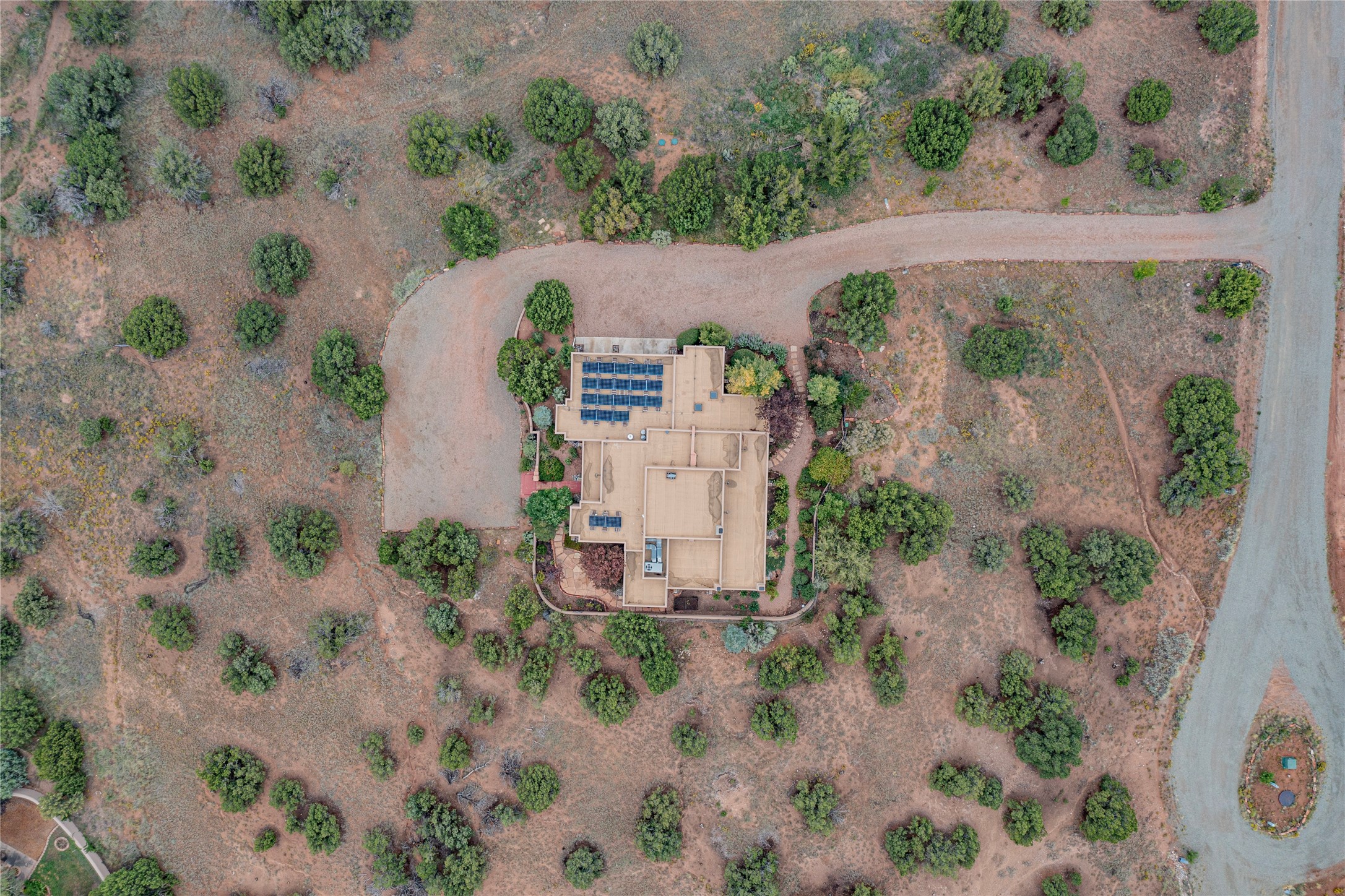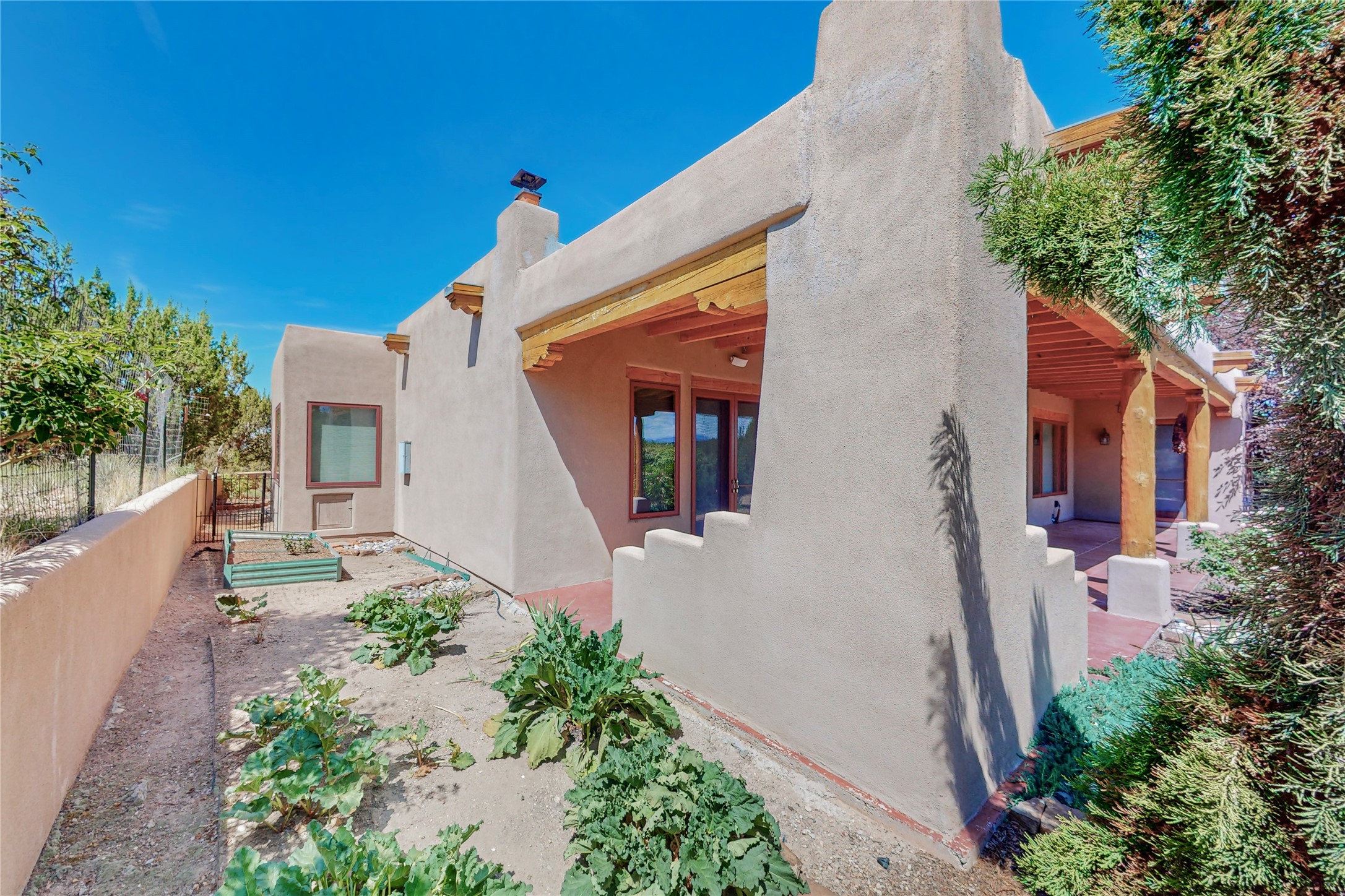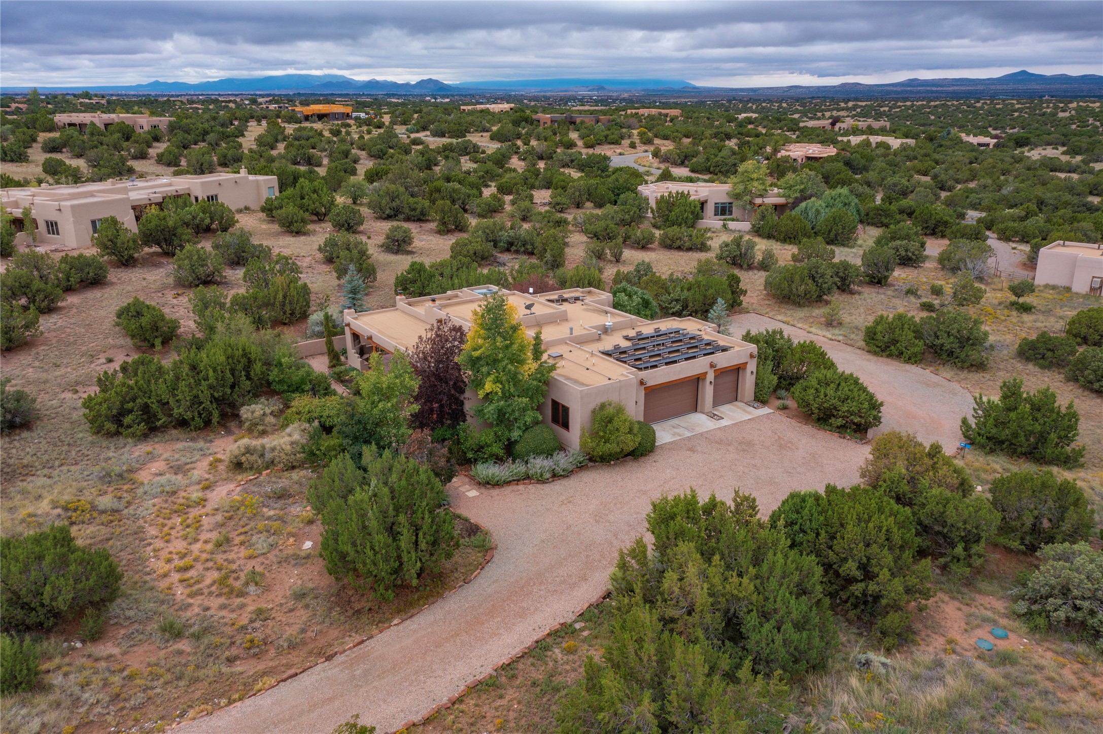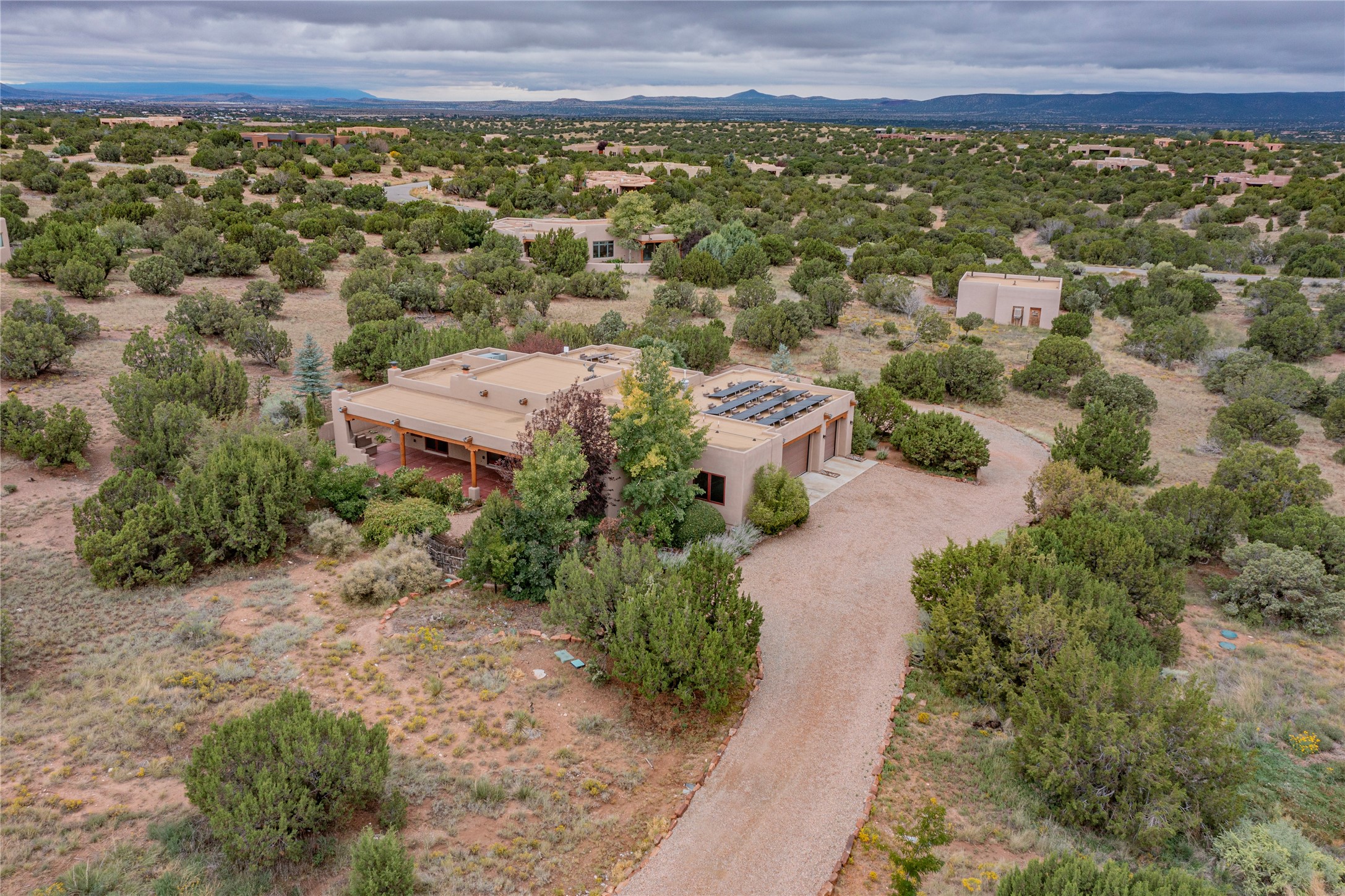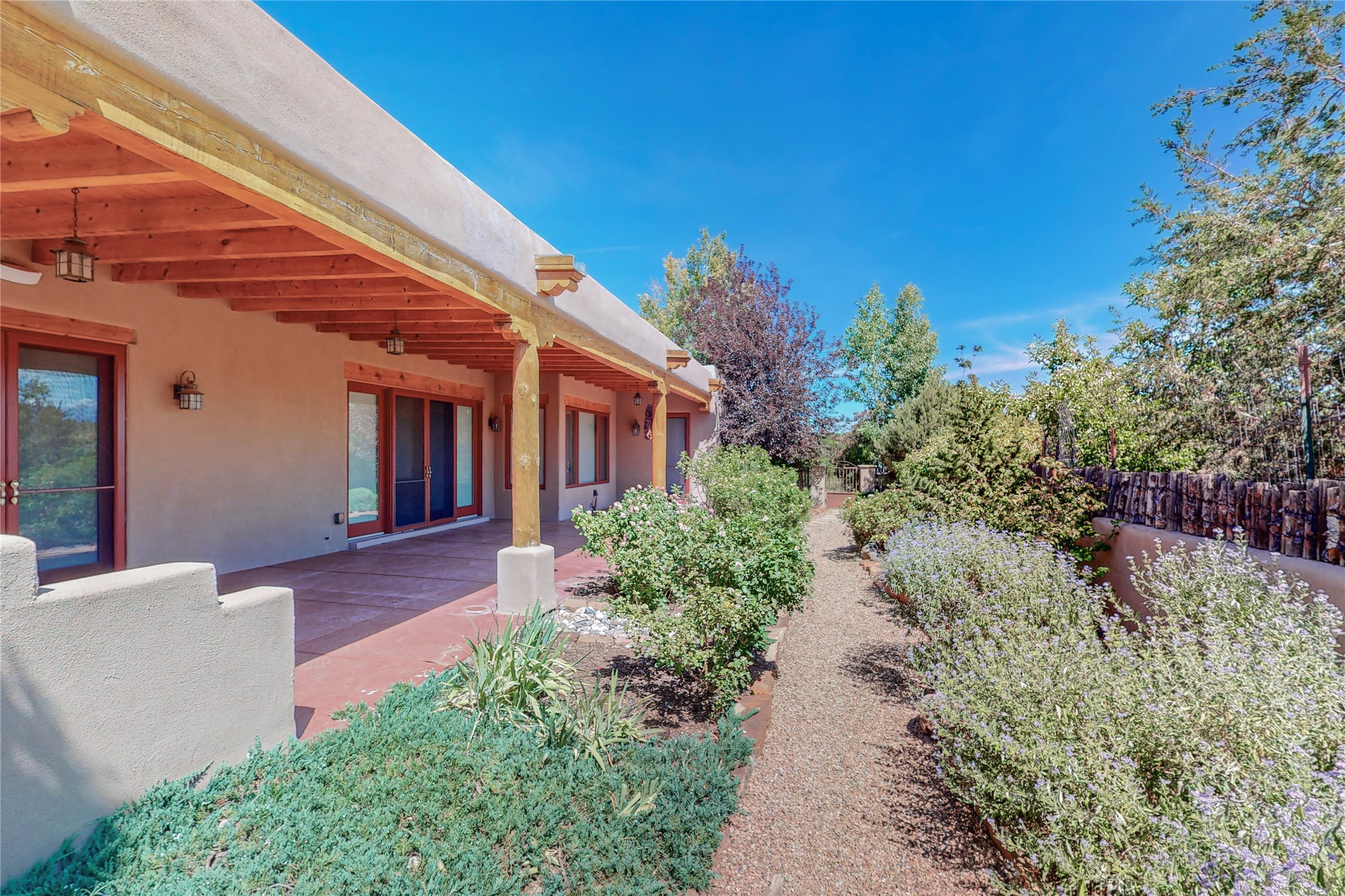 Welcome to this solar property with a desirable floor plan on 2.5 acres, just 16 minutes to The Plaza. This one-owner home offers 3/4 bedrooms. The 4th bedroom is ideal for a den or home office. An ideal home for entertaining. The kitchen opens easily to the living and dining areas. The primary suite has a kiva fireplace and ensuite bath with circular shower and soaking tub. Beautiful pine flooring in all the bedrooms. In-floor radiant heat throughout, including the 3-car garage. Enjoy the mature landscaping on the large portal, complete with a kiva fireplace. This home is pre-inspected and ready for new owners!