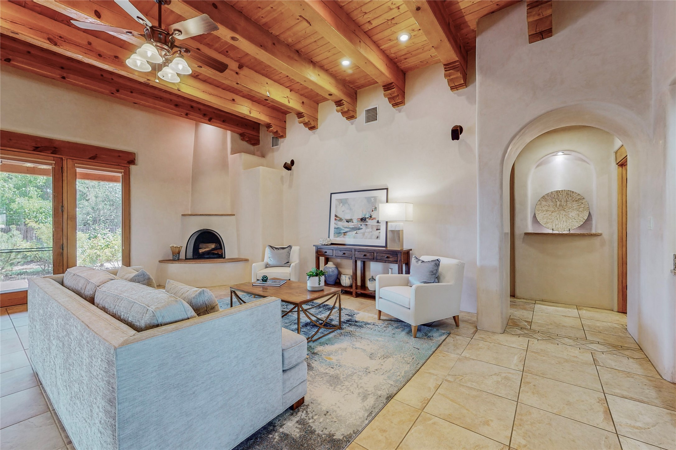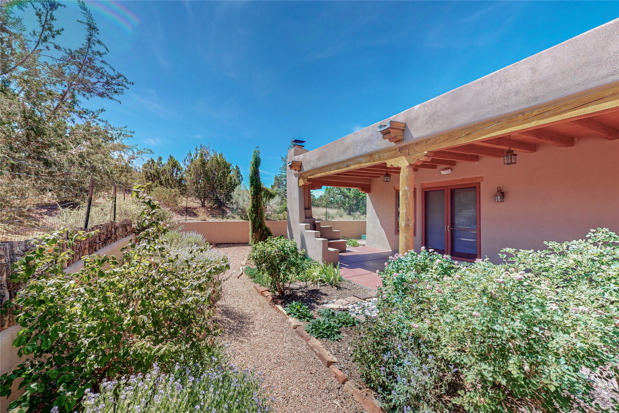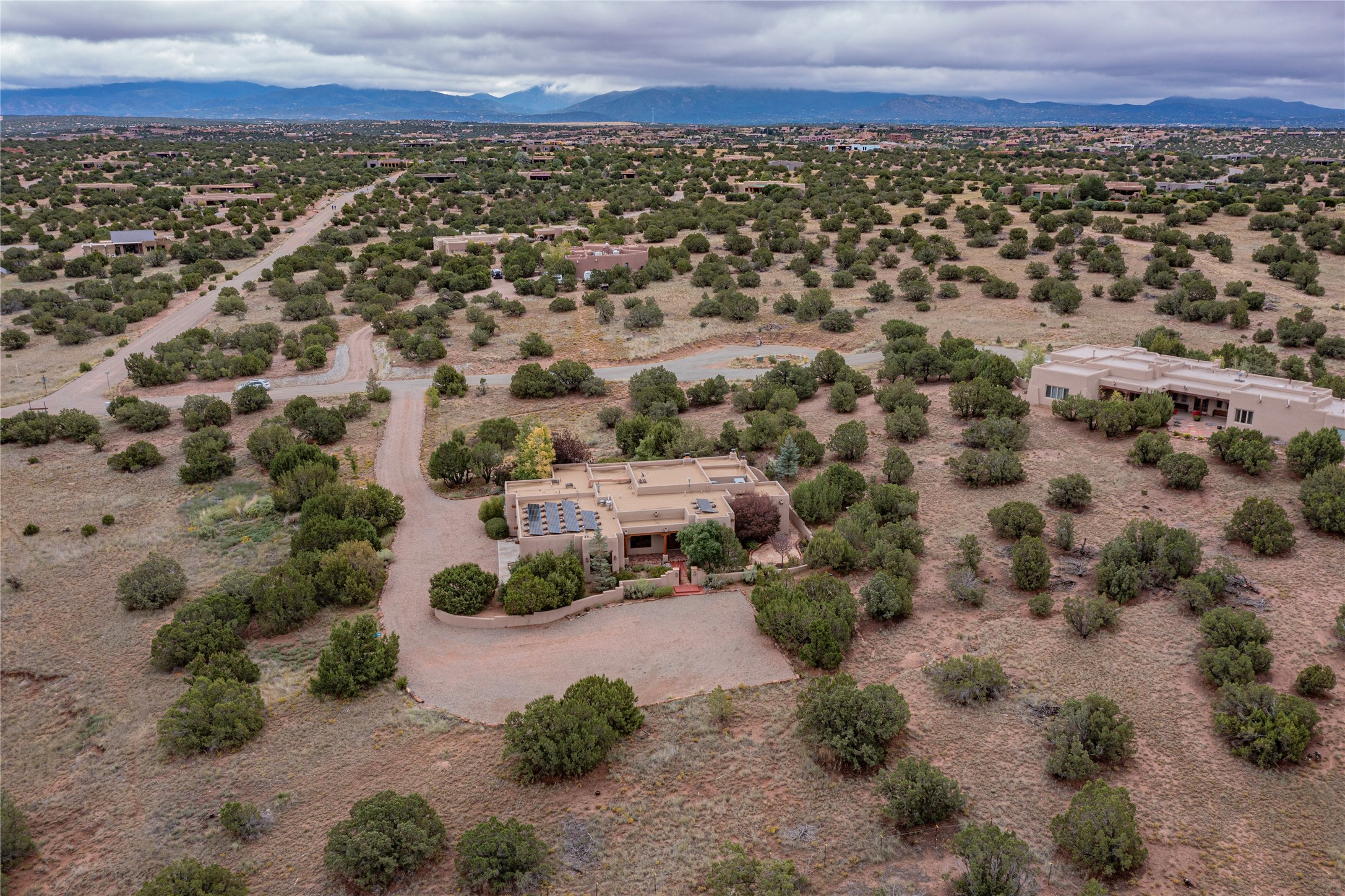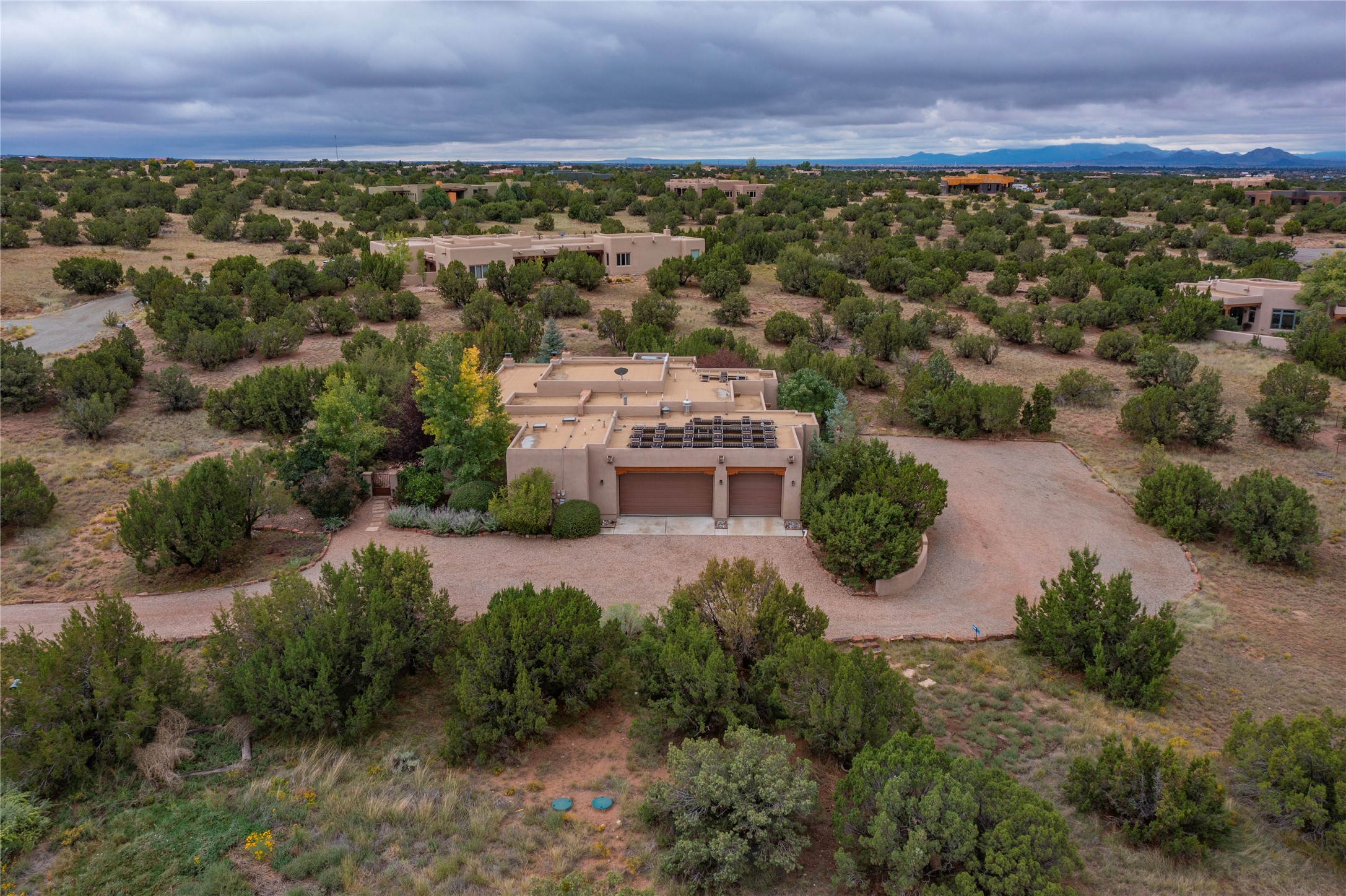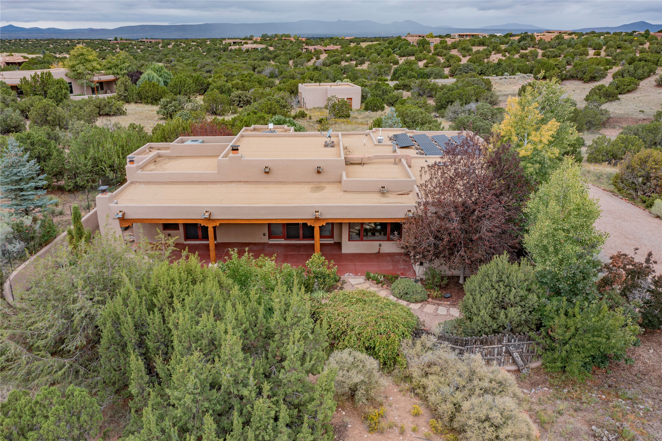 Welcome to this solar property with a desirable floor plan on 2.5 acres, just 16 minutes to The Plaza. This one-owner home offers 3/4 bedrooms. The 4th bedroom is ideal for a den or home office. An ideal home for entertaining. The kitchen opens easily to the living and dining areas. The primary suite has a kiva fireplace and ensuite bath with circular shower and soaking tub. Beautiful pine flooring in all the bedrooms. In-floor radiant heat throughout, including the 3-car garage. Enjoy the mature landscaping on the large portal, complete with a kiva fireplace. This home is pre-inspected and ready for new owners!