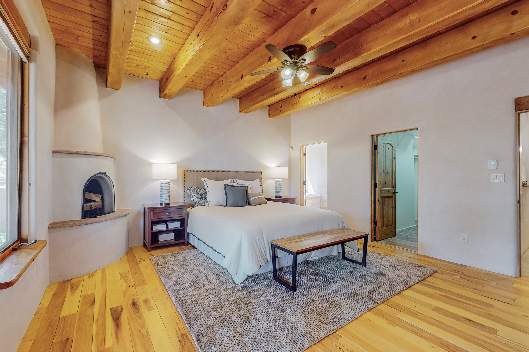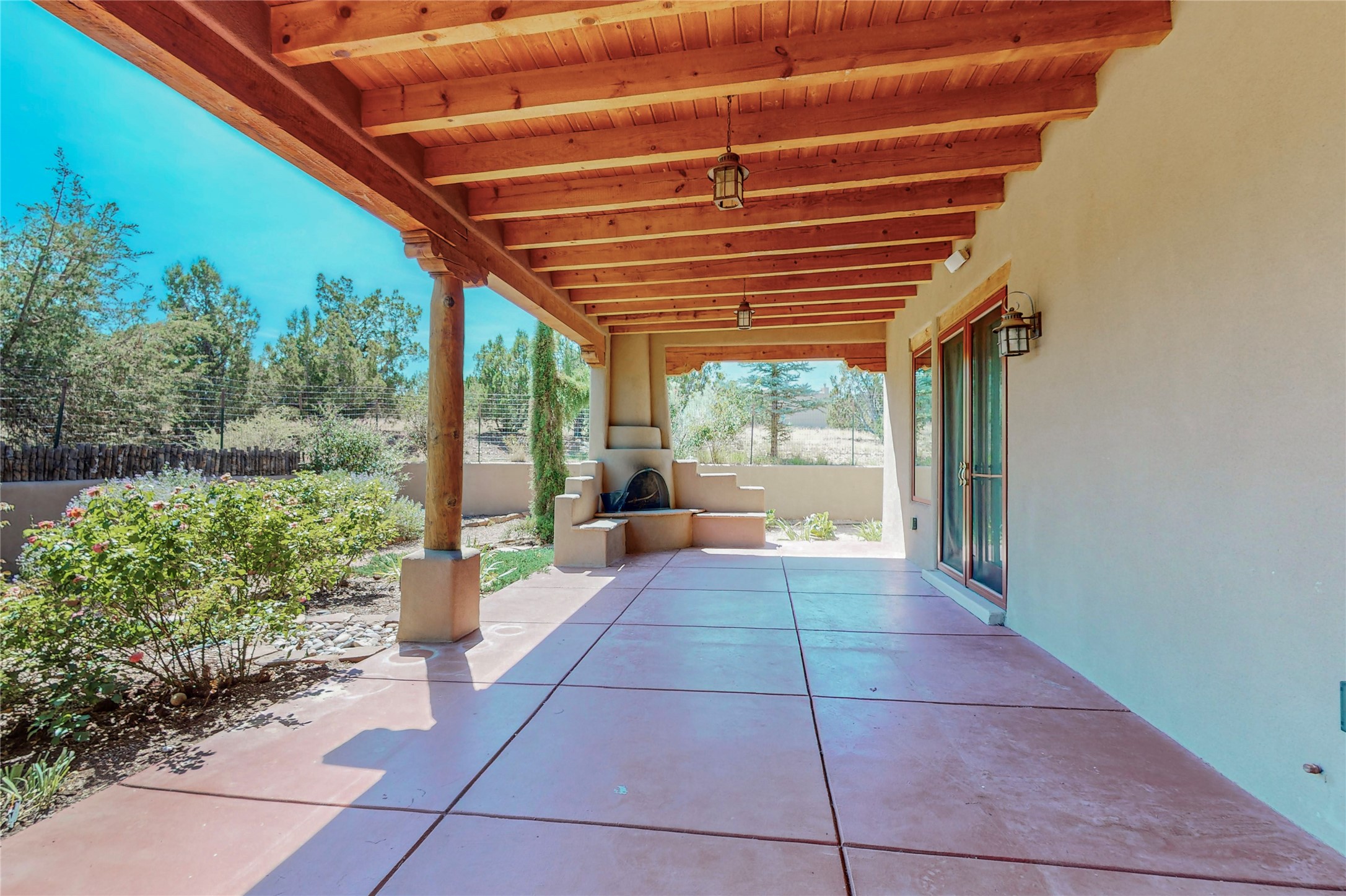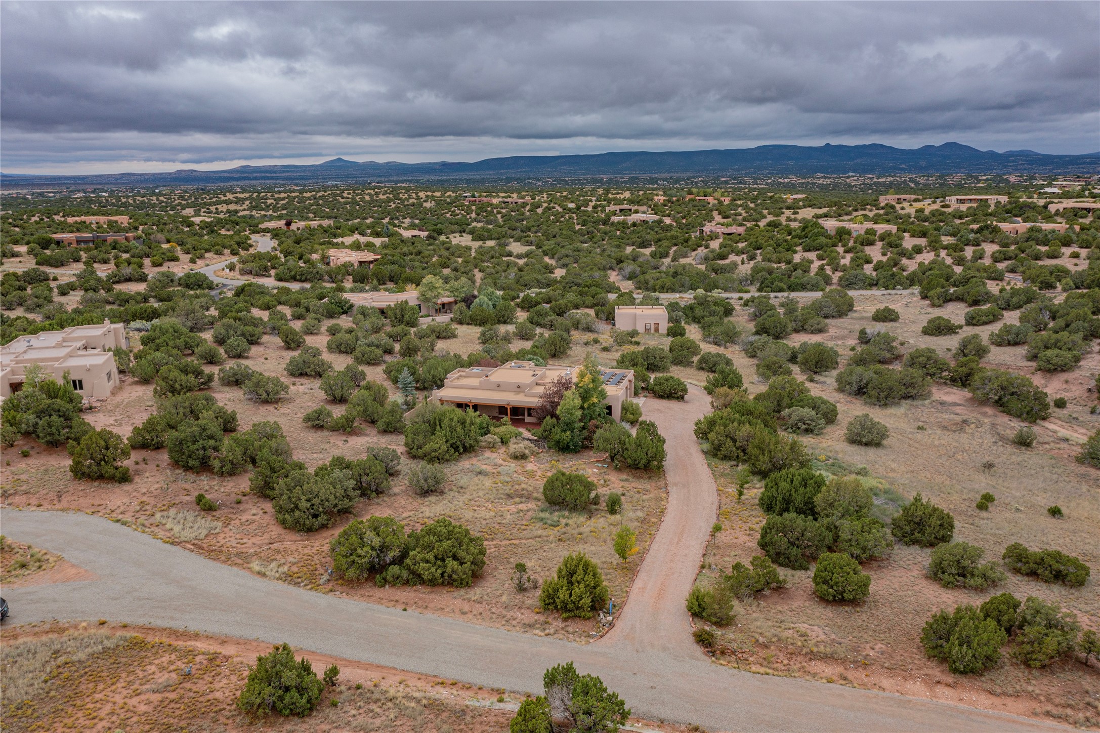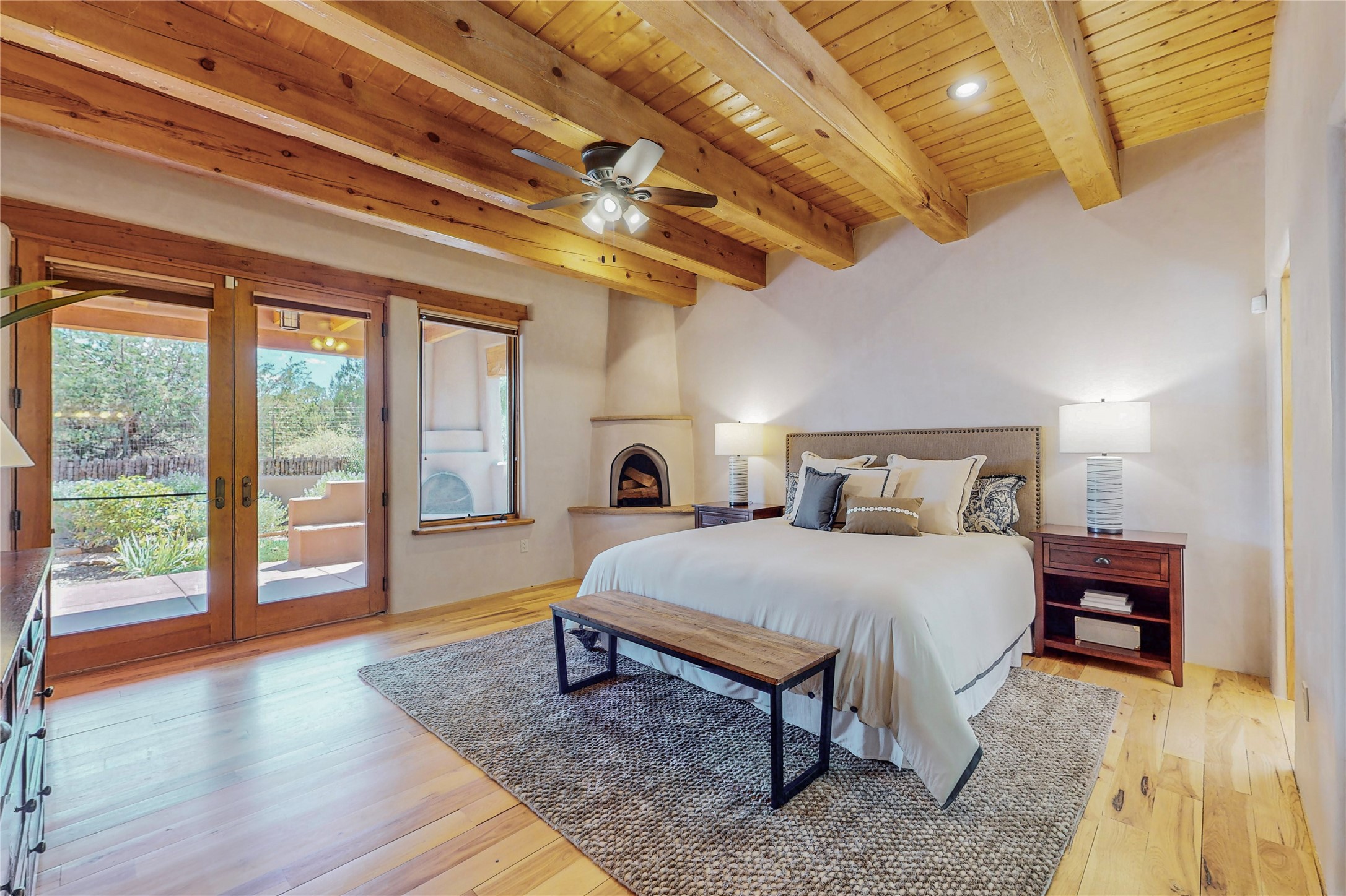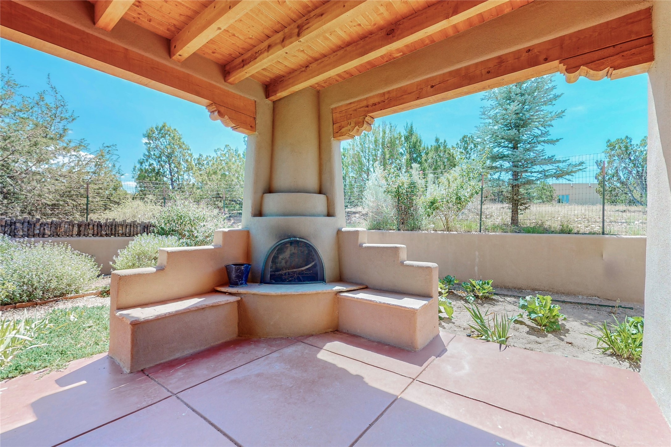 Welcome to this solar property with a desirable floor plan on 2.5 acres, just 16 minutes to The Plaza. This one-owner home offers 3/4 bedrooms. The 4th bedroom is ideal for a den or home office. An ideal home for entertaining. The kitchen opens easily to the living and dining areas. The primary suite has a kiva fireplace and ensuite bath with circular shower and soaking tub. Beautiful pine flooring in all the bedrooms. In-floor radiant heat throughout, including the 3-car garage. Enjoy the mature landscaping on the large portal, complete with a kiva fireplace. This home is pre-inspected and ready for new owners!