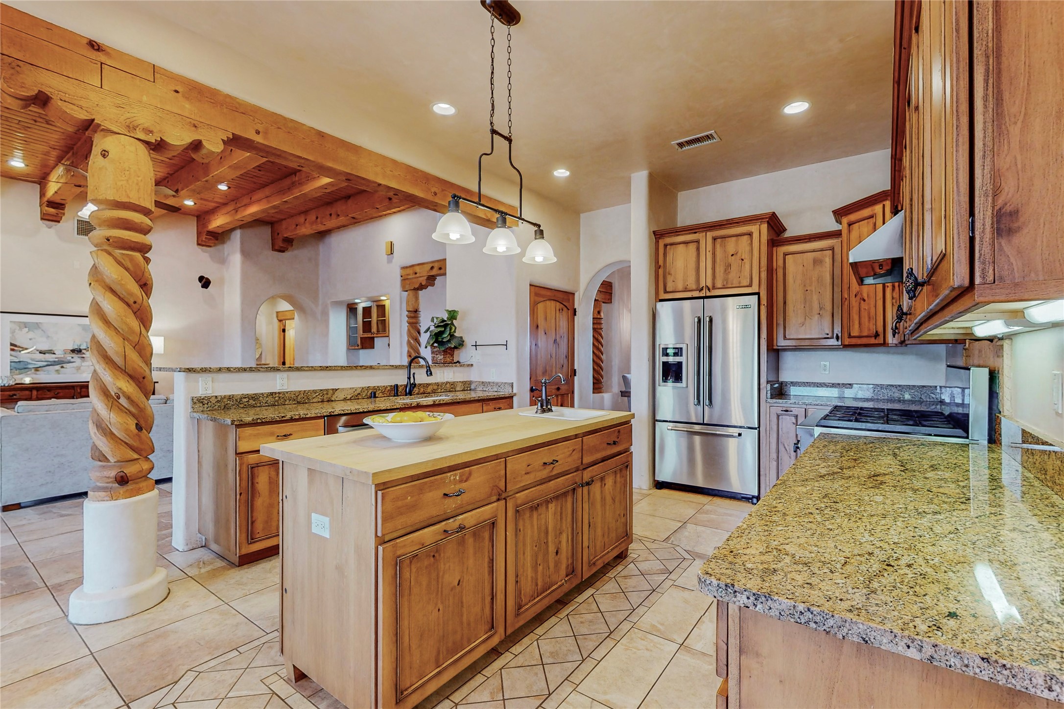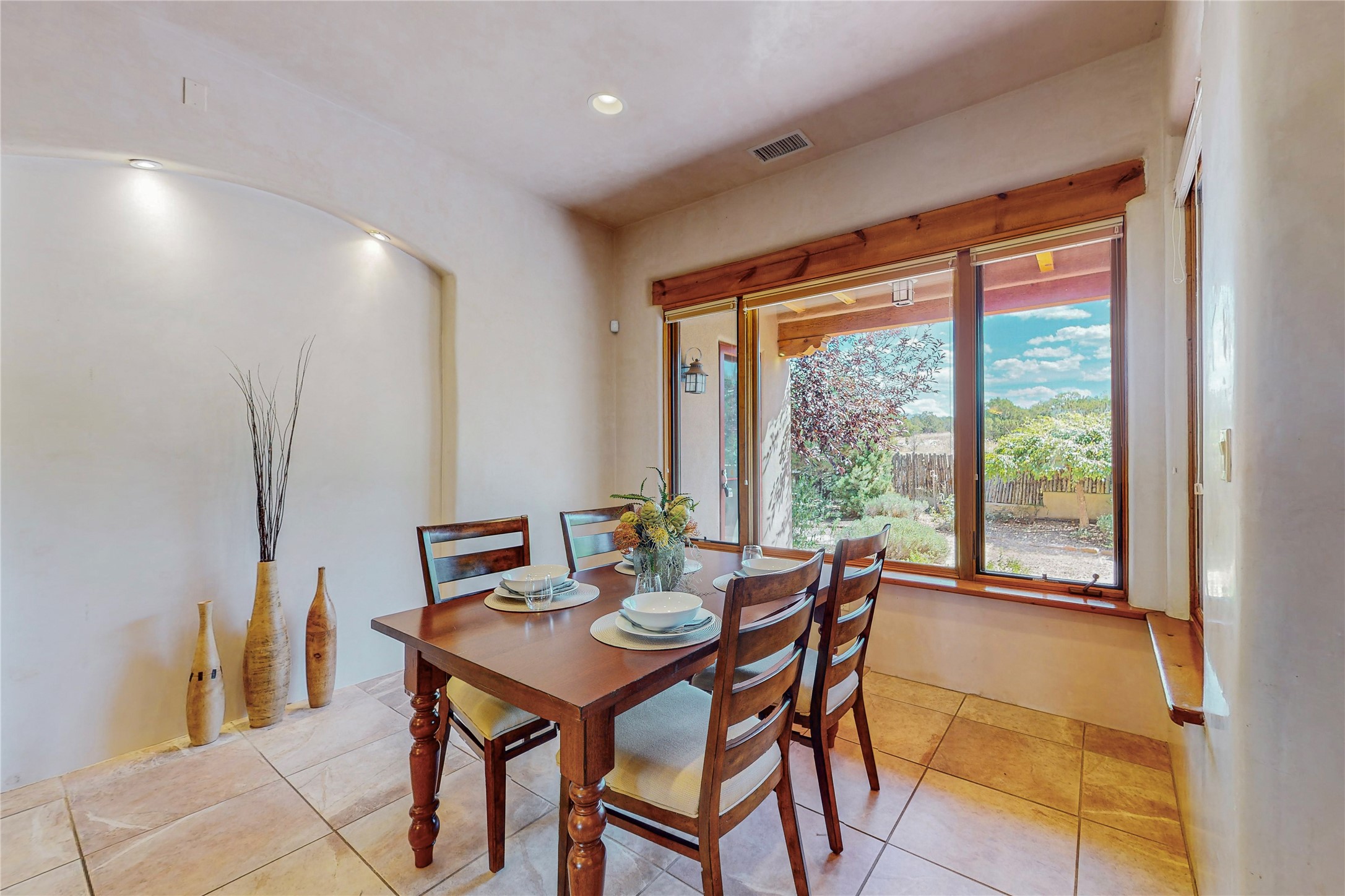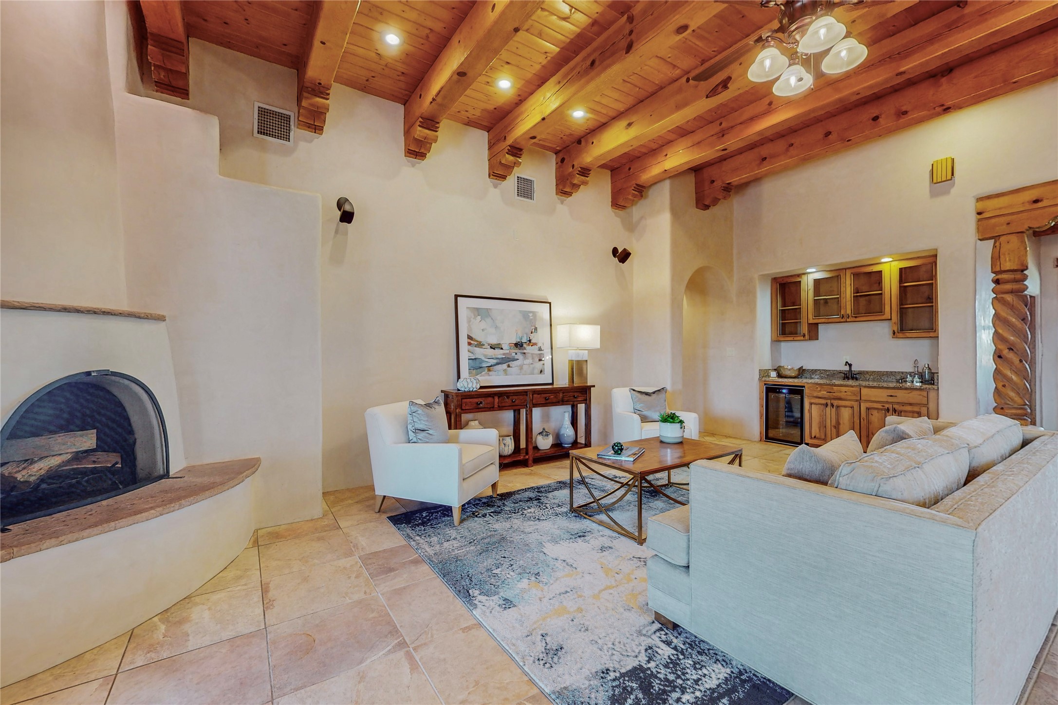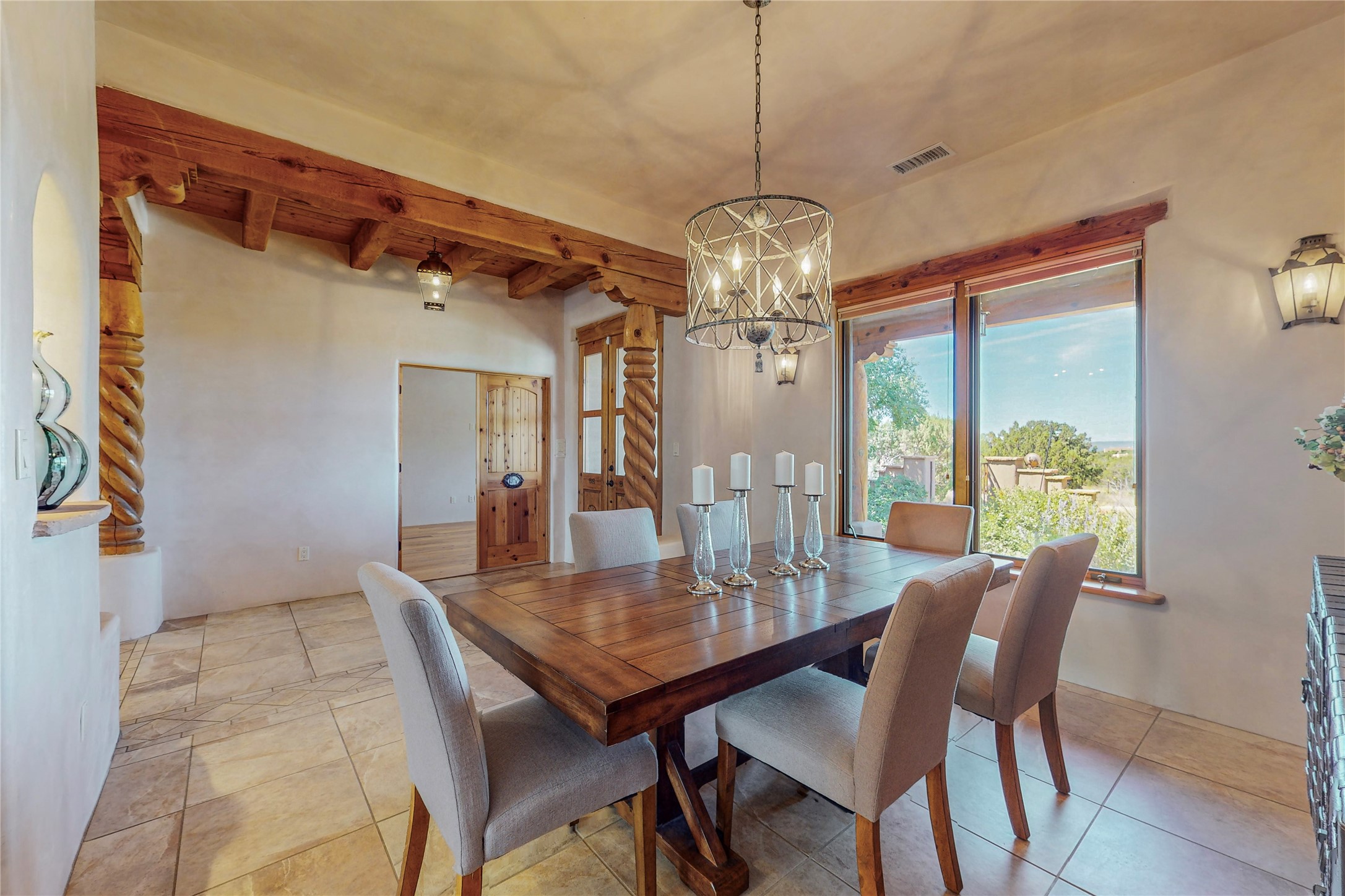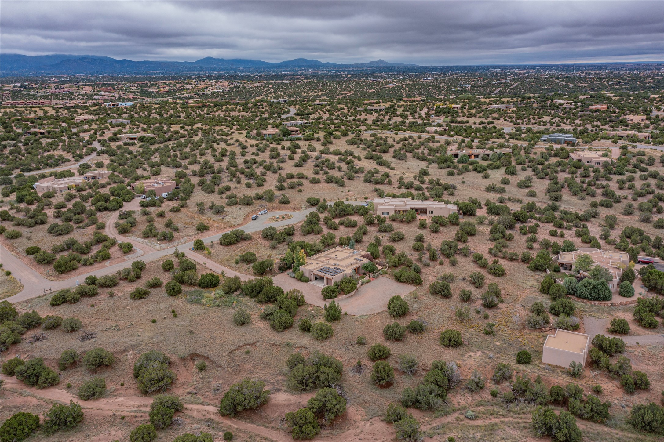 Welcome to this solar property with a desirable floor plan on 2.5 acres, just 16 minutes to The Plaza. This one-owner home offers 3/4 bedrooms. The 4th bedroom is ideal for a den or home office. An ideal home for entertaining. The kitchen opens easily to the living and dining areas. The primary suite has a kiva fireplace and ensuite bath with circular shower and soaking tub. Beautiful pine flooring in all the bedrooms. In-floor radiant heat throughout, including the 3-car garage. Enjoy the mature landscaping on the large portal, complete with a kiva fireplace. This home is pre-inspected and ready for new owners!