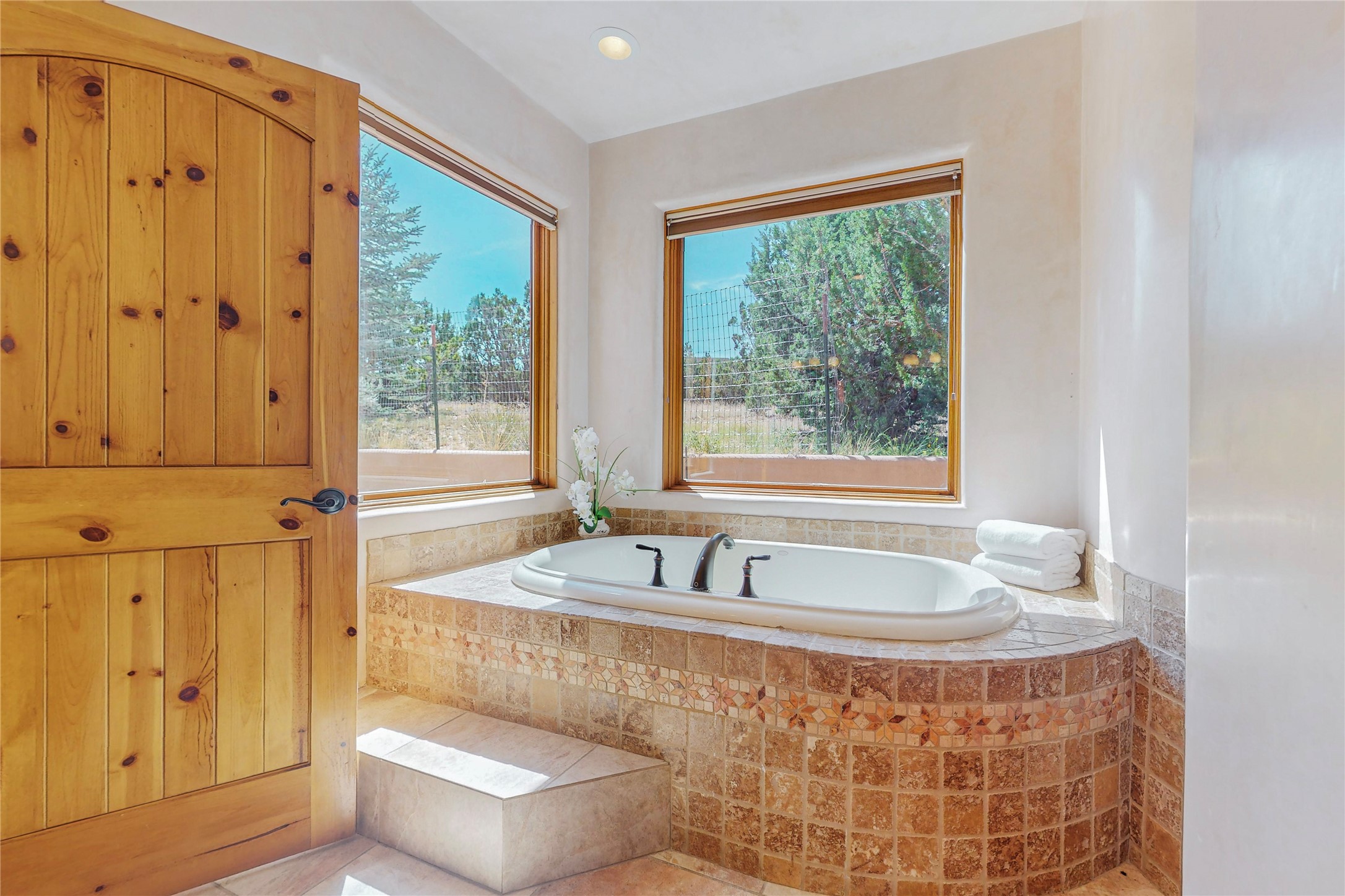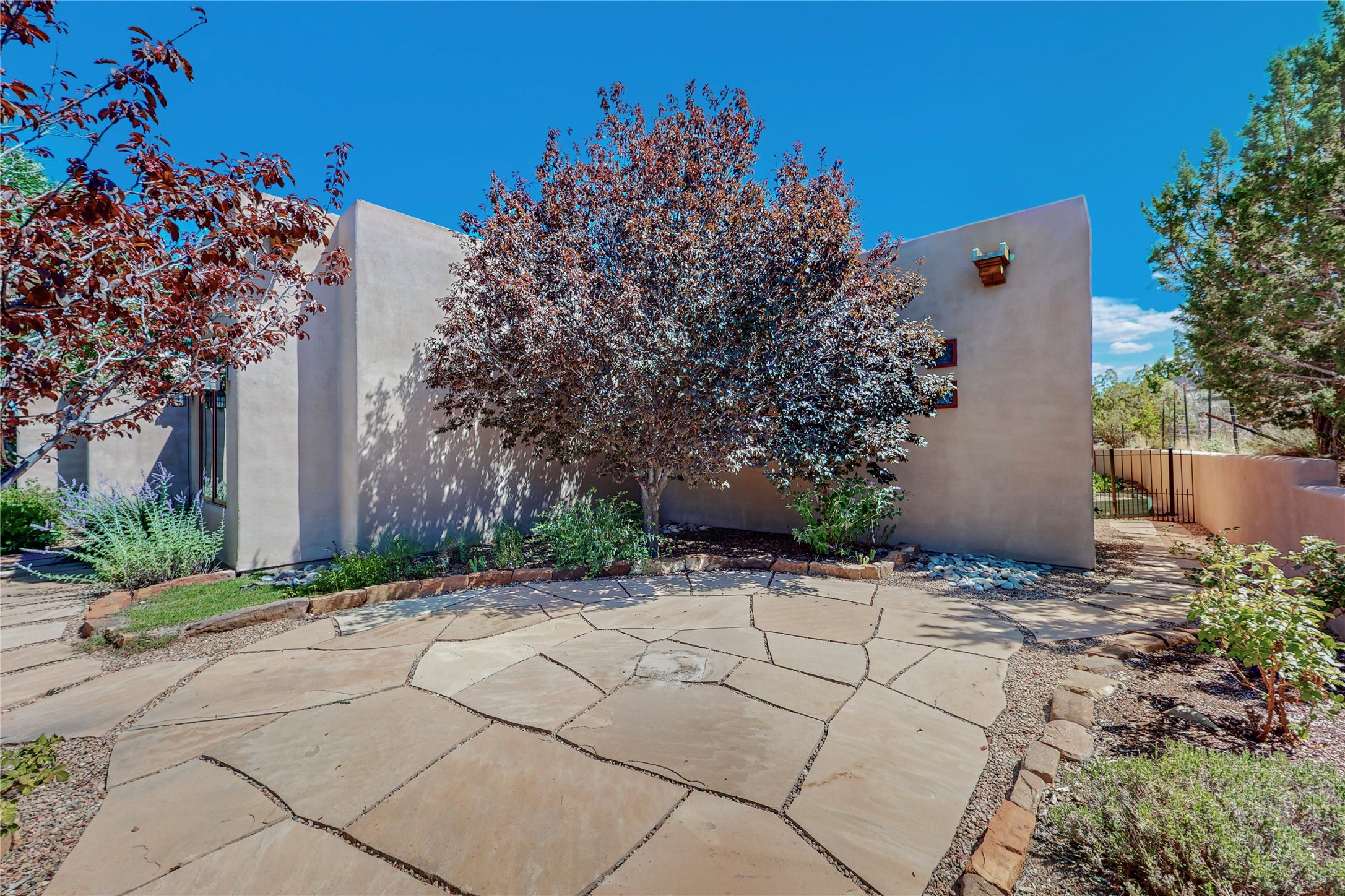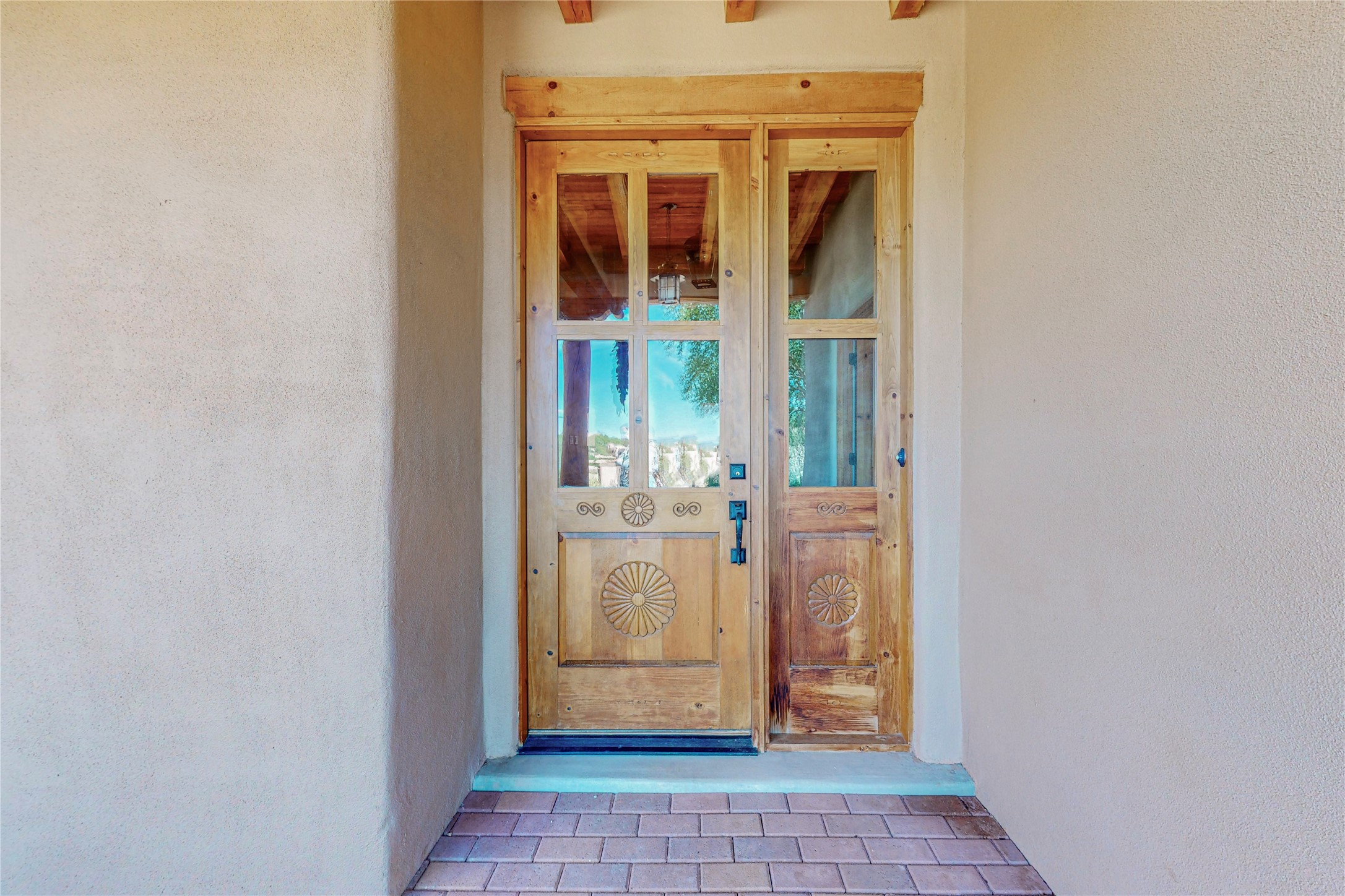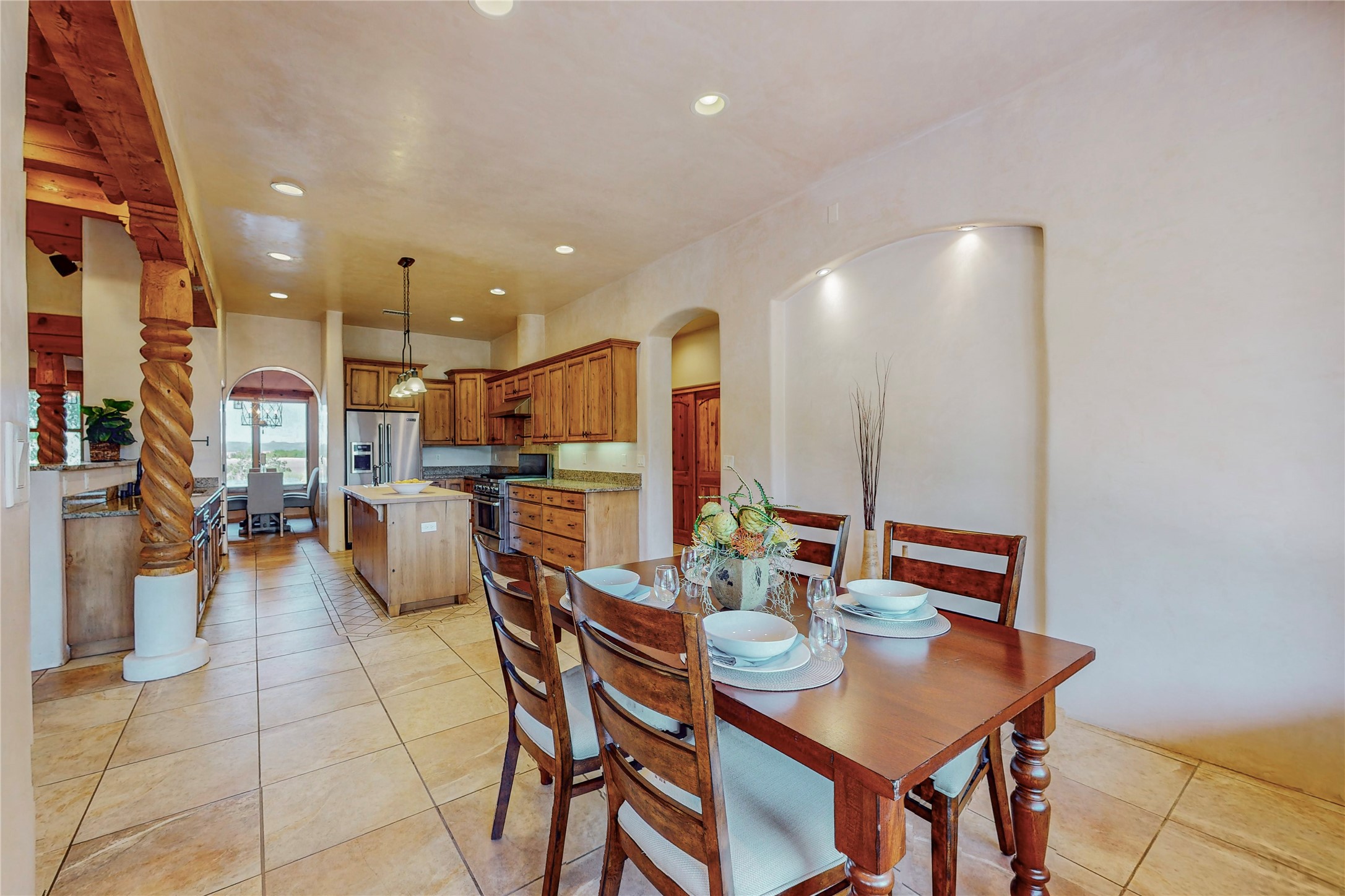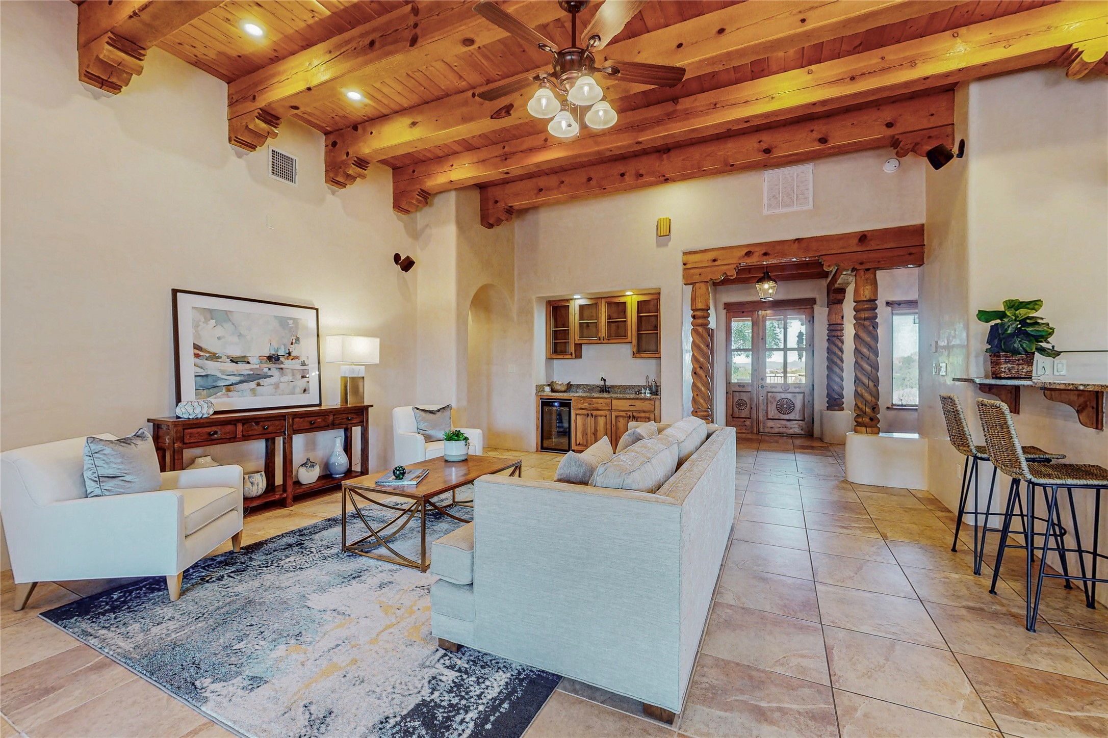 Welcome to this solar property with a desirable floor plan on 2.5 acres, just 16 minutes to The Plaza. This one-owner home offers 3/4 bedrooms. The 4th bedroom is ideal for a den or home office. An ideal home for entertaining. The kitchen opens easily to the living and dining areas. The primary suite has a kiva fireplace and ensuite bath with circular shower and soaking tub. Beautiful pine flooring in all the bedrooms. In-floor radiant heat throughout, including the 3-car garage. Enjoy the mature landscaping on the large portal, complete with a kiva fireplace. This home is pre-inspected and ready for new owners!
