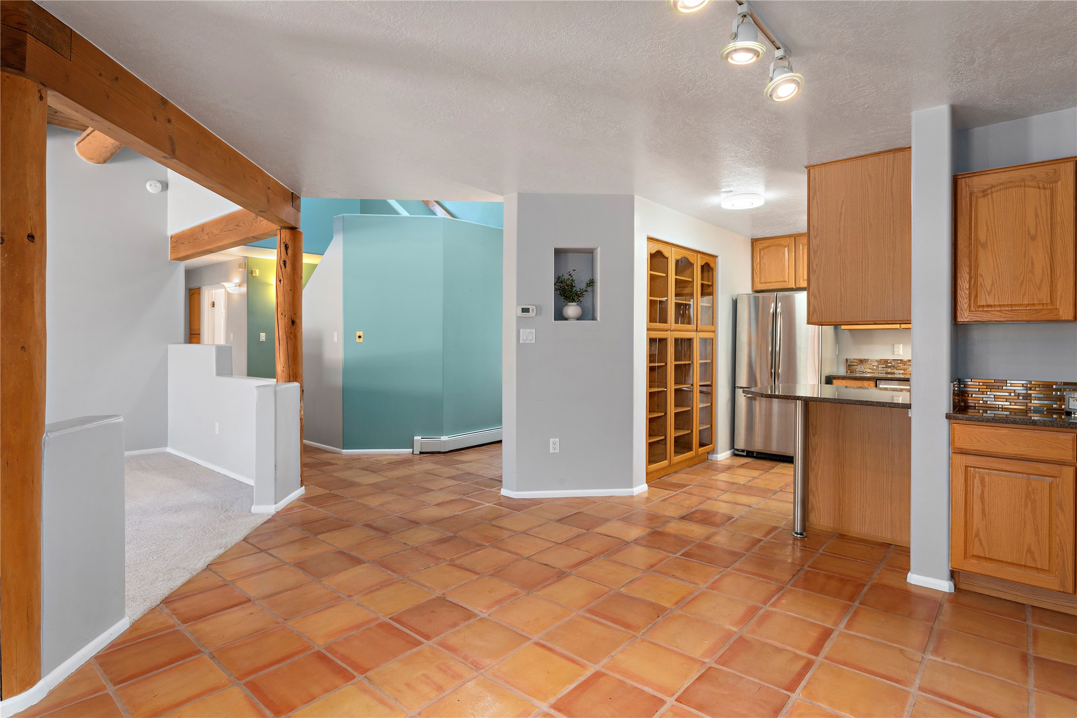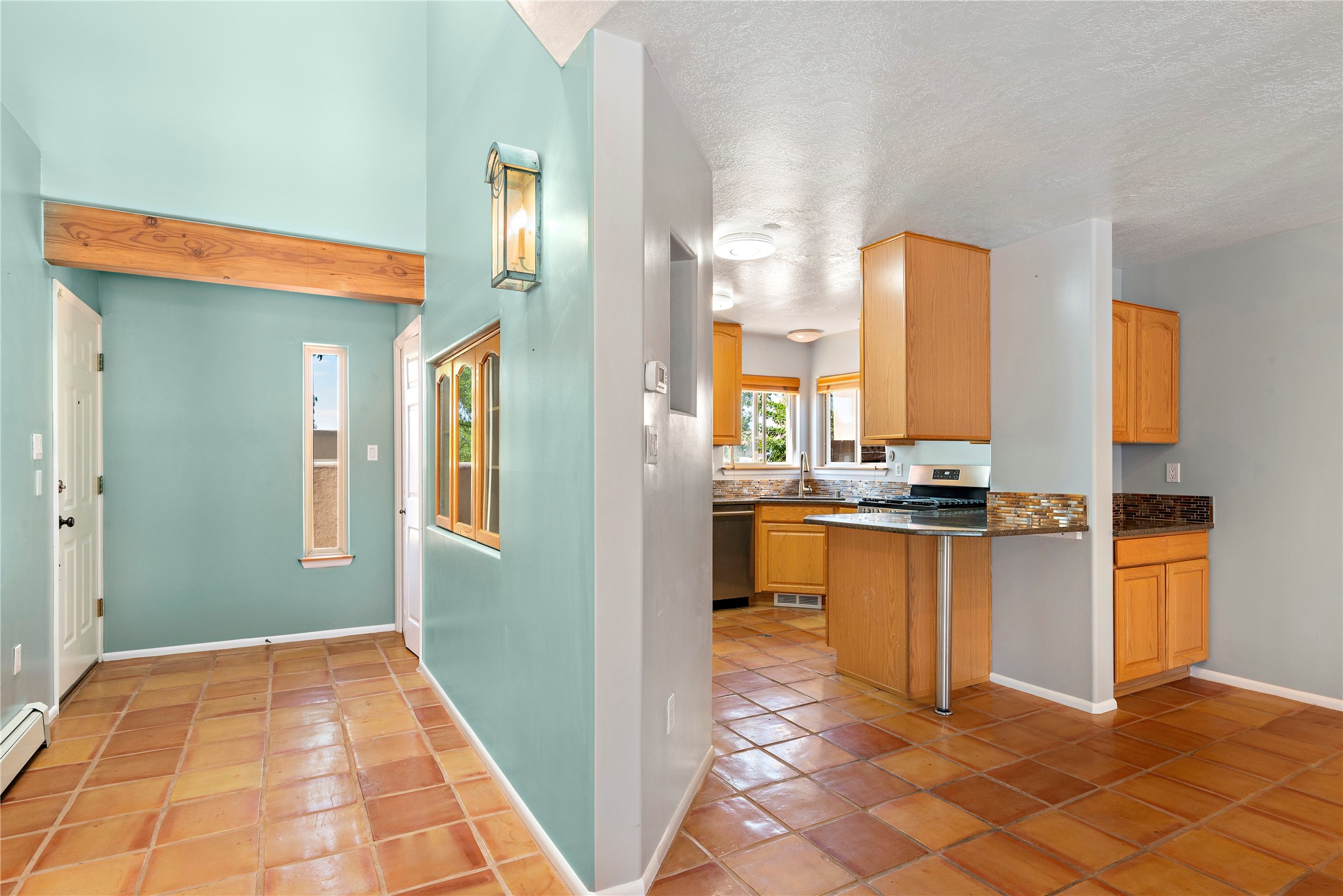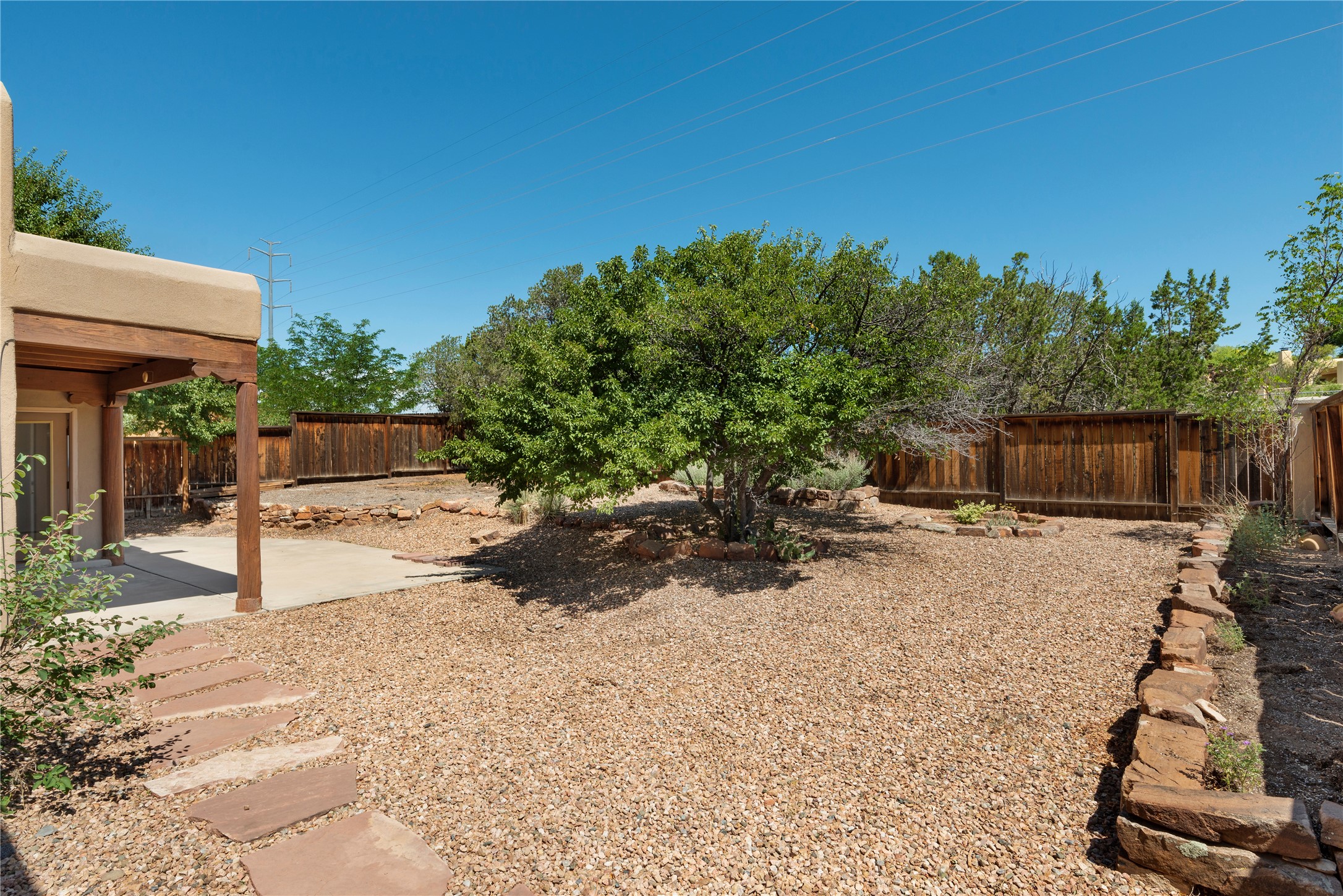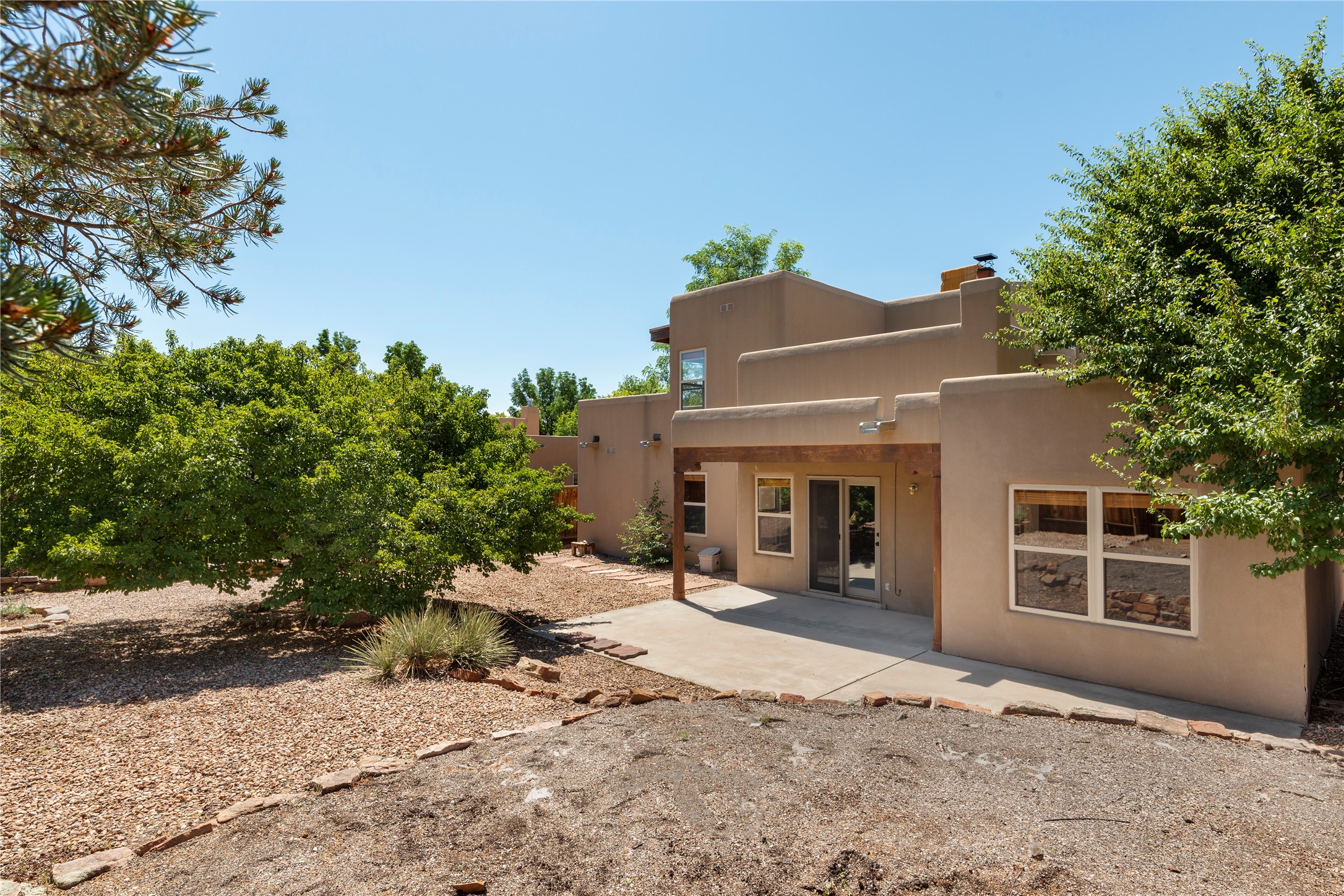 Good cheer abounds in this light-filled, Chapman-built home in Pueblos del Sol. Traditional touches such as Saltillo tile, nichos, a corner kiva and handsome vigas ground the home in Southwestern style, while the tall ceilings and many windows keep the overall feeling light and airy. The tidy kitchen is outfitted with granite countertops, stainless steel appliances, a brand-new gas stove, and plenty of storage. The Primary Suite has a walk-in closet, window seat, and ensuite bath with separate tub and shower. The adjacent office accesses a deck making the upper story a true, private retreat. Low-maintenance landscaping in front and rear includes mature trees and a fully-fenced backyard that backs up to open space. Enhanced with all new carpet, evaporative cooling and many sweet details, this custom home is not-too-close to the highway and near miles of walking trails.