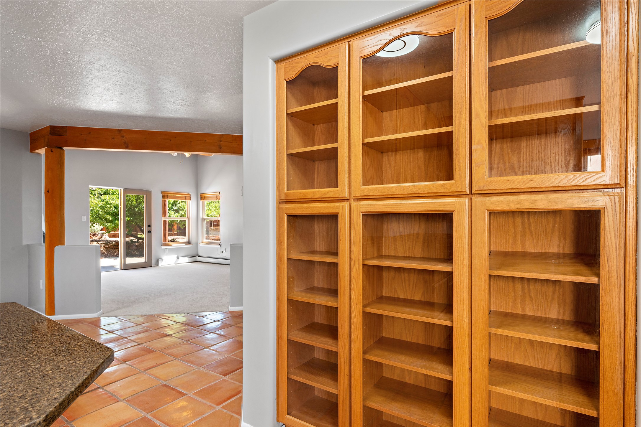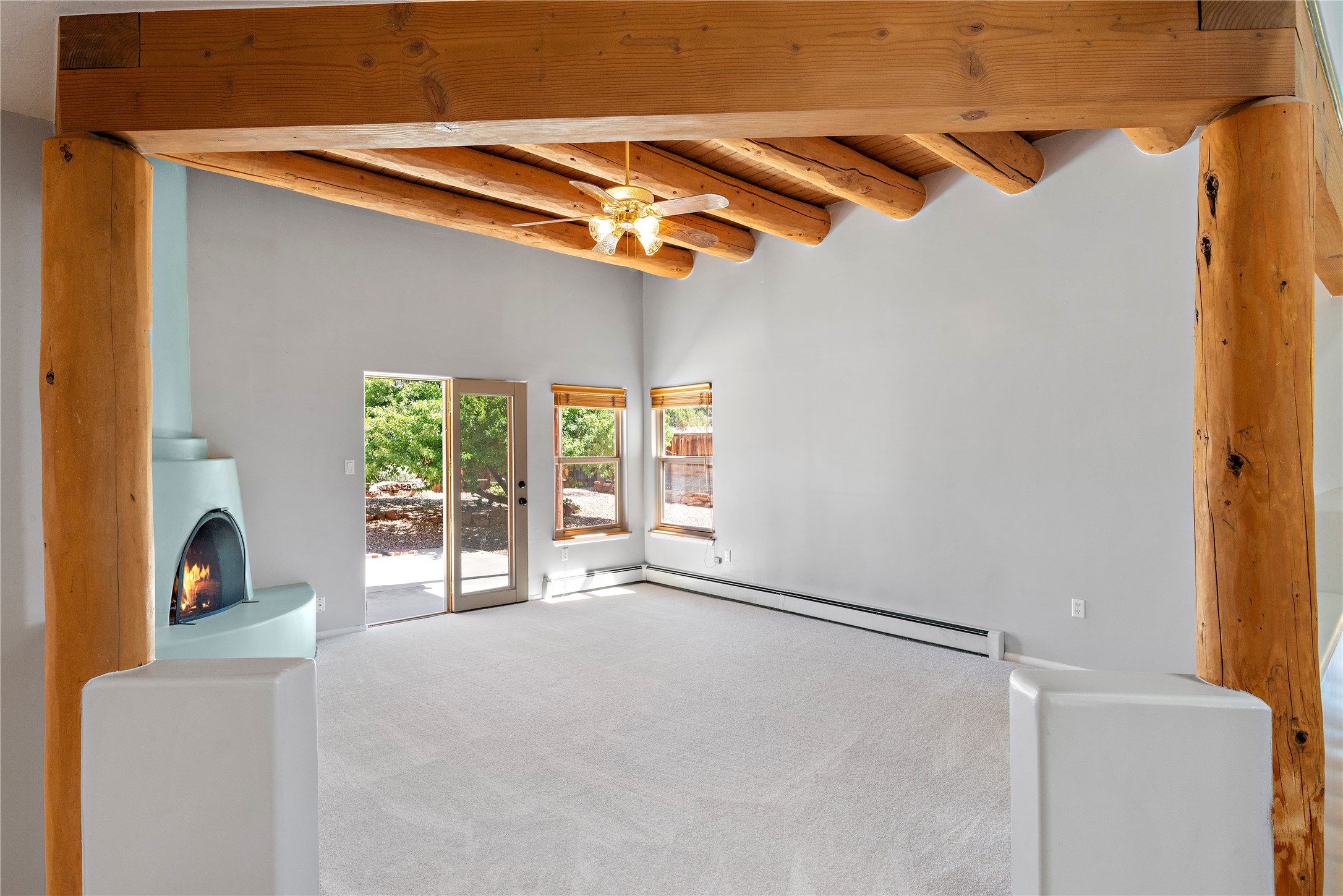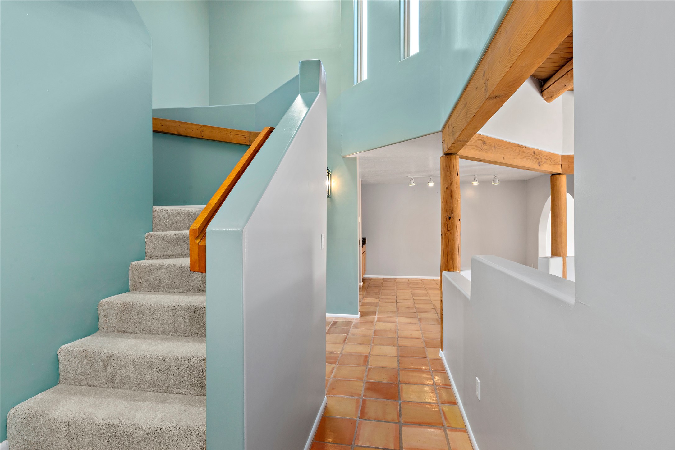 Good cheer abounds in this light-filled, Chapman-built home in Pueblos del Sol. Traditional touches such as Saltillo tile, nichos, a corner kiva and handsome vigas ground the home in Southwestern style, while the tall ceilings and many windows keep the overall feeling light and airy. The tidy kitchen is outfitted with granite countertops, stainless steel appliances, a brand-new gas stove, and plenty of storage. The Primary Suite has a walk-in closet, window seat, and ensuite bath with separate tub and shower. The adjacent office accesses a deck making the upper story a true, private retreat. Low-maintenance landscaping in front and rear includes mature trees and a fully-fenced backyard that backs up to open space. Enhanced with all new carpet, evaporative cooling and many sweet details, this custom home is not-too-close to the highway and near miles of walking trails.