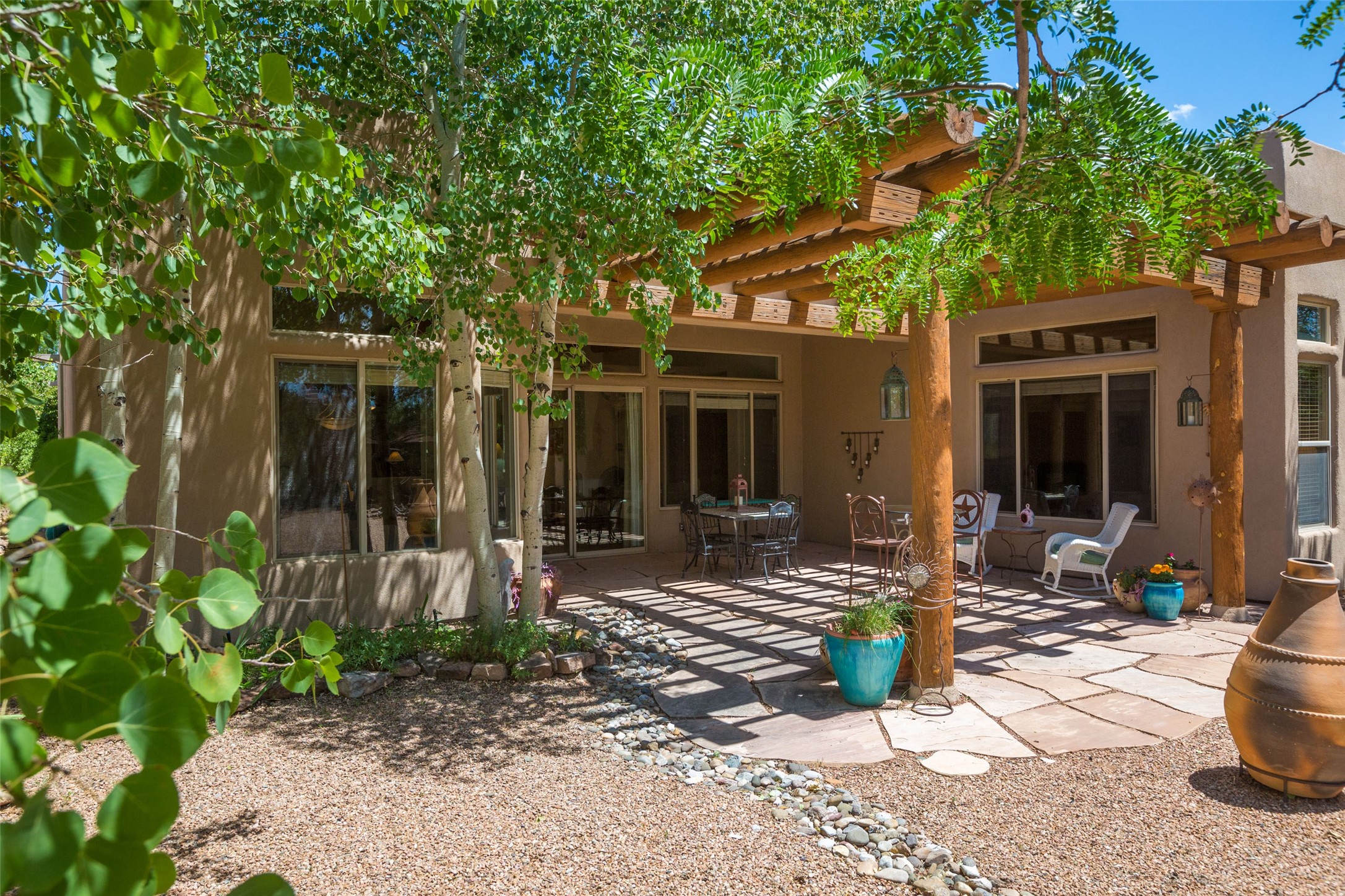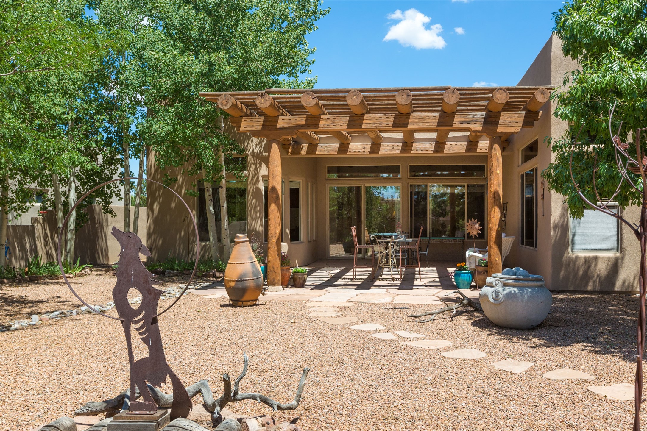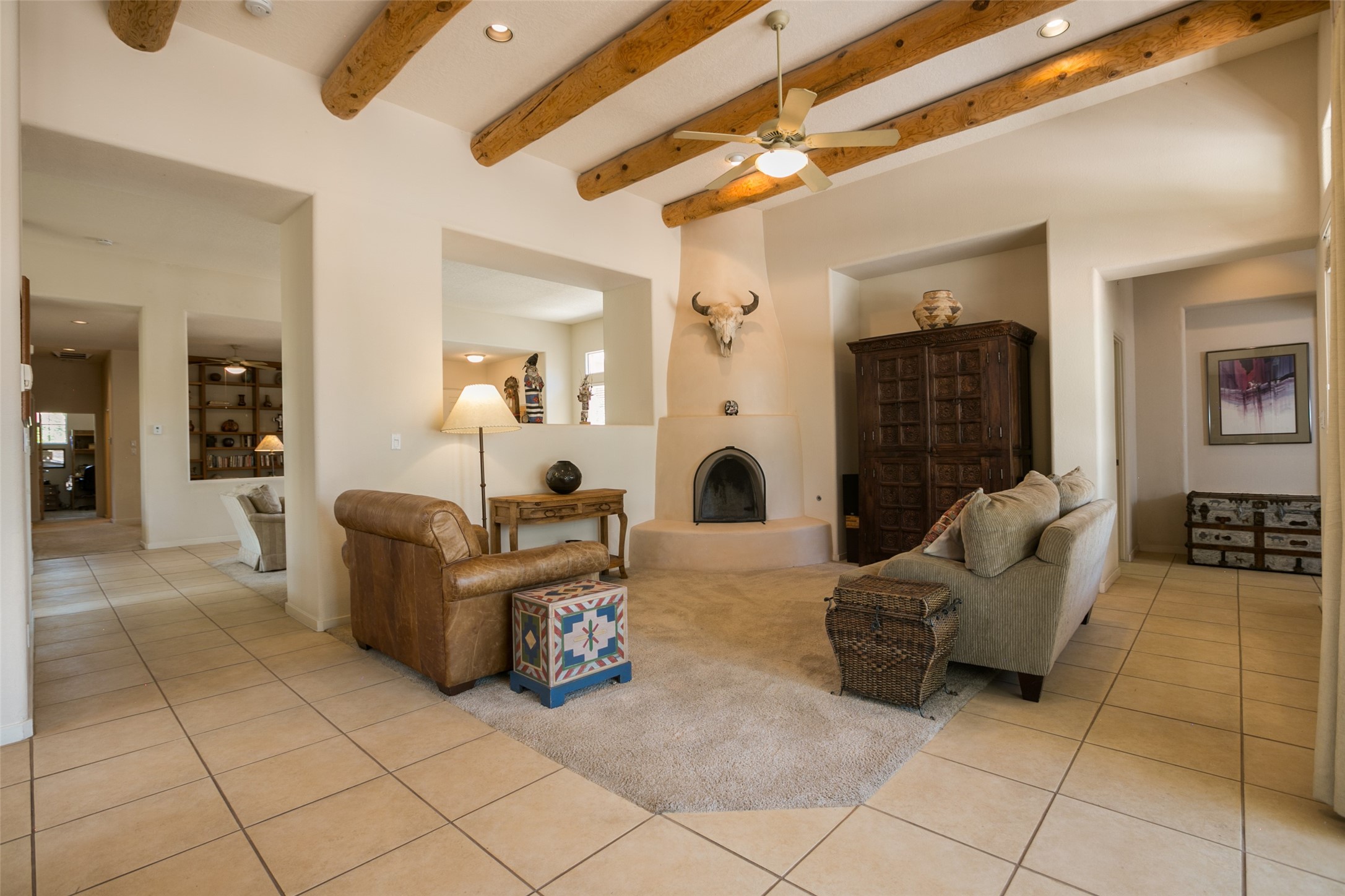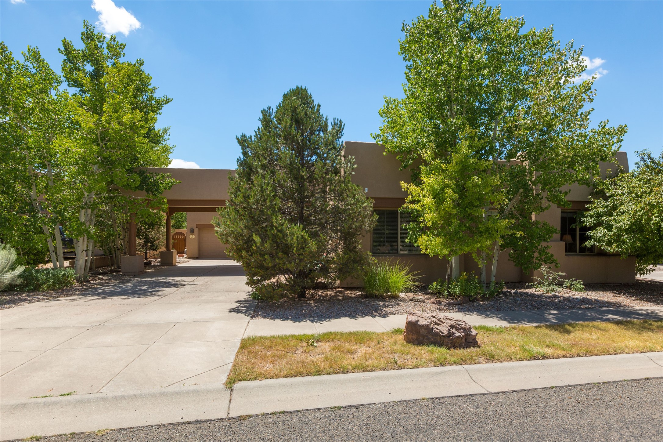 This Chaparral Model home offers an abundance of natural light, soaring 12 ft ceilings, a 4th bedroom with tile floors that could be used as a studio or private office space, mountain views, and high-end finishes throughout. The single-level open floor plan has complete separation of the primary bedroom from all other rooms in the home. The primary suite possesses a gas fireplace, a 17 ft deep walk-in closet with built-in storage from California Closets, a spa-like en-suite bathroom with double vanities, custom tile finishes, an enclosed toilet, garden tub, and a spacious walk-in shower. There is a formal living room, formal dining room, library with custom-made floor-to-ceiling bookcases, den/family room, kitchen island with seating for intimate meals, a large breakfast nook, and a laundry room with extra cabinets and storage. The Chef's kitchen is equipped with ample counter space and cabinets for storage, a large pantry, a built-in desk area, and some newer appliances. The kitchen opens up to the den/family room which features a wood-burning Kiva fireplace and a wall of windows inviting you to step outside. The amazing flagstone patio and the covered portal were custom designed with large vigas and corbels to replicate the ones found at the La Fonda Hotel. This very private and oversized lot was professionally landscaped with Aspen and Pine trees and native plants and has a new irrigation system. This home has 2 separate evaporative cooling systems and radiant heat. The residents of the Rancho Viejo community enjoy many miles of paved trails through the preserved, natural open space which provides expansive mountain views for walking and biking, plus 6 neighborhood parks with play equipment. Don't miss this true gem!