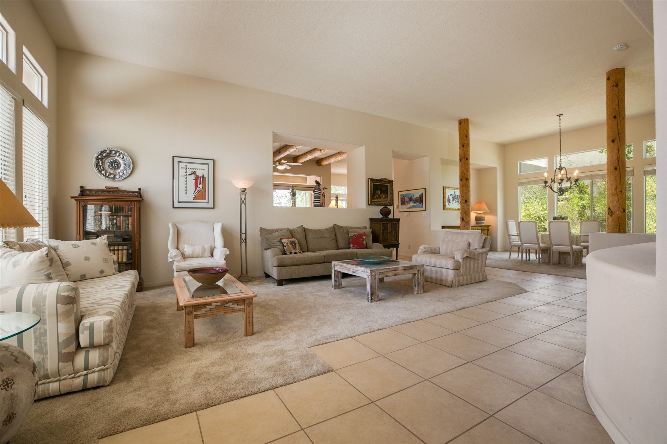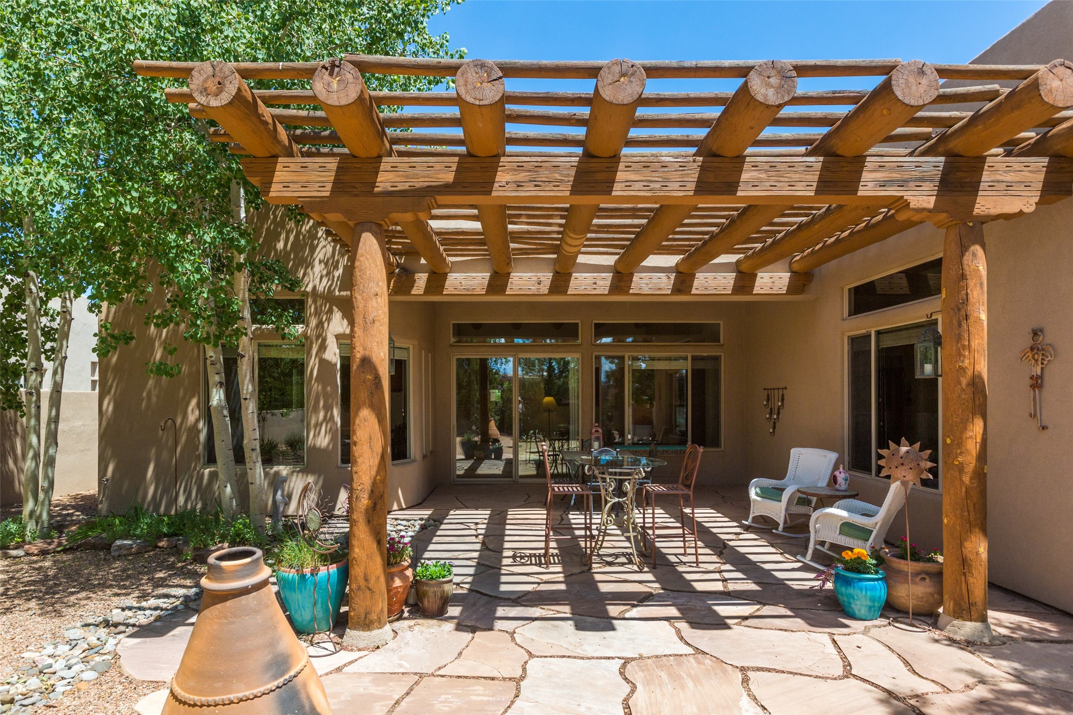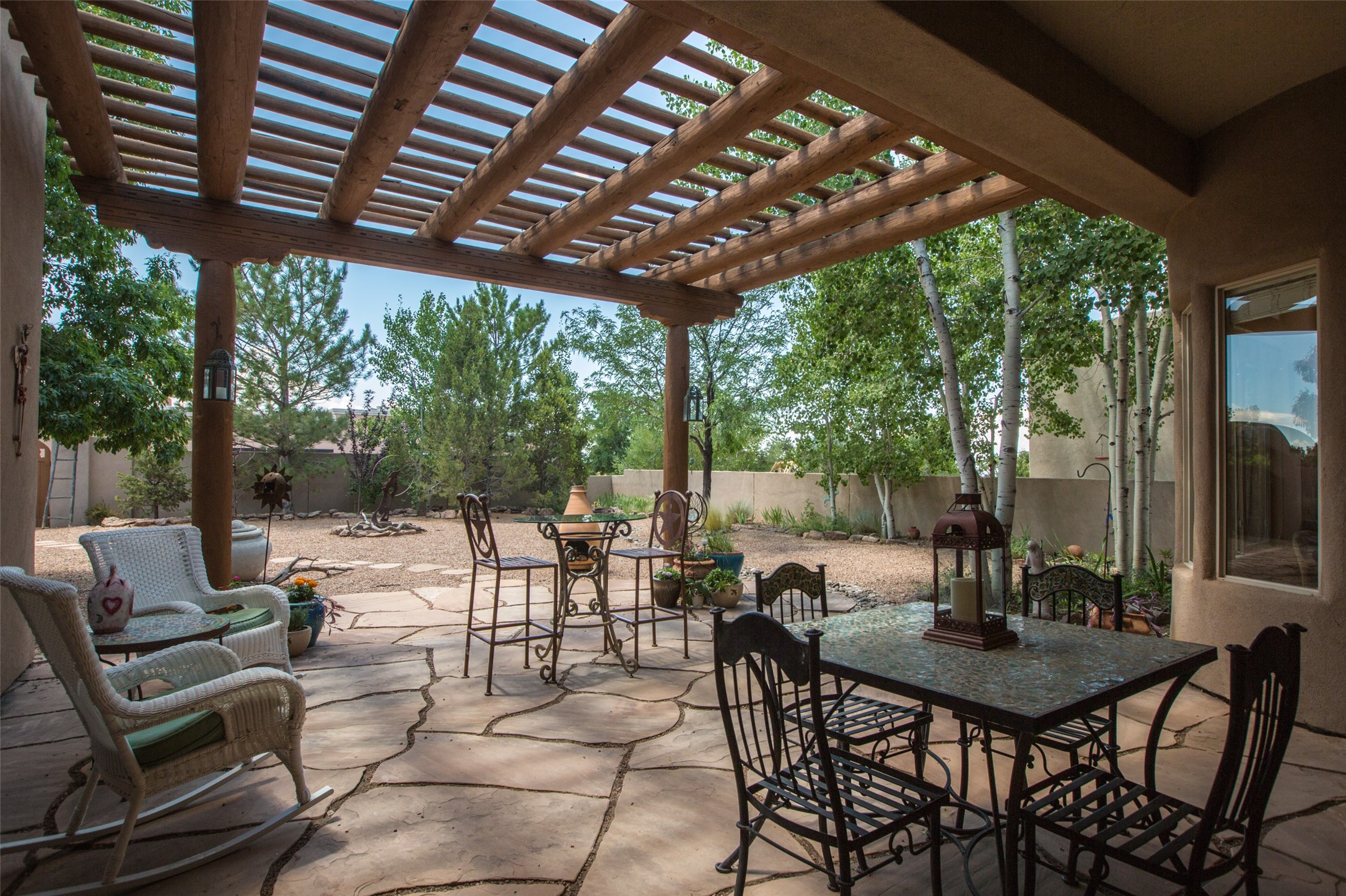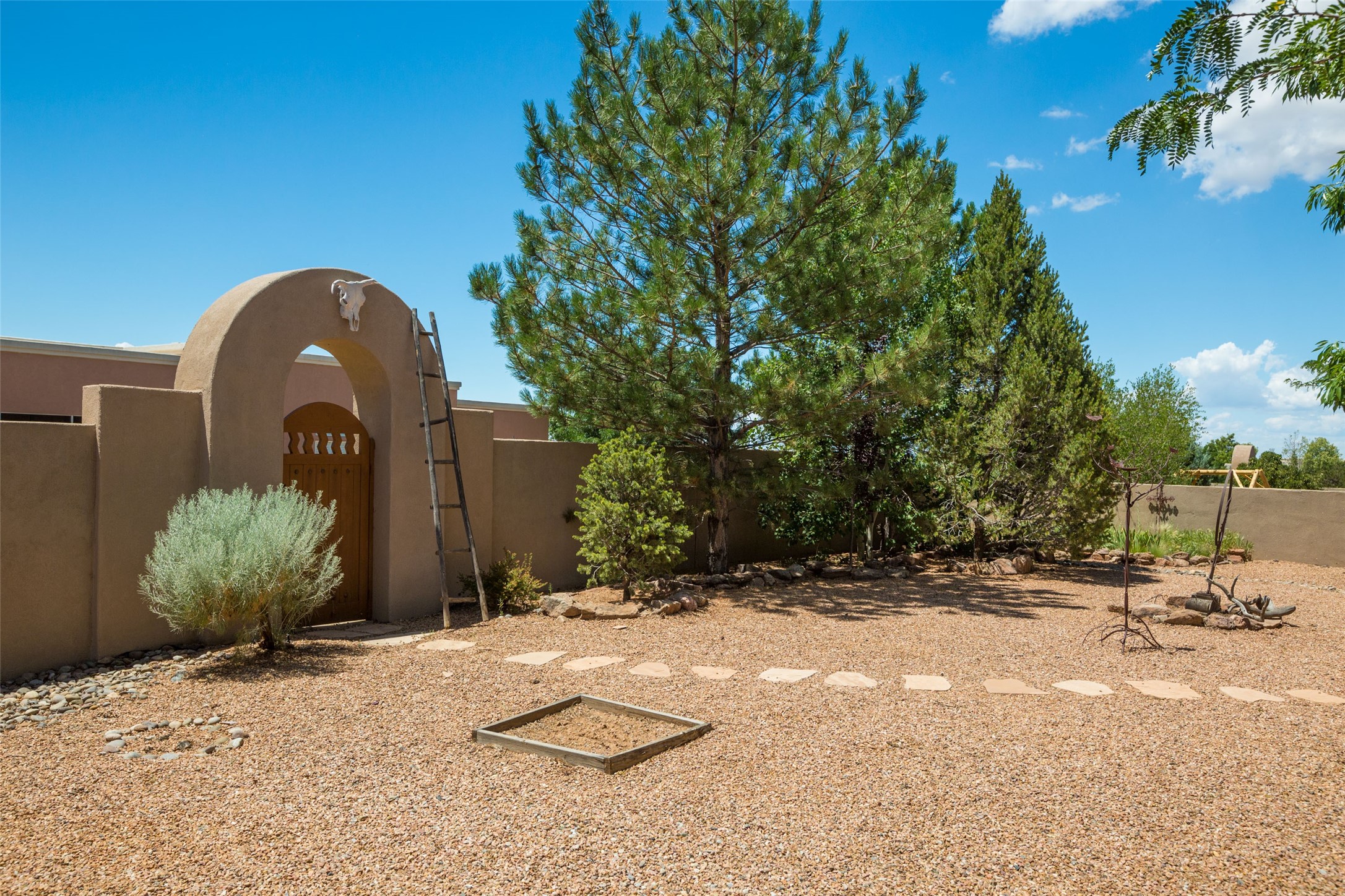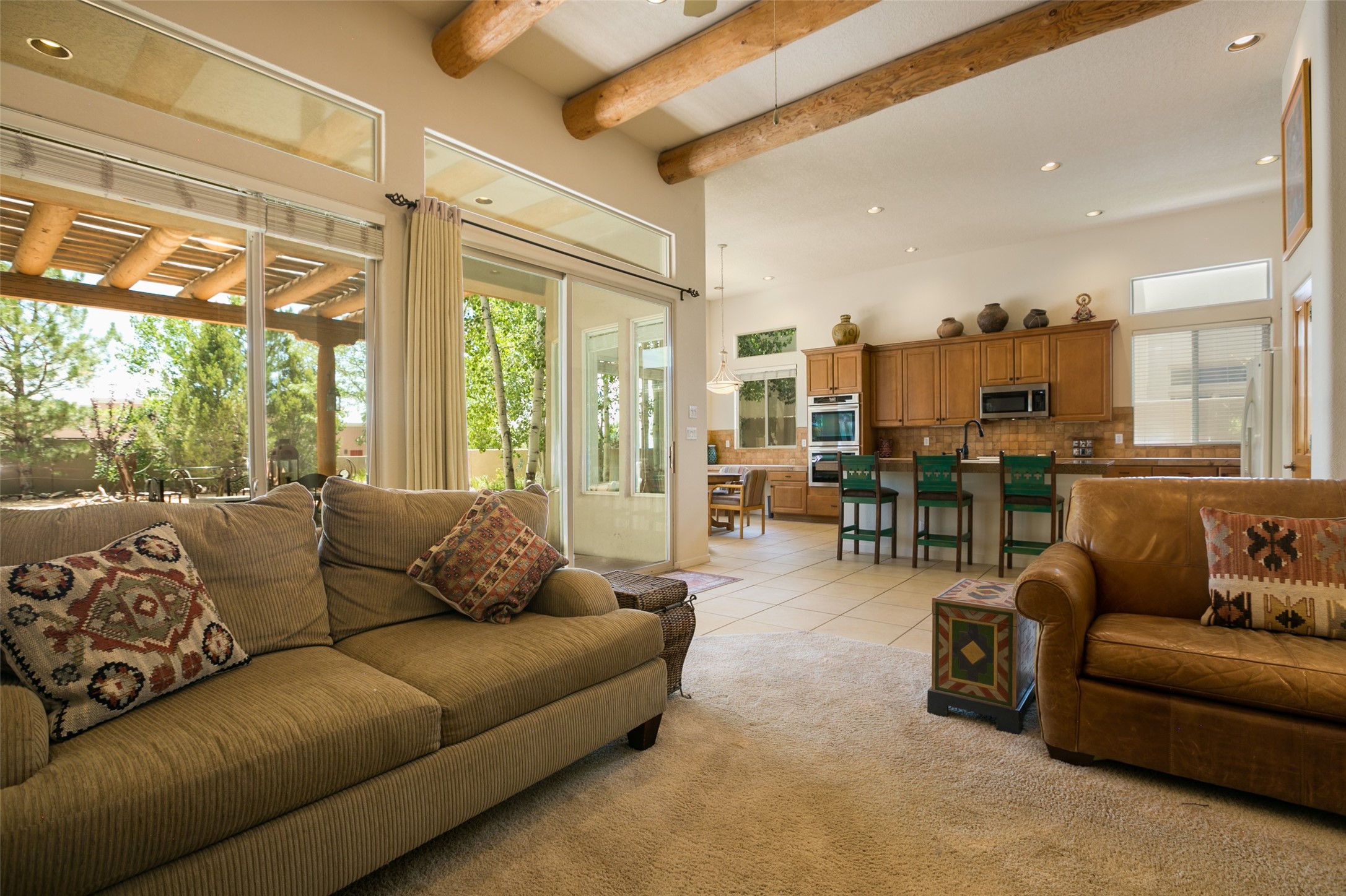 This Chaparral Model home offers an abundance of natural light, soaring 12 ft ceilings, a 4th bedroom with tile floors that could be used as a studio or private office space, mountain views, and high-end finishes throughout. The single-level open floor plan has complete separation of the primary bedroom from all other rooms in the home. The primary suite possesses a gas fireplace, a 17 ft deep walk-in closet with built-in storage from California Closets, a spa-like en-suite bathroom with double vanities, custom tile finishes, an enclosed toilet, garden tub, and a spacious walk-in shower. There is a formal living room, formal dining room, library with custom-made floor-to-ceiling bookcases, den/family room, kitchen island with seating for intimate meals, a large breakfast nook, and a laundry room with extra cabinets and storage. The Chef's kitchen is equipped with ample counter space and cabinets for storage, a large pantry, a built-in desk area, and some newer appliances. The kitchen opens up to the den/family room which features a wood-burning Kiva fireplace and a wall of windows inviting you to step outside. The amazing flagstone patio and the covered portal were custom designed with large vigas and corbels to replicate the ones found at the La Fonda Hotel. This very private and oversized lot was professionally landscaped with Aspen and Pine trees and native plants and has a new irrigation system. This home has 2 separate evaporative cooling systems and radiant heat. The residents of the Rancho Viejo community enjoy many miles of paved trails through the preserved, natural open space which provides expansive mountain views for walking and biking, plus 6 neighborhood parks with play equipment. Don't miss this true gem!