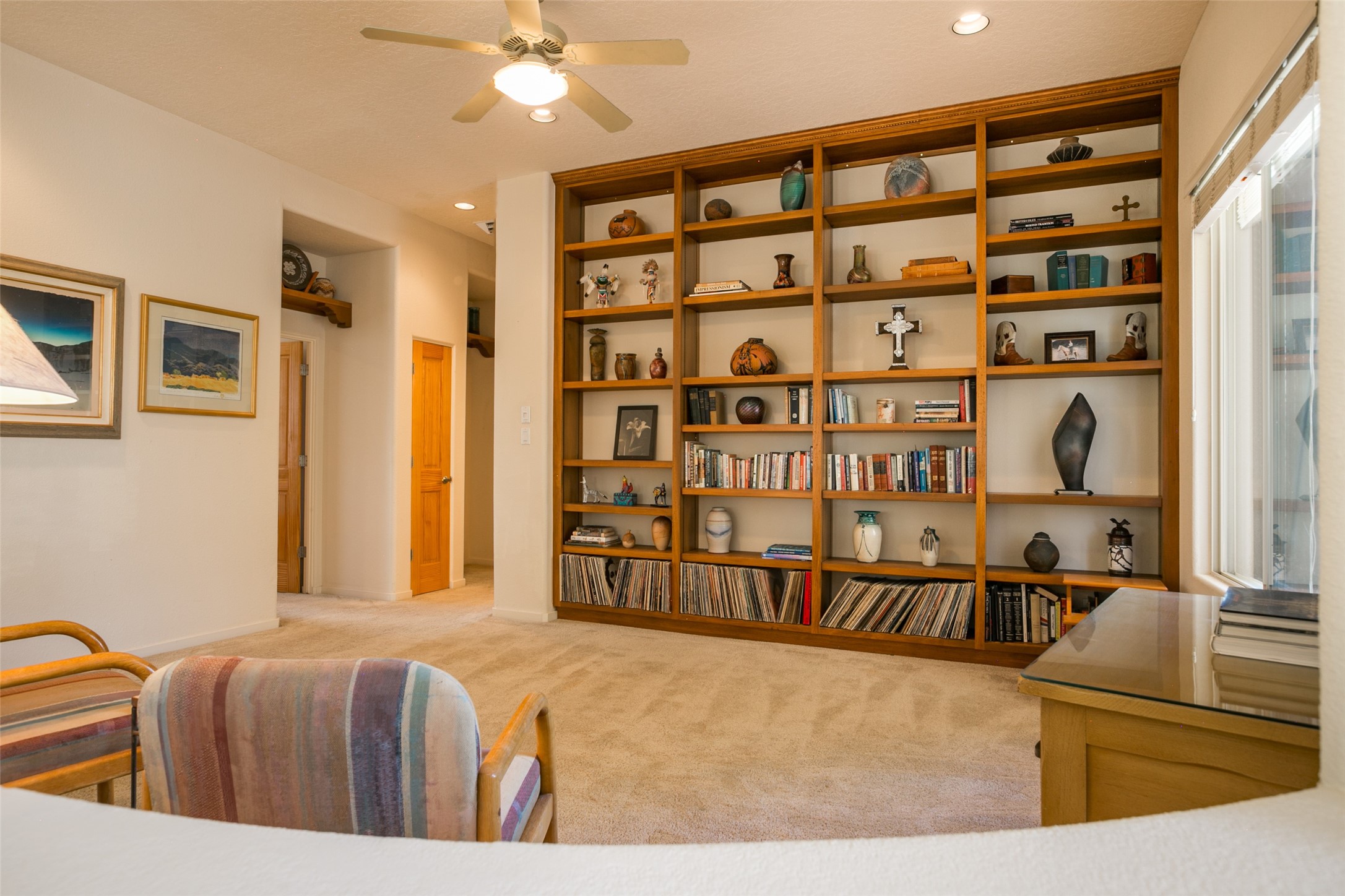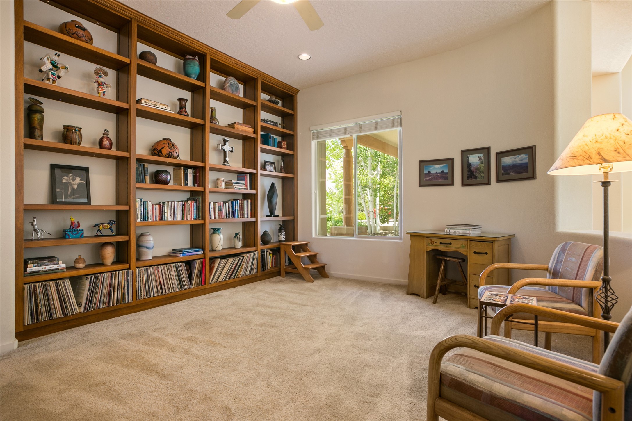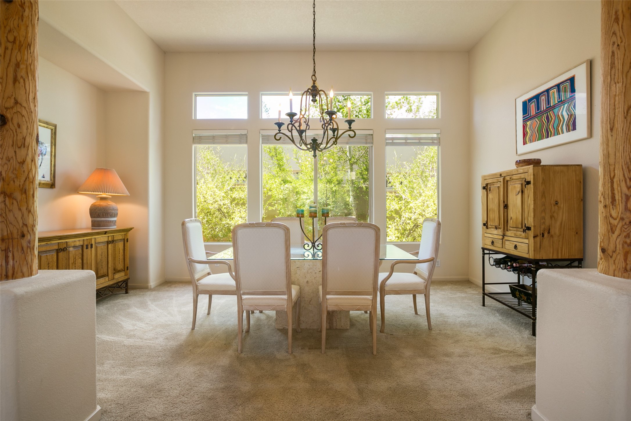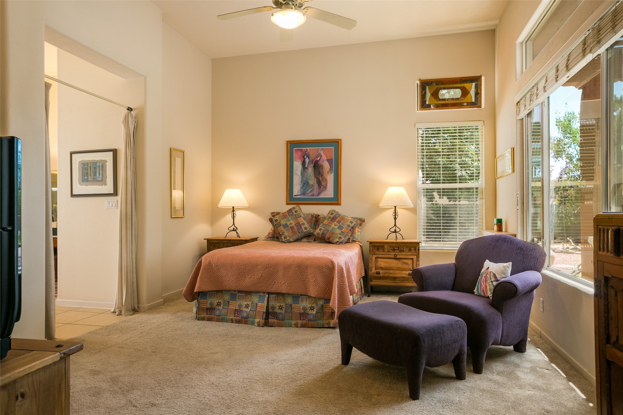 This Chaparral Model home offers an abundance of natural light, soaring 12 ft ceilings, a 4th bedroom with tile floors that could be used as a studio or private office space, mountain views, and high-end finishes throughout. The single-level open floor plan has complete separation of the primary bedroom from all other rooms in the home. The primary suite possesses a gas fireplace, a 17 ft deep walk-in closet with built-in storage from California Closets, a spa-like en-suite bathroom with double vanities, custom tile finishes, an enclosed toilet, garden tub, and a spacious walk-in shower. There is a formal living room, formal dining room, library with custom-made floor-to-ceiling bookcases, den/family room, kitchen island with seating for intimate meals, a large breakfast nook, and a laundry room with extra cabinets and storage. The Chef's kitchen is equipped with ample counter space and cabinets for storage, a large pantry, a built-in desk area, and some newer appliances. The kitchen opens up to the den/family room which features a wood-burning Kiva fireplace and a wall of windows inviting you to step outside. The amazing flagstone patio and the covered portal were custom designed with large vigas and corbels to replicate the ones found at the La Fonda Hotel. This very private and oversized lot was professionally landscaped with Aspen and Pine trees and native plants and has a new irrigation system. This home has 2 separate evaporative cooling systems and radiant heat. The residents of the Rancho Viejo community enjoy many miles of paved trails through the preserved, natural open space which provides expansive mountain views for walking and biking, plus 6 neighborhood parks with play equipment. Don't miss this true gem!