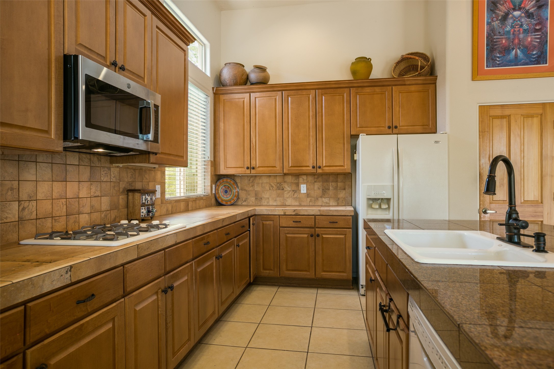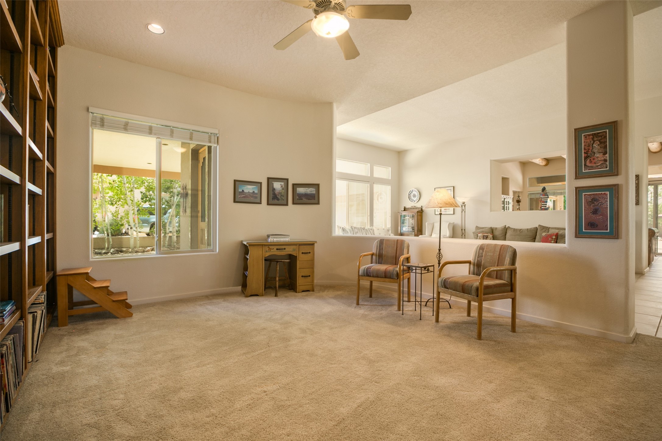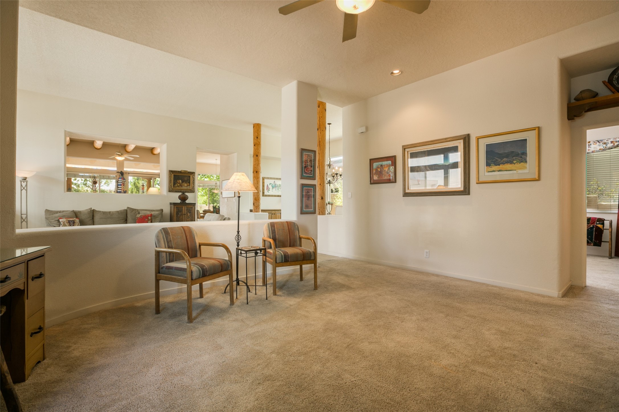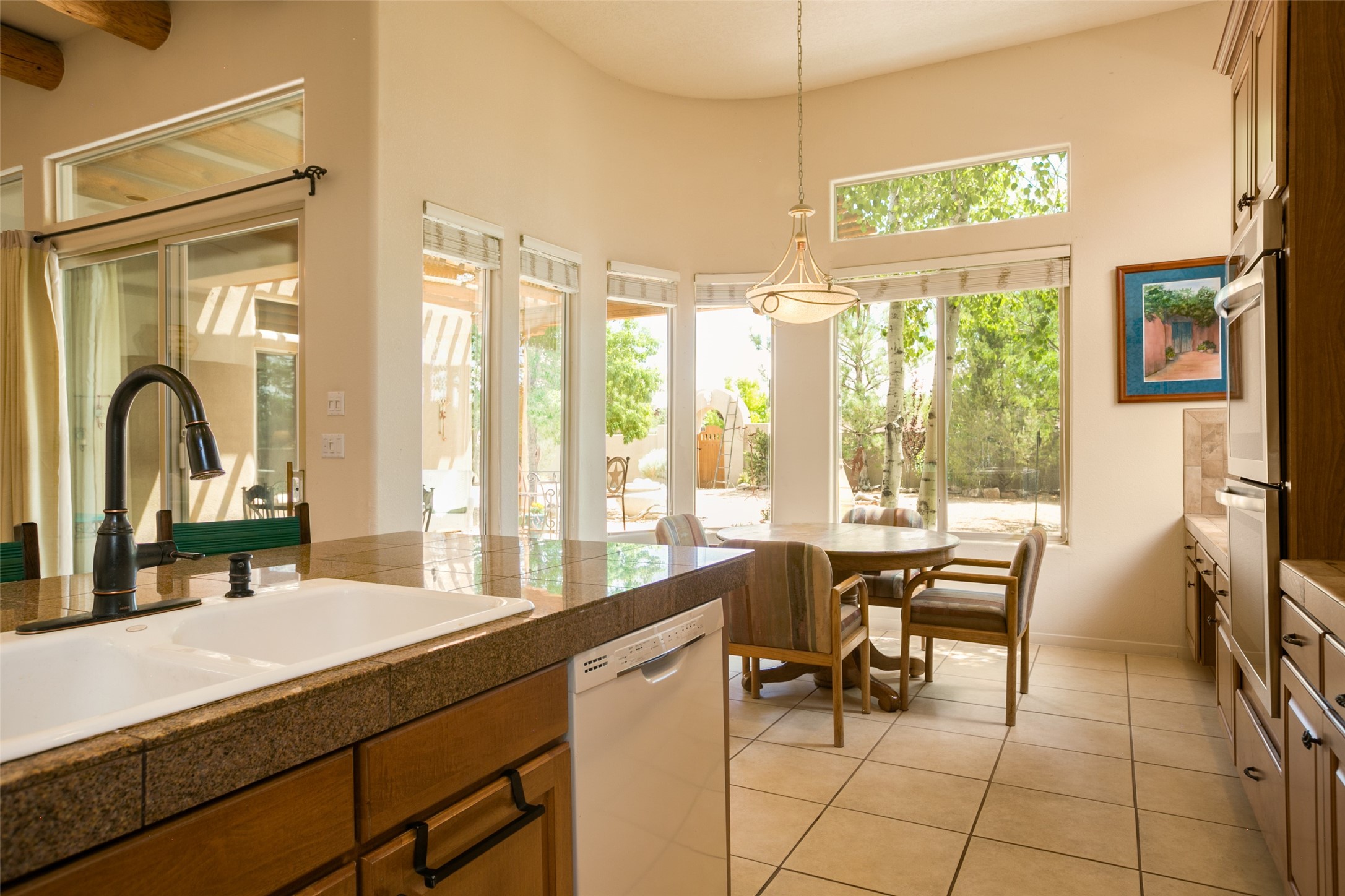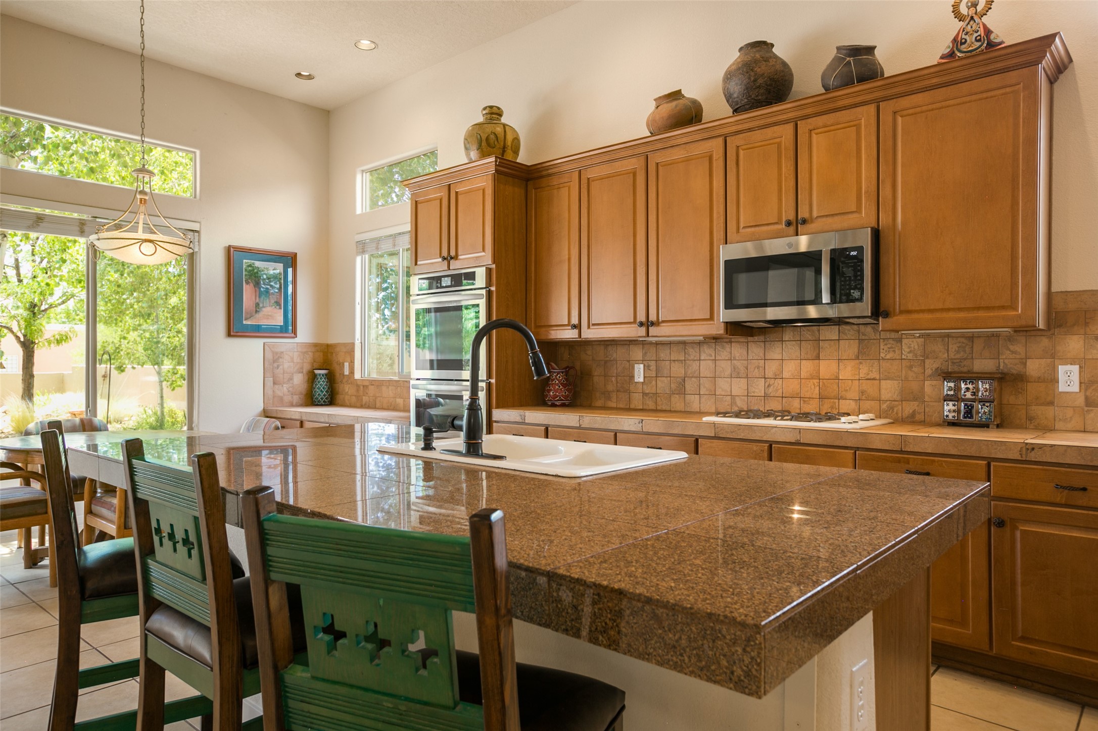 This Chaparral Model home offers an abundance of natural light, soaring 12 ft ceilings, a 4th bedroom with tile floors that could be used as a studio or private office space, mountain views, and high-end finishes throughout. The single-level open floor plan has complete separation of the primary bedroom from all other rooms in the home. The primary suite possesses a gas fireplace, a 17 ft deep walk-in closet with built-in storage from California Closets, a spa-like en-suite bathroom with double vanities, custom tile finishes, an enclosed toilet, garden tub, and a spacious walk-in shower. There is a formal living room, formal dining room, library with custom-made floor-to-ceiling bookcases, den/family room, kitchen island with seating for intimate meals, a large breakfast nook, and a laundry room with extra cabinets and storage. The Chef's kitchen is equipped with ample counter space and cabinets for storage, a large pantry, a built-in desk area, and some newer appliances. The kitchen opens up to the den/family room which features a wood-burning Kiva fireplace and a wall of windows inviting you to step outside. The amazing flagstone patio and the covered portal were custom designed with large vigas and corbels to replicate the ones found at the La Fonda Hotel. This very private and oversized lot was professionally landscaped with Aspen and Pine trees and native plants and has a new irrigation system. This home has 2 separate evaporative cooling systems and radiant heat. The residents of the Rancho Viejo community enjoy many miles of paved trails through the preserved, natural open space which provides expansive mountain views for walking and biking, plus 6 neighborhood parks with play equipment. Don't miss this true gem!