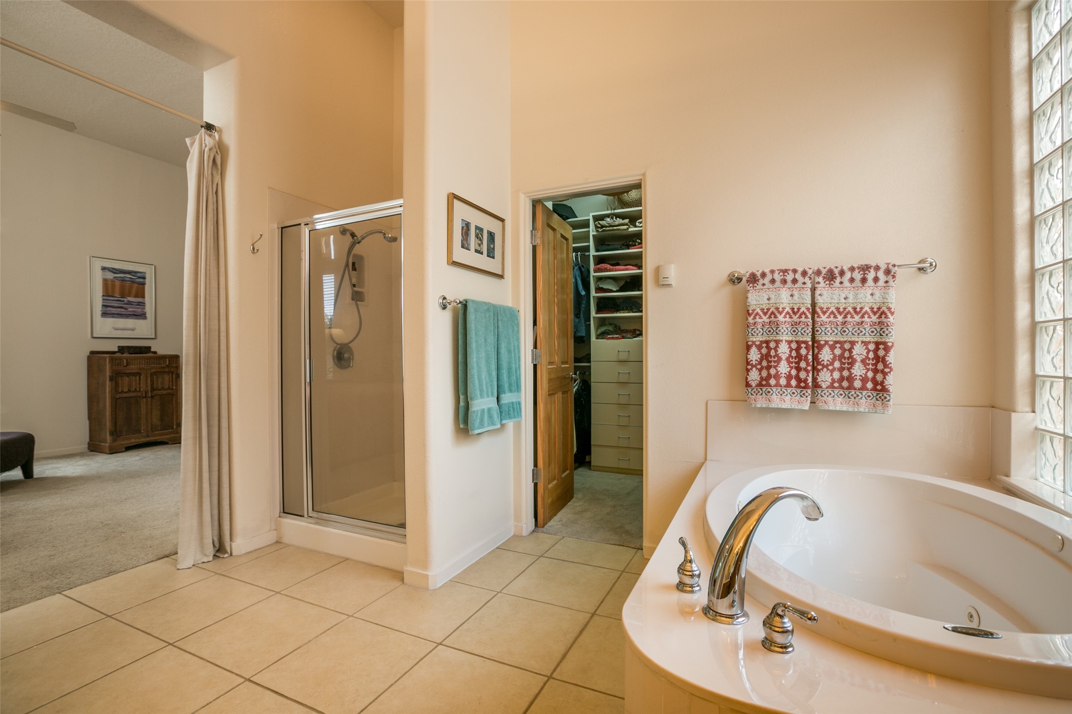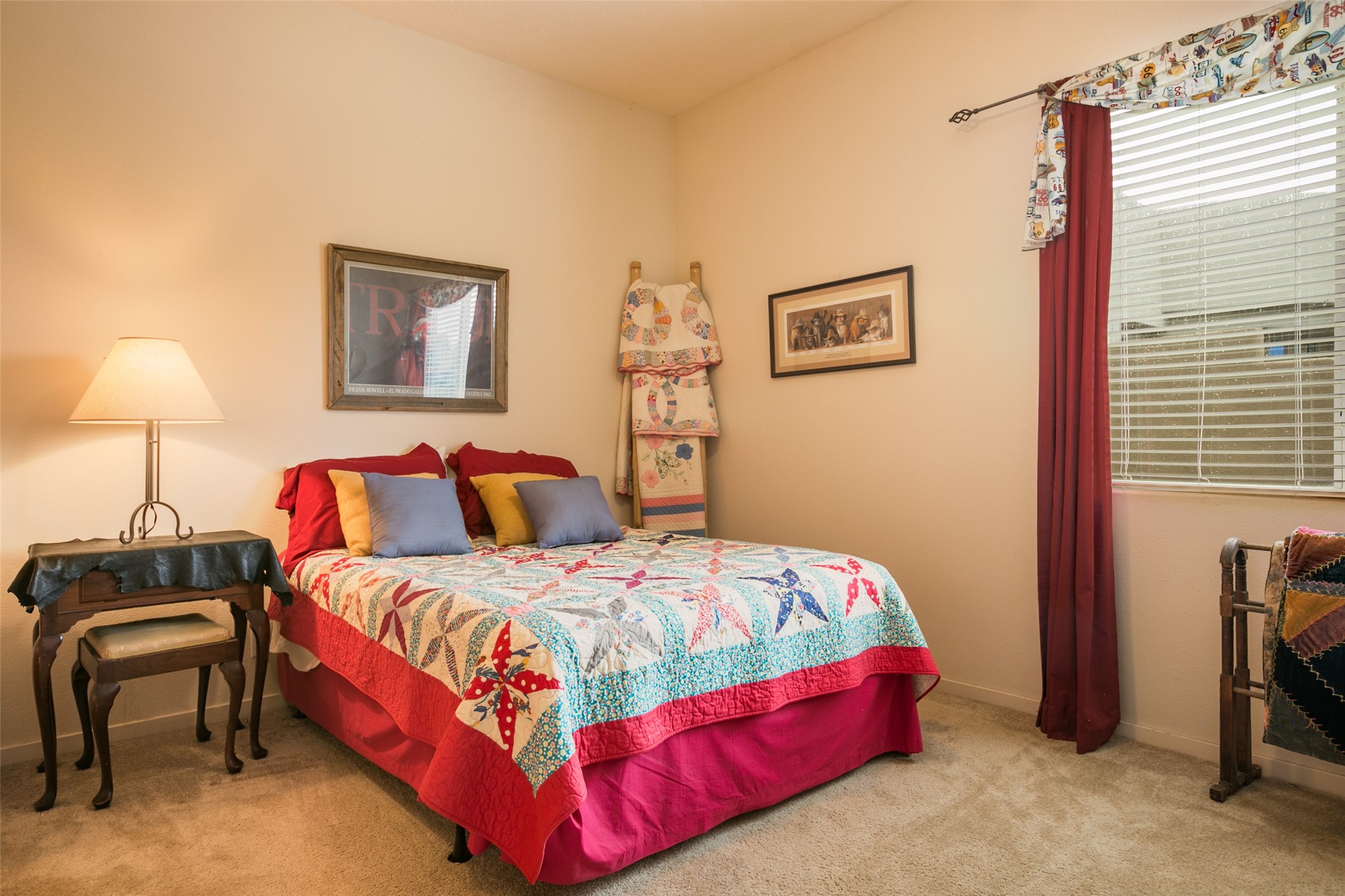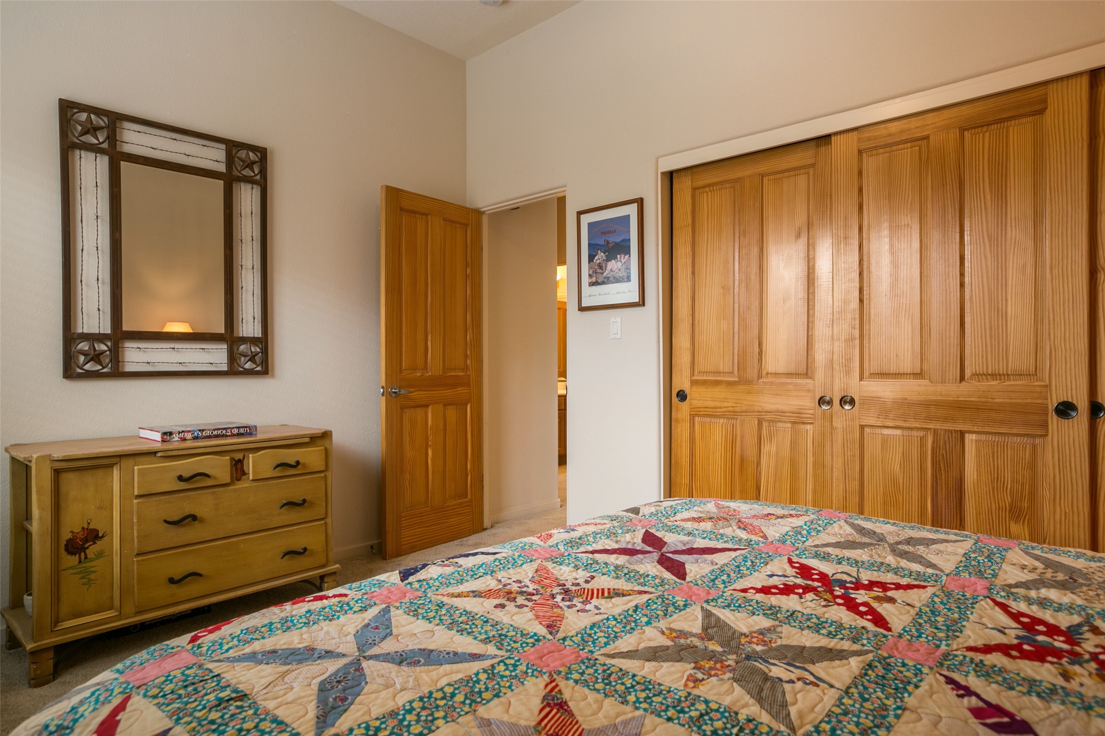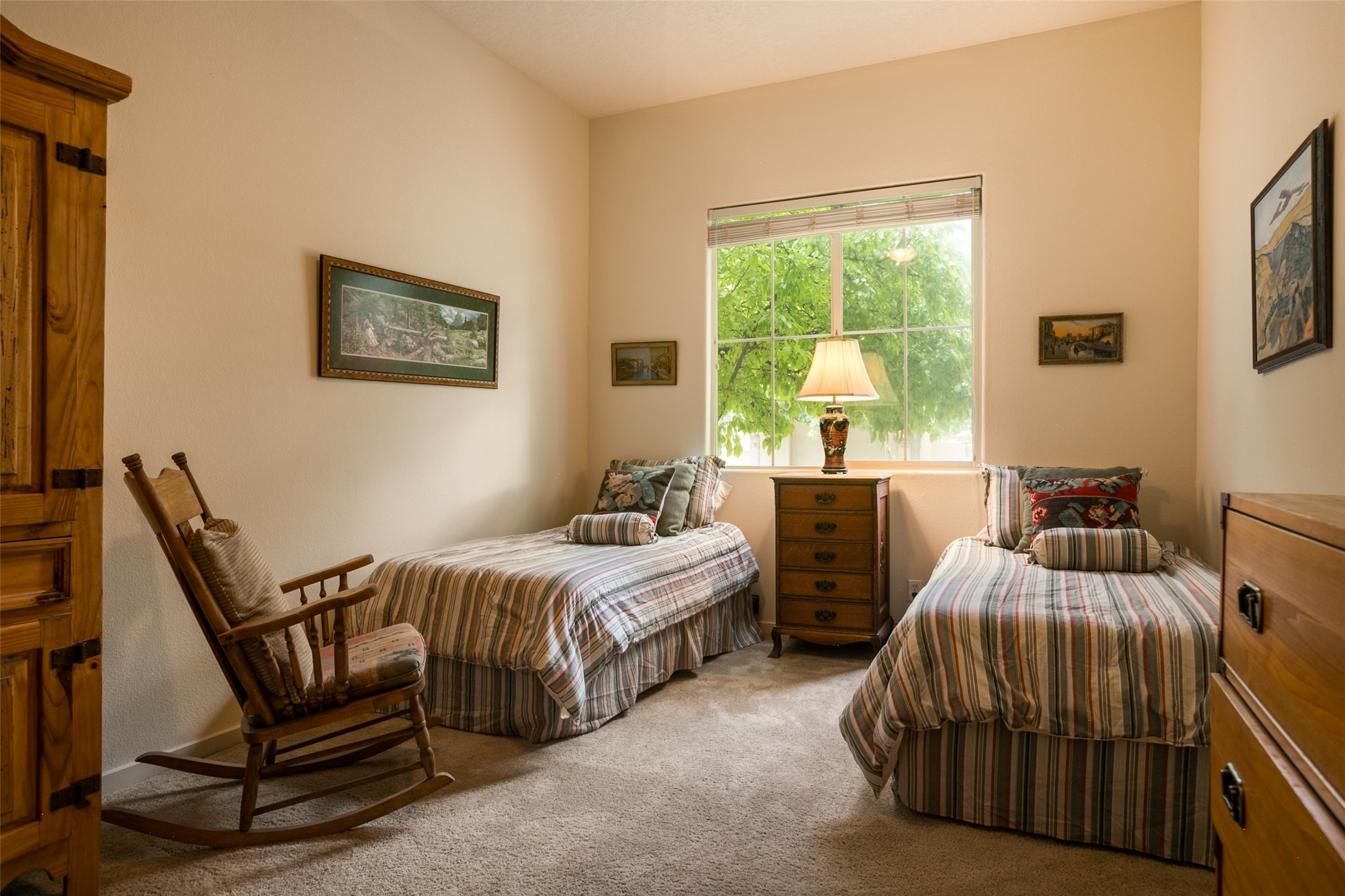 This Chaparral Model home offers an abundance of natural light, soaring 12 ft ceilings, a 4th bedroom with tile floors that could be used as a studio or private office space, mountain views, and high-end finishes throughout. The single-level open floor plan has complete separation of the primary bedroom from all other rooms in the home. The primary suite possesses a gas fireplace, a 17 ft deep walk-in closet with built-in storage from California Closets, a spa-like en-suite bathroom with double vanities, custom tile finishes, an enclosed toilet, garden tub, and a spacious walk-in shower. There is a formal living room, formal dining room, library with custom-made floor-to-ceiling bookcases, den/family room, kitchen island with seating for intimate meals, a large breakfast nook, and a laundry room with extra cabinets and storage. The Chef's kitchen is equipped with ample counter space and cabinets for storage, a large pantry, a built-in desk area, and some newer appliances. The kitchen opens up to the den/family room which features a wood-burning Kiva fireplace and a wall of windows inviting you to step outside. The amazing flagstone patio and the covered portal were custom designed with large vigas and corbels to replicate the ones found at the La Fonda Hotel. This very private and oversized lot was professionally landscaped with Aspen and Pine trees and native plants and has a new irrigation system. This home has 2 separate evaporative cooling systems and radiant heat. The residents of the Rancho Viejo community enjoy many miles of paved trails through the preserved, natural open space which provides expansive mountain views for walking and biking, plus 6 neighborhood parks with play equipment. Don't miss this true gem!