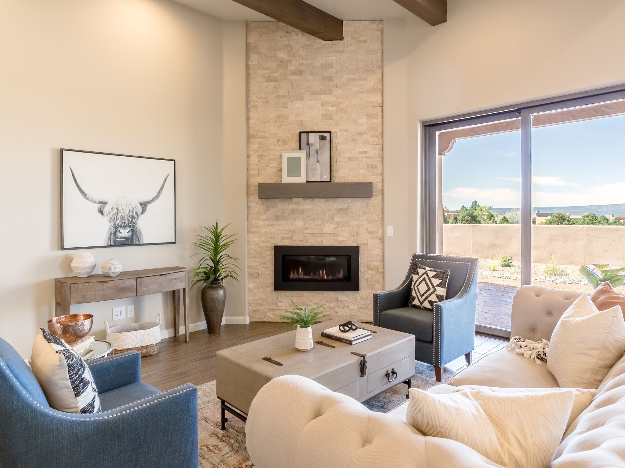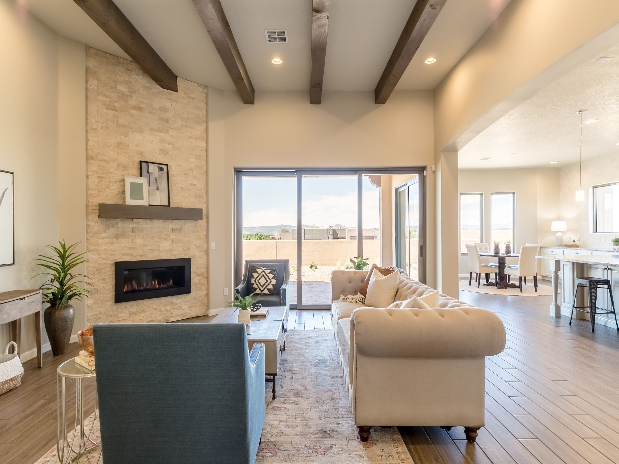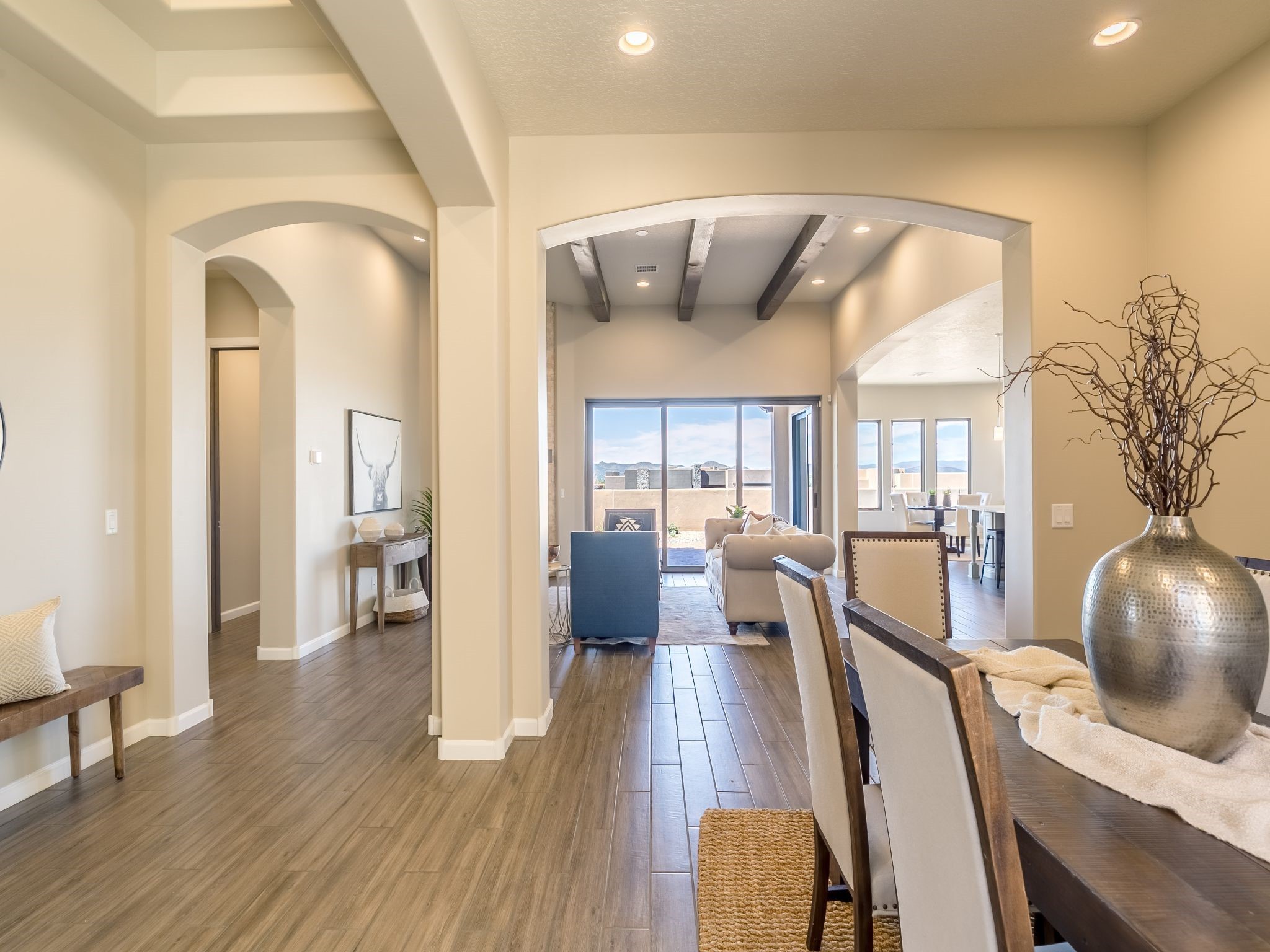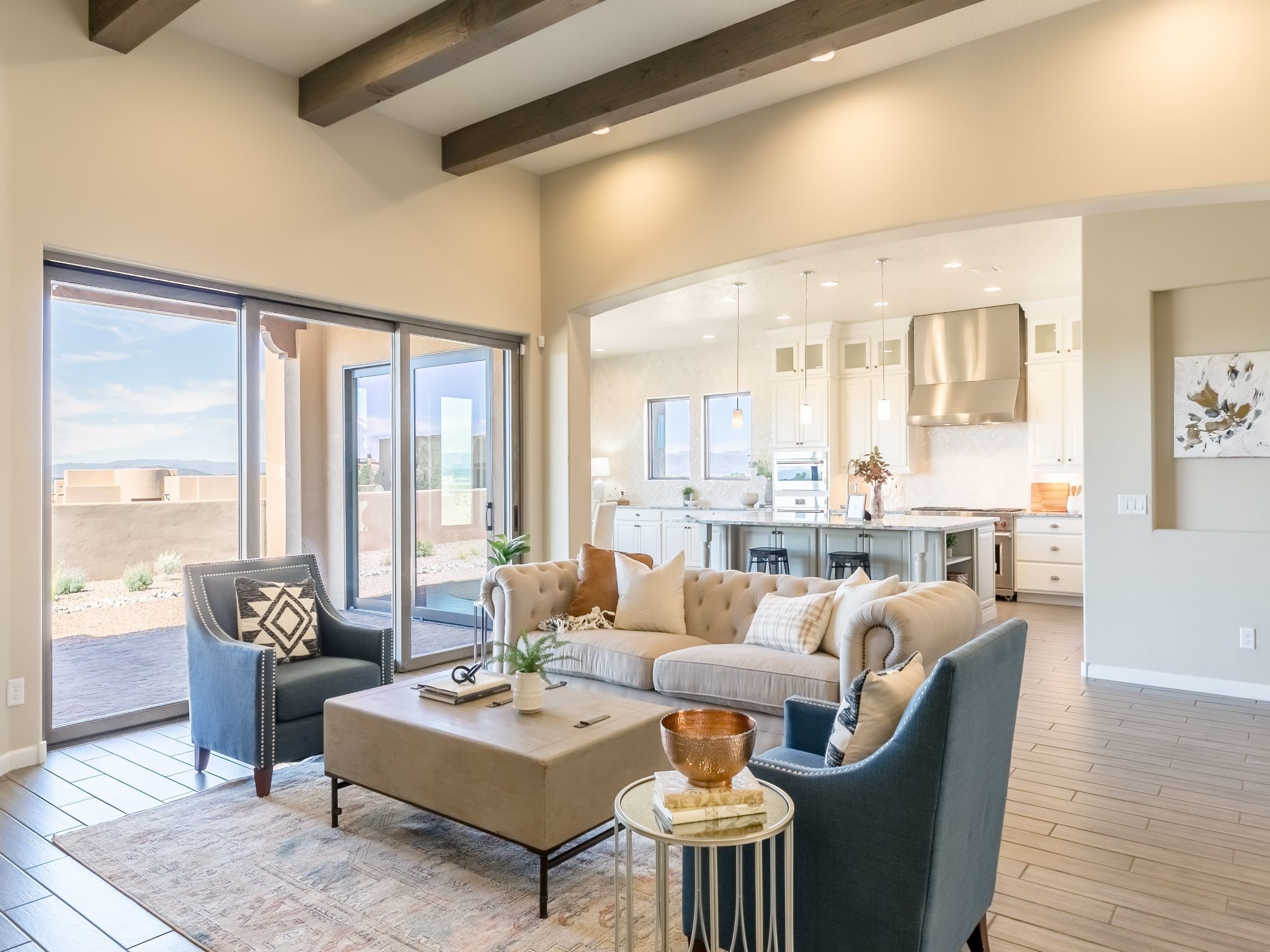Completed August 2023; Ready for Move-In. the Patagonia pueblo floorplan is 3,265 sq. ft. in the main residence with a 218 sq. ft. guest suite with top-of-the line finishes. The main residence offers an open floor plan ideal for entertaining with light-filled, dining & kitchen areas; three bedrooms; media room; office & a 3-car garage. Retracting sliding glass doors frame the view & connect the living room with the covered portal area with gas fireplace & further to the generous walled-in. A spacious Wolf kitchen is anchored by a large center island with caf seating & is adjacent to the dining area which opens to the covered portal. The luxurious owner's suite features a walk-in shower with retreat area. Near the walking path, the Las Campanas Hacienda is minutes away. HOA fees cover maintenance, gated entries, paved roads, common areas, 24-hr roaming security & 24-hour EMT's. Membership to the Club at Las Campanas is optional.
