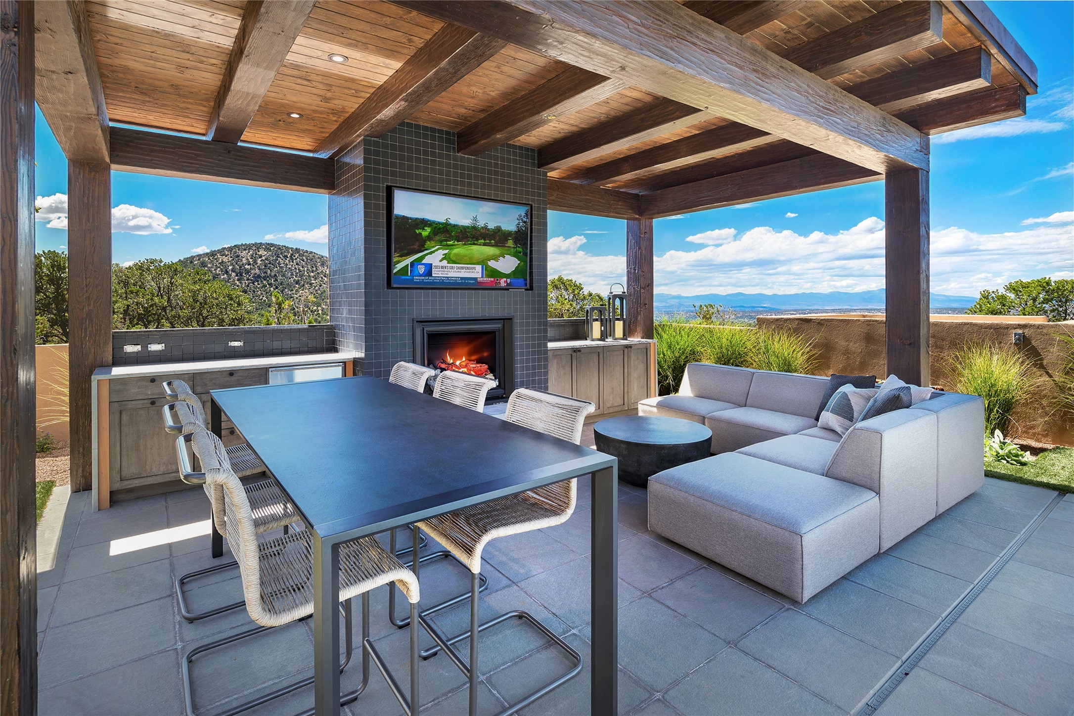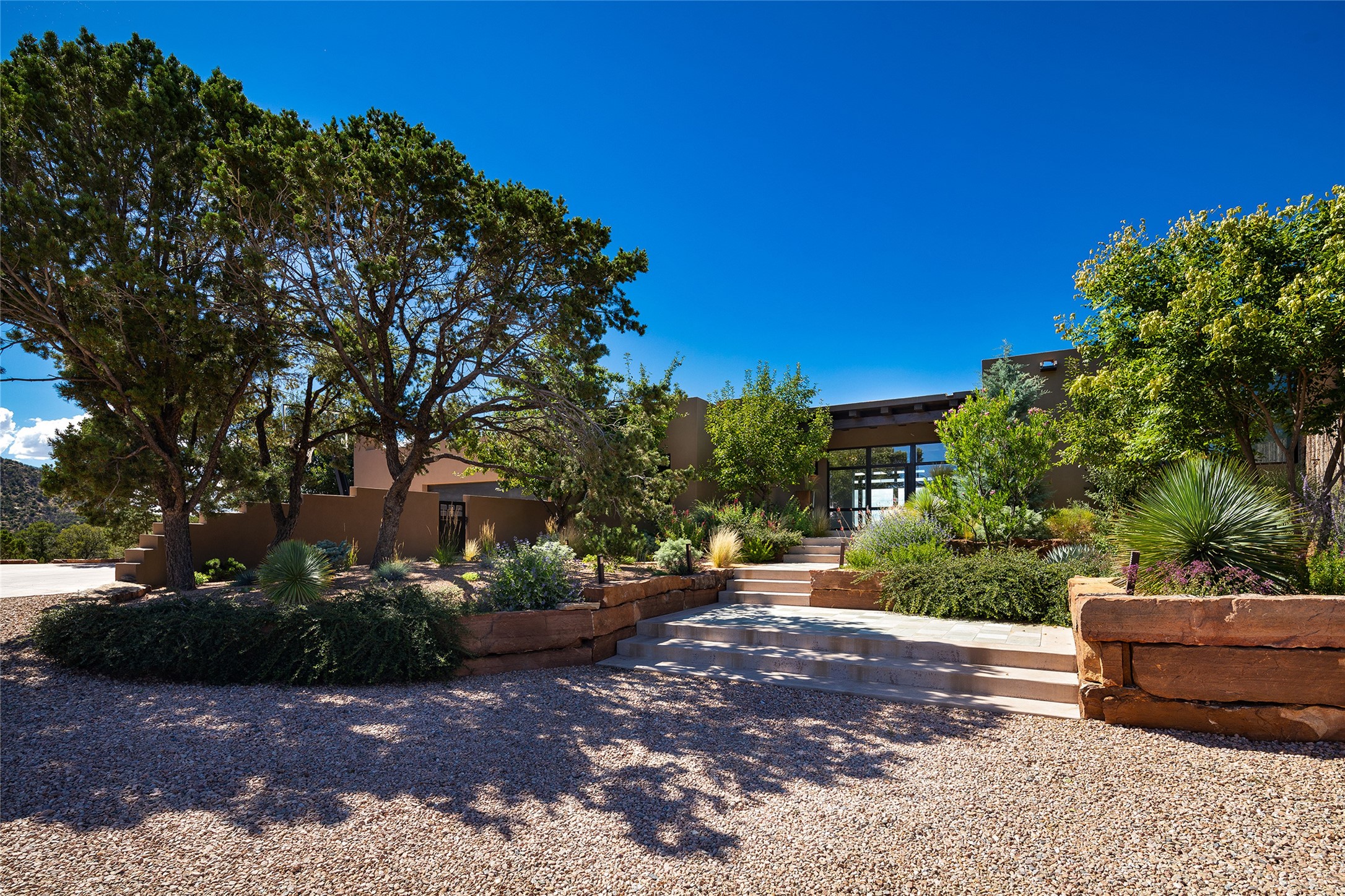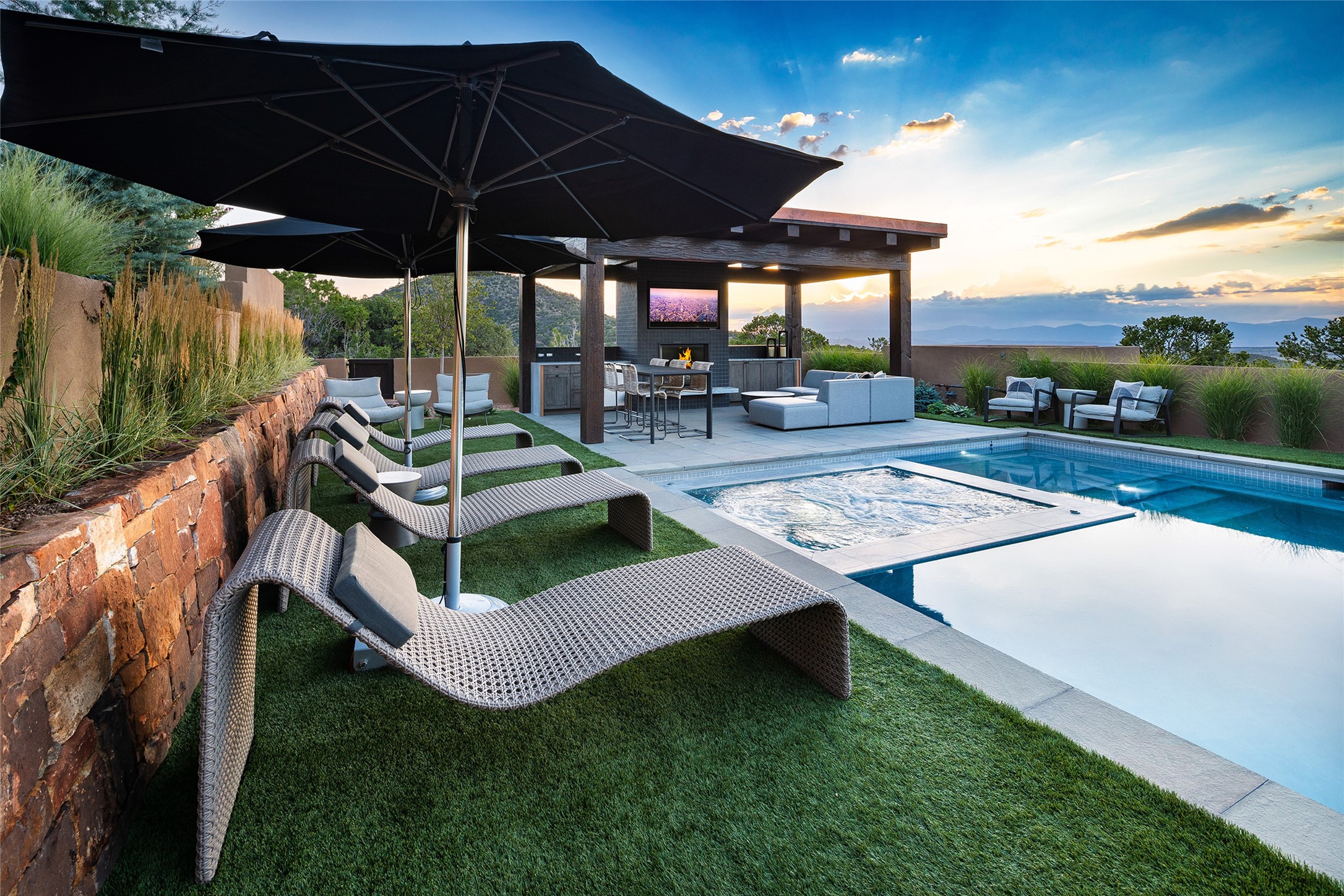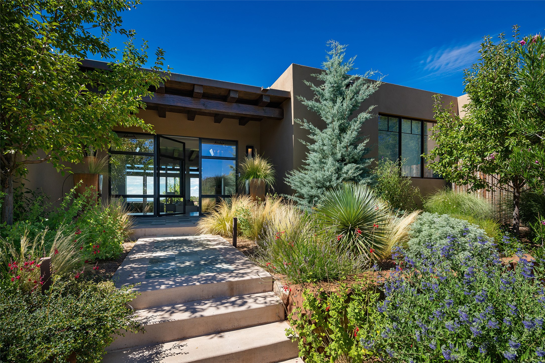 One of the most extraordinary estates in all of Santa Fe, this exceptional 2018-built residence by the awarding winning, Woods Design Builders excites and captivates with powerful architecture, stunning, expansive views mountain, city and sunset views, and a rare resort-style diving pool, spa, and cabana. Located within Wilderness Gate, and sited on a superior, elevated 5 acre view lot, this exquisite gated residence, exemplifies the unique blend of sophisticated contemporary design with inherent Santa Fe warmth. Designed with a grand open concept living experience, with seamless surround view windows, this fabulous home stuns upon entering through the glass and metal pivot front entrance door into the living room and dining room, complete with a custom metal accent wall, fireplace, wet bar, wine cooler, and sliding glass doors which open to the epic mountain and city views and the the outdoor covered portal with a BBQ and fireplace. The ultimate entertainer's kitchen delights with an expansive island with waterfall Taj Mahal counters, pantry, dual sinks, and luxury appliances, which opens to a casual dining and living room with a fireplace. The luxurious owner's suite delights with majestic views, private portal, an attached office area, sitting room or an ideal media room, and a state-of-the art bath complete with a jetted tub, steam shower, and generous walk-in closet. Separate from the owner's suite are two well-appointed guest bedroom ensuites, plus an additional living room with an office niche. The newly installed heated pool and spa with a fully equipped cabana defines excellence, with resistance swim jets, an outdoor kitchen, fireplace and media center. Additional luxury features include white oak flooring, lush vibrant surround gardens with multiple outdoor entertainment areas, plaster walls, and rich beams with steel accents throughout, and all within minutes from the Plaza, steps away from Atalaya Mnt, St. Johns College, and the Dale Ball trail system.