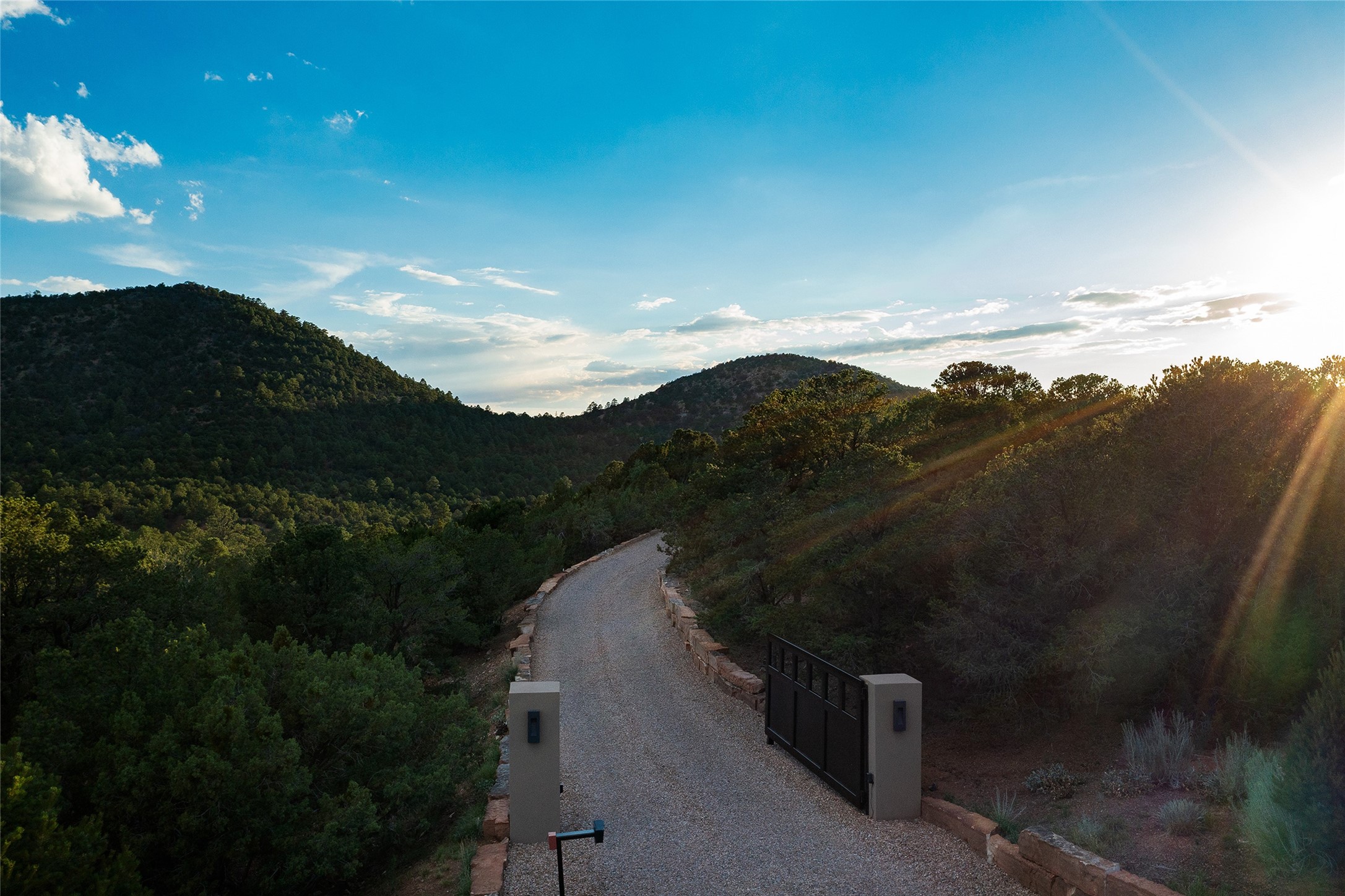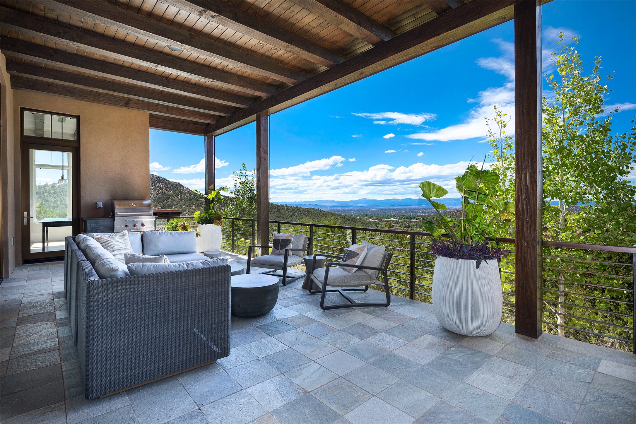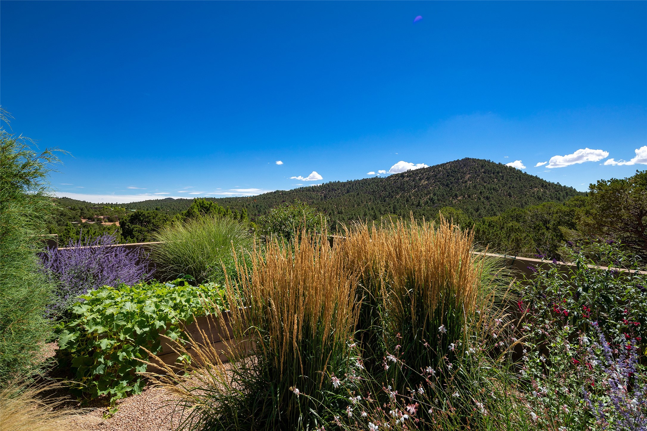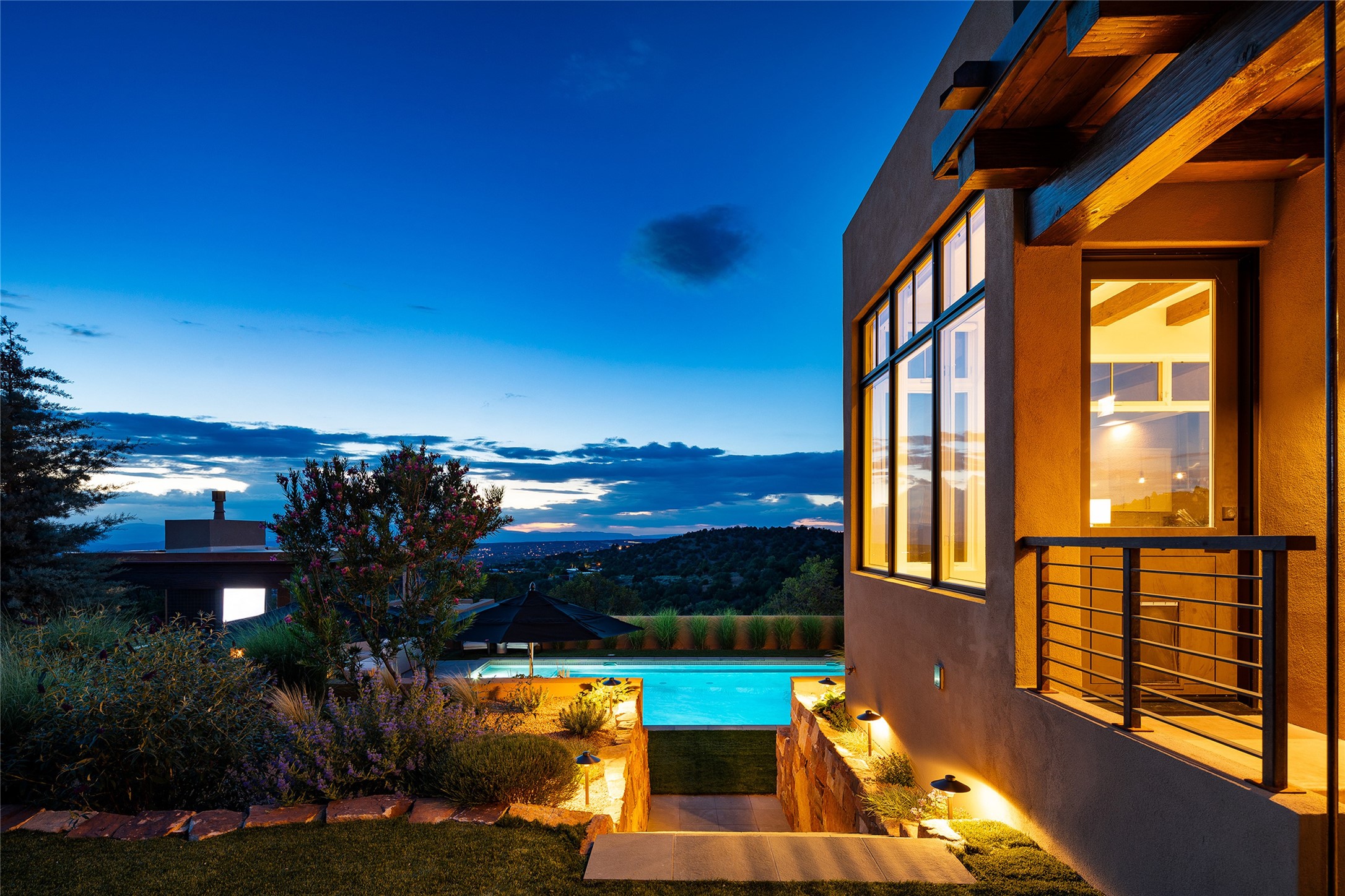 One of the most extraordinary estates in all of Santa Fe, this exceptional 2018-built residence by the awarding winning, Woods Design Builders excites and captivates with powerful architecture, stunning, expansive views mountain, city and sunset views, and a rare resort-style diving pool, spa, and cabana. Located within Wilderness Gate, and sited on a superior, elevated 5 acre view lot, this exquisite gated residence, exemplifies the unique blend of sophisticated contemporary design with inherent Santa Fe warmth. Designed with a grand open concept living experience, with seamless surround view windows, this fabulous home stuns upon entering through the glass and metal pivot front entrance door into the living room and dining room, complete with a custom metal accent wall, fireplace, wet bar, wine cooler, and sliding glass doors which open to the epic mountain and city views and the the outdoor covered portal with a BBQ and fireplace. The ultimate entertainer's kitchen delights with an expansive island with waterfall Taj Mahal counters, pantry, dual sinks, and luxury appliances, which opens to a casual dining and living room with a fireplace. The luxurious owner's suite delights with majestic views, private portal, an attached office area, sitting room or an ideal media room, and a state-of-the art bath complete with a jetted tub, steam shower, and generous walk-in closet. Separate from the owner's suite are two well-appointed guest bedroom ensuites, plus an additional living room with an office niche. The newly installed heated pool and spa with a fully equipped cabana defines excellence, with resistance swim jets, an outdoor kitchen, fireplace and media center. Additional luxury features include white oak flooring, lush vibrant surround gardens with multiple outdoor entertainment areas, plaster walls, and rich beams with steel accents throughout, and all within minutes from the Plaza, steps away from Atalaya Mnt, St. Johns College, and the Dale Ball trail system.