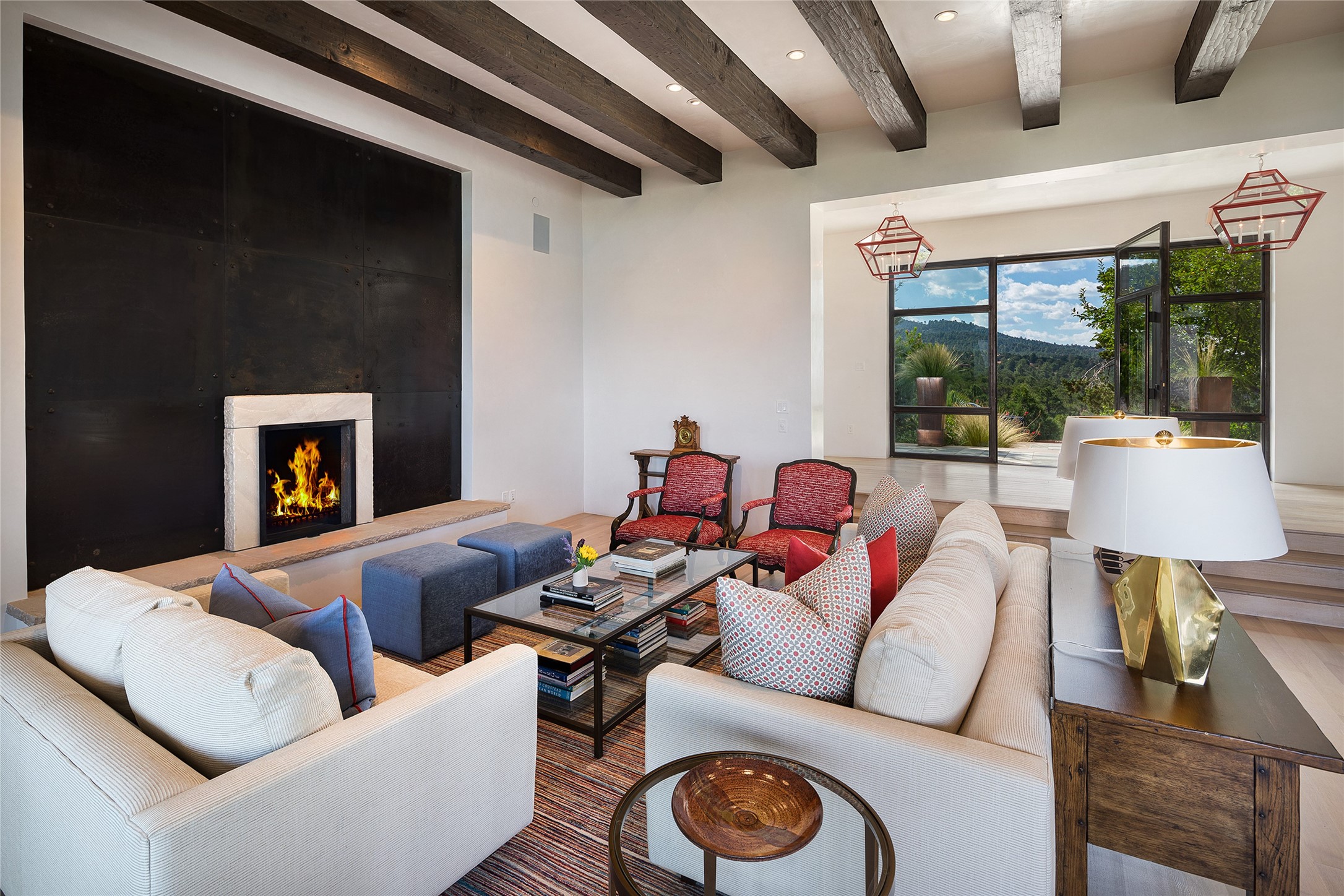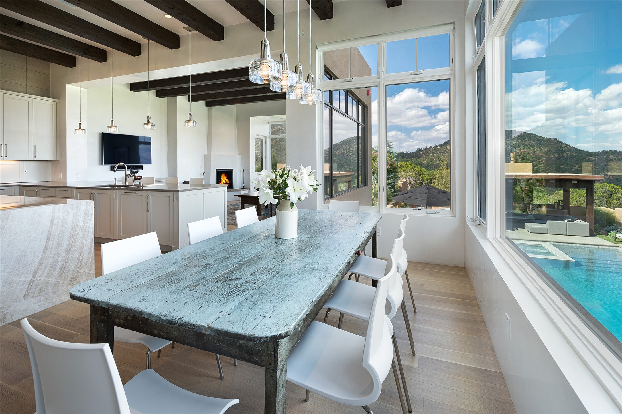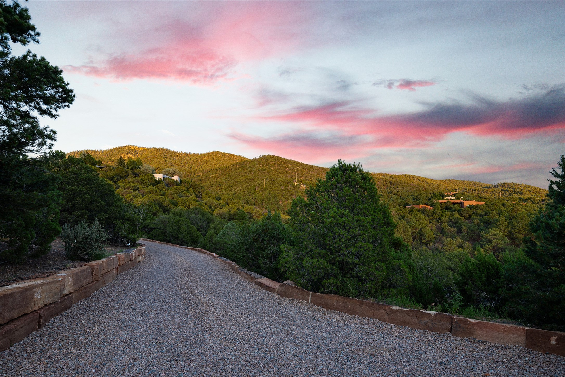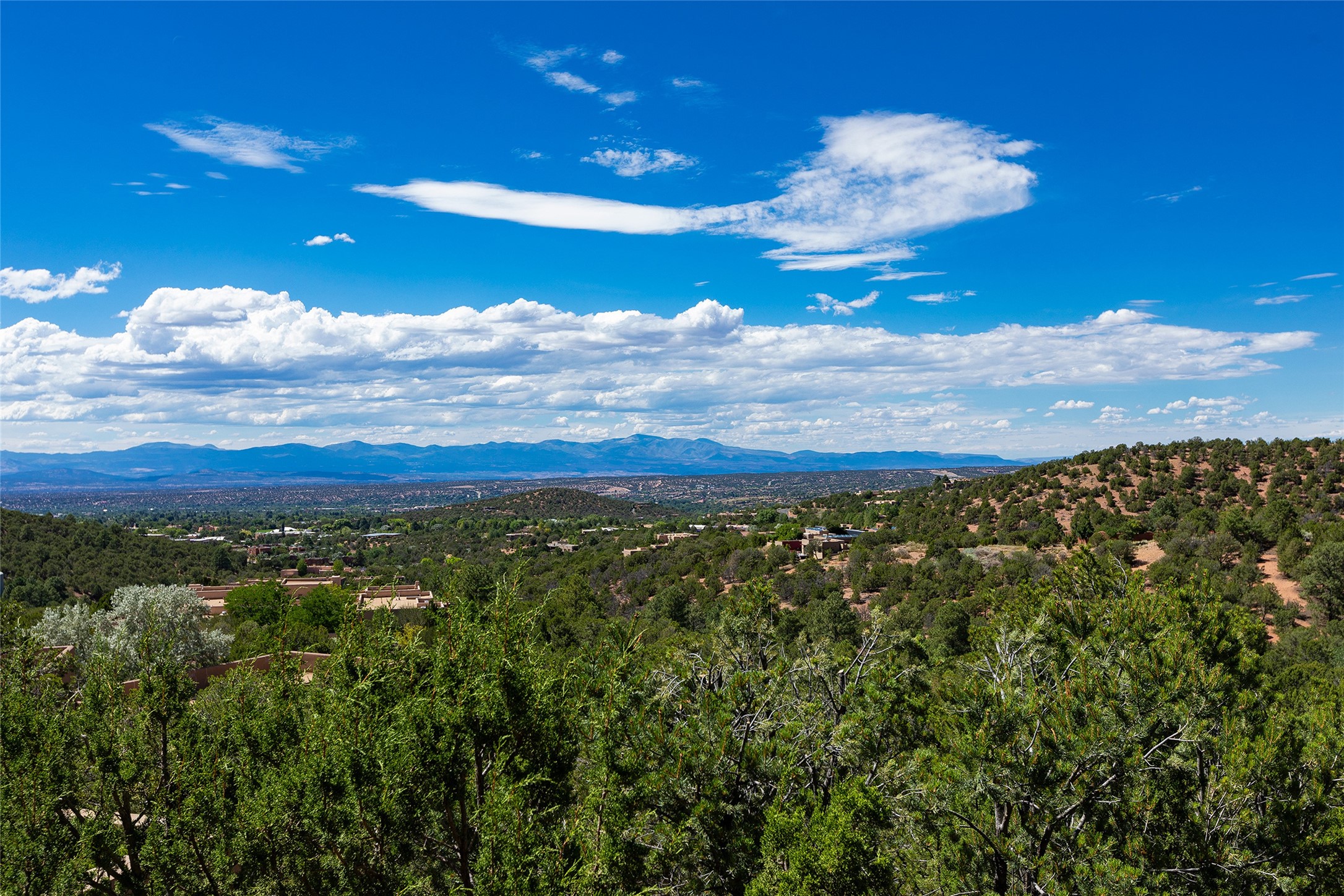 One of the most extraordinary estates in all of Santa Fe, this exceptional 2018-built residence by the awarding winning, Woods Design Builders excites and captivates with powerful architecture, stunning, expansive views mountain, city and sunset views, and a rare resort-style diving pool, spa, and cabana. Located within Wilderness Gate, and sited on a superior, elevated 5 acre view lot, this exquisite gated residence, exemplifies the unique blend of sophisticated contemporary design with inherent Santa Fe warmth. Designed with a grand open concept living experience, with seamless surround view windows, this fabulous home stuns upon entering through the glass and metal pivot front entrance door into the living room and dining room, complete with a custom metal accent wall, fireplace, wet bar, wine cooler, and sliding glass doors which open to the epic mountain and city views and the the outdoor covered portal with a BBQ and fireplace. The ultimate entertainer's kitchen delights with an expansive island with waterfall Taj Mahal counters, pantry, dual sinks, and luxury appliances, which opens to a casual dining and living room with a fireplace. The luxurious owner's suite delights with majestic views, private portal, an attached office area, sitting room or an ideal media room, and a state-of-the art bath complete with a jetted tub, steam shower, and generous walk-in closet. Separate from the owner's suite are two well-appointed guest bedroom ensuites, plus an additional living room with an office niche. The newly installed heated pool and spa with a fully equipped cabana defines excellence, with resistance swim jets, an outdoor kitchen, fireplace and media center. Additional luxury features include white oak flooring, lush vibrant surround gardens with multiple outdoor entertainment areas, plaster walls, and rich beams with steel accents throughout, and all within minutes from the Plaza, steps away from Atalaya Mnt, St. Johns College, and the Dale Ball trail system.