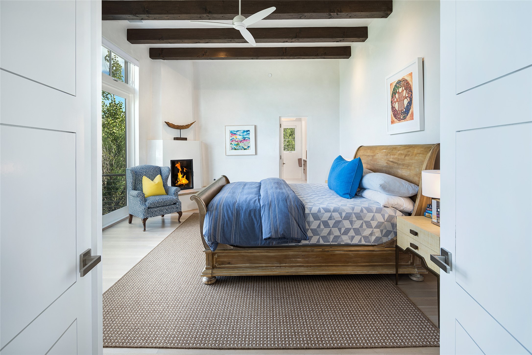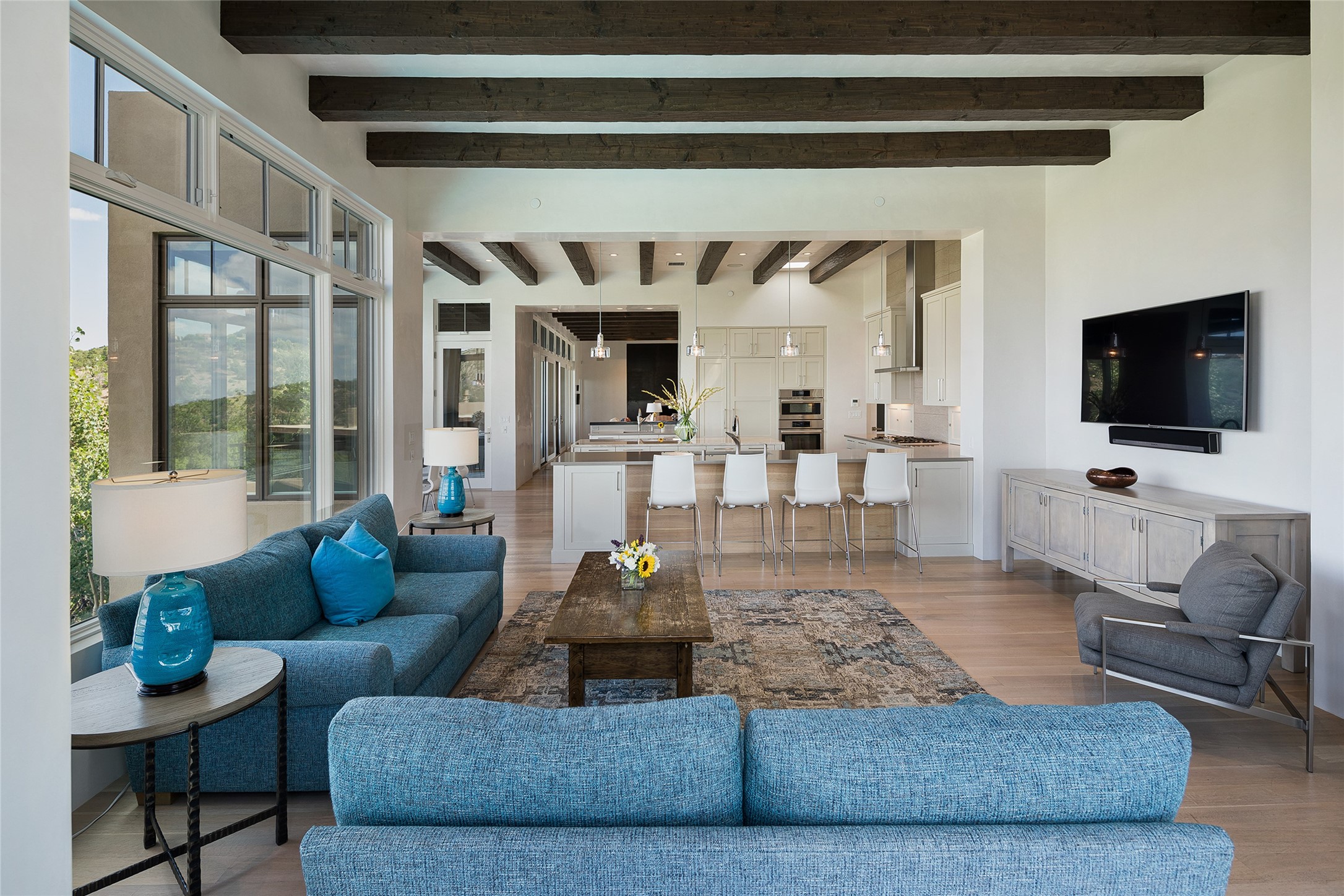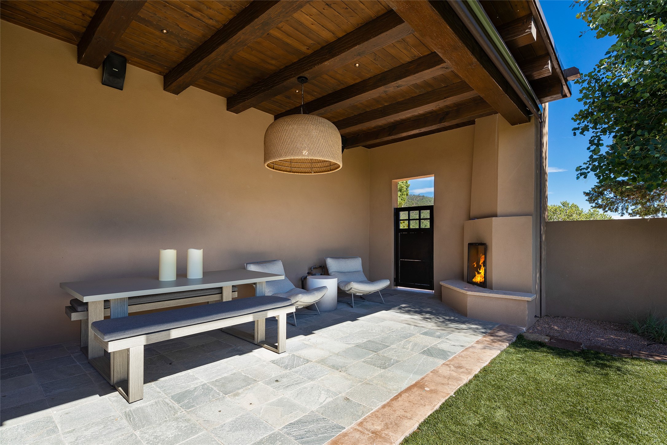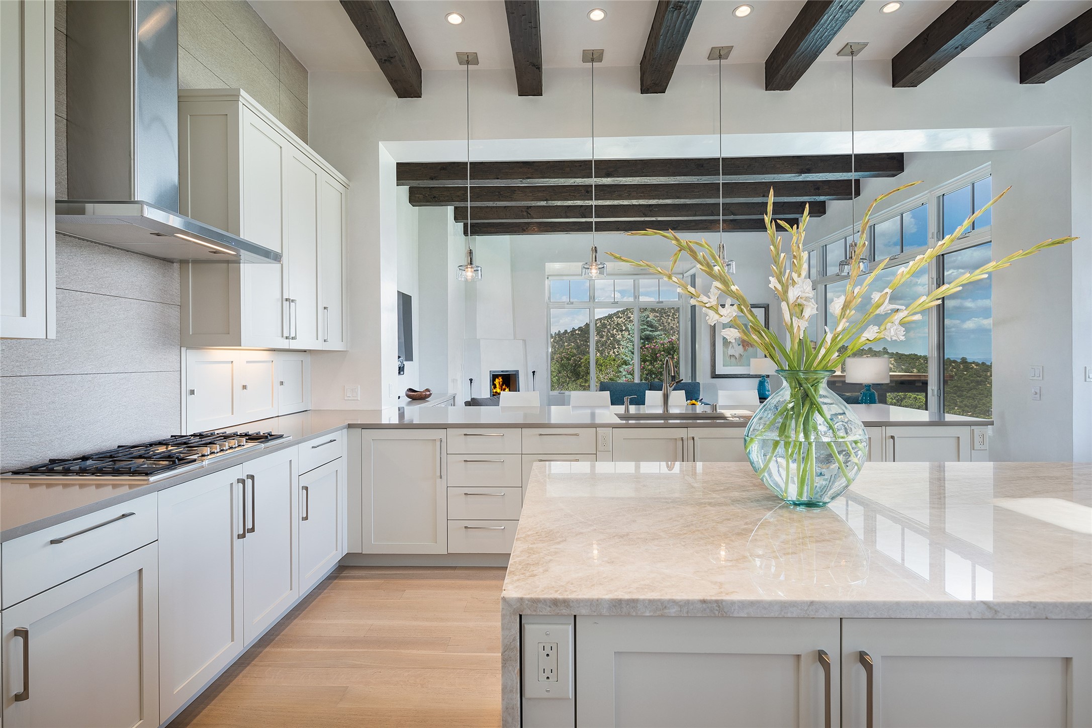 One of the most extraordinary estates in all of Santa Fe, this exceptional 2018-built residence by the awarding winning, Woods Design Builders excites and captivates with powerful architecture, stunning, expansive views mountain, city and sunset views, and a rare resort-style diving pool, spa, and cabana. Located within Wilderness Gate, and sited on a superior, elevated 5 acre view lot, this exquisite gated residence, exemplifies the unique blend of sophisticated contemporary design with inherent Santa Fe warmth. Designed with a grand open concept living experience, with seamless surround view windows, this fabulous home stuns upon entering through the glass and metal pivot front entrance door into the living room and dining room, complete with a custom metal accent wall, fireplace, wet bar, wine cooler, and sliding glass doors which open to the epic mountain and city views and the the outdoor covered portal with a BBQ and fireplace. The ultimate entertainer's kitchen delights with an expansive island with waterfall Taj Mahal counters, pantry, dual sinks, and luxury appliances, which opens to a casual dining and living room with a fireplace. The luxurious owner's suite delights with majestic views, private portal, an attached office area, sitting room or an ideal media room, and a state-of-the art bath complete with a jetted tub, steam shower, and generous walk-in closet. Separate from the owner's suite are two well-appointed guest bedroom ensuites, plus an additional living room with an office niche. The newly installed heated pool and spa with a fully equipped cabana defines excellence, with resistance swim jets, an outdoor kitchen, fireplace and media center. Additional luxury features include white oak flooring, lush vibrant surround gardens with multiple outdoor entertainment areas, plaster walls, and rich beams with steel accents throughout, and all within minutes from the Plaza, steps away from Atalaya Mnt, St. Johns College, and the Dale Ball trail system.