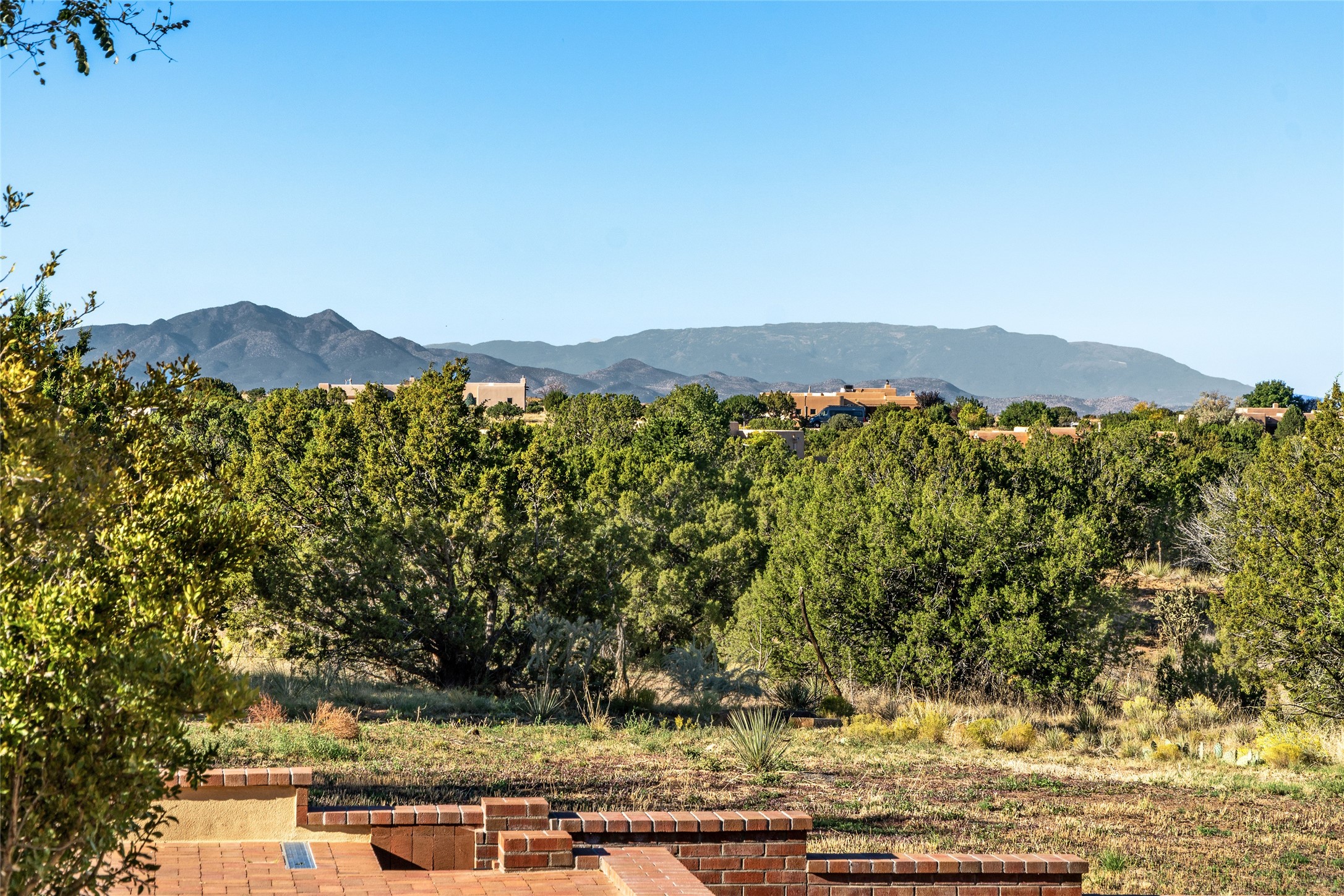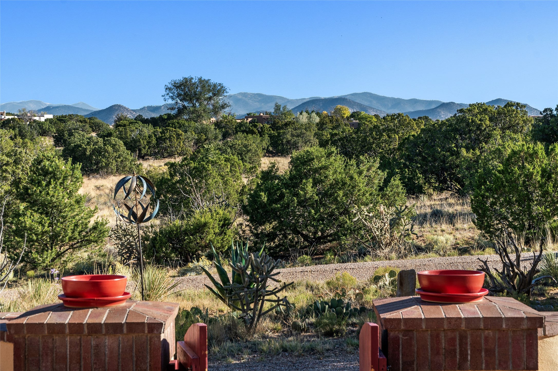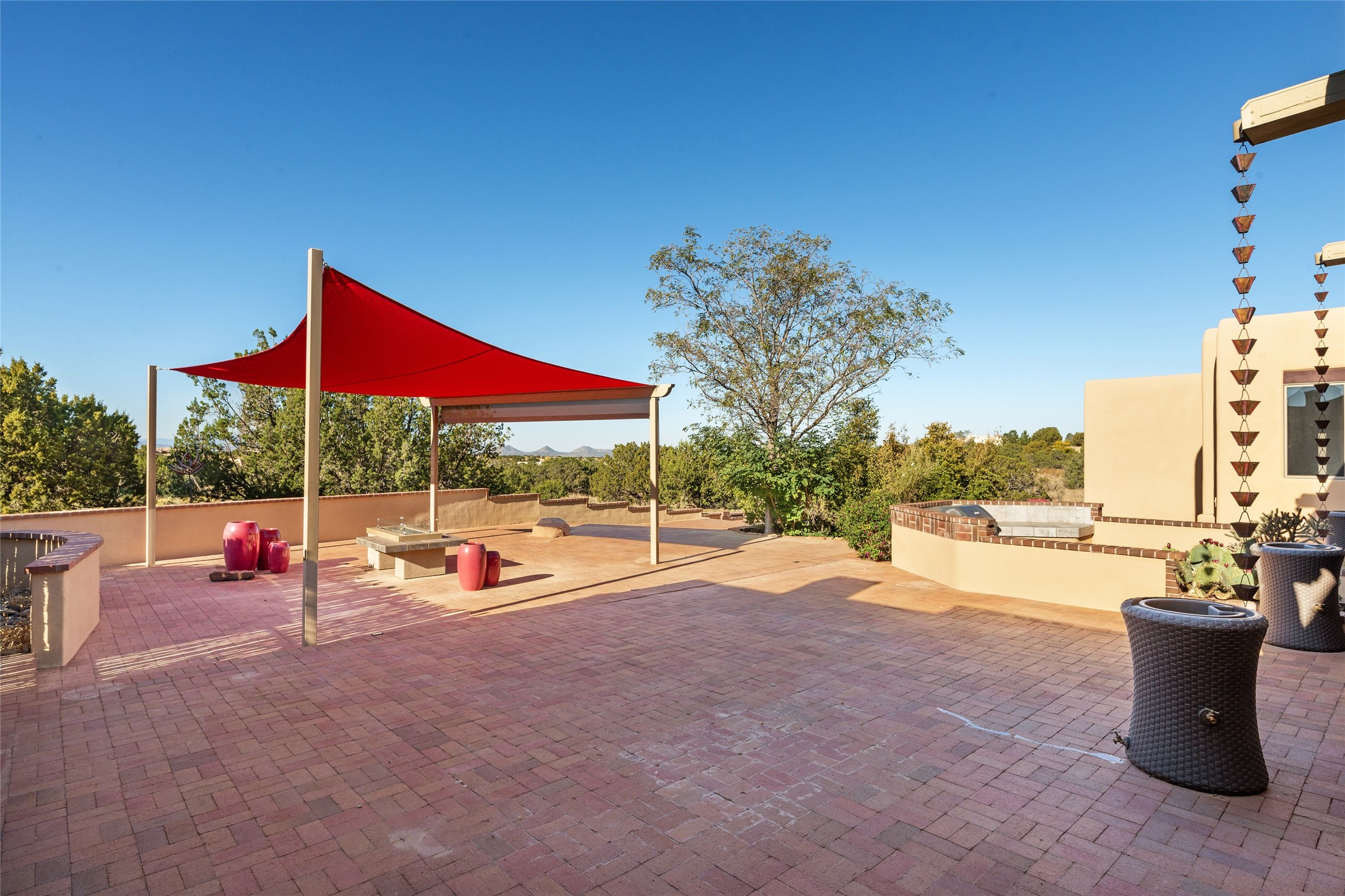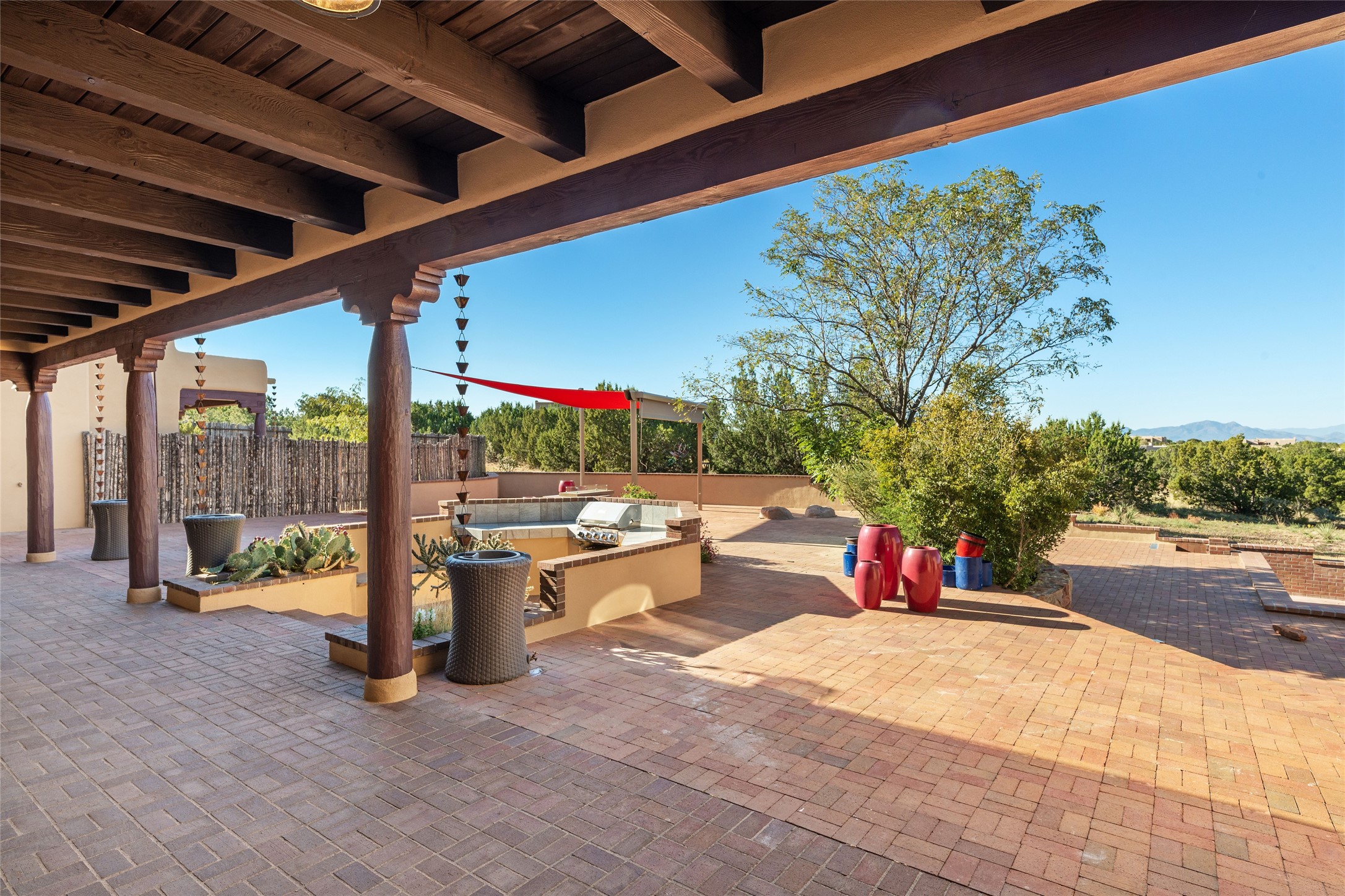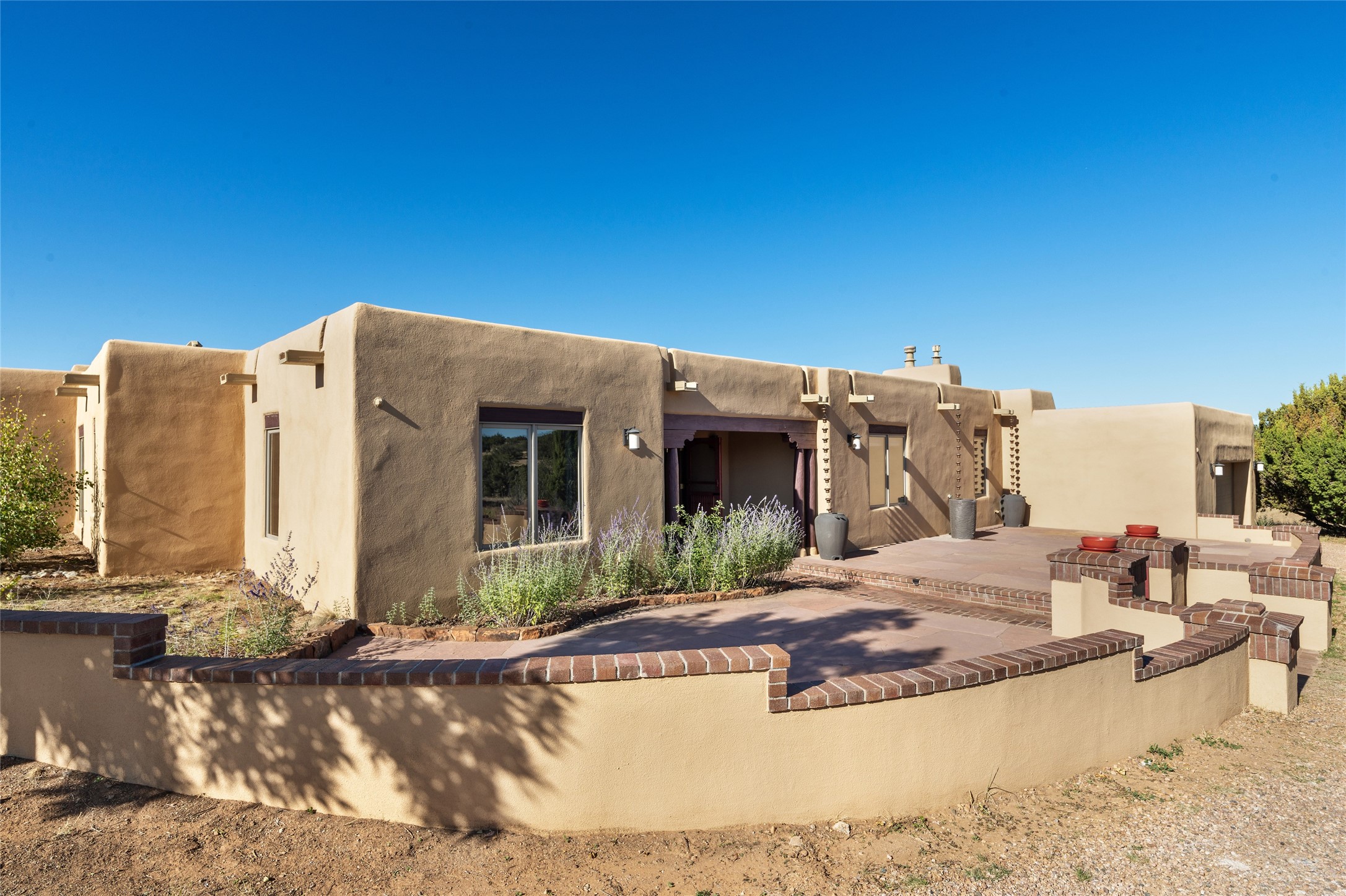 ENTERTAINER'S PARADISE! Not to mention the spectacular postcard-worthy sunset views of the Sandia and Ortiz, mountains from the back patio, and Sangres from the front patio. Sited on a large greenbelt at the end of a cul-de-sac. Four mini-splits provide real air conditioning. New stucco, interior paint and brick floors refinished in September 2023. Kitchen updated in 2022 with new appliances - a 6-burner Wolf gas range, Bosch dishwasher and LG refrigerator and more counter seating and storage. Two primary suites on opposite ends of the house, both with large walk-in closets, provide numerous options, from an in-law suite, to a large artist's studio. The larger of the suites has a sitting room with fantastic mountain views, a smaller room that is plumbed to be a kitchenette, and a separate back entrance. Huge closest with an entire wall of built-in shelves and drawers in first primary bedroom with beautiful spa-like bath with jetted tub, and double sinks. Banco with storage under picture window. Primary bedroom two has a generous 2-person jetted tub, double sinks and beautiful shower. Both primary suites have a fireplace, and there are two more in living areas, for a total of four. Fifth bedroom is set up as a beautiful office with built-ins. The new brick back patio has a sunken seating area with a built-in gas grill, a fire table and a long covered portal which is a great place to entertain or relax. The two added front flagstone patios provide additional space for seating and gorgeous views of snow-covered mountains in the winter - both patios have solar lighting. There is also a secure coyote-fenced backyard space that provides a safe area for dogs to play. Generous laundry room with sink and pantry. Oversized, extra deep 2-car garage with storage. A few steps up from the garage, otherwise single-level. Radiant is PEX. Domestic is copper. Water softener 2019. Each room has a ceiling fan. Custom screen doors, insulated blinds.