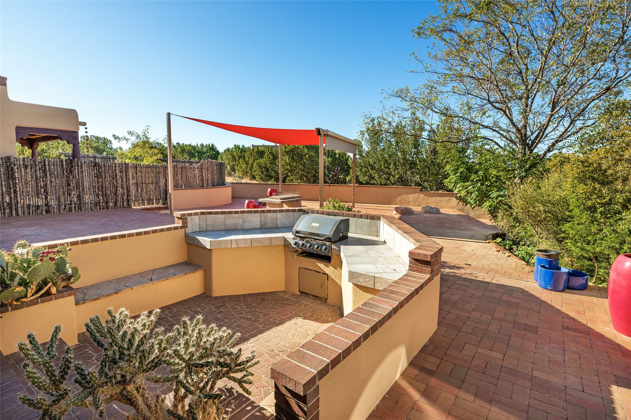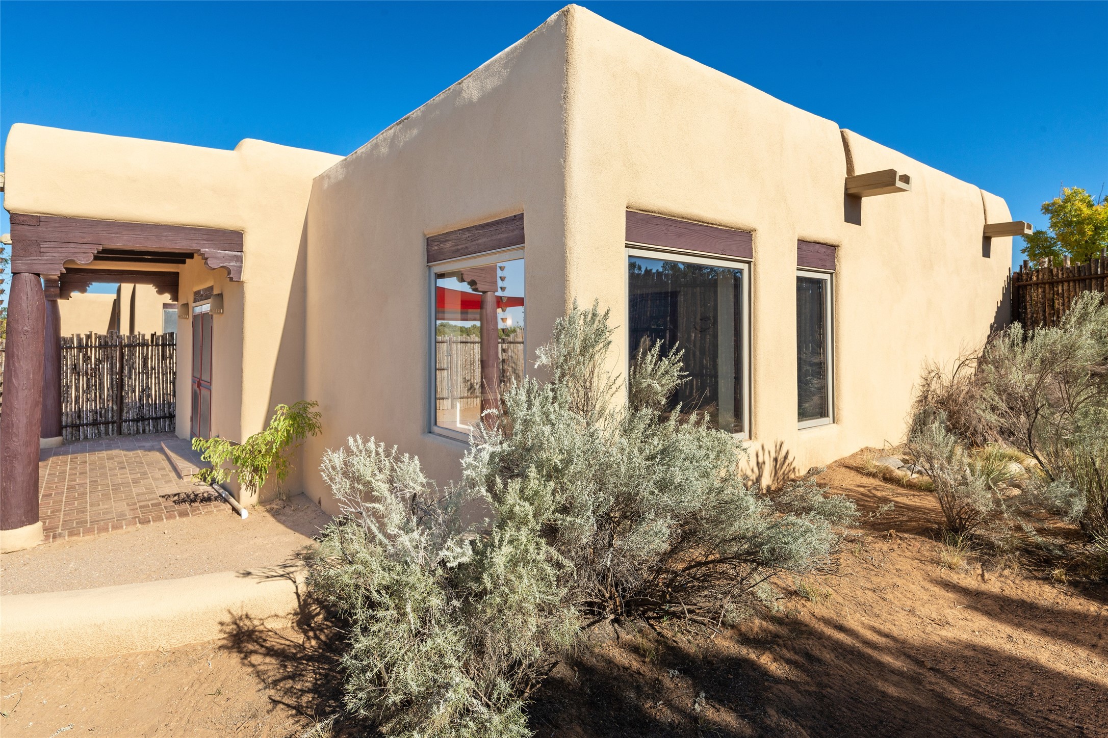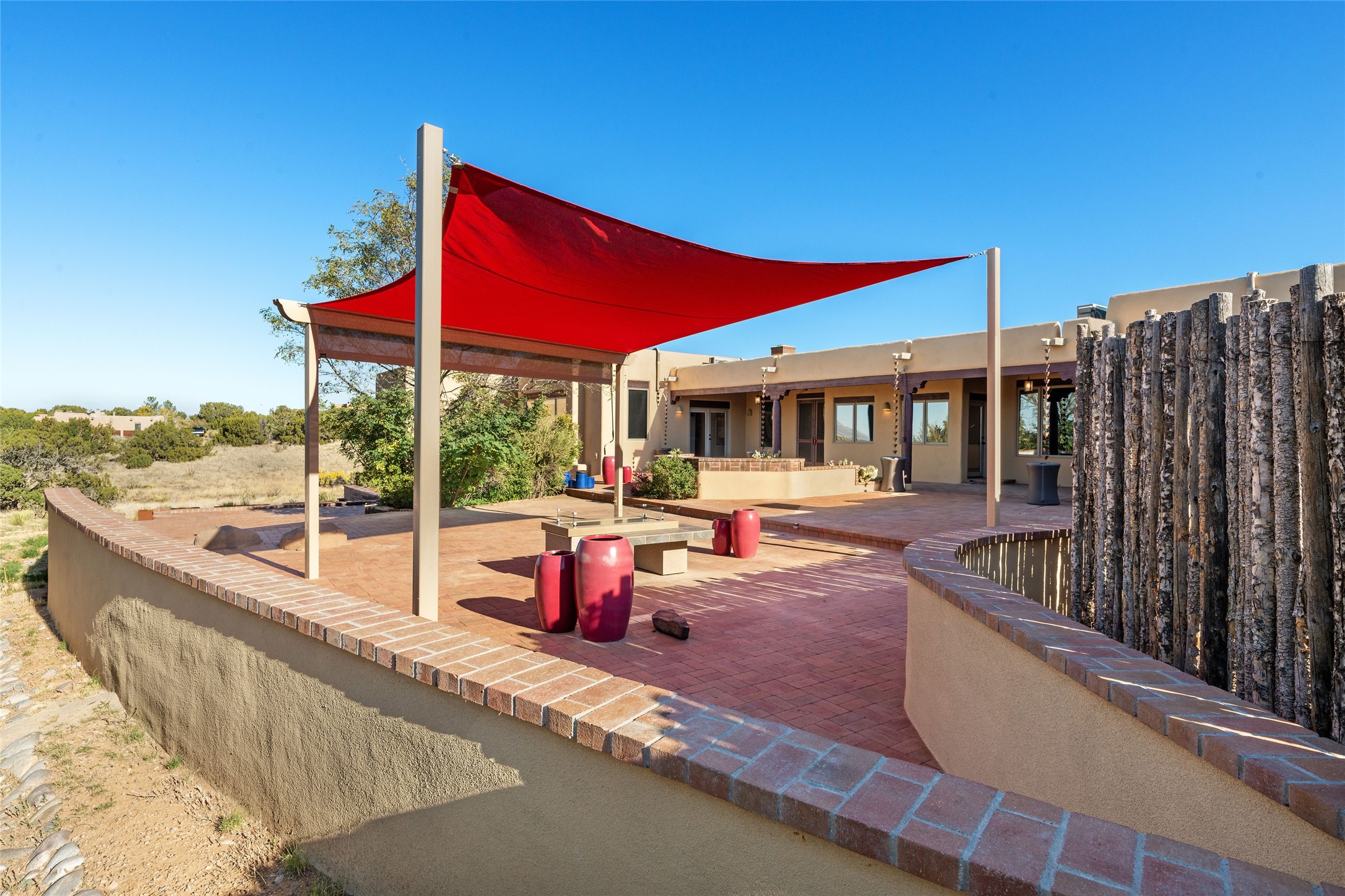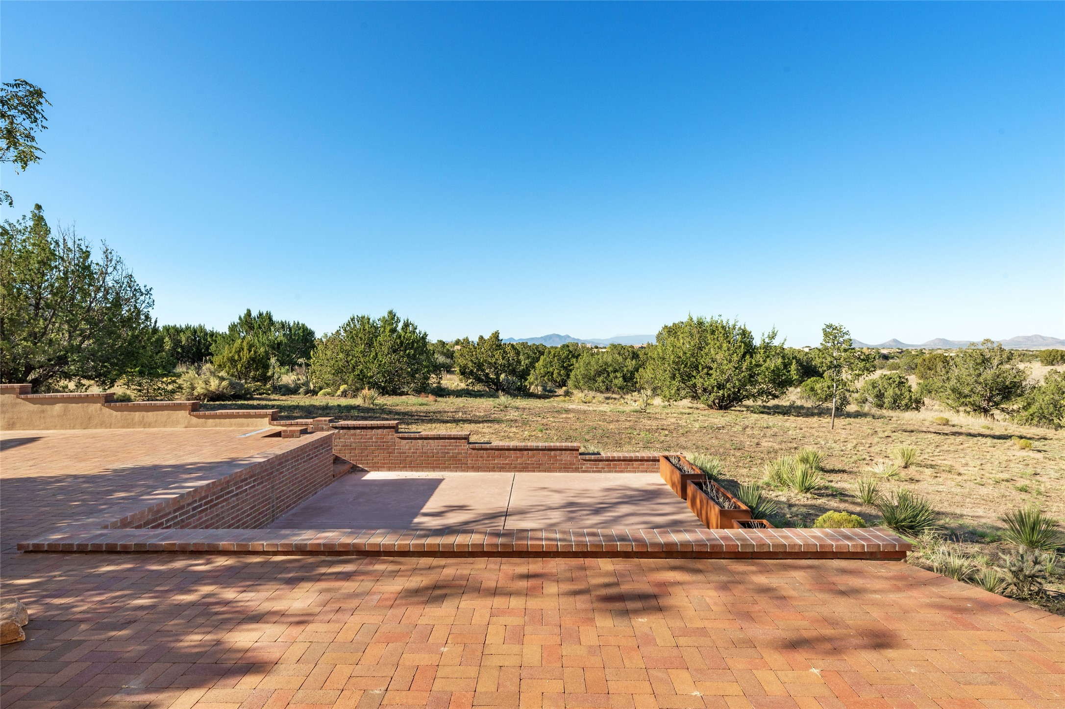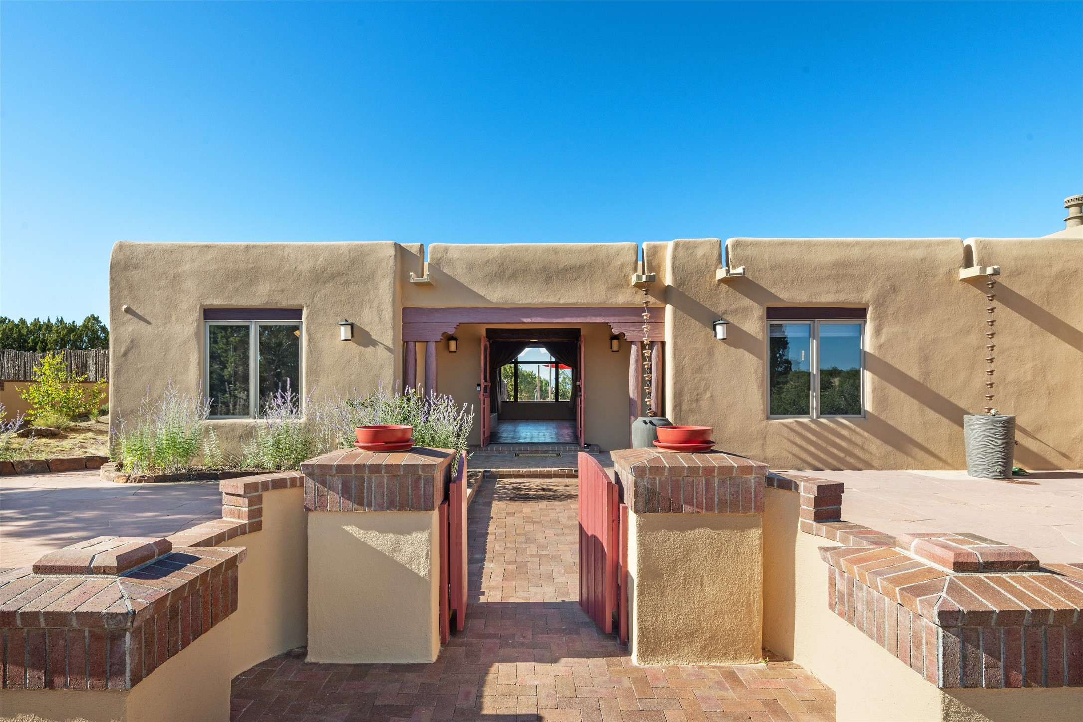 ENTERTAINER'S PARADISE! Not to mention the spectacular postcard-worthy sunset views of the Sandia and Ortiz, mountains from the back patio, and Sangres from the front patio. Sited on a large greenbelt at the end of a cul-de-sac. Four mini-splits provide real air conditioning. New stucco, interior paint and brick floors refinished in September 2023. Kitchen updated in 2022 with new appliances - a 6-burner Wolf gas range, Bosch dishwasher and LG refrigerator and more counter seating and storage. Two primary suites on opposite ends of the house, both with large walk-in closets, provide numerous options, from an in-law suite, to a large artist's studio. The larger of the suites has a sitting room with fantastic mountain views, a smaller room that is plumbed to be a kitchenette, and a separate back entrance. Huge closest with an entire wall of built-in shelves and drawers in first primary bedroom with beautiful spa-like bath with jetted tub, and double sinks. Banco with storage under picture window. Primary bedroom two has a generous 2-person jetted tub, double sinks and beautiful shower. Both primary suites have a fireplace, and there are two more in living areas, for a total of four. Fifth bedroom is set up as a beautiful office with built-ins. The new brick back patio has a sunken seating area with a built-in gas grill, a fire table and a long covered portal which is a great place to entertain or relax. The two added front flagstone patios provide additional space for seating and gorgeous views of snow-covered mountains in the winter - both patios have solar lighting. There is also a secure coyote-fenced backyard space that provides a safe area for dogs to play. Generous laundry room with sink and pantry. Oversized, extra deep 2-car garage with storage. A few steps up from the garage, otherwise single-level. Radiant is PEX. Domestic is copper. Water softener 2019. Each room has a ceiling fan. Custom screen doors, insulated blinds.