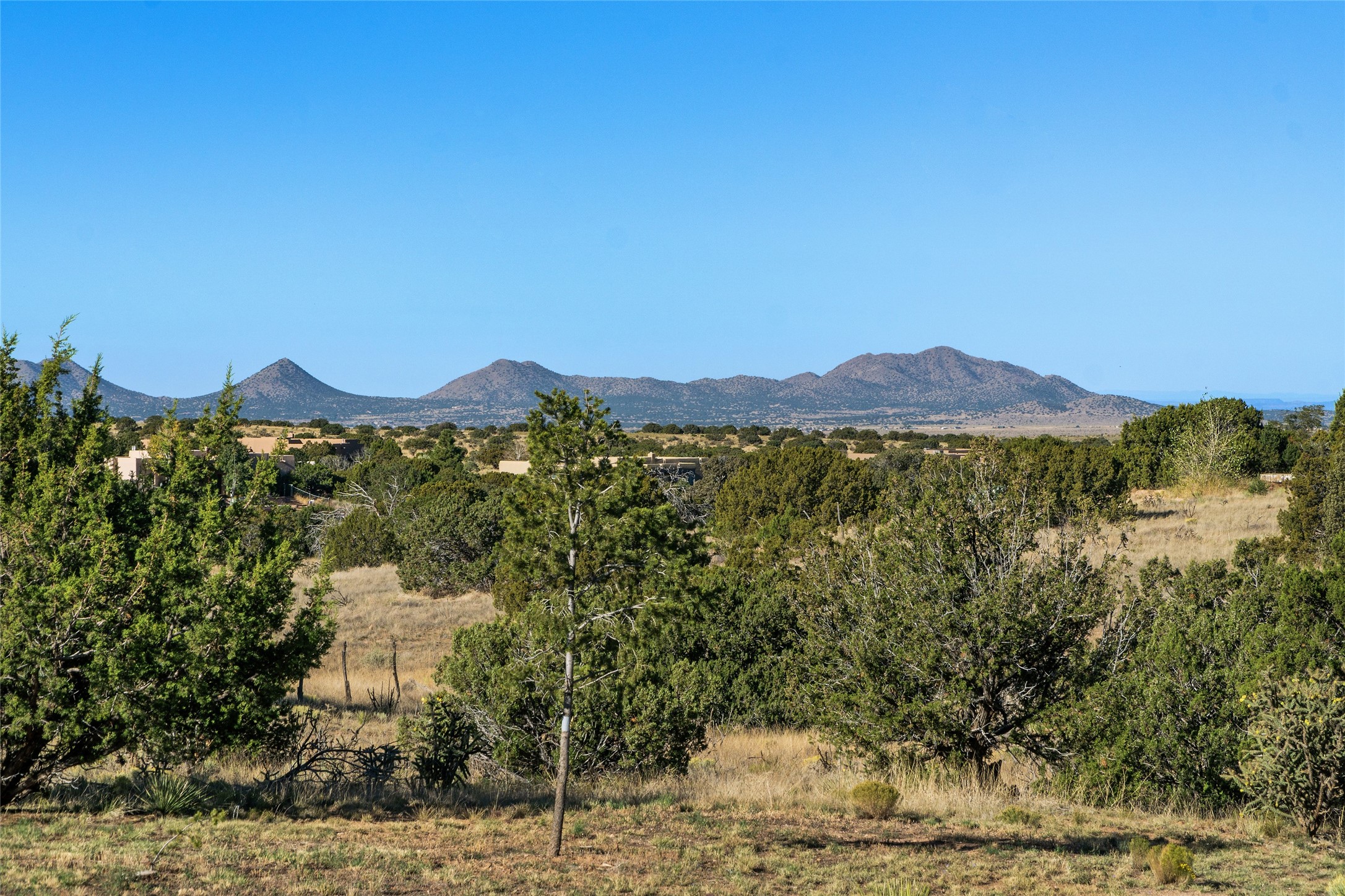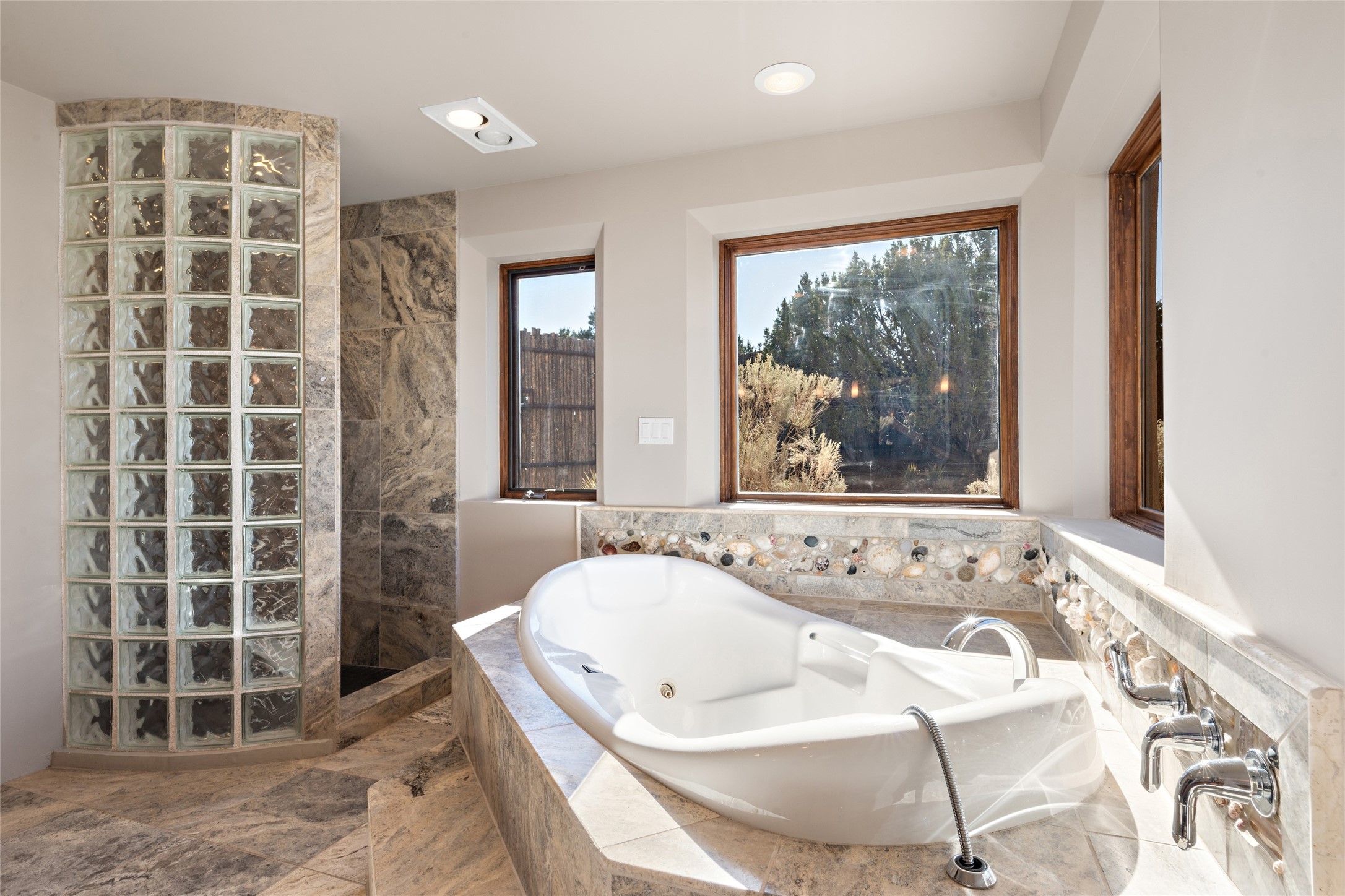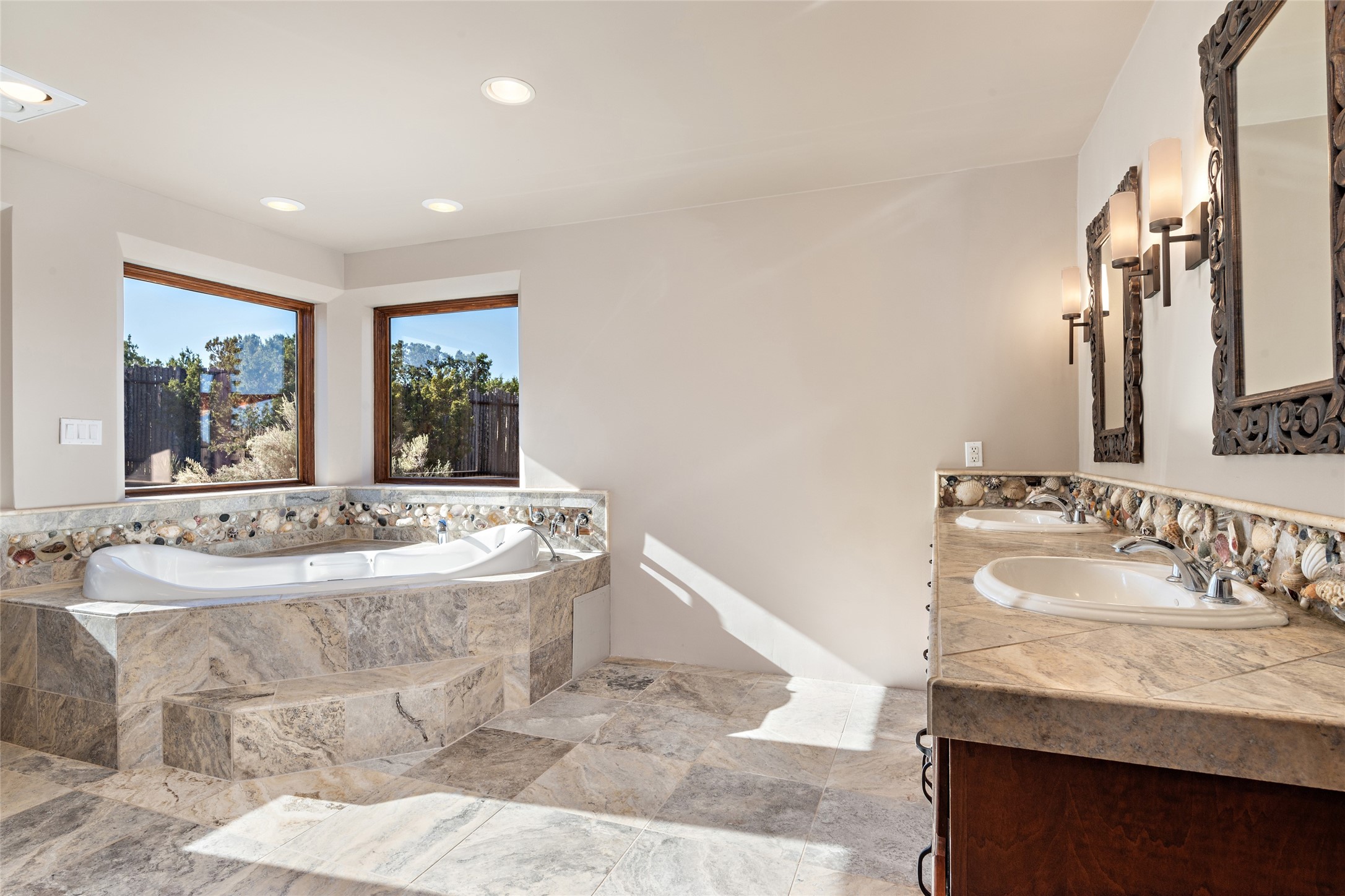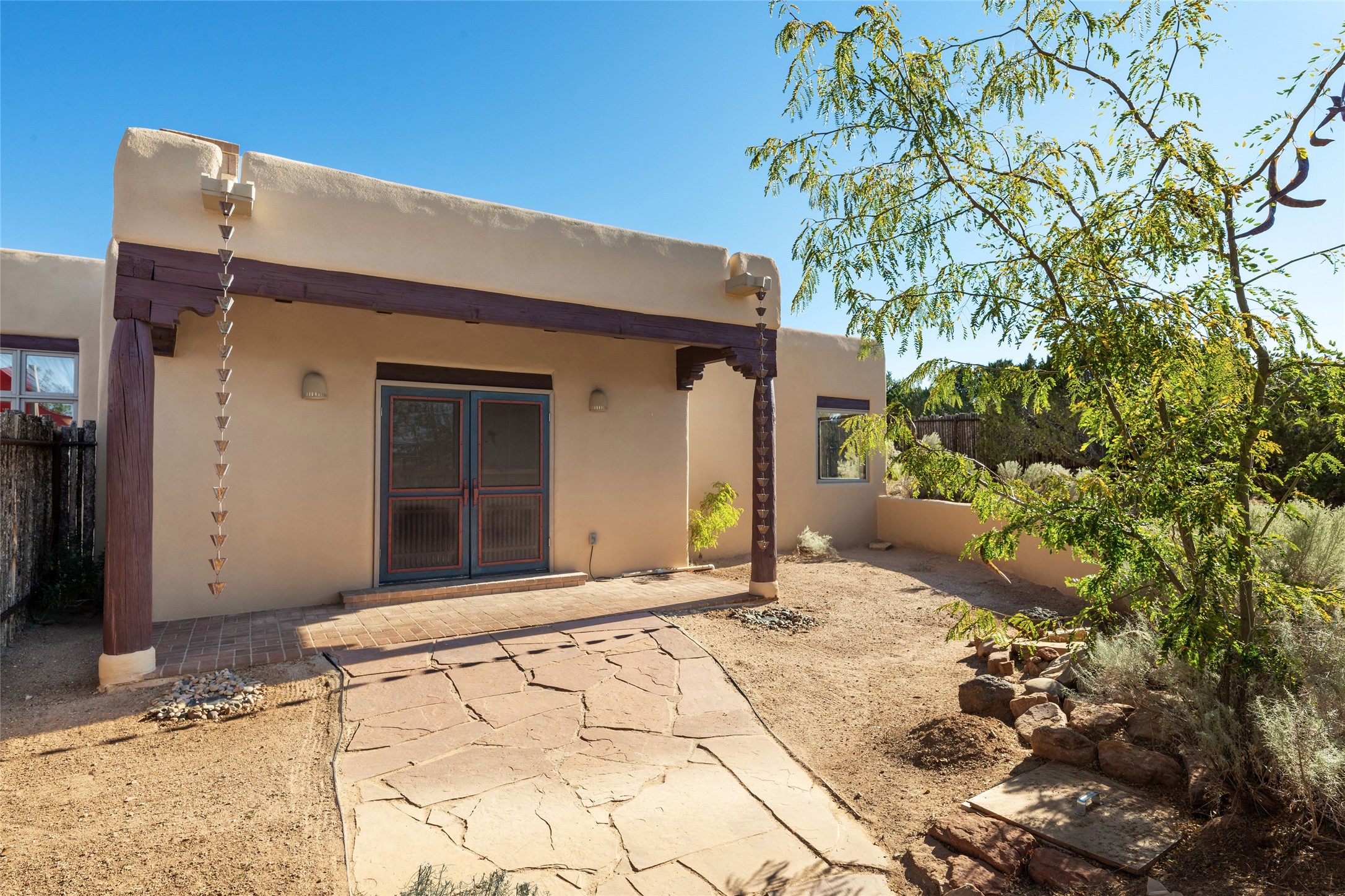ENTERTAINER'S PARADISE! Not to mention the spectacular postcard-worthy sunset views of the Sandia and Ortiz, mountains from the back patio, and Sangres from the front patio. Sited on a large greenbelt at the end of a cul-de-sac. Four mini-splits provide real air conditioning. New stucco, interior paint and brick floors refinished in September 2023. Kitchen updated in 2022 with new appliances - a 6-burner Wolf gas range, Bosch dishwasher and LG refrigerator and more counter seating and storage. Two primary suites on opposite ends of the house, both with large walk-in closets, provide numerous options, from an in-law suite, to a large artist's studio. The larger of the suites has a sitting room with fantastic mountain views, a smaller room that is plumbed to be a kitchenette, and a separate back entrance. Huge closest with an entire wall of built-in shelves and drawers in first primary bedroom with beautiful spa-like bath with jetted tub, and double sinks. Banco with storage under picture window. Primary bedroom two has a generous 2-person jetted tub, double sinks and beautiful shower. Both primary suites have a fireplace, and there are two more in living areas, for a total of four. Fifth bedroom is set up as a beautiful office with built-ins. The new brick back patio has a sunken seating area with a built-in gas grill, a fire table and a long covered portal which is a great place to entertain or relax. The two added front flagstone patios provide additional space for seating and gorgeous views of snow-covered mountains in the winter - both patios have solar lighting. There is also a secure coyote-fenced backyard space that provides a safe area for dogs to play. Generous laundry room with sink and pantry. Oversized, extra deep 2-car garage with storage. A few steps up from the garage, otherwise single-level. Radiant is PEX. Domestic is copper. Water softener 2019. Each room has a ceiling fan. Custom screen doors, insulated blinds.